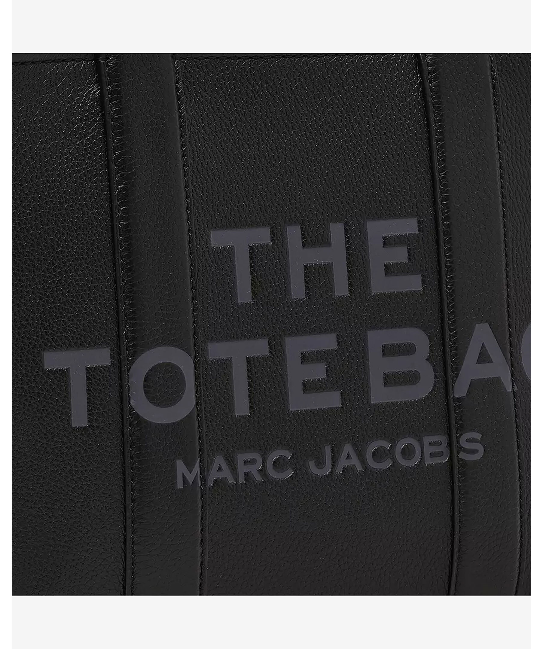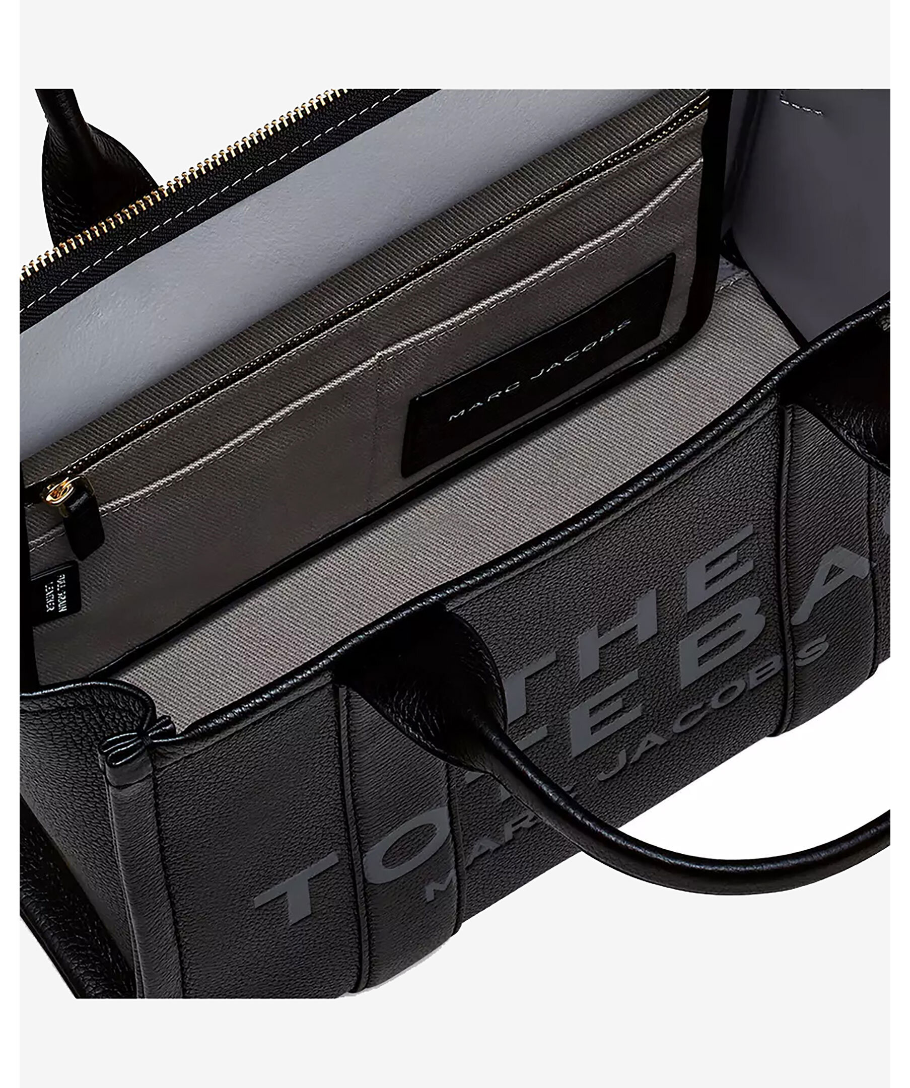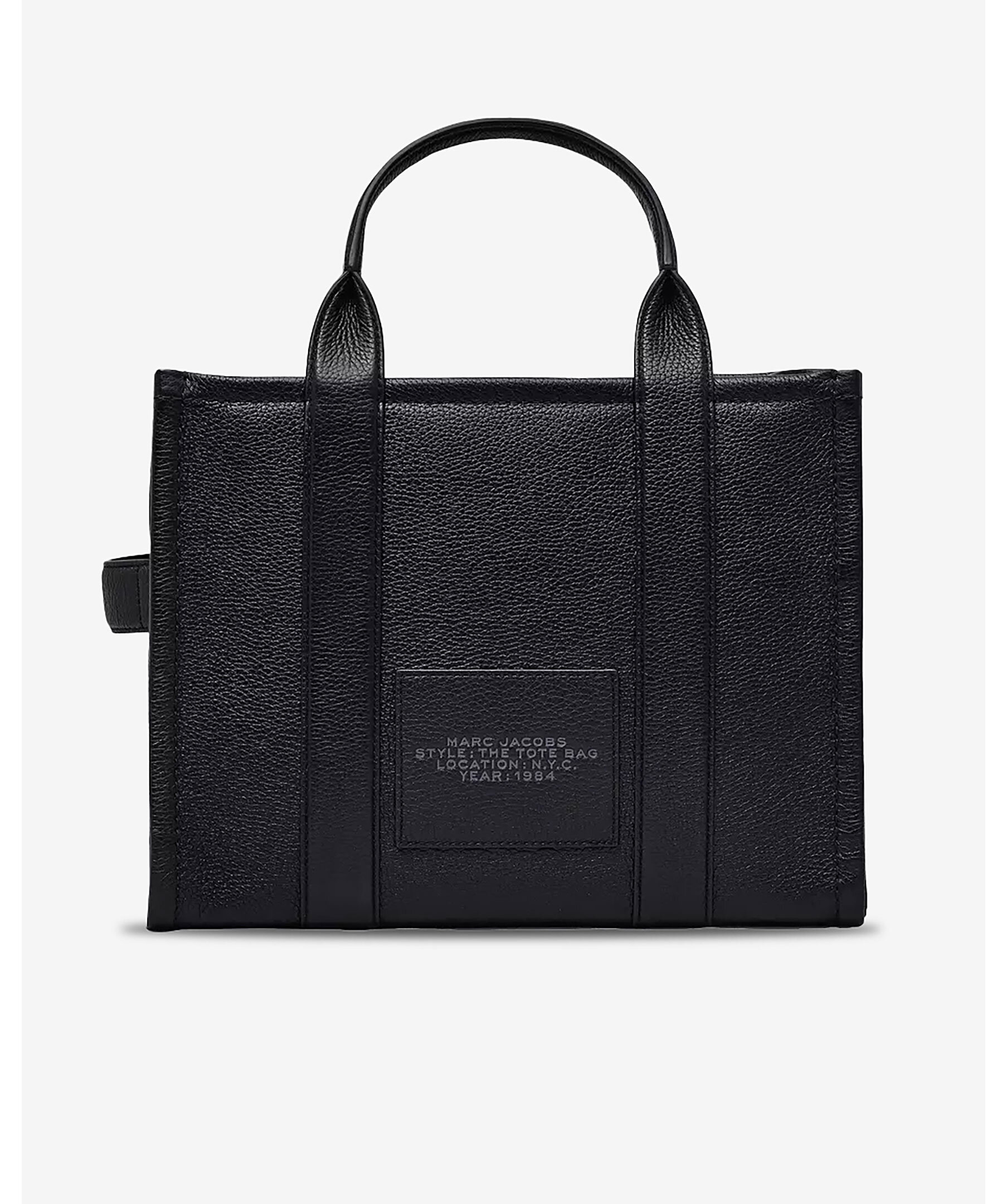Svart tote väska i läder från Marc Jacobs med två handtag upptill. Mörkgrå logotyp fram och patch med logotyp på baksidan i läder. Stängs med blixtlås och har en innerficka med blixtlås. Avtagbart och justerbart axelremsband. Mått: 27cm hög, 15cm djup, 34 cm bred. Handtaget är 12 cm högt. Remlängden är 69 cm.