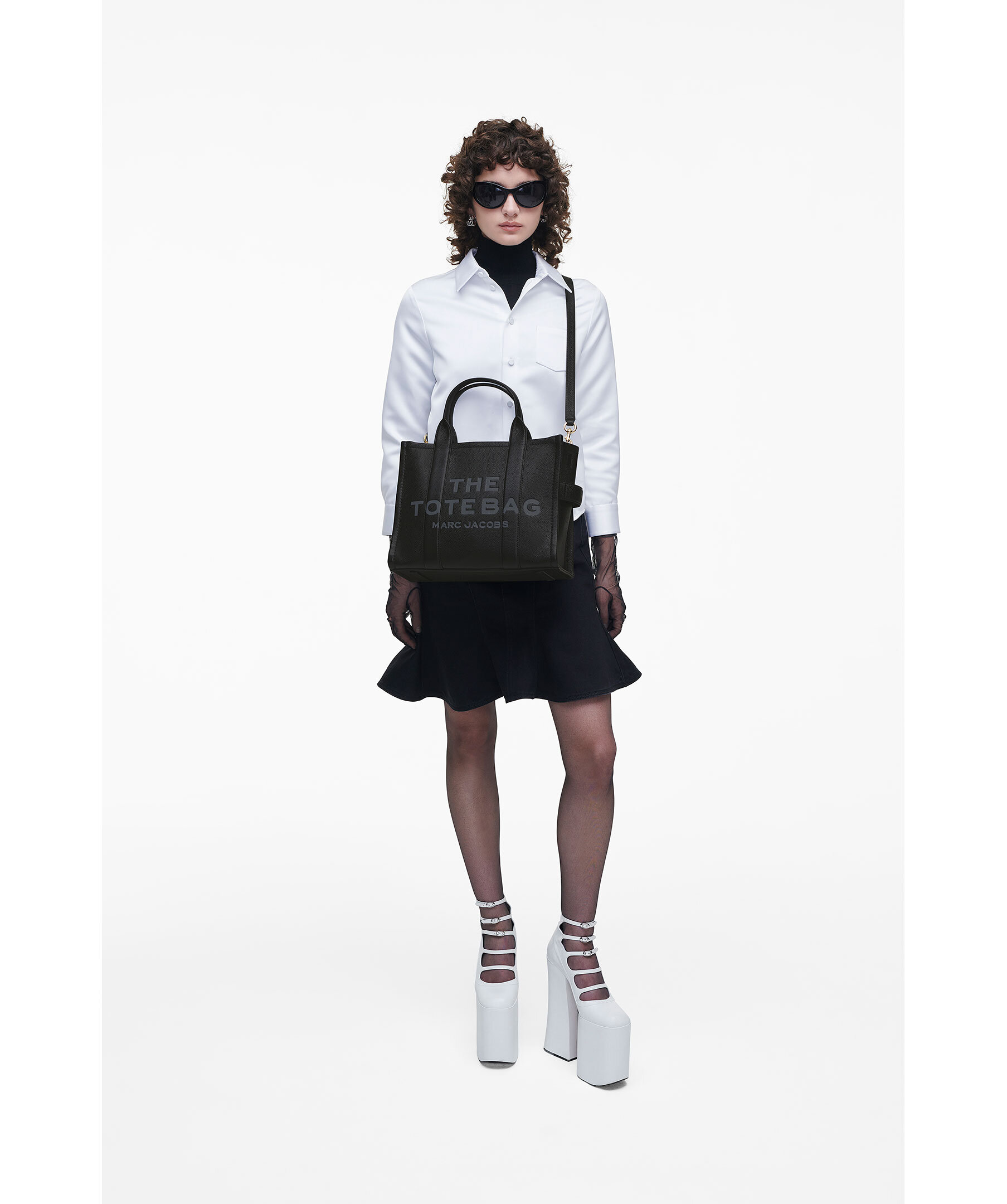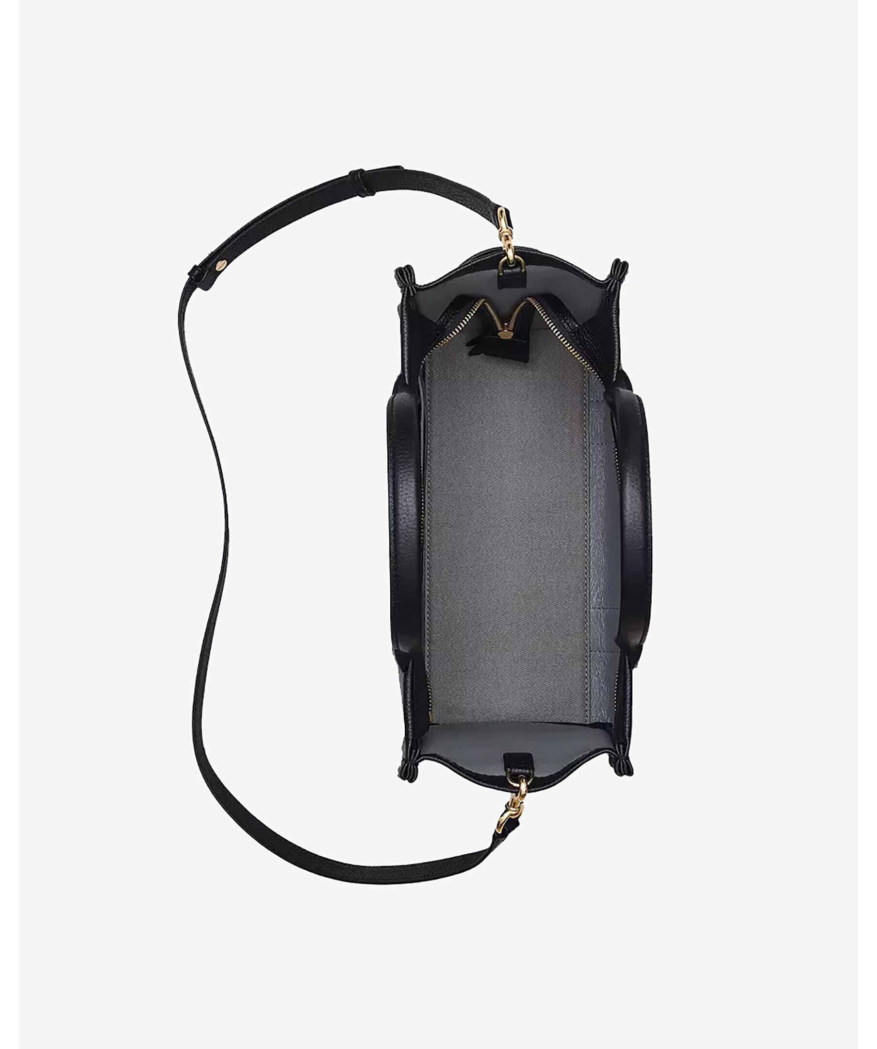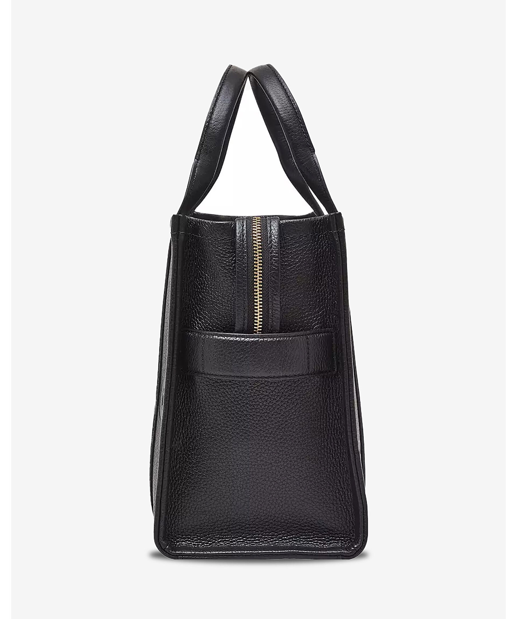 Svart tote väska i läder från Marc Jacobs med två handtag upptill. Mörkgrå logotyp fram och patch med logotyp på baksidan i läder. Stängs med blixtlås och har en innerficka med blixtlås. Avtagbart och justerbart axelremsband. Mått: 27cm hög, 15cm djup, 34 cm bred. Handtaget är 12 cm högt. Remlängden är 69 cm.