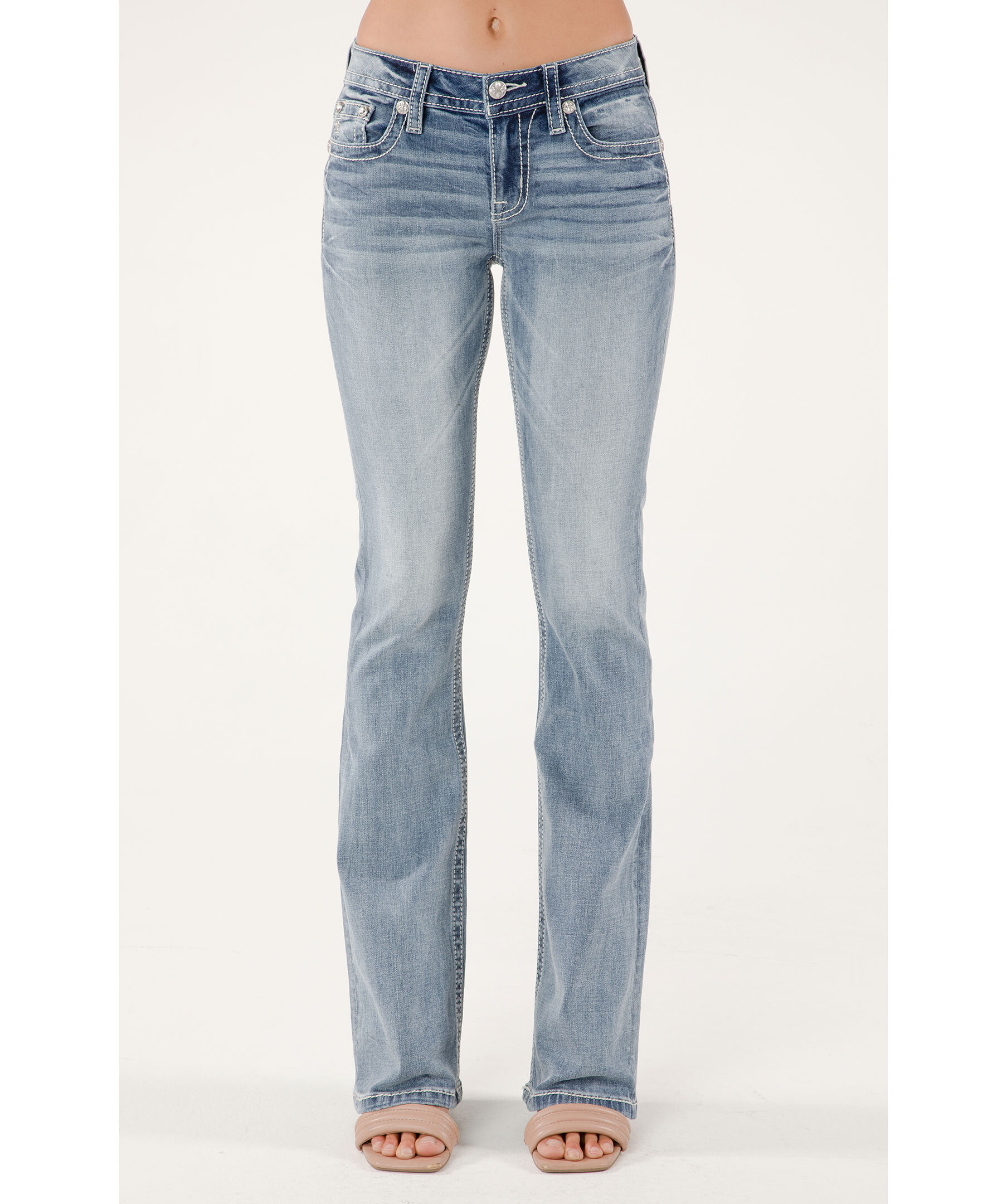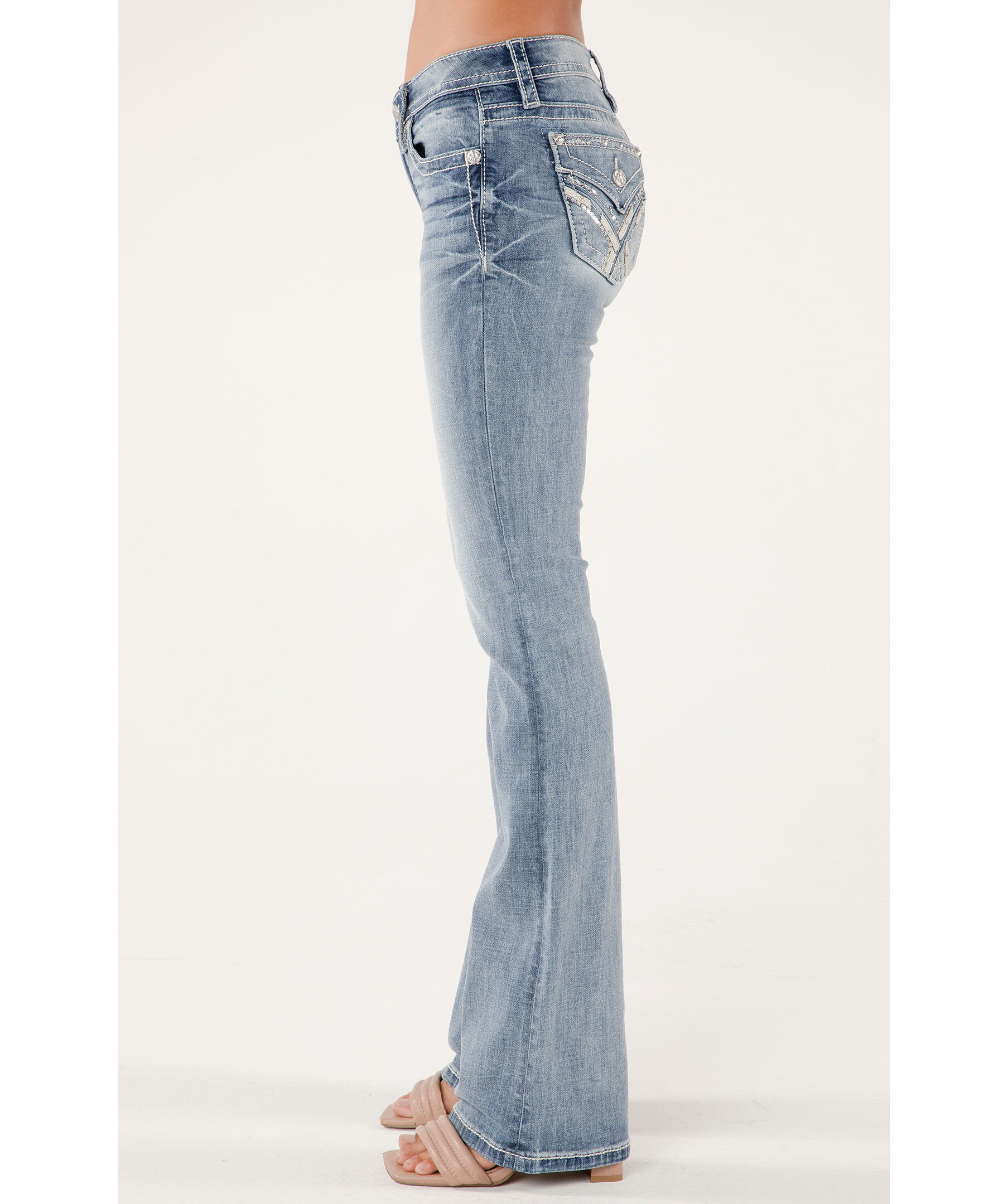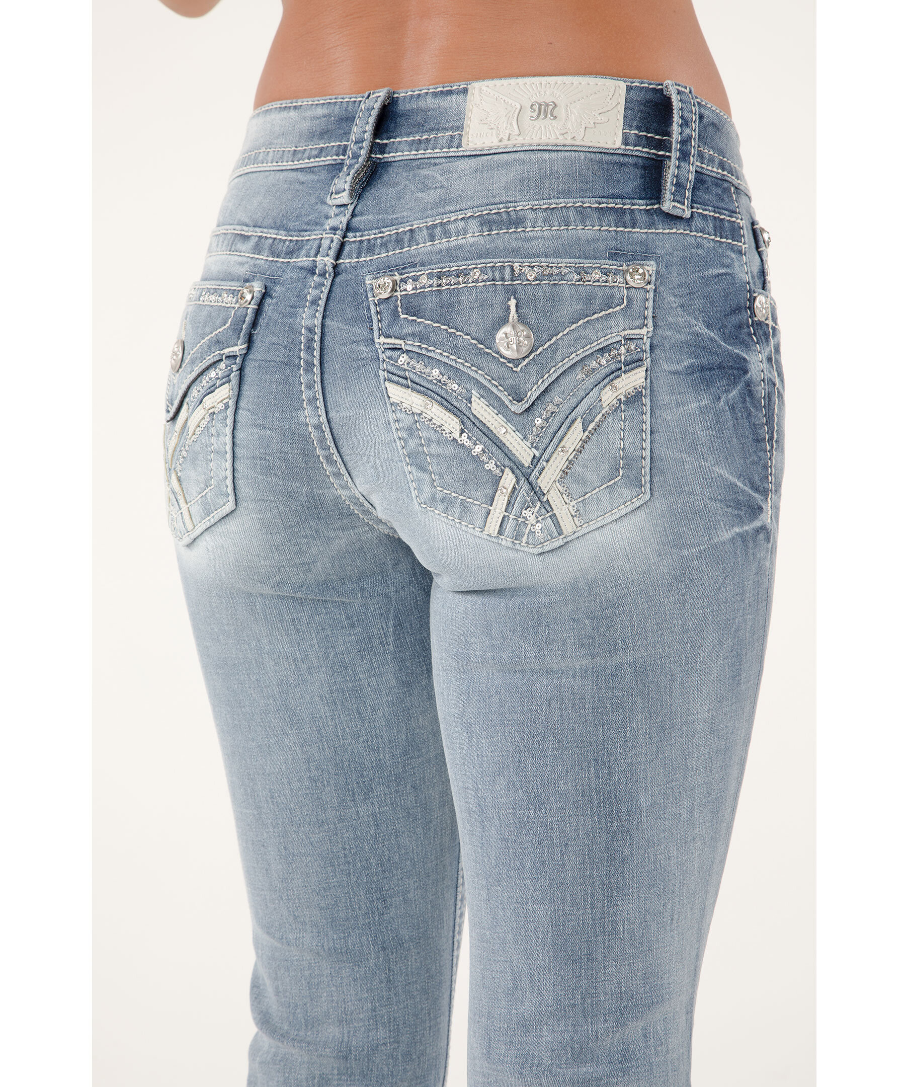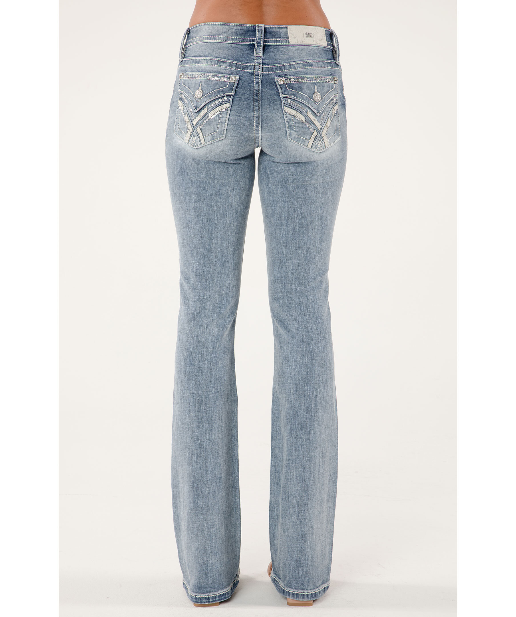 Blåa bootcut-jeans från Miss Me. Jeansen har en mellanhög midja med bälteshällor, fem fickor, läderdetaljer samt paljetter och strasstenar på bakfickorna. Vit läderlapp baktill på linningen. Tillverkade i en bomullsblandning.