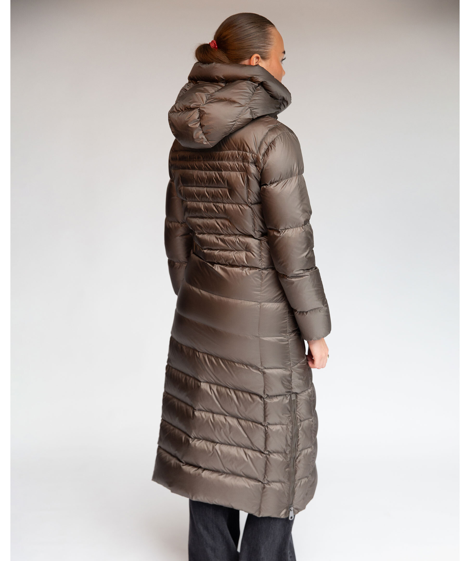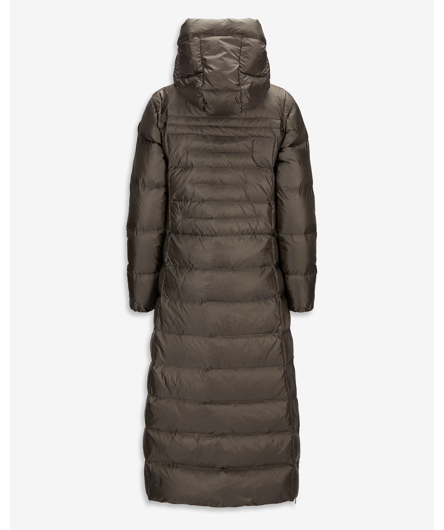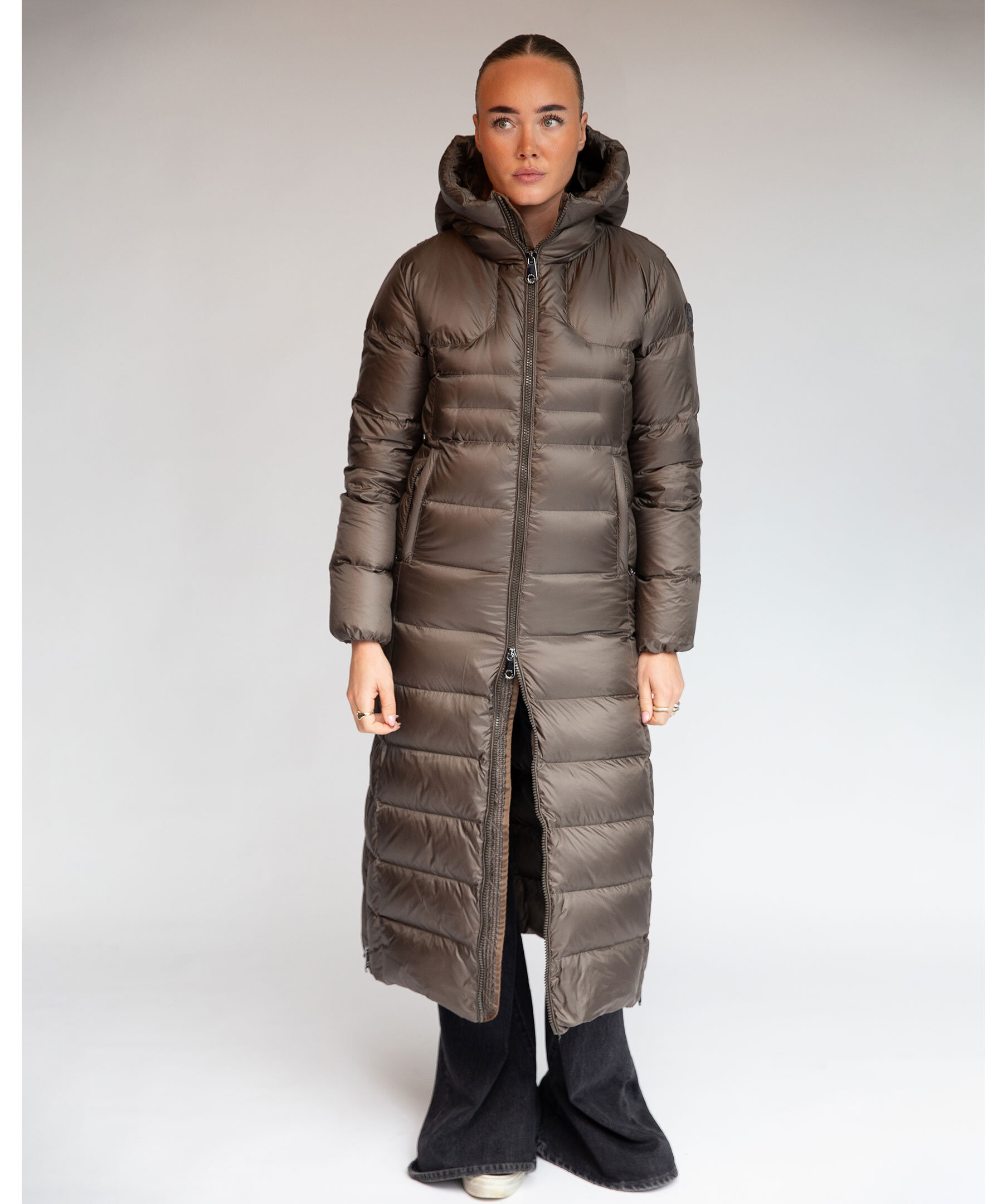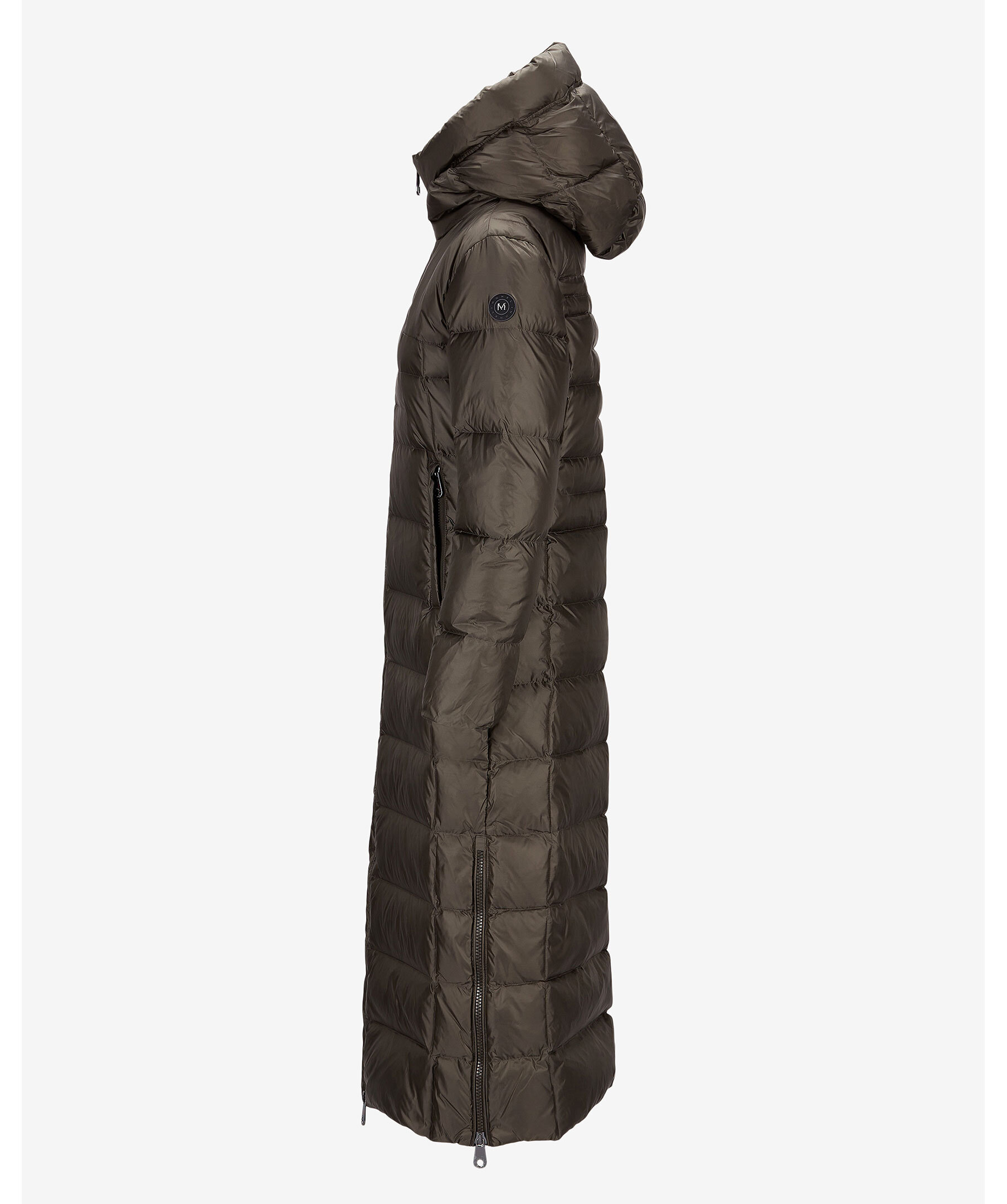 Olivgrön, lång dunkappa med figursydd midja från Monel. Jackan stängs med tvåvägsdragkedja, har dragkedja i sidorna för att kunna öppna upp på sidorna. Två fickor framtill som stängs med dragkedja och en innerficka med dragkedja. Luva och hög krage samt patch i gummi med logotyp i metall på vänster ärm. Yttermaterial i nylontyg med glansig finish.