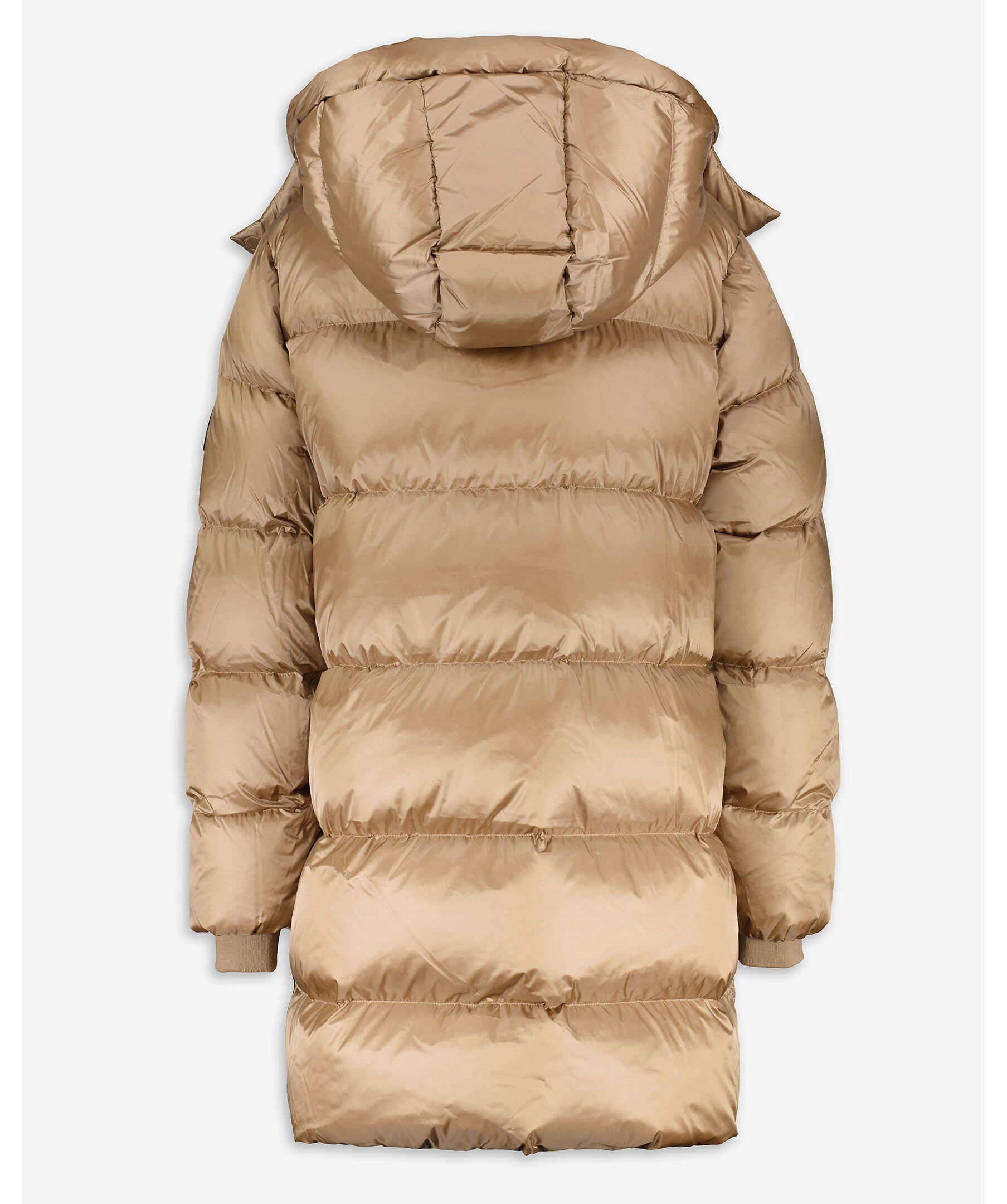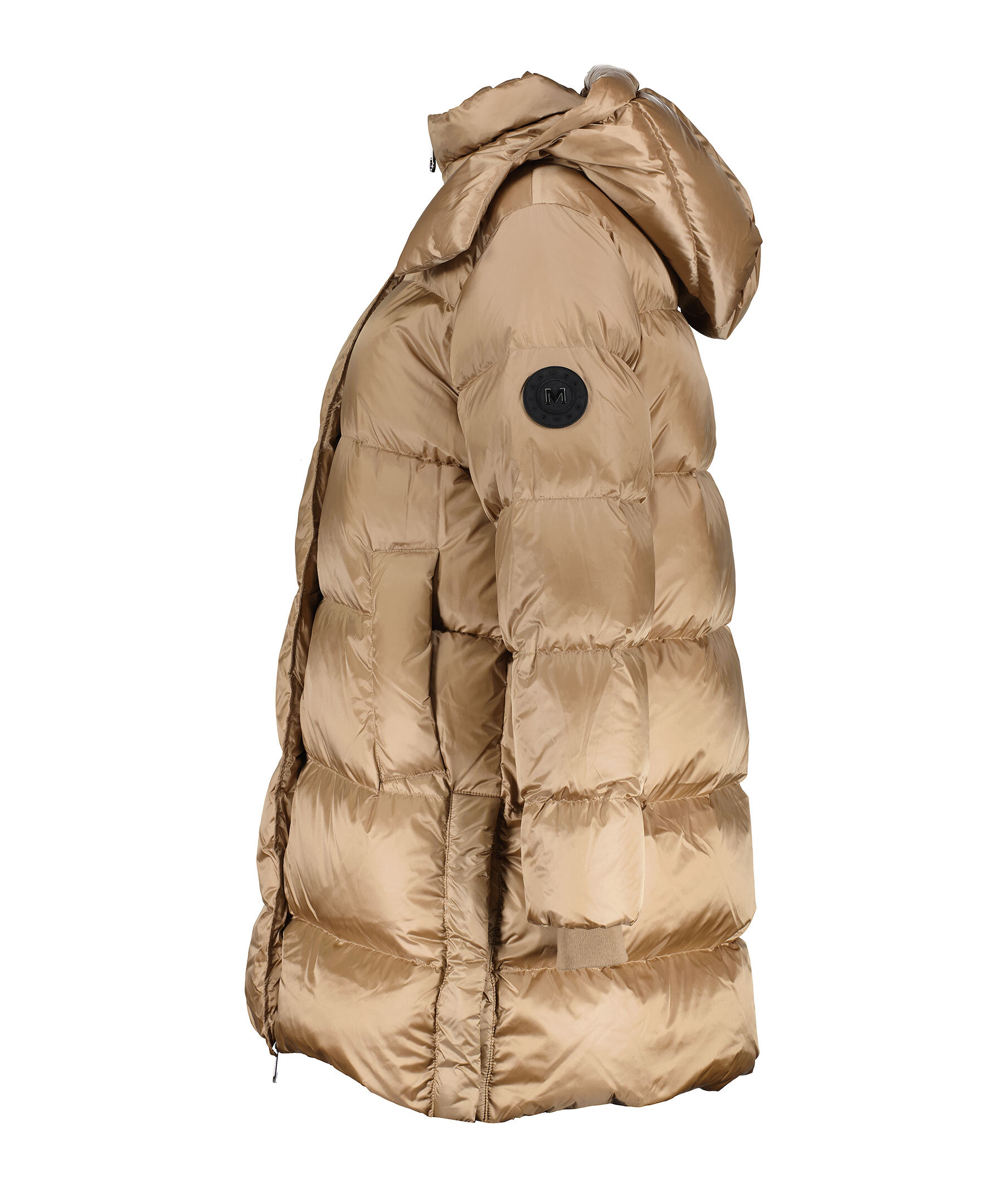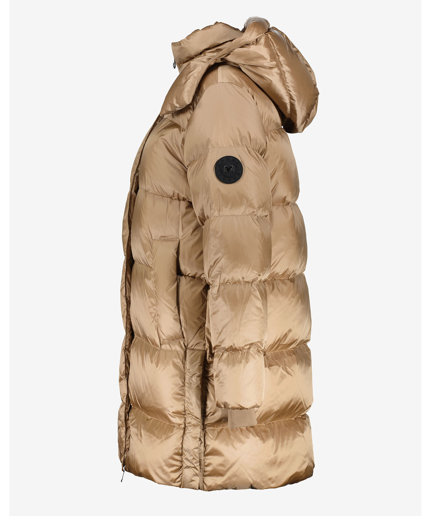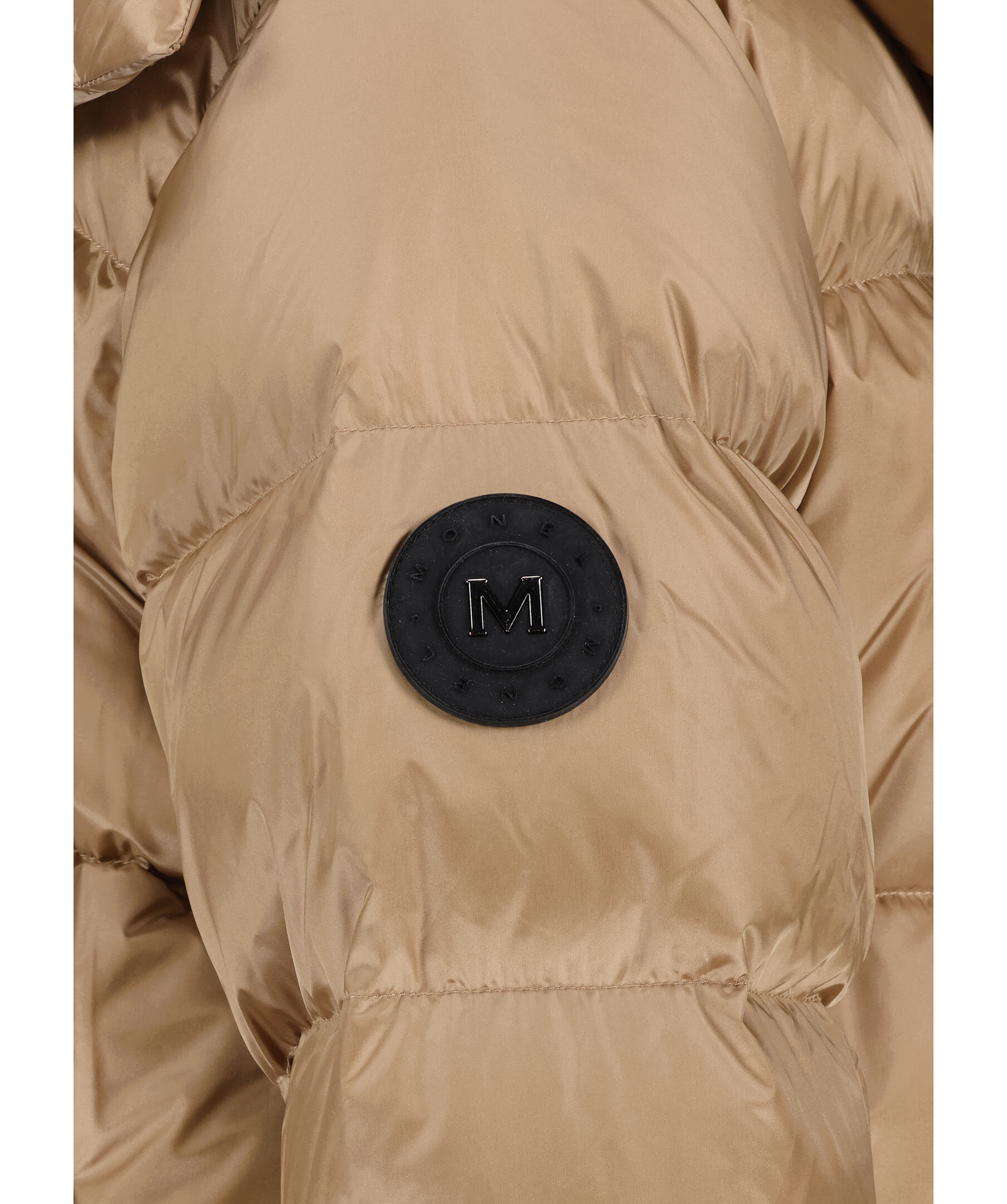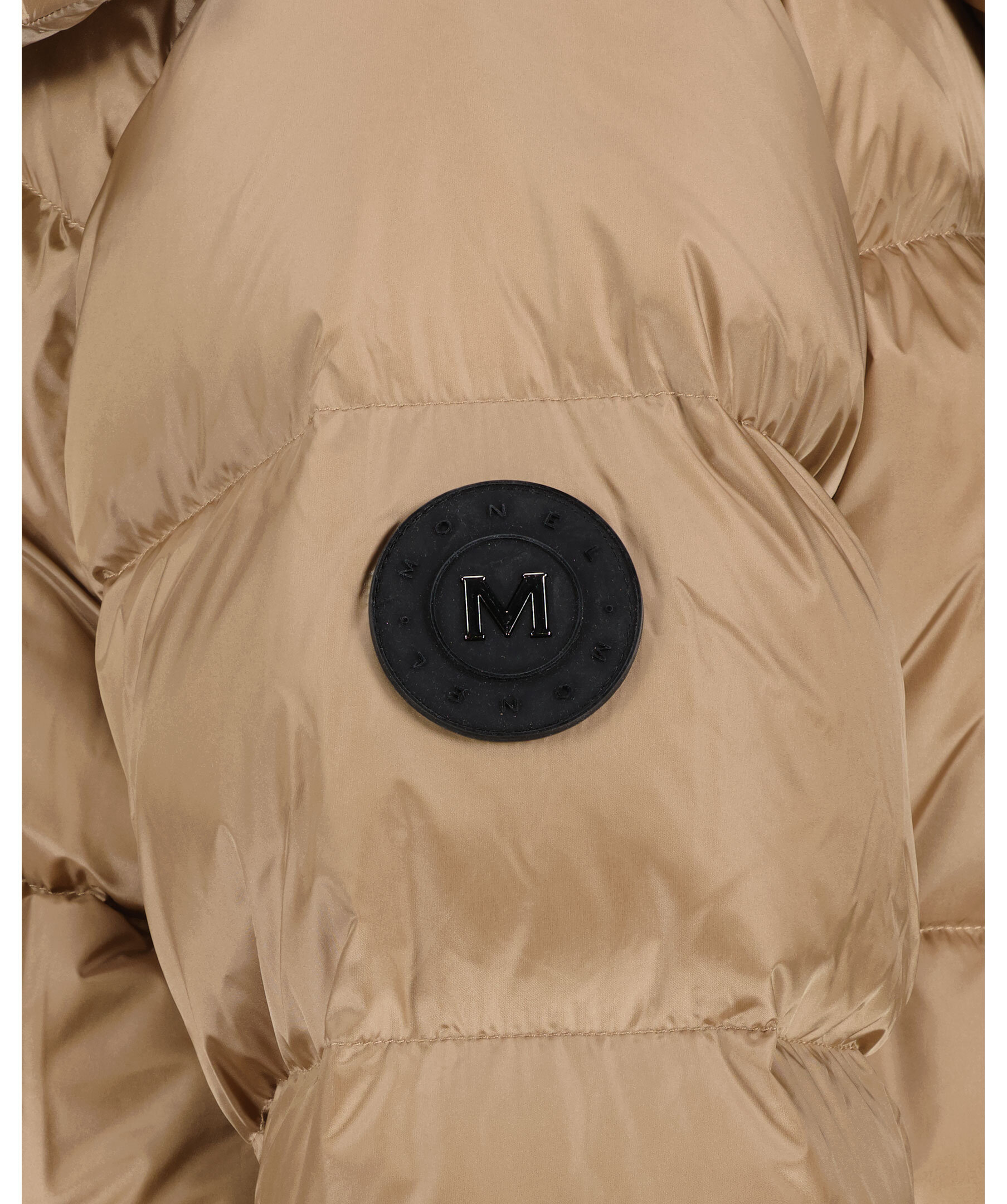 Beige glansig pufferjacka i en längre modell från Monel. Stängs med dragkedja och magneter, har två fickor i sidorna som stängs med magneter och en innerficka med dragkedja. Hög krage och luva samt patch i gummi med logotyp i metall på vänster ärm. Yttermaterial i nylontyg.