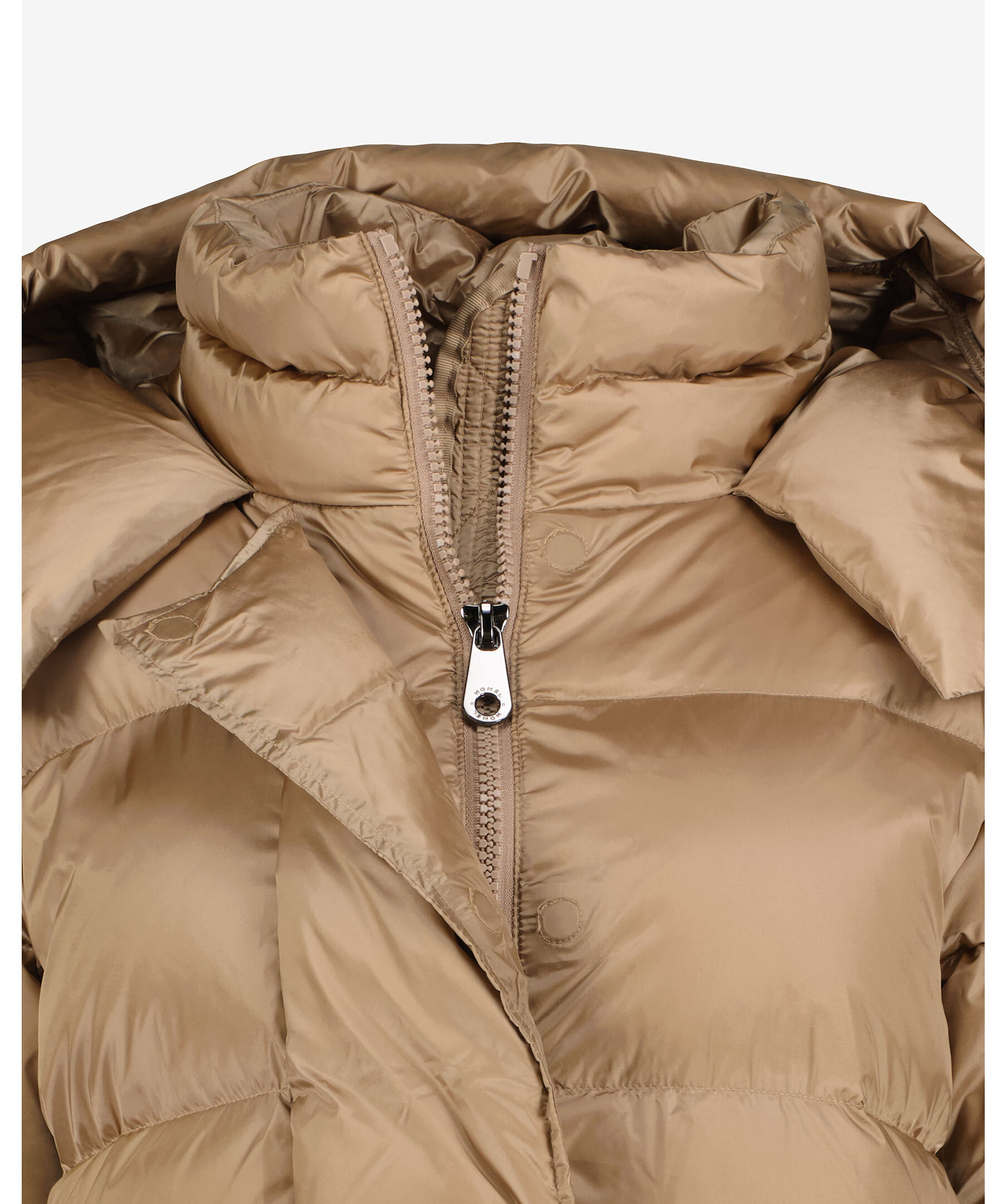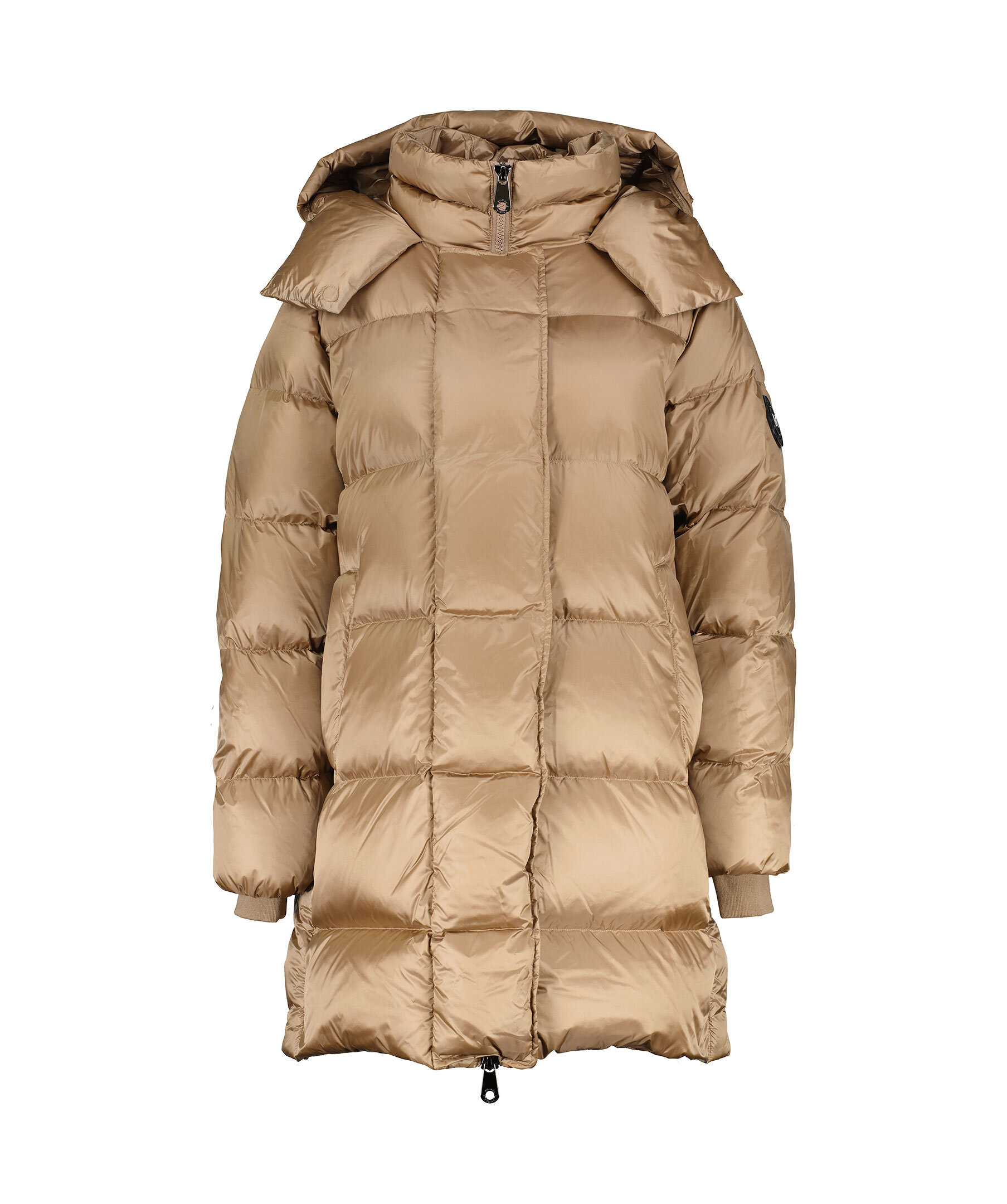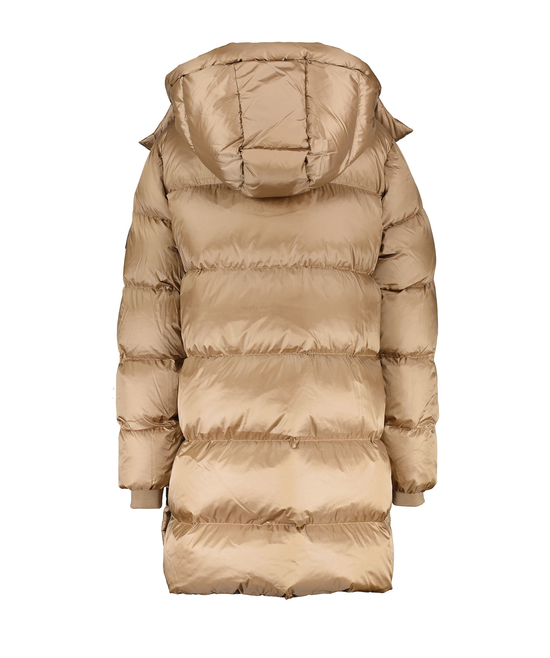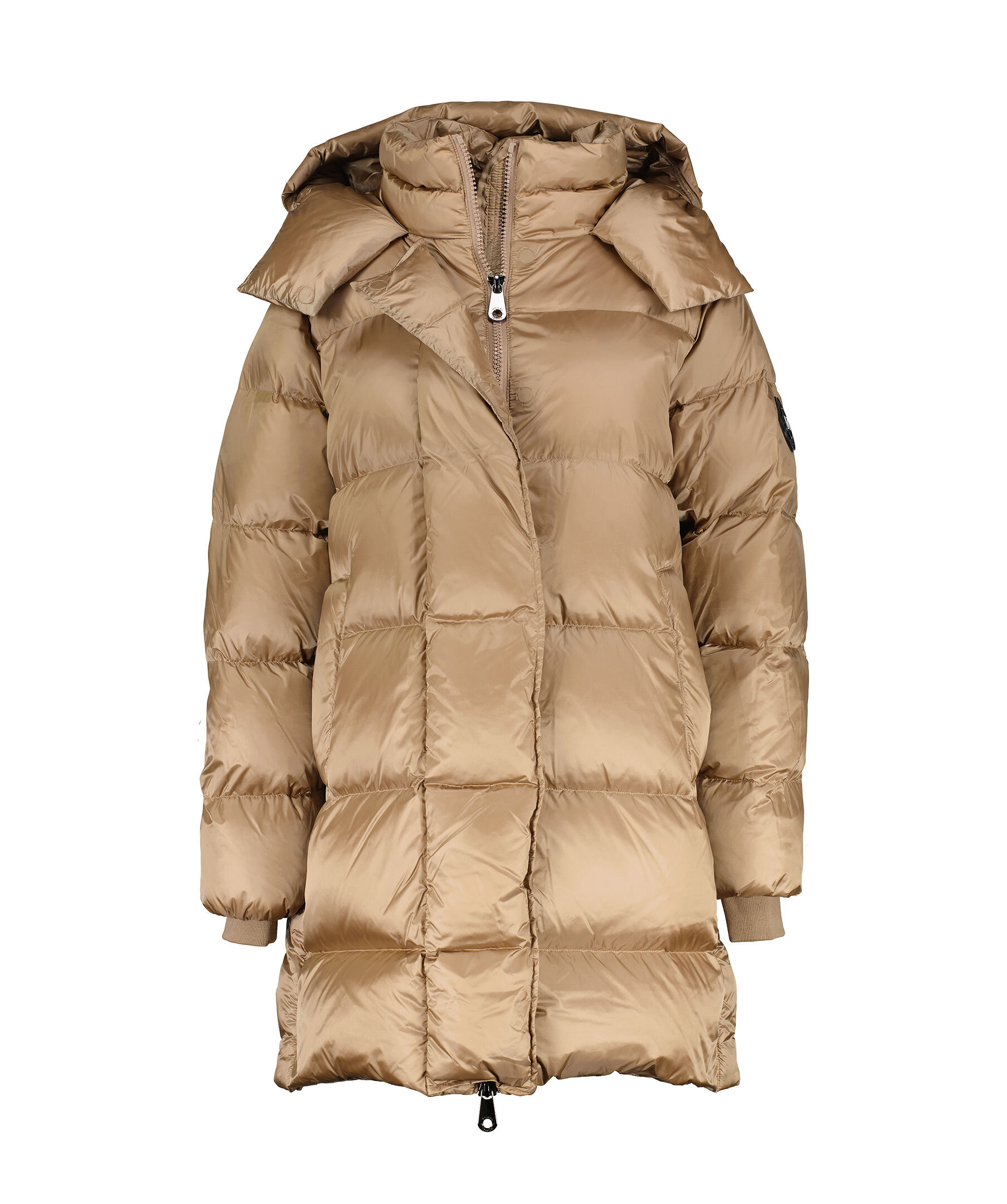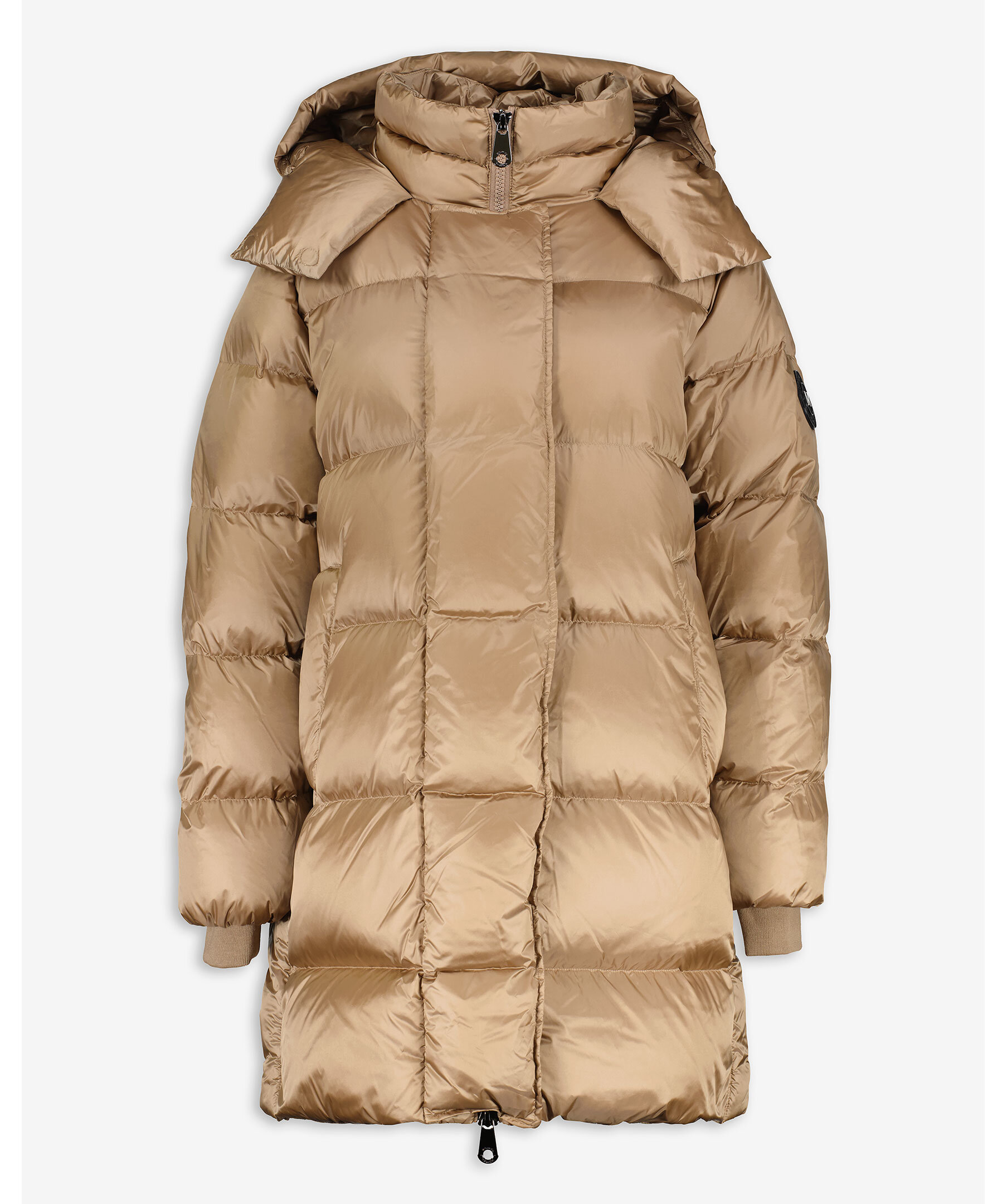 Beige glansig pufferjacka i en längre modell från Monel. Stängs med dragkedja och magneter, har två fickor i sidorna som stängs med magneter och en innerficka med dragkedja. Hög krage och luva samt patch i gummi med logotyp i metall på vänster ärm. Yttermaterial i nylontyg.