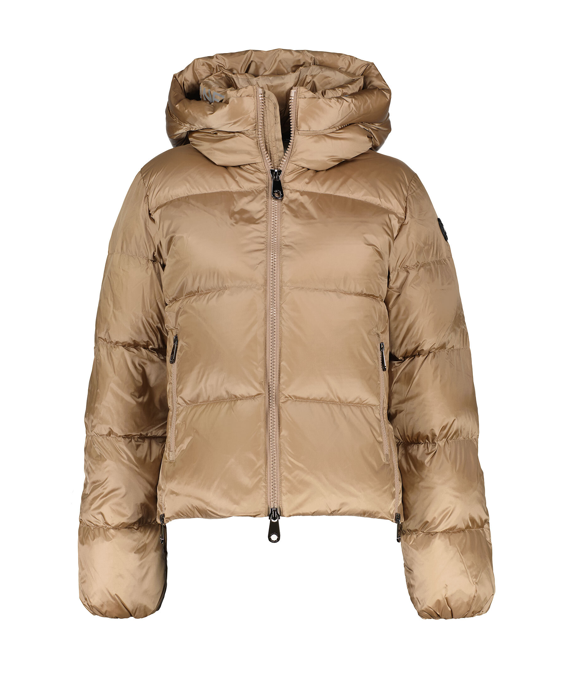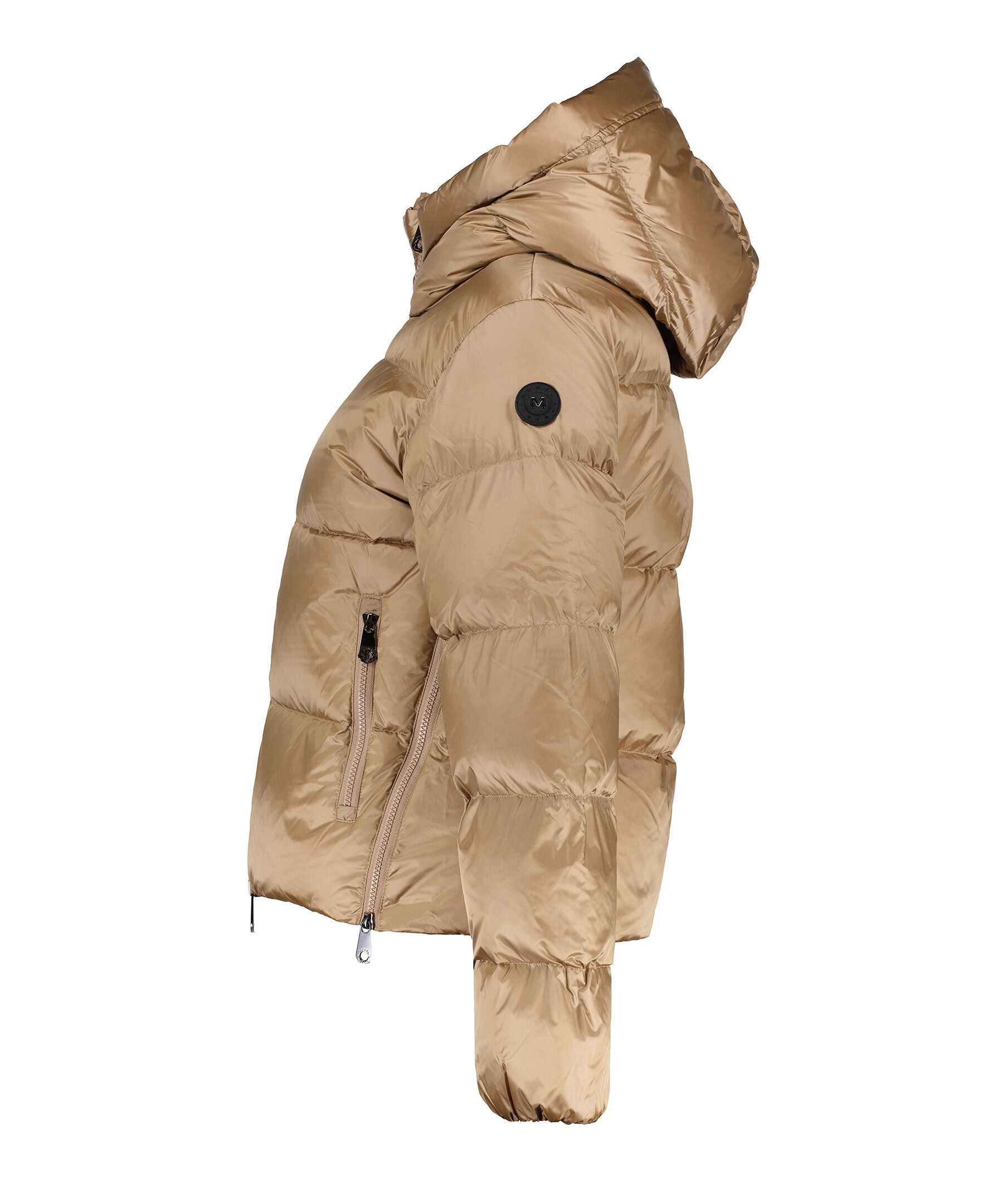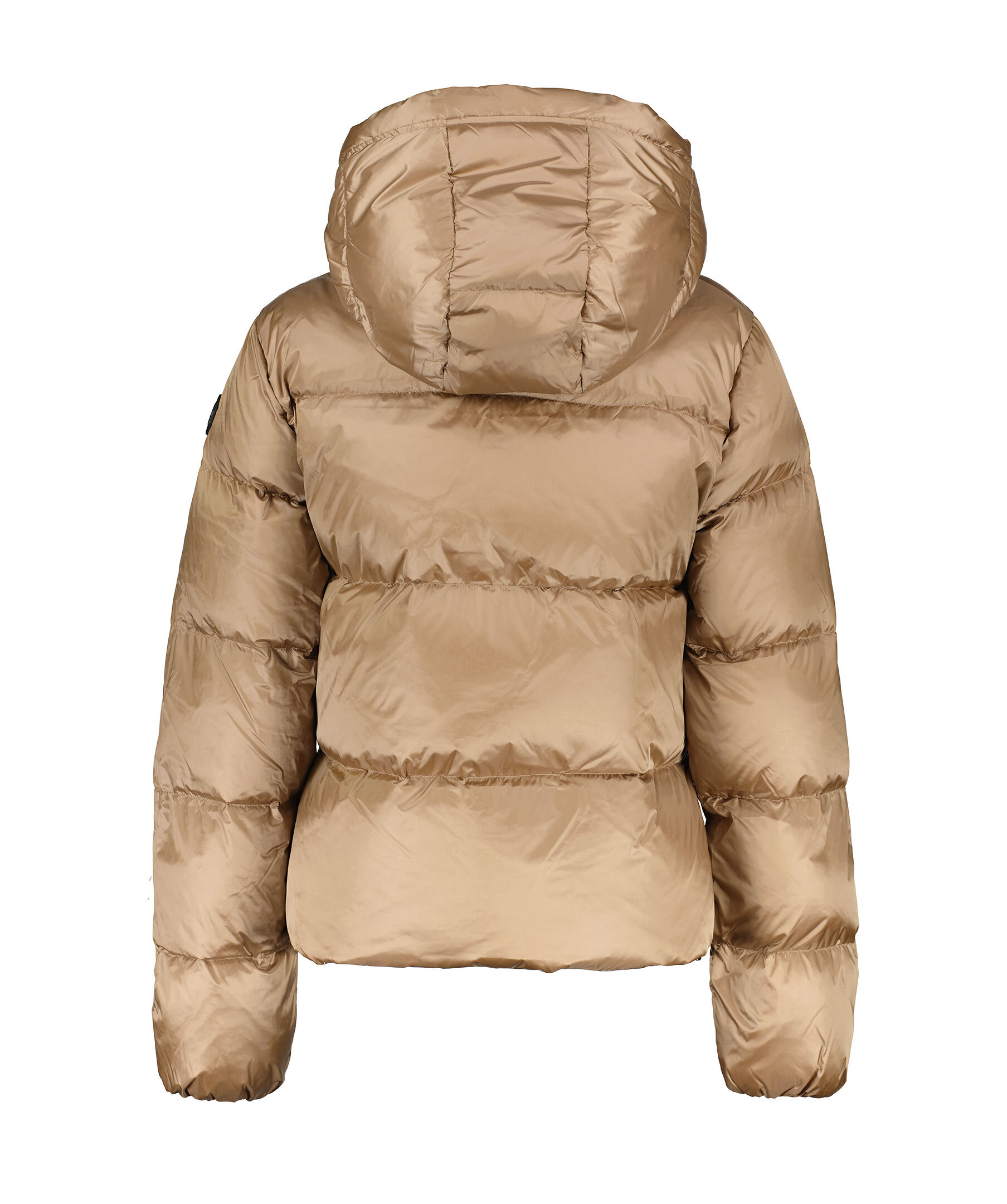 Champagnefärgad, glansig och kort pufferjacka från Monel. Jackan stängs med tvåvägsdragkedja och har två sidfickor med dragkedja, en innerficka med dragkedja, hög krage och huva samt liten logotyp i gummi och metall på vänster ärm. Dragkedja i sidorna för ökad ventilation. Logotyp på kragen. Tillverkad i nylon med dunfyllning.