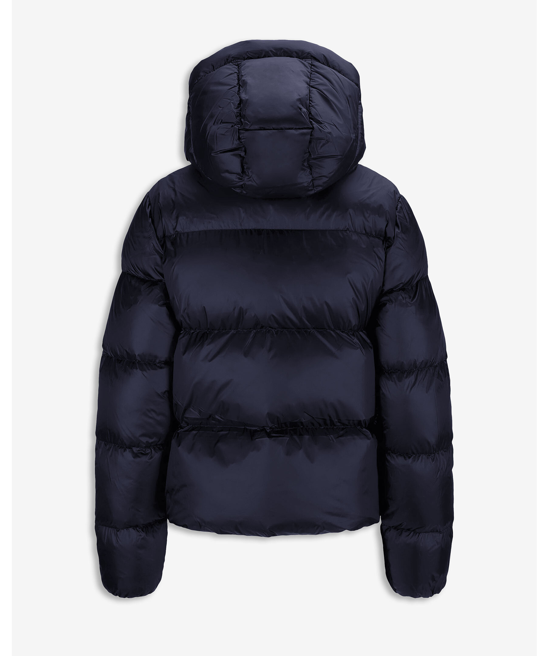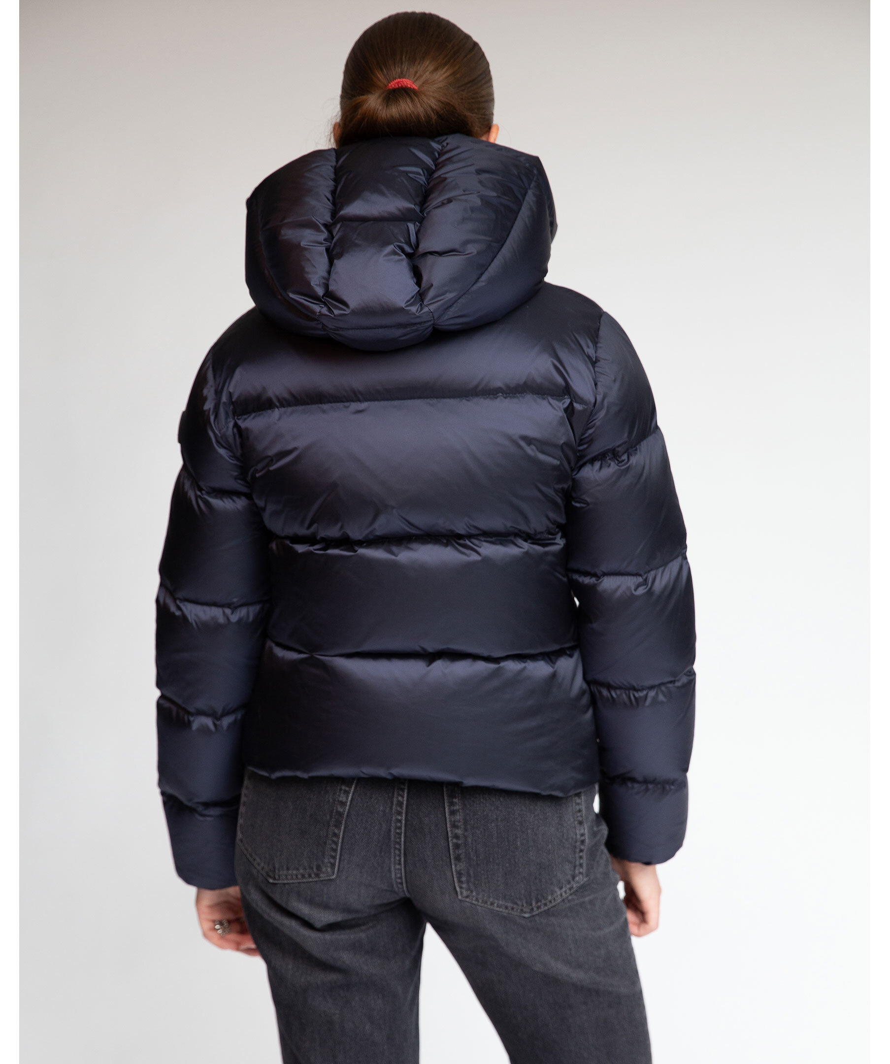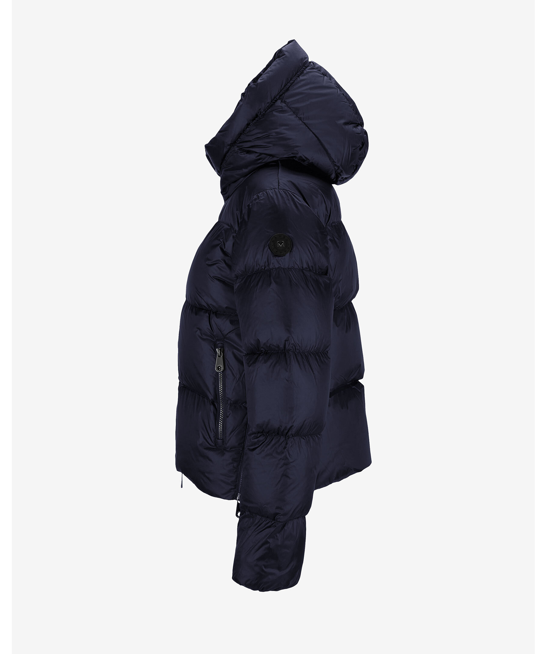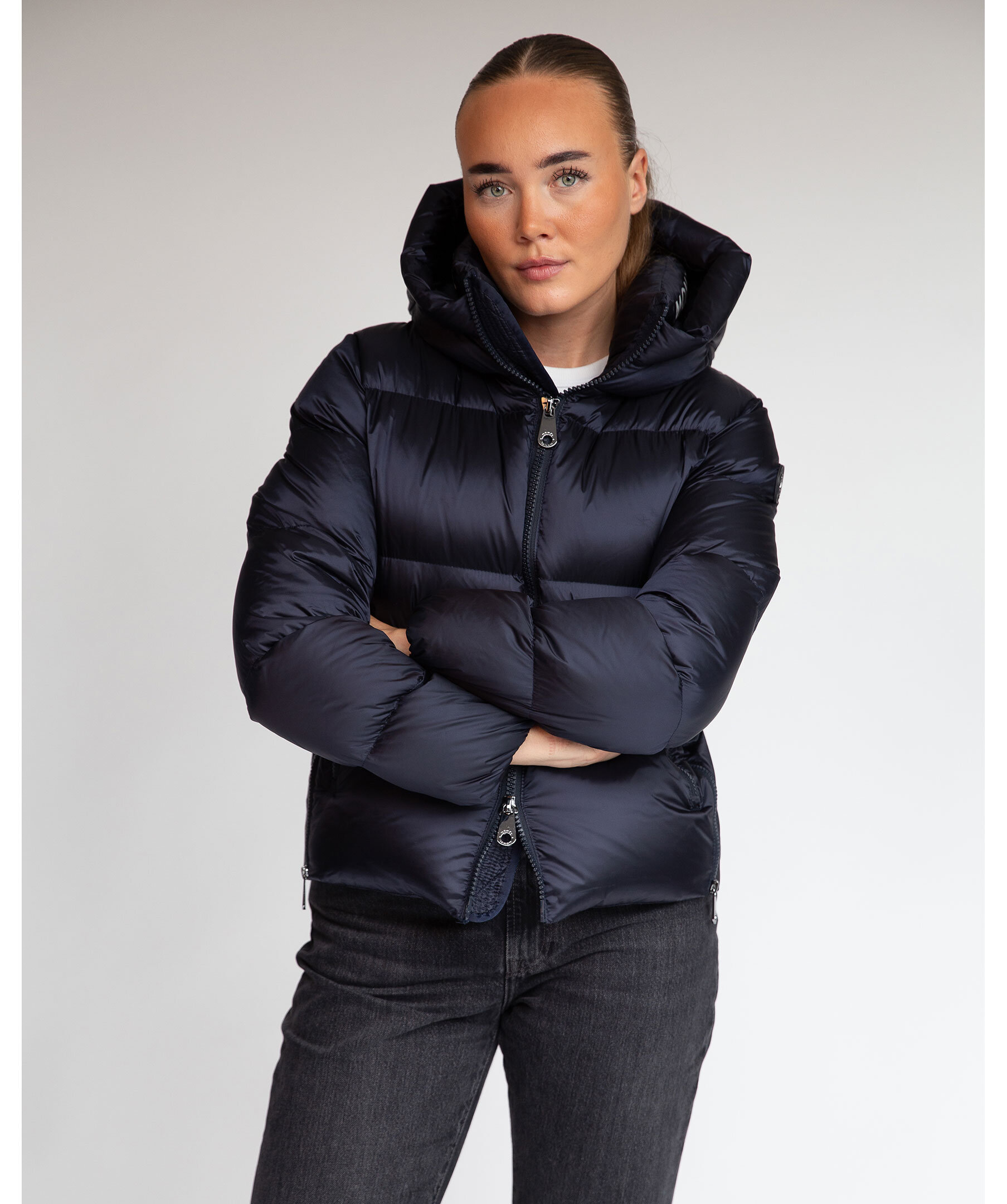 Mörkblå, kort pufferjacka från Monel. Jackan stängs med tvåvägsdragkedja och har två sidfickor med dragkedja, en innerficka med dragkedja, hög krage och huva samt liten logotyp i gummi och metall på vänster ärm. Dragkedja i sidorna för ökad ventilation. Logotyp på kragen. Tillverkad i nylon med dunfyllning.