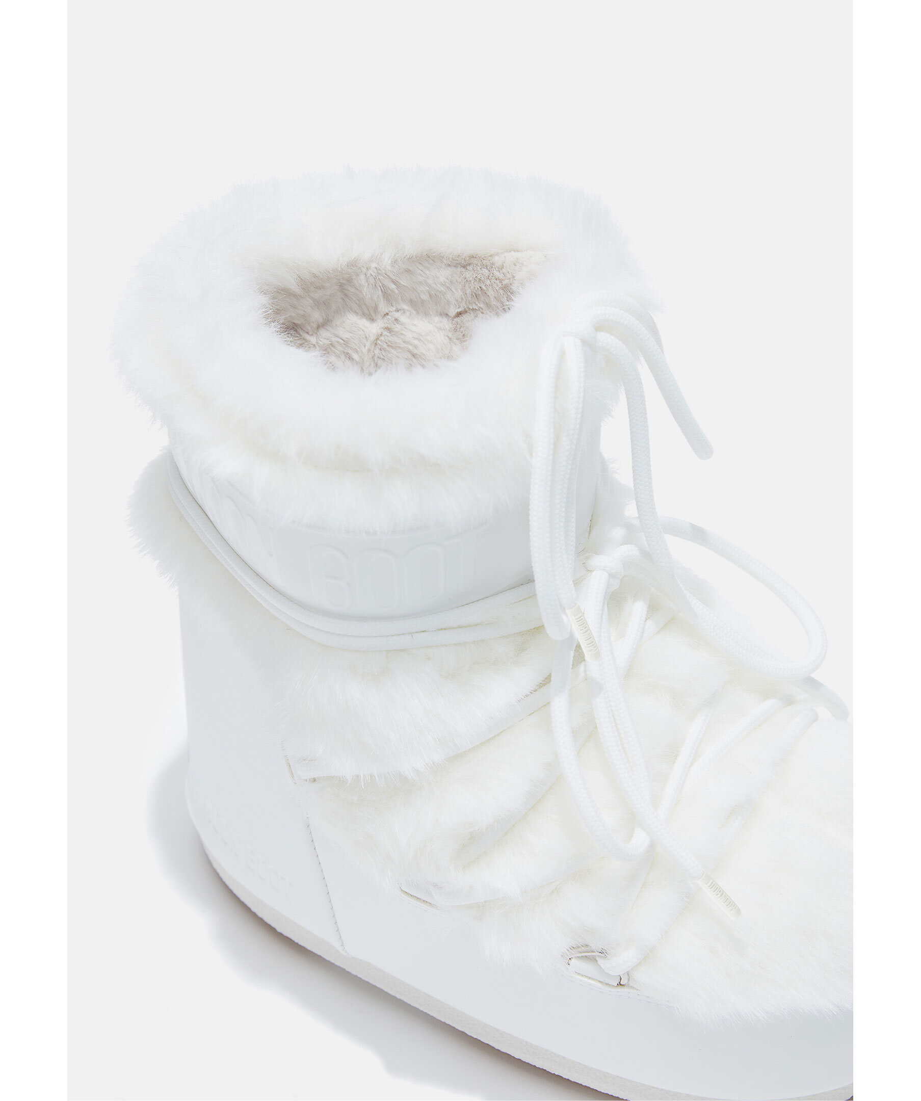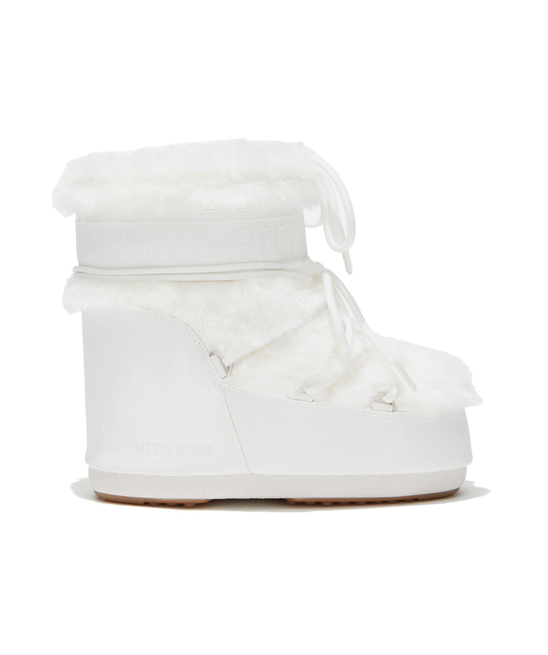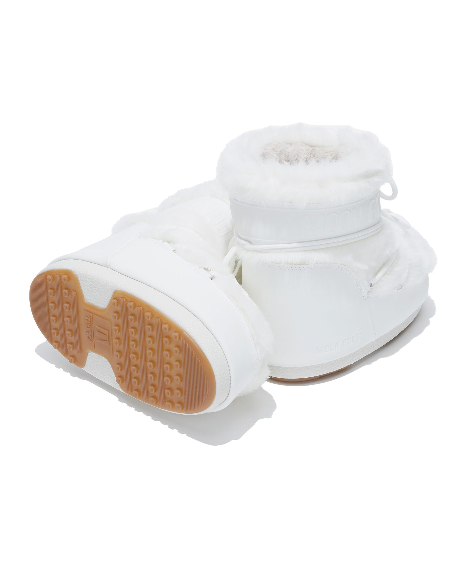 Vita, fluffiga boots från Moon Boot i en låg modell. Skorna har en ovandel i mjuk fuskpäls och är isolerade och utrustade med en lätt mellansula samt sugkuddar på gummisulan som ger bättre markkontroll. Logotyp runt skon samt snörning framtill. Dragsko upptill. 100% vattenavvisande. Skorna är inspirerade av månlandningen 1969.