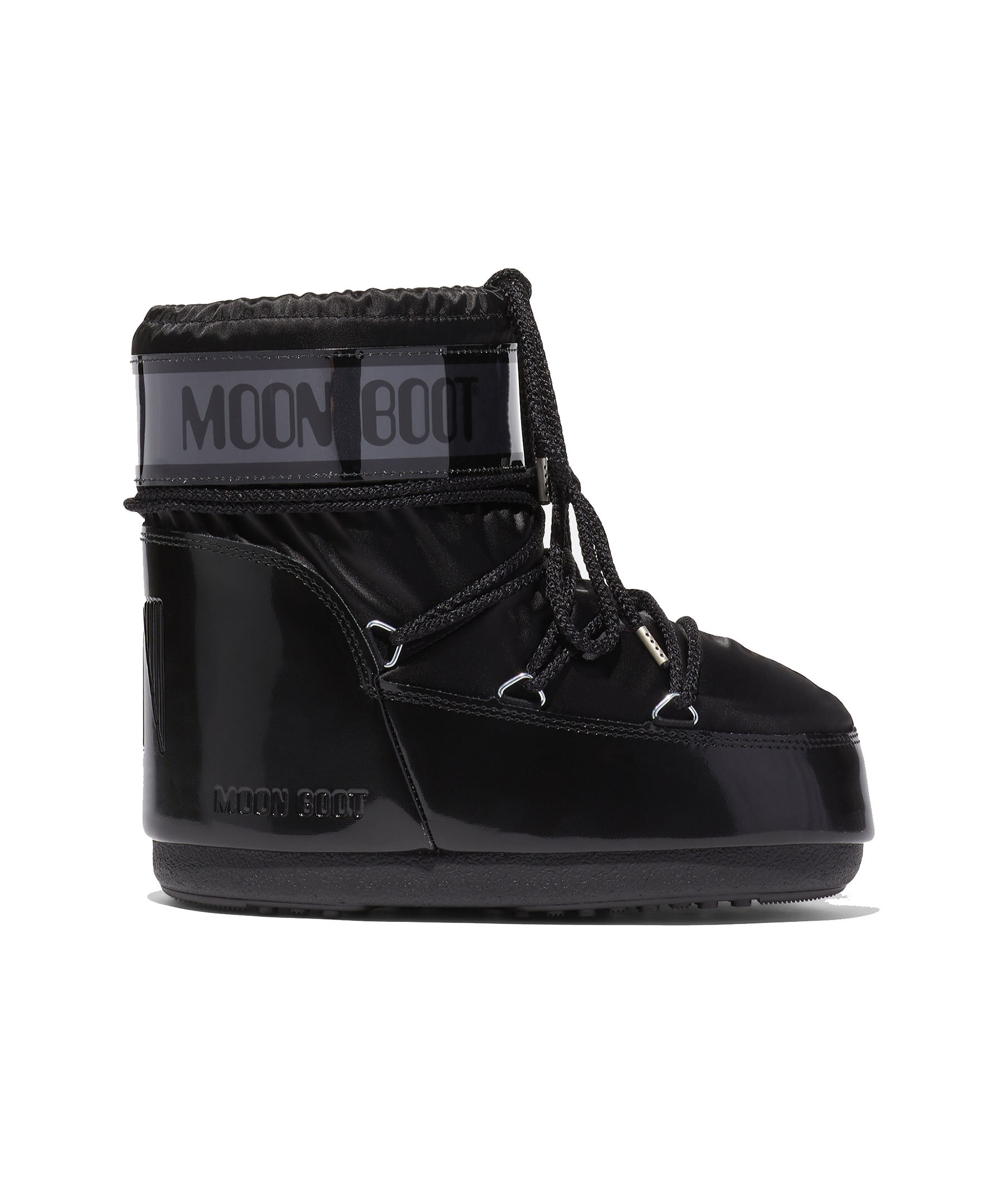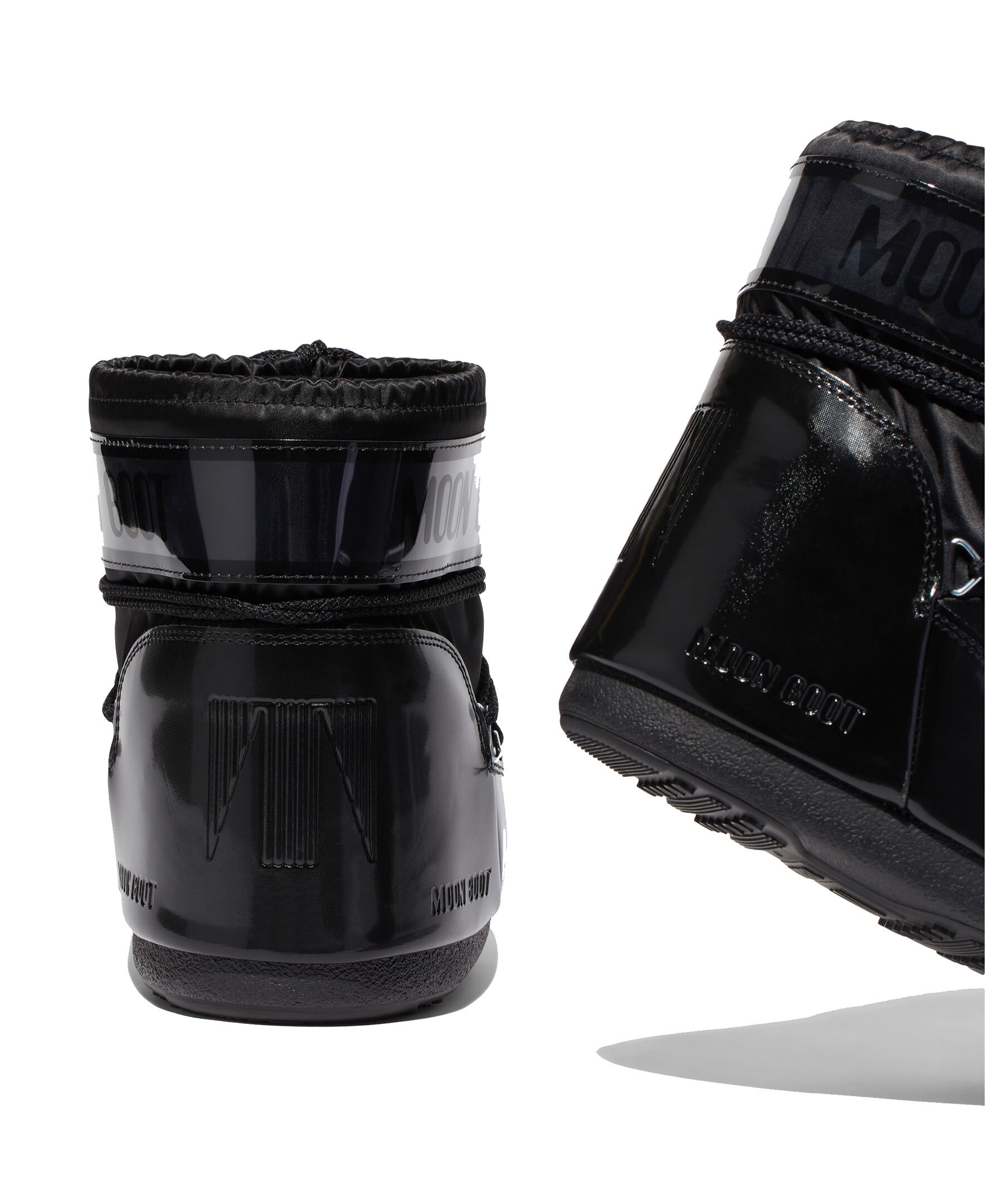 Svarta, glansiga boots från Moon Boot i en låg modell. Skorna är isolerade och utrustade med en lätt mellansula samt sugkuddar på gummisulan som ger bättre markkontroll. Logotyp runt skon samt snörning framtill. Dragsko upptill. 100% vattenavvisande. Skorna är inspirerade av månlandningen 1969.