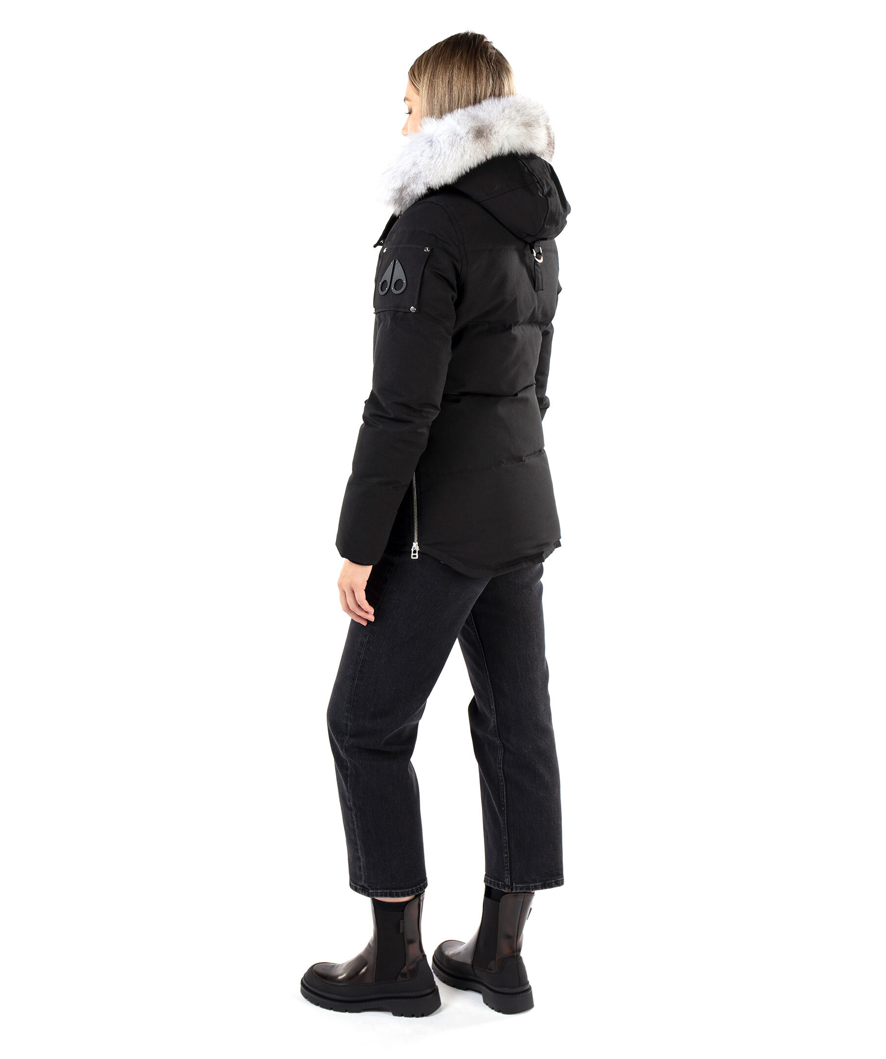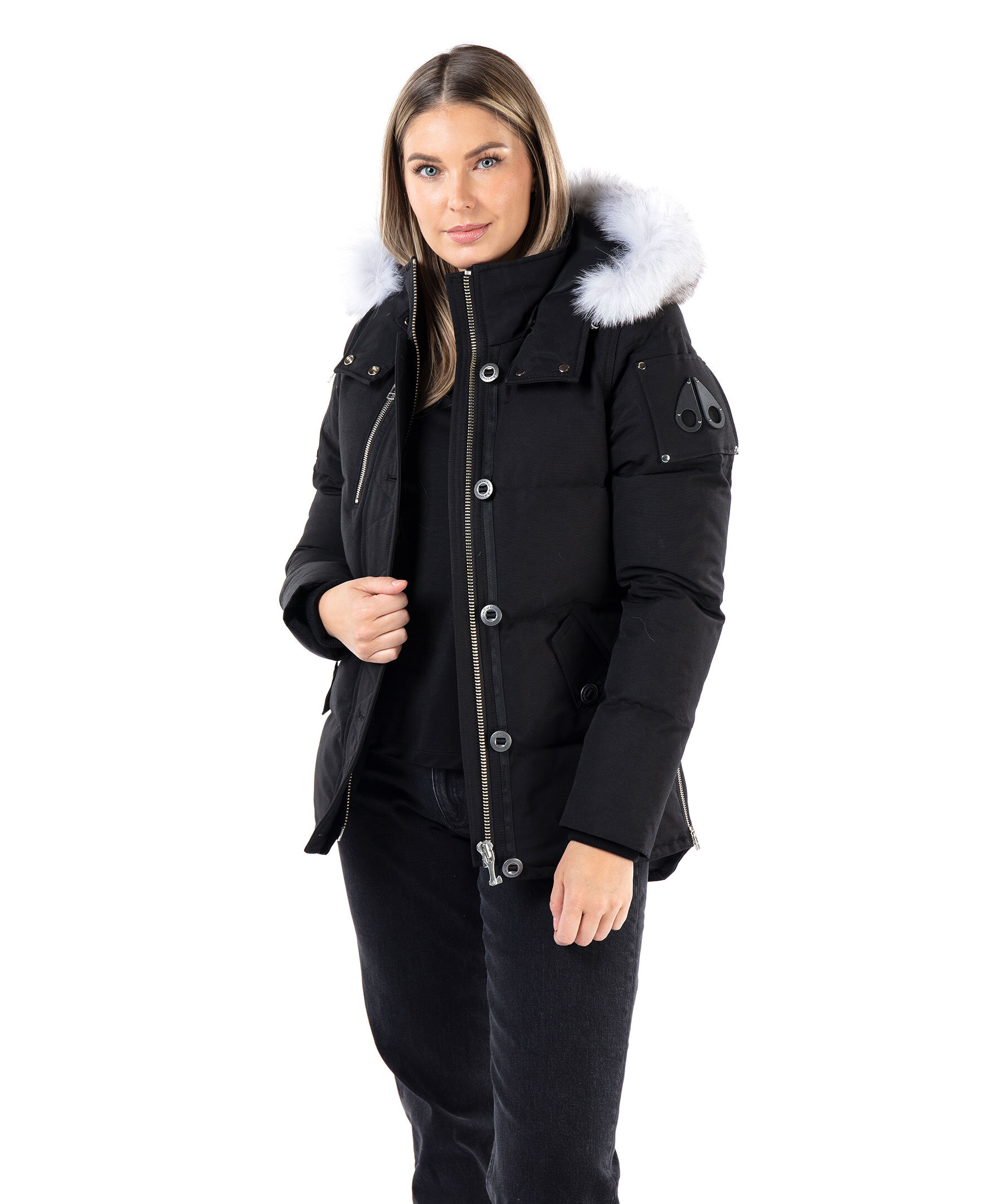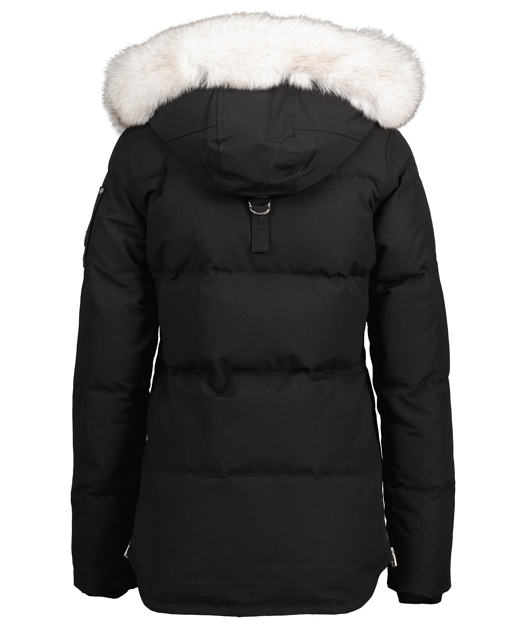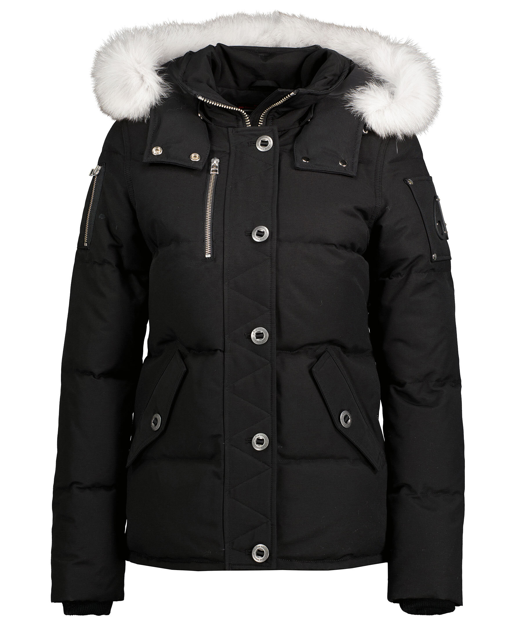 Svart dunjacka i en smal passform från det kanadensiska märket Moose Knuckles. Silverfärgade detaljer i metall, mjuk, vit naturpäls fastsydd på luvan. Två fickor fram, en bröstficka och en ficka på höger överärm, löstagbar luva, två innerfickor samt logotyp i metall på vänster ärm. OBS! Logotypen på ärmen kan variera i nyans mellan färgerna svart, guld och silver. Stängs med dragkedja och knappar. Vind och vattenavstötande yttertyg, svart foder på insidan. Perfekt för den kyliga vintern. För en rymligare passform med plats för en tjocktröja rekommenderar vi att gå upp en storlek. TIPS! Ånga pälsen för att få den stor och fluffig. OBS! Naturpälsar är unika och kan skilja sig från bilden. Modellen är 175 cm lång och har på sig storlek S.