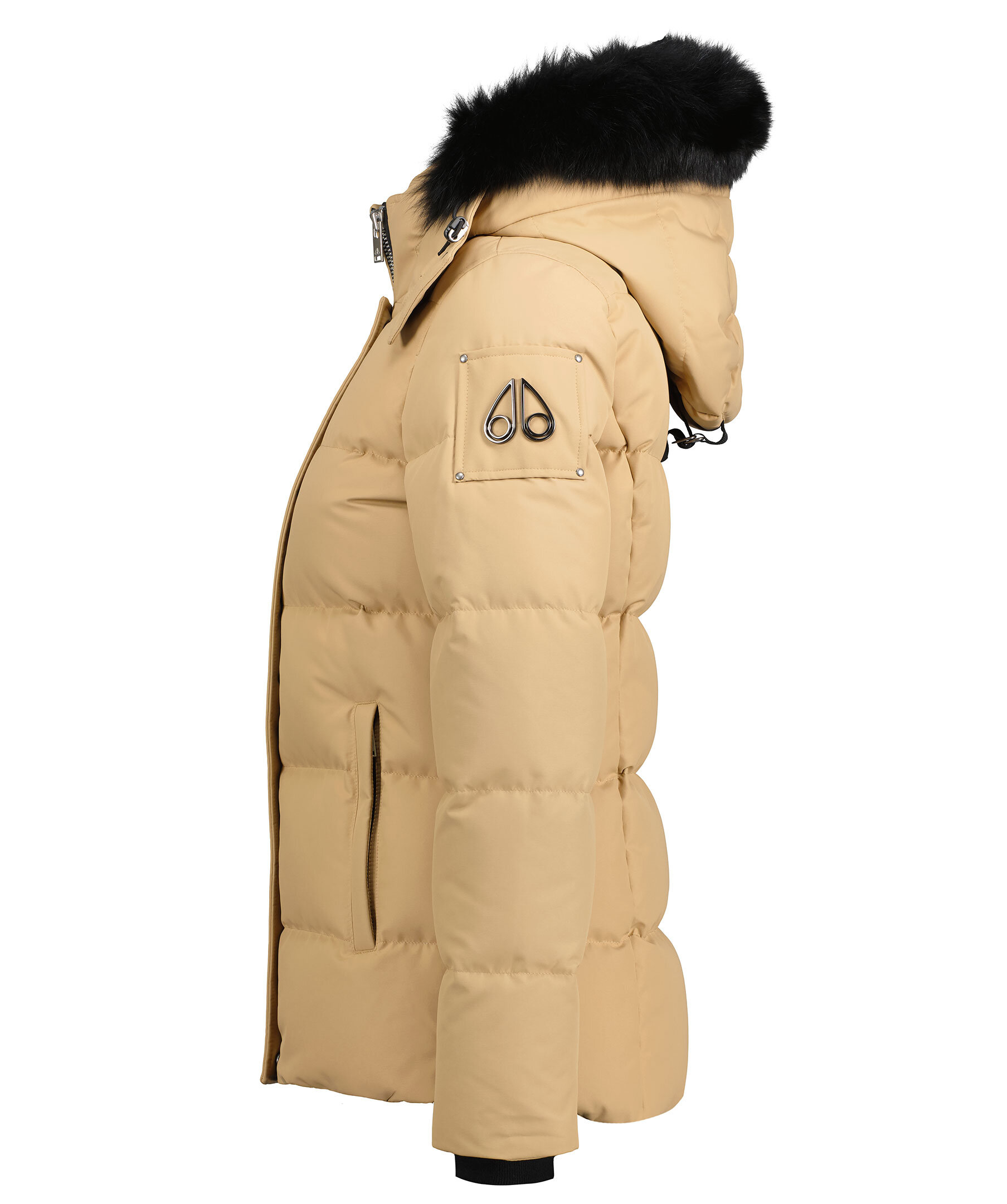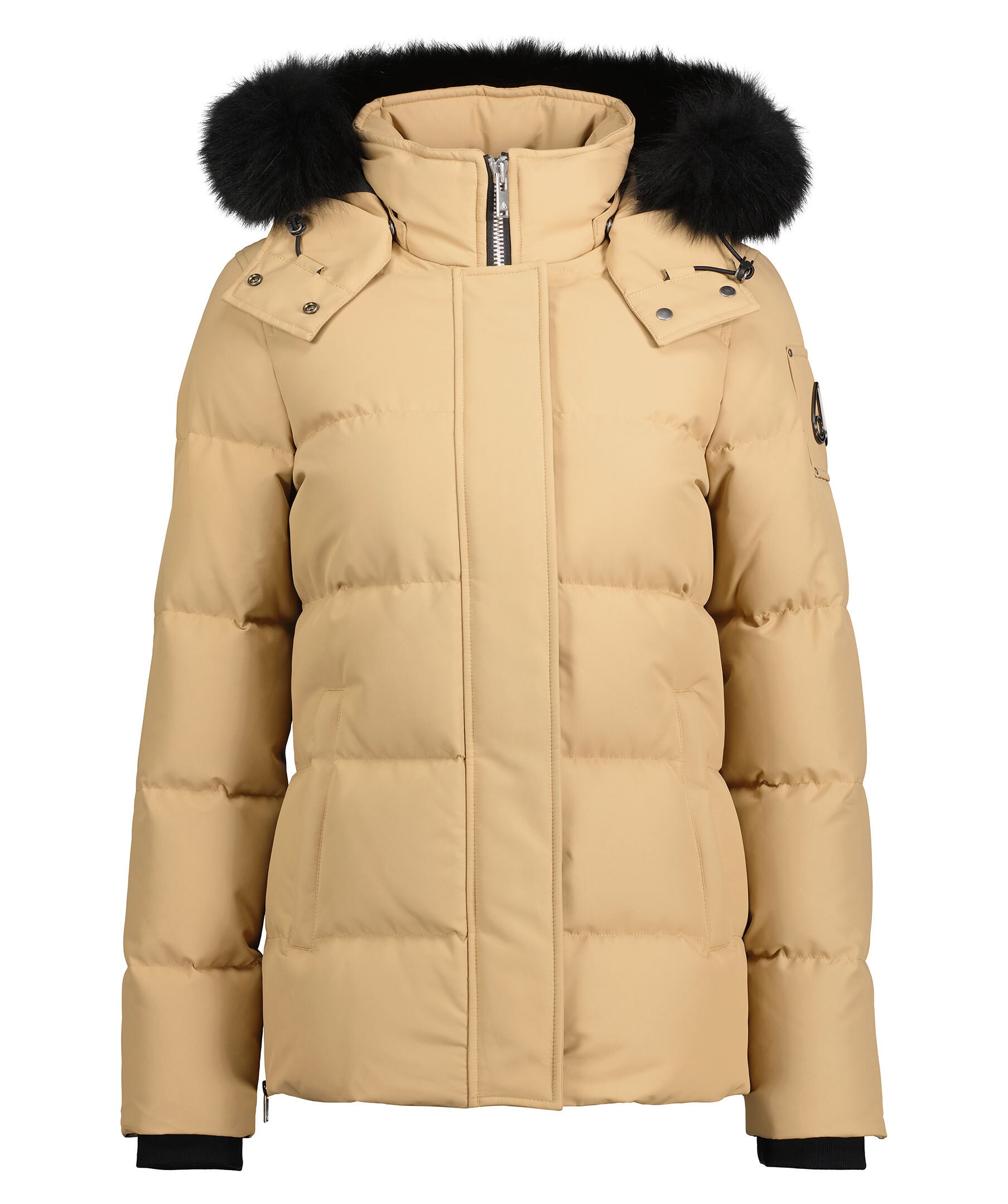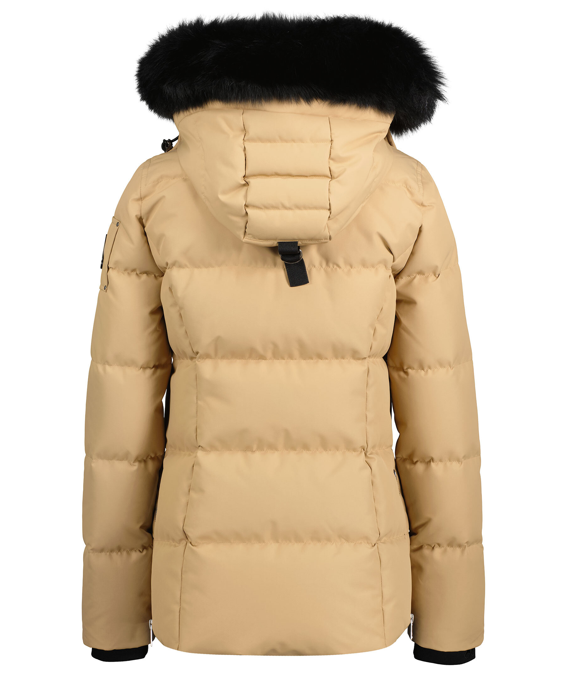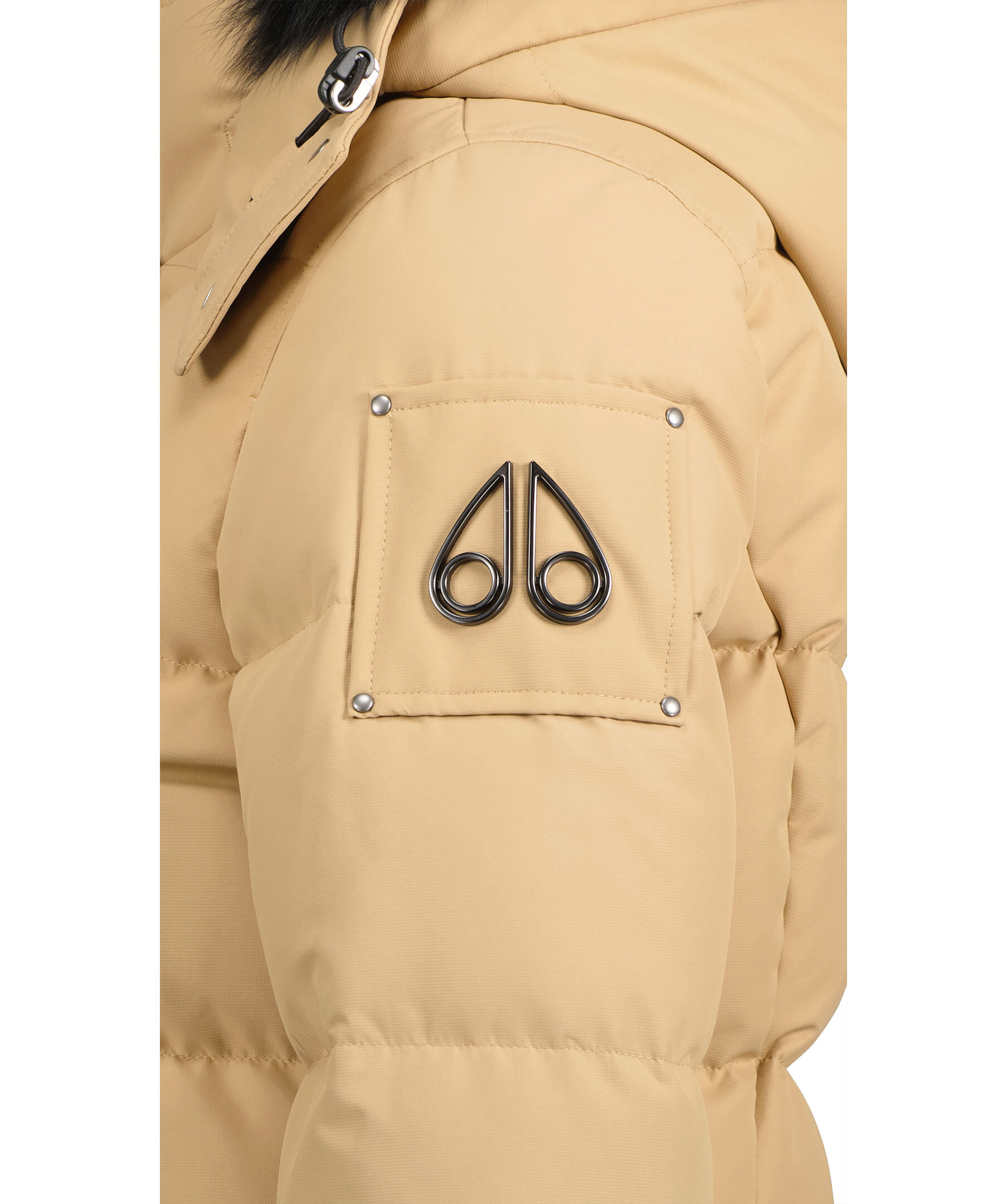 Beige dunjacka från det kanadensiska märket Moose Knuckles. Löstagbar luva med metallfärgade tryckknappar och svart naturpäls. Stängs framtill med dold tvåvägsdragkedja. Ribbstickade muddar. Två innerfickor, Två fickor fram till samtliga stängs med dragkedja. Ventilations dragkedjor i sidorna. metallfärgad logotyp på vänster arm.