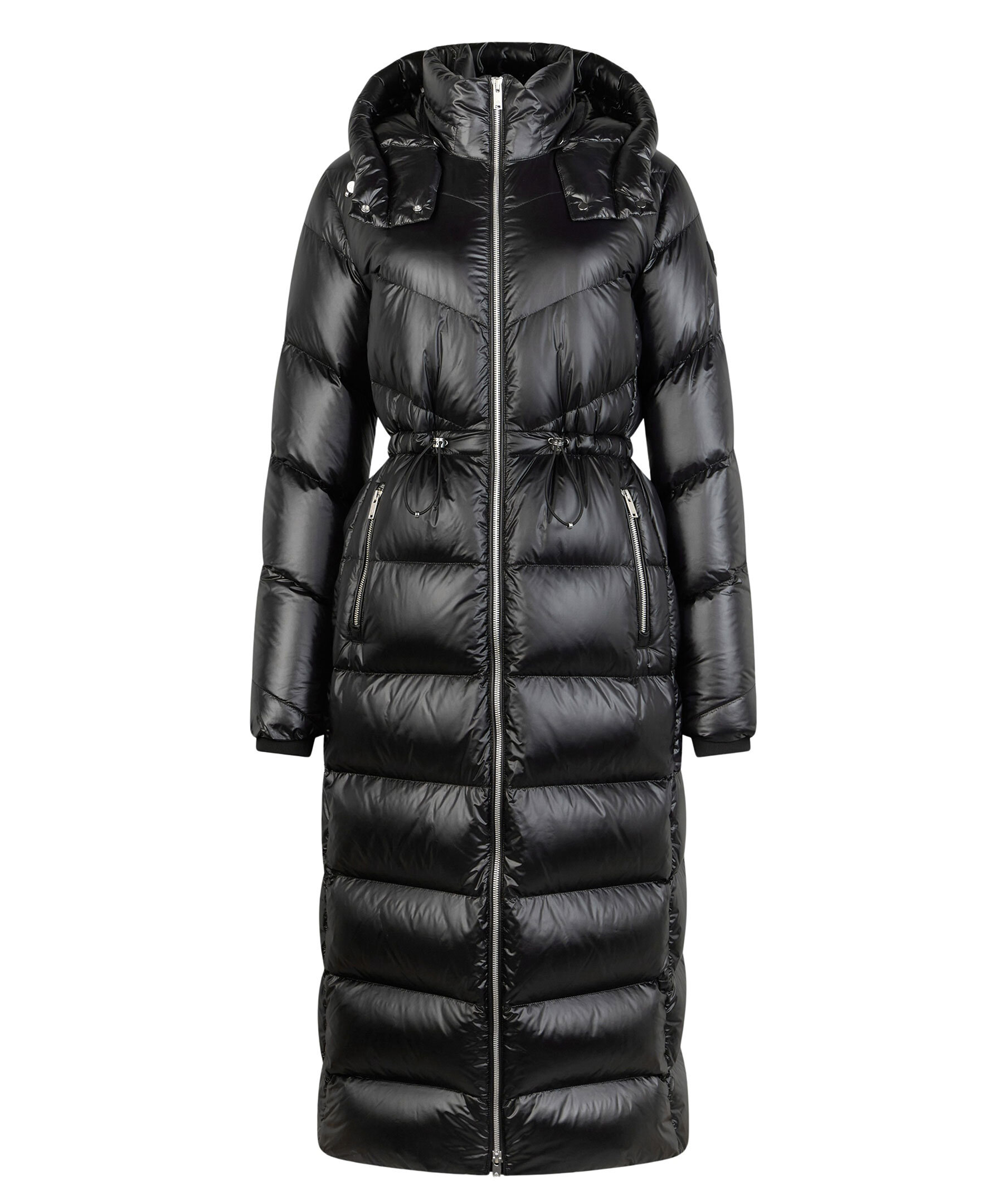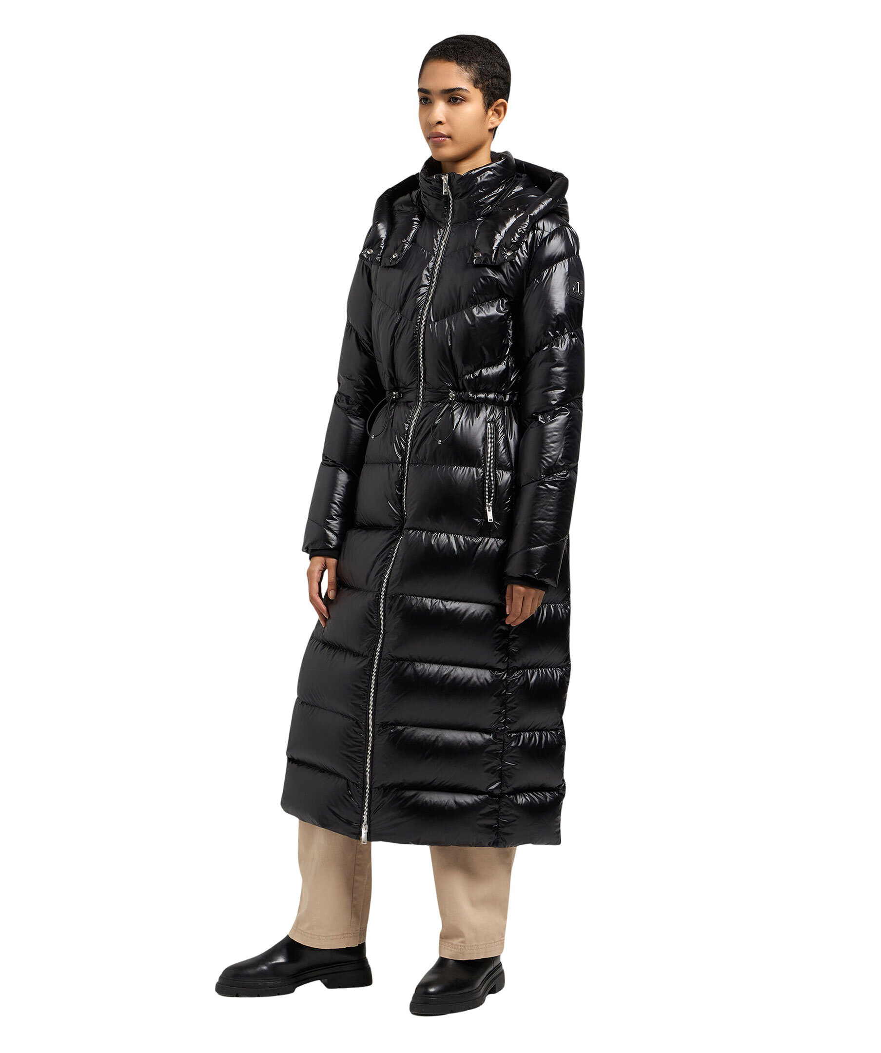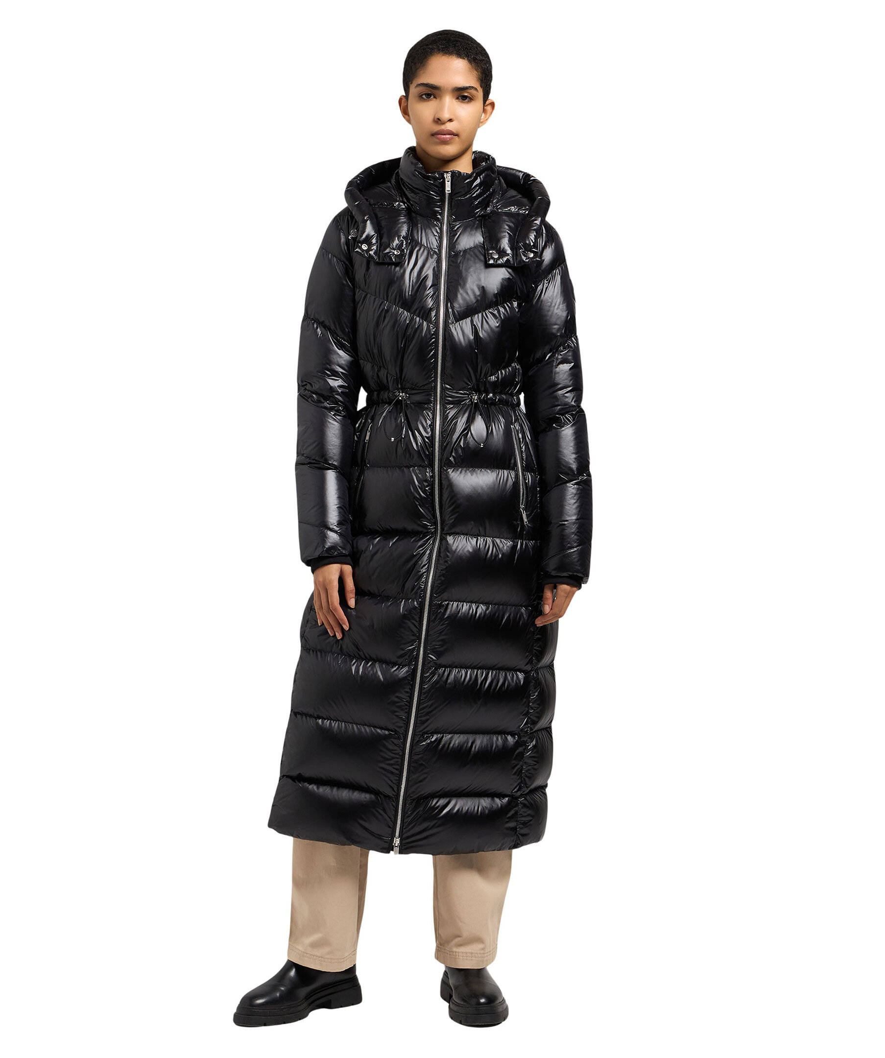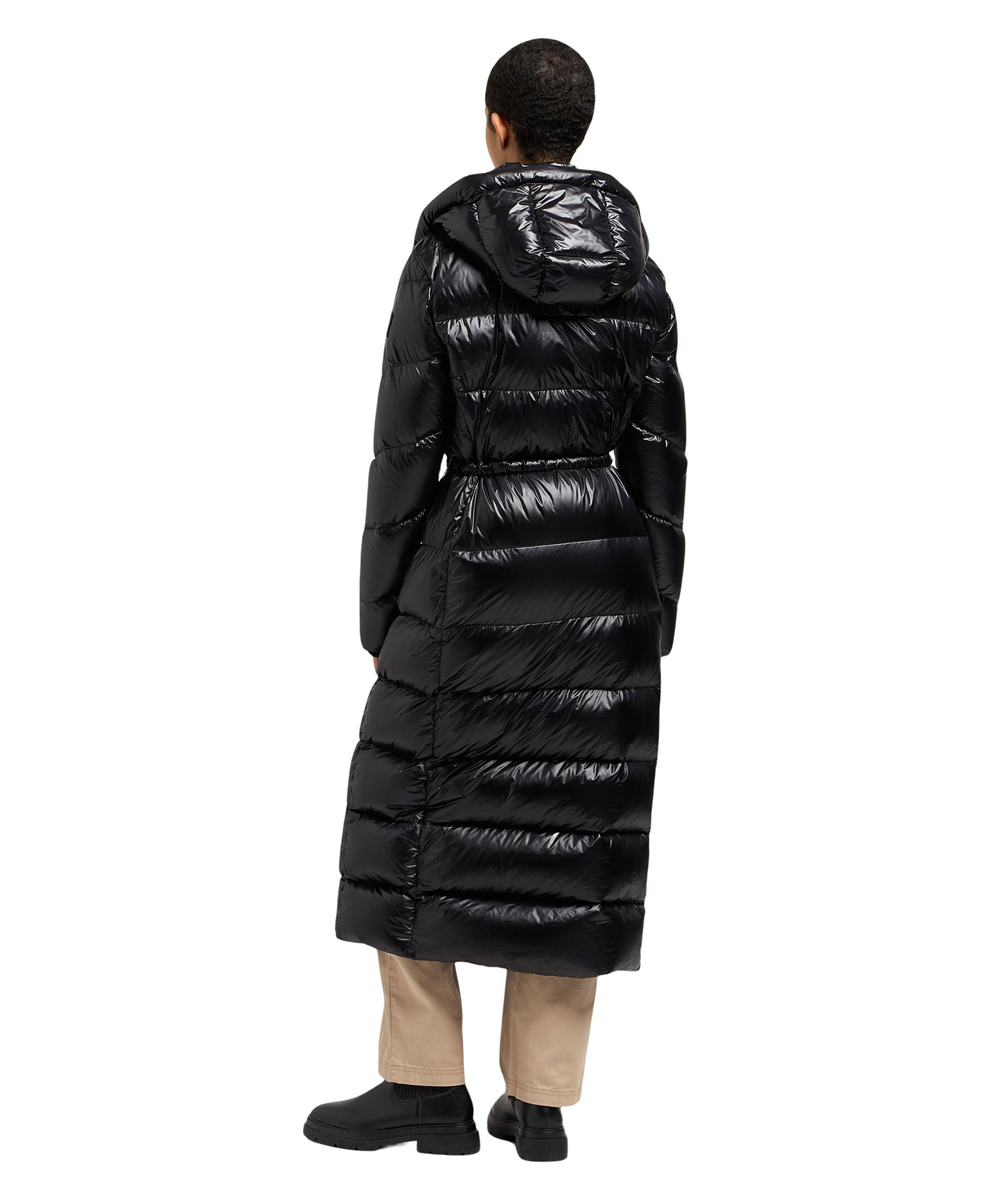 Lång, svart och glansig pufferjacka från Moose Knuckles. Jackan stängs med tvåvägsdragkedja och har en avtagbar huva med dragsko, två sidfickor med dragkedja, två innerfickor med dragkedja och en dold dragsko i midjan för en mer figursydd passform. Patch med logotyp i metall på vänster ärm. Tillverkad i nylon med dunfyllning.