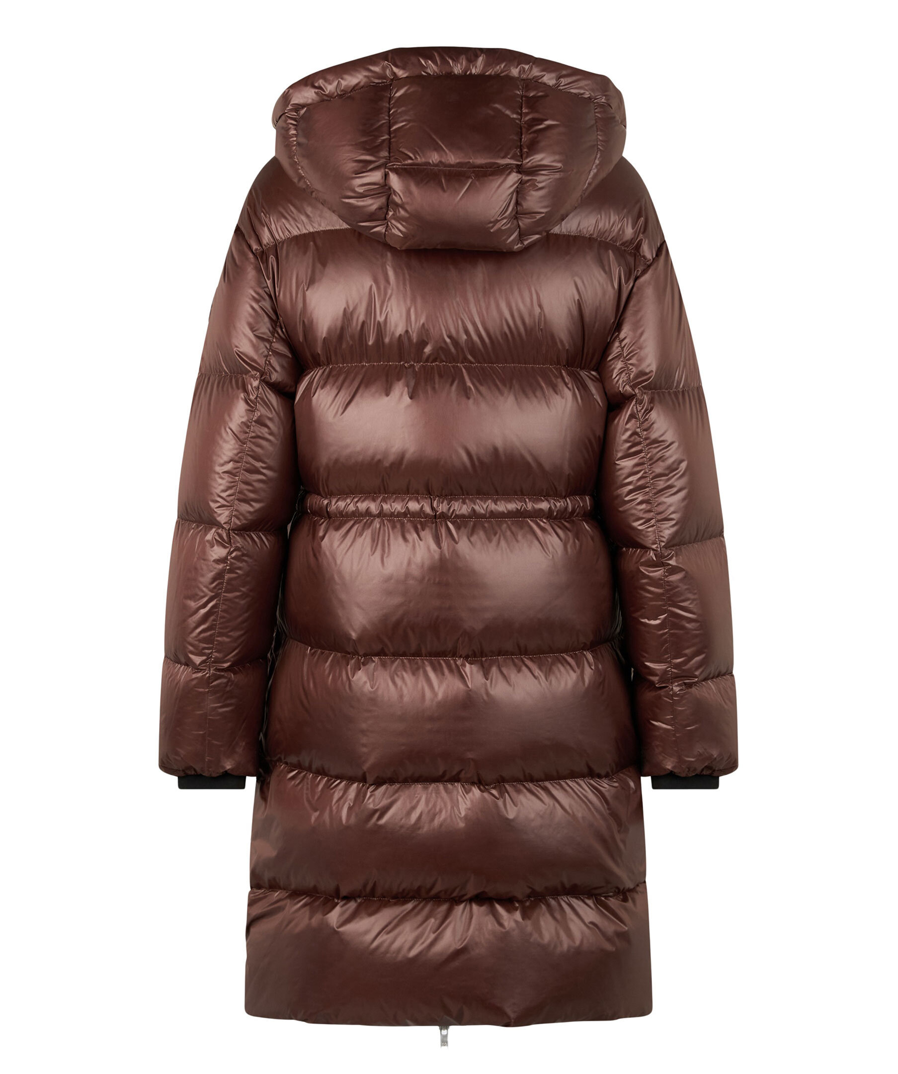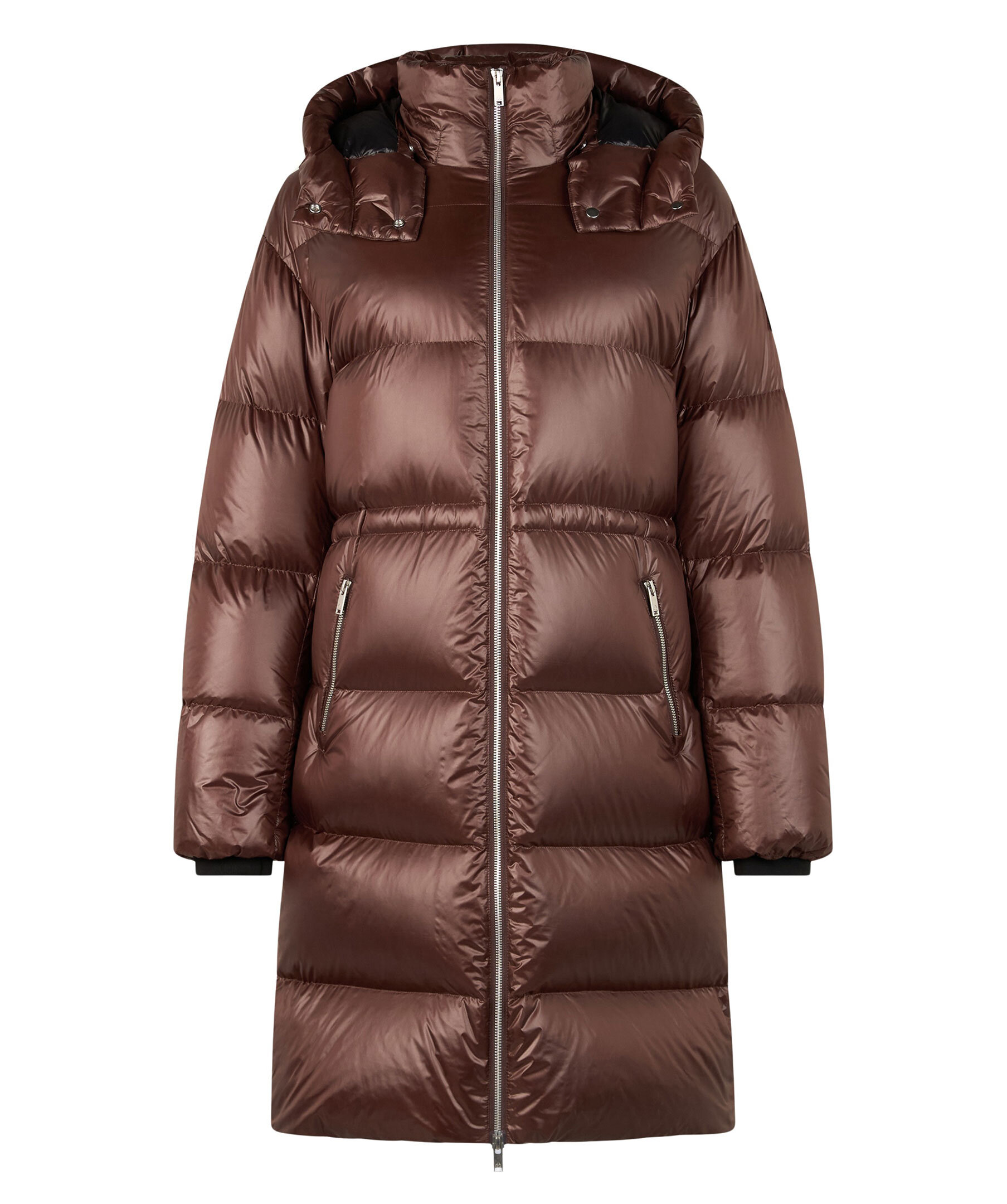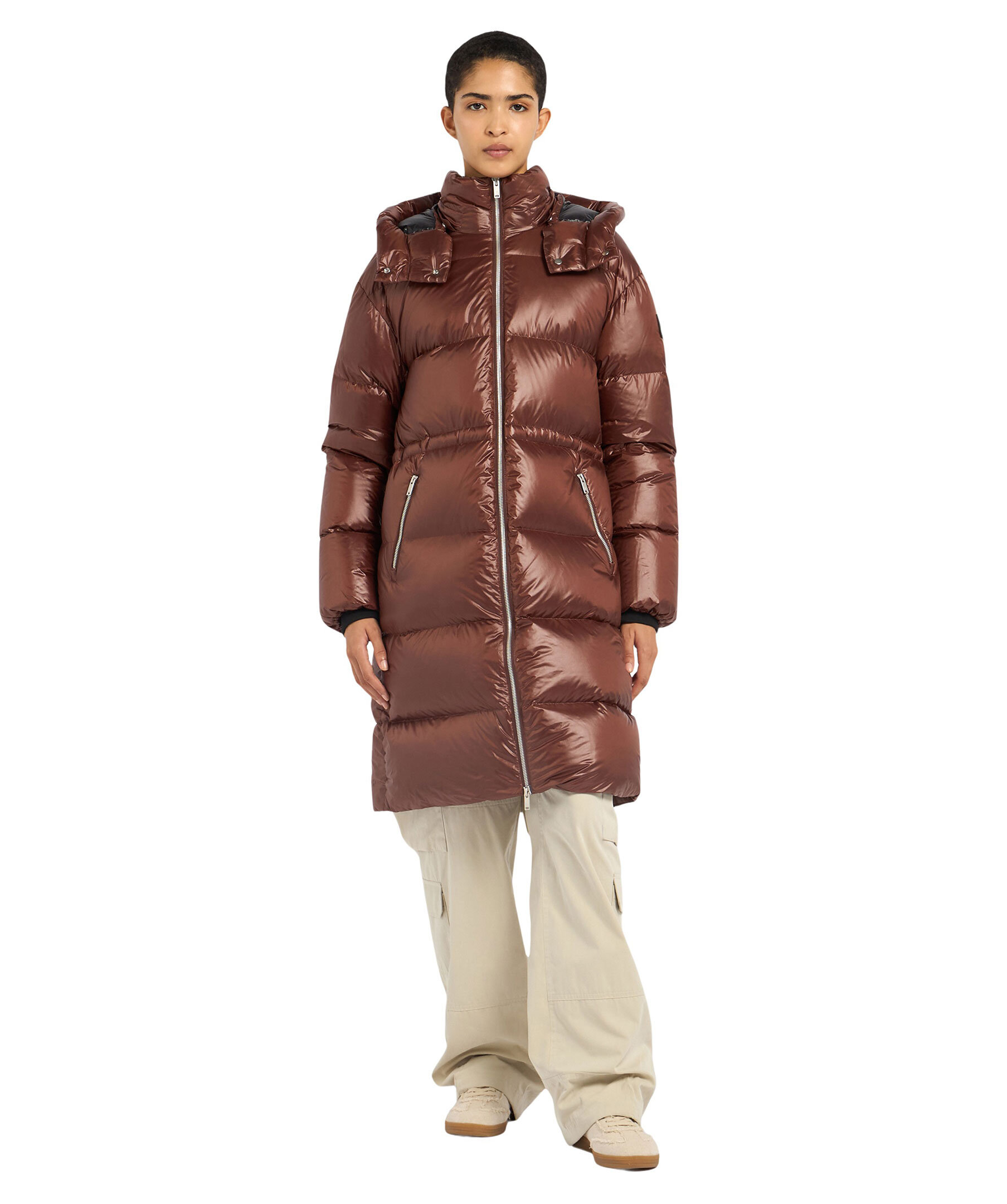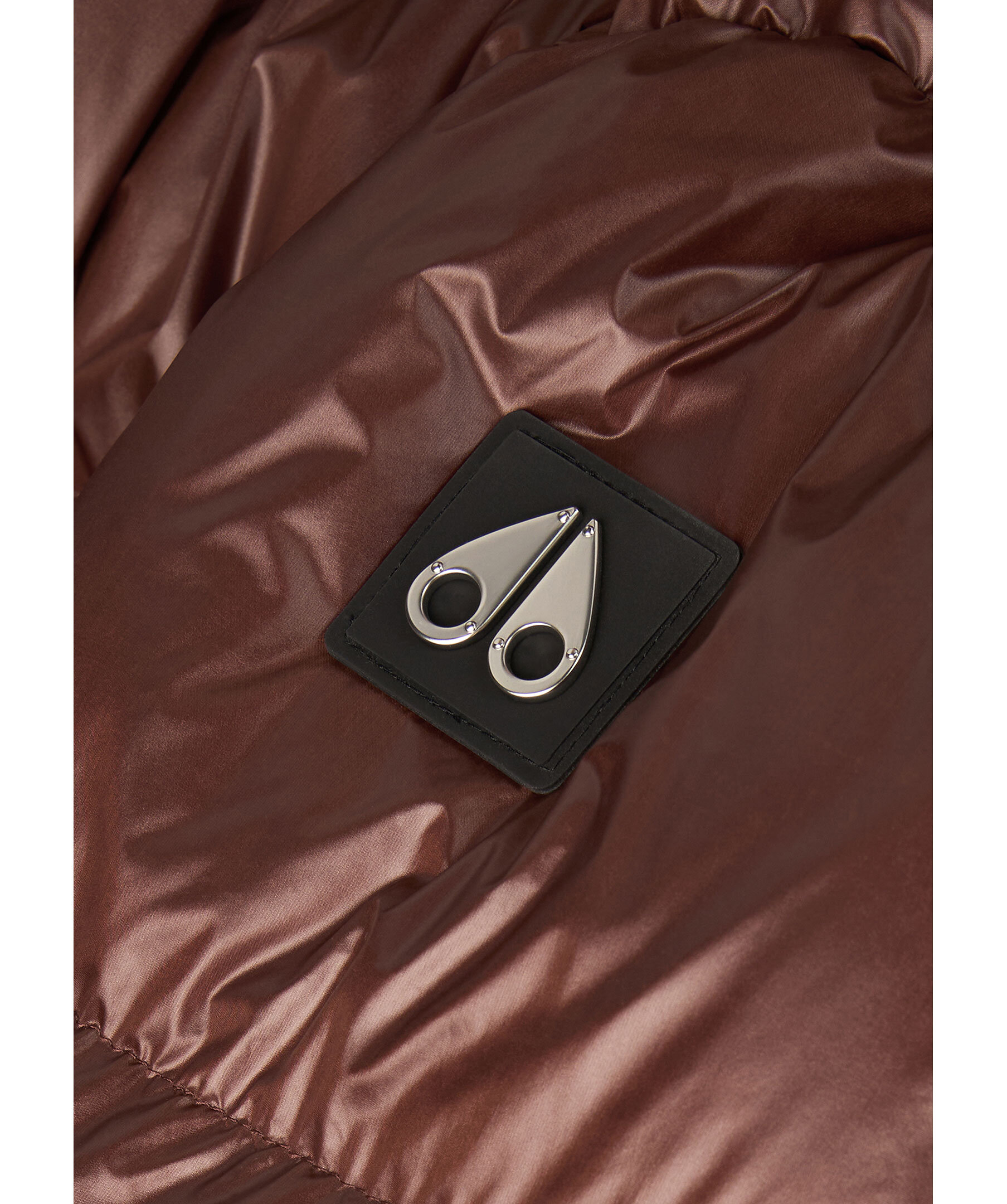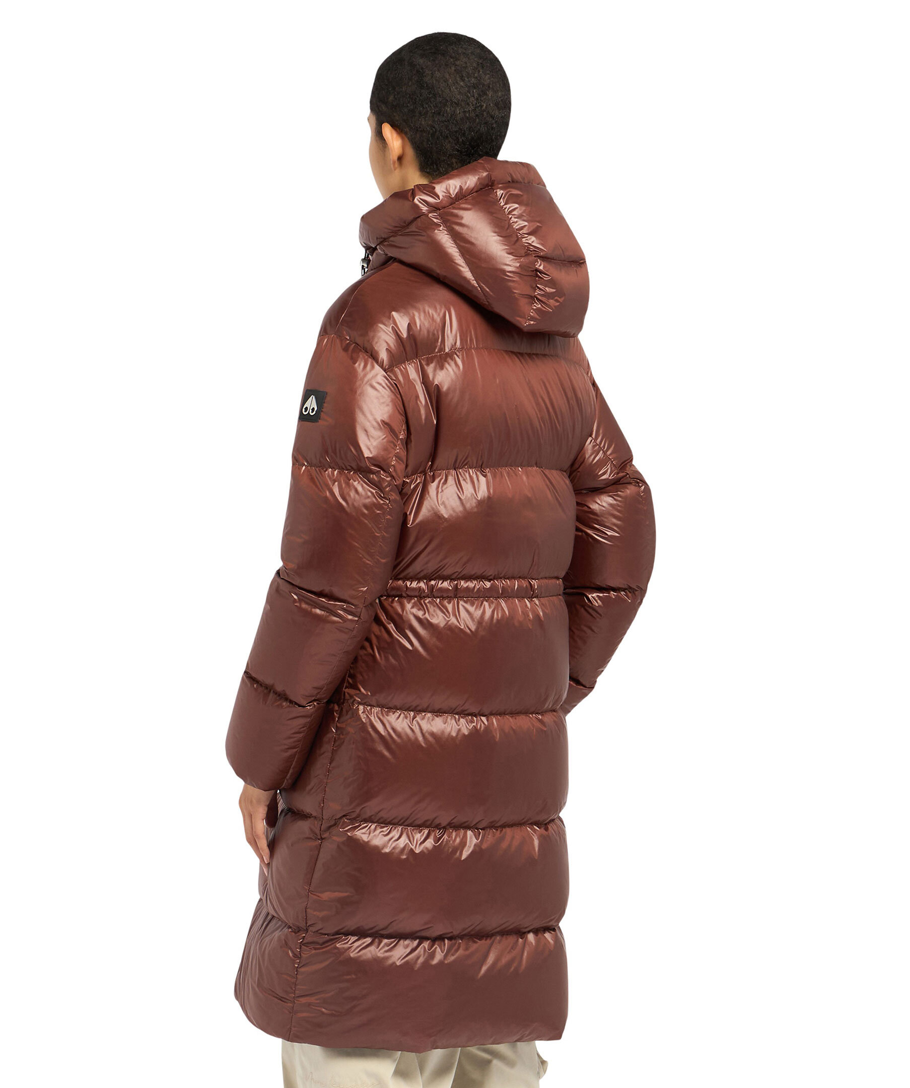 Brunröd, lång parka från Moose Knuckles. Jackan stängs med tvåvägsdragkedja framtill och har ett glansigt yttertyg, en huva med dragsko, två sidfickor, innerfickor, dold dragsko i midjan samt metallogotyp på vänster ärm. Tillverkad i nylon med gåsfjädervaddering.