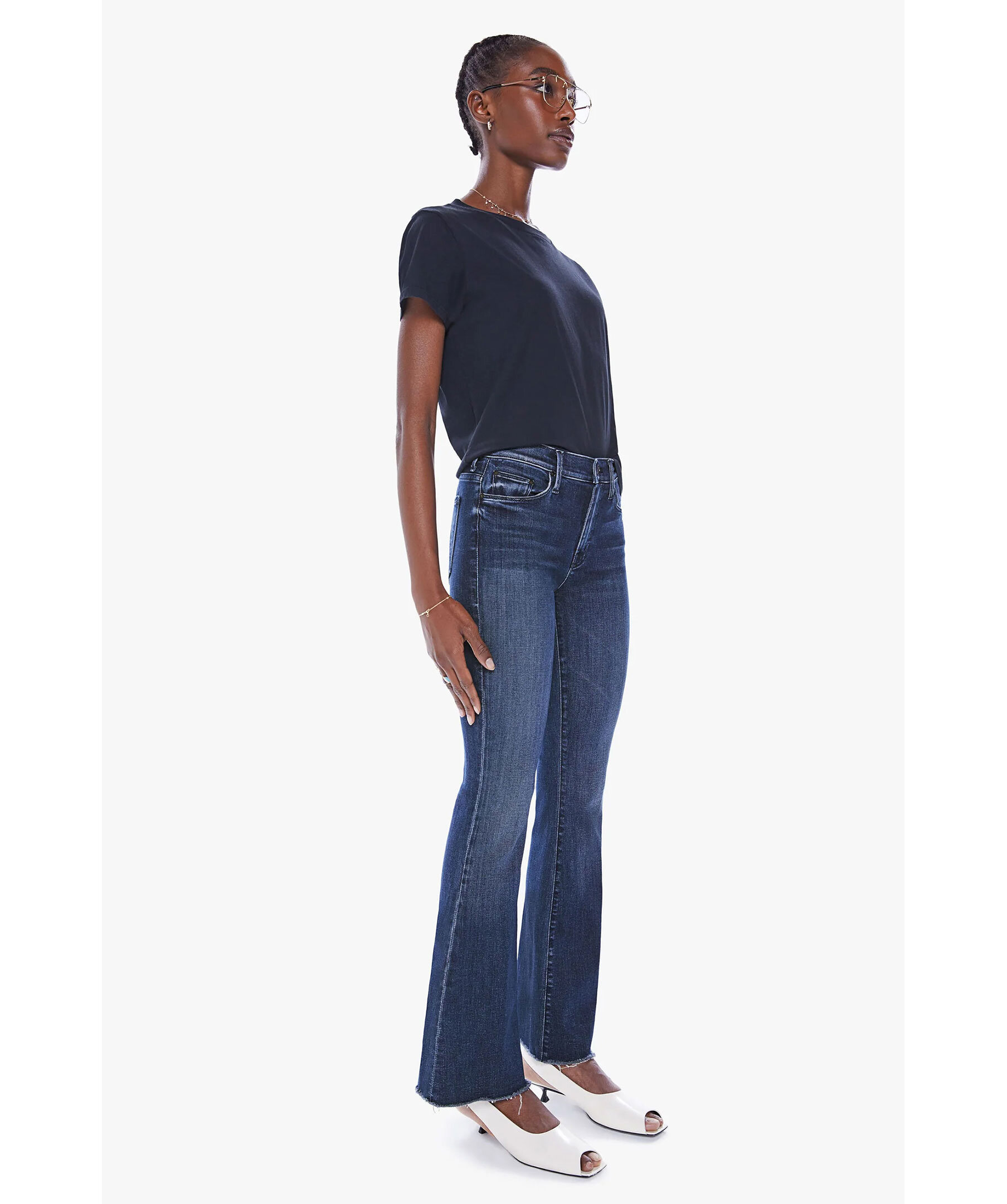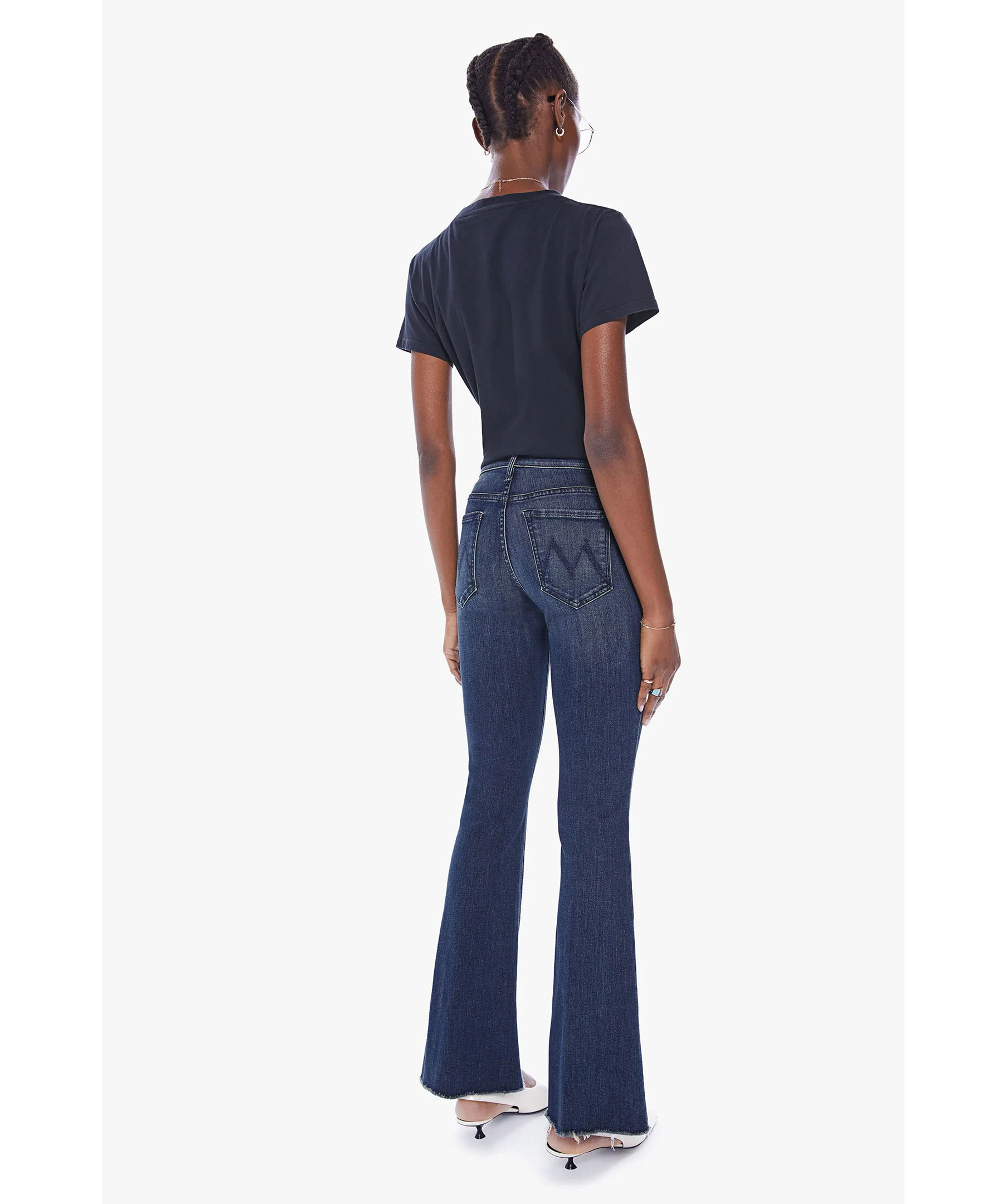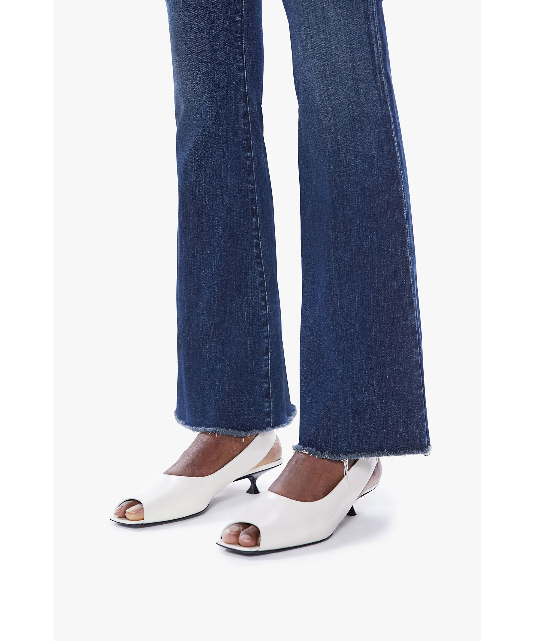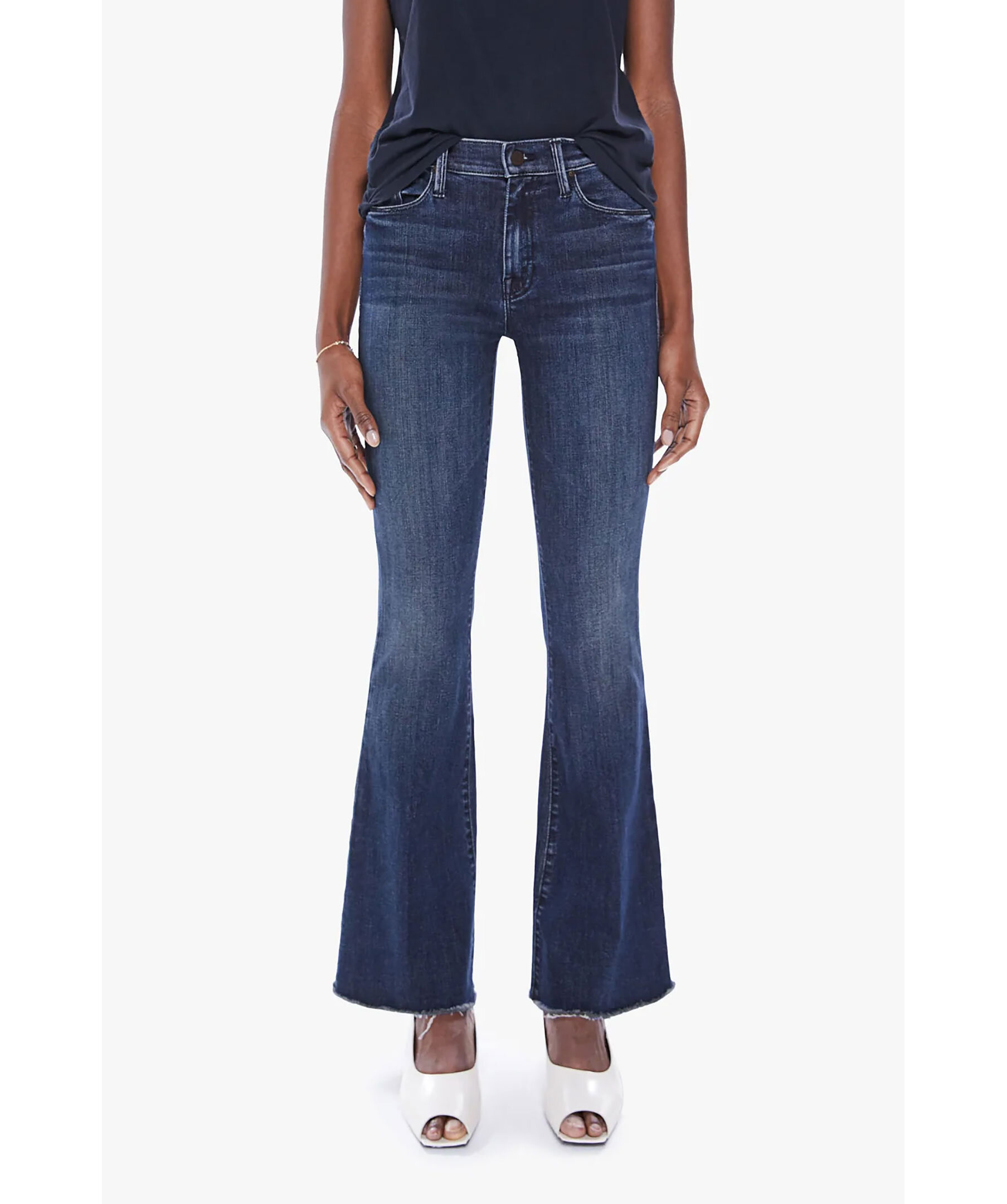 Blåa jeans med hög midja och utställda ben från MOTHER DENIM. Fransig nederkant, tillverkade av mjuk stretchdenim i en mellanmörk blå nyans med subtila blekningar och slitningar. Perfekt för en trendig och avslappnad stil.