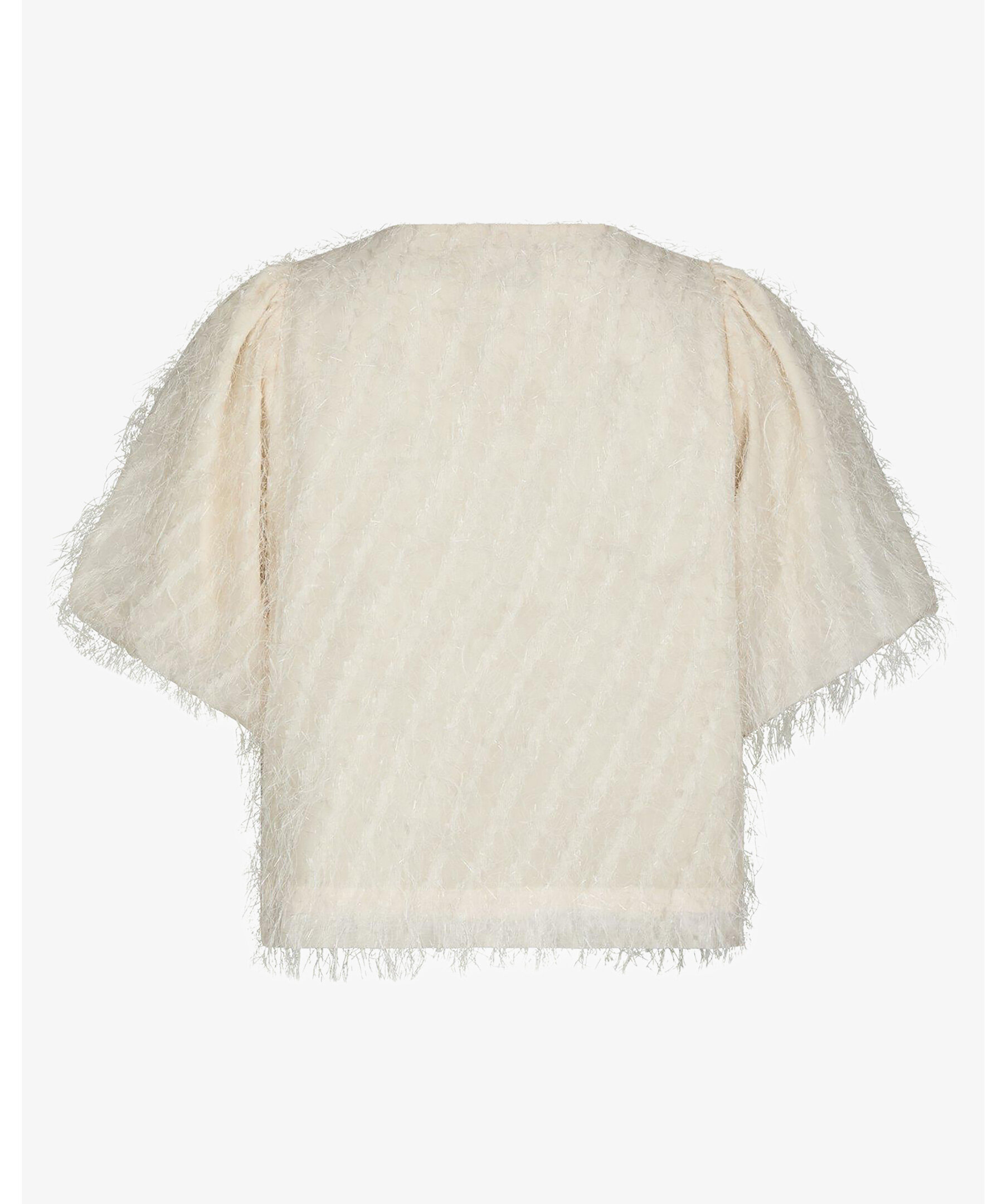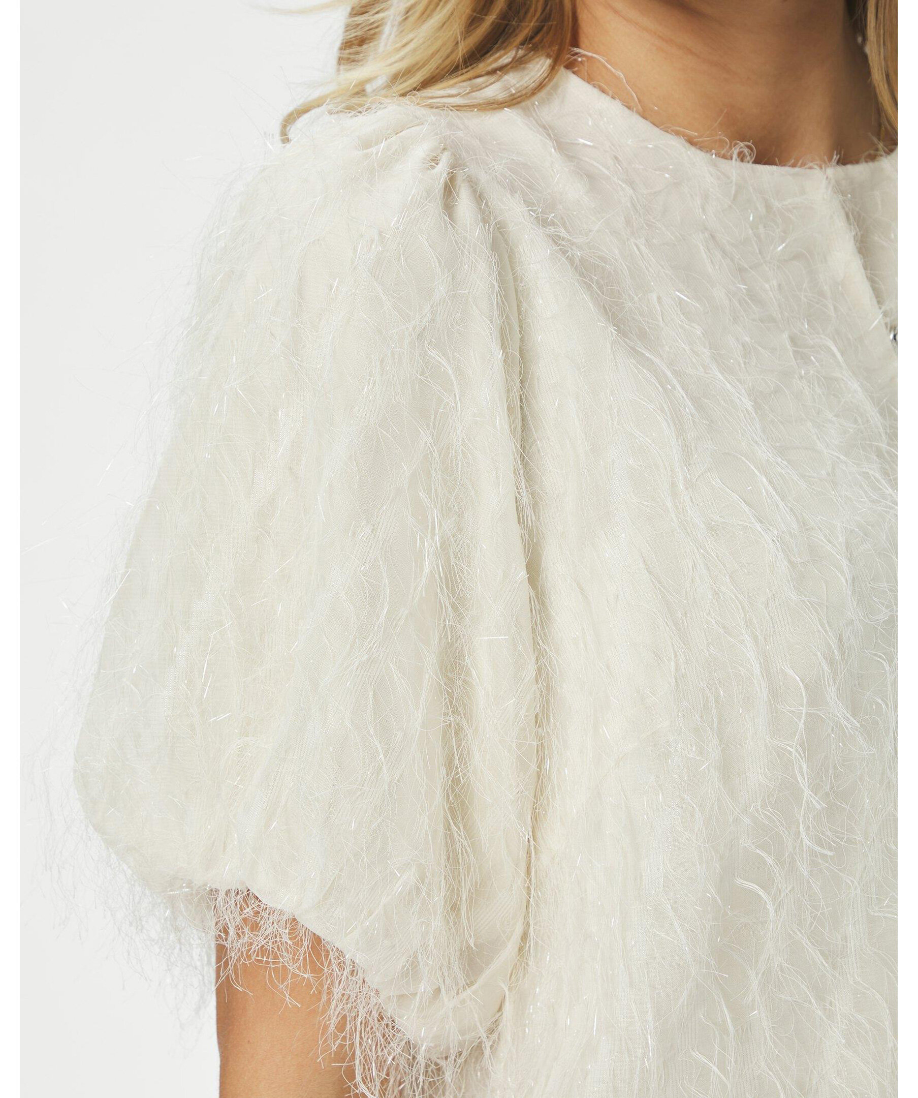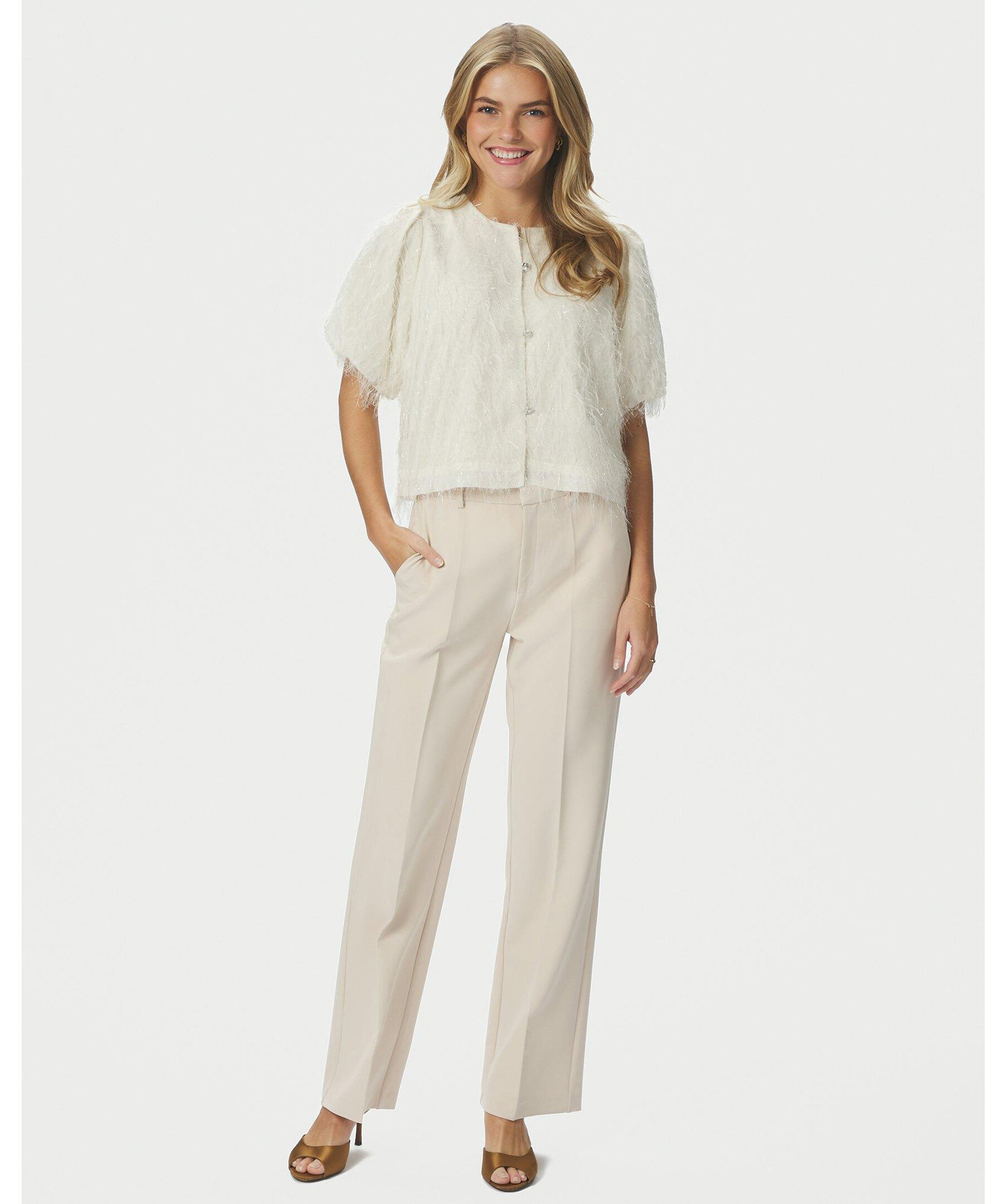 Vit topp med lösa korta ärmar och knäppning fram. Modellen är 176 cm lång och bär storlek 36.
