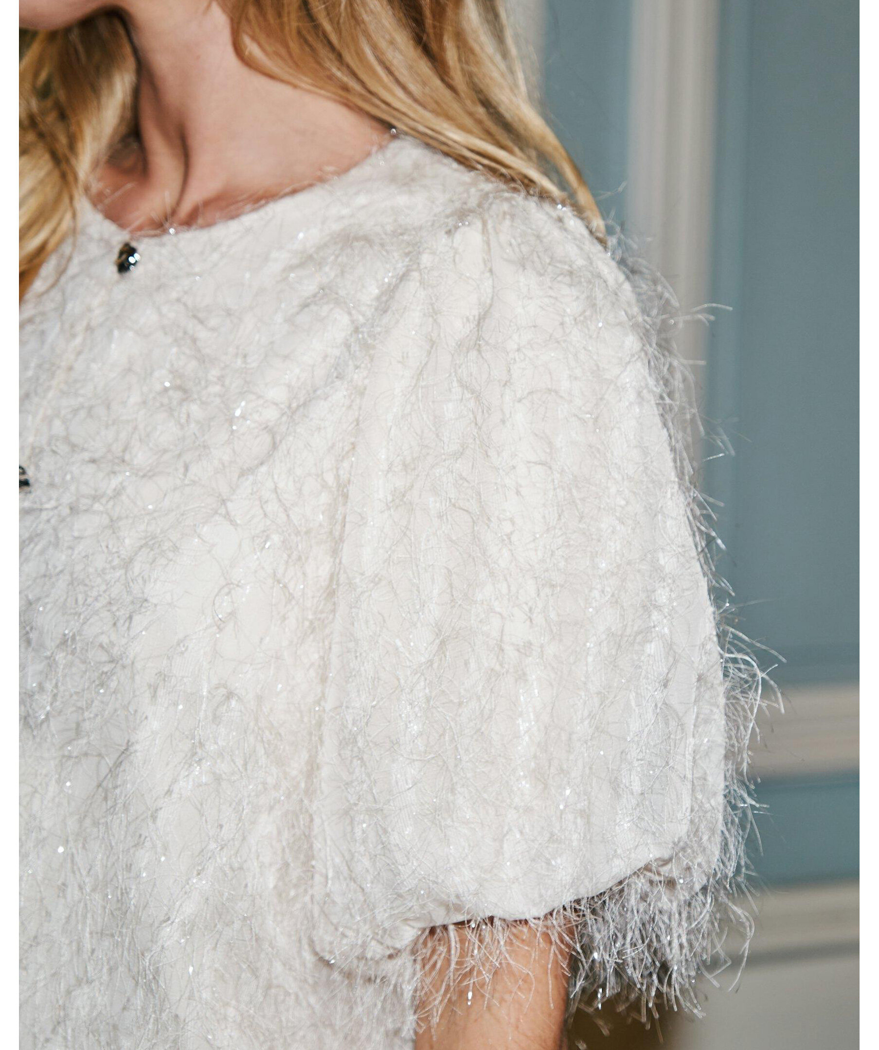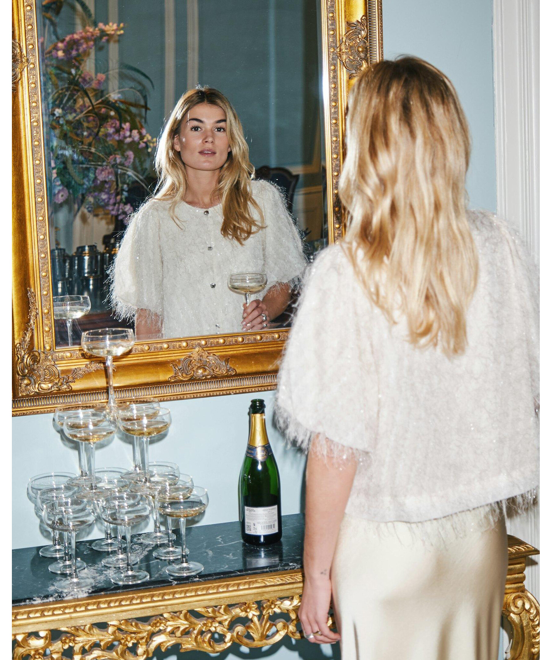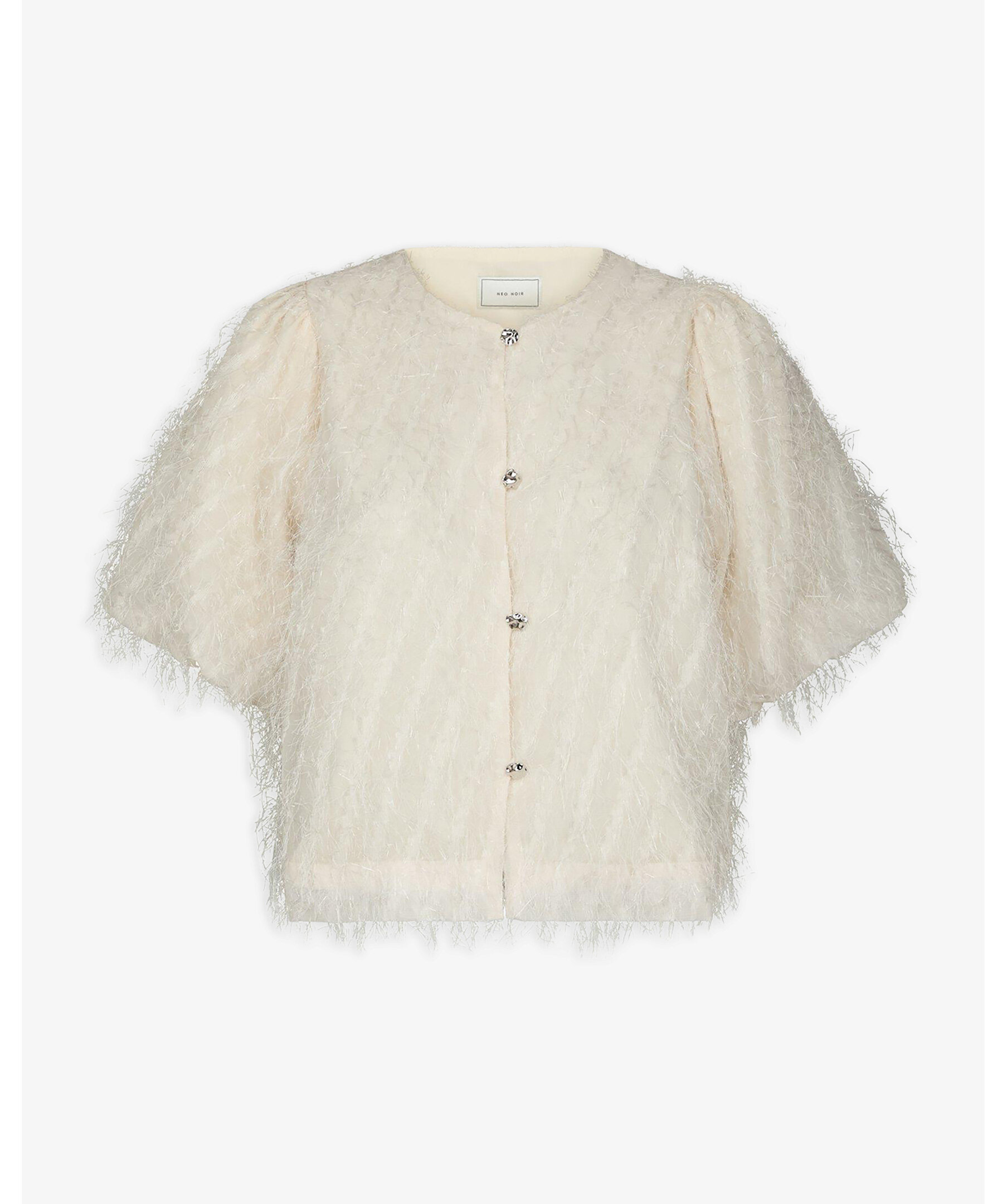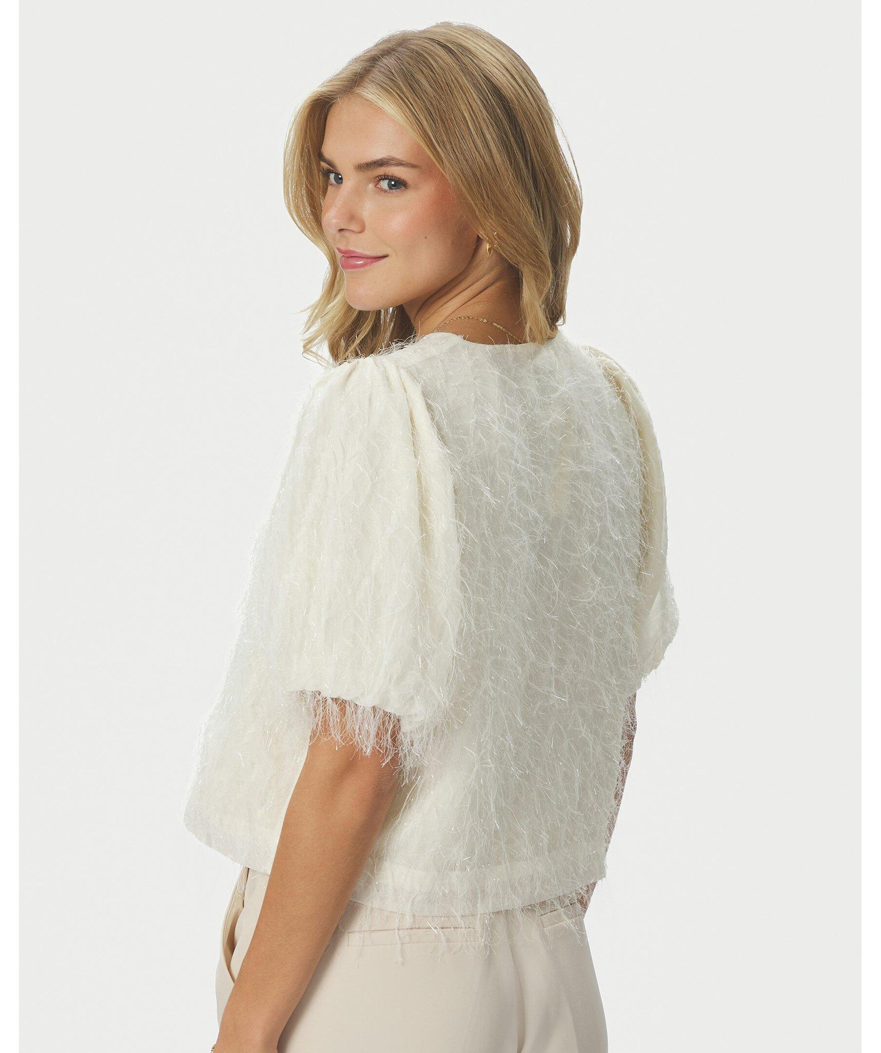Vit topp med lösa korta ärmar och knäppning fram. Modellen är 176 cm lång och bär storlek 36.