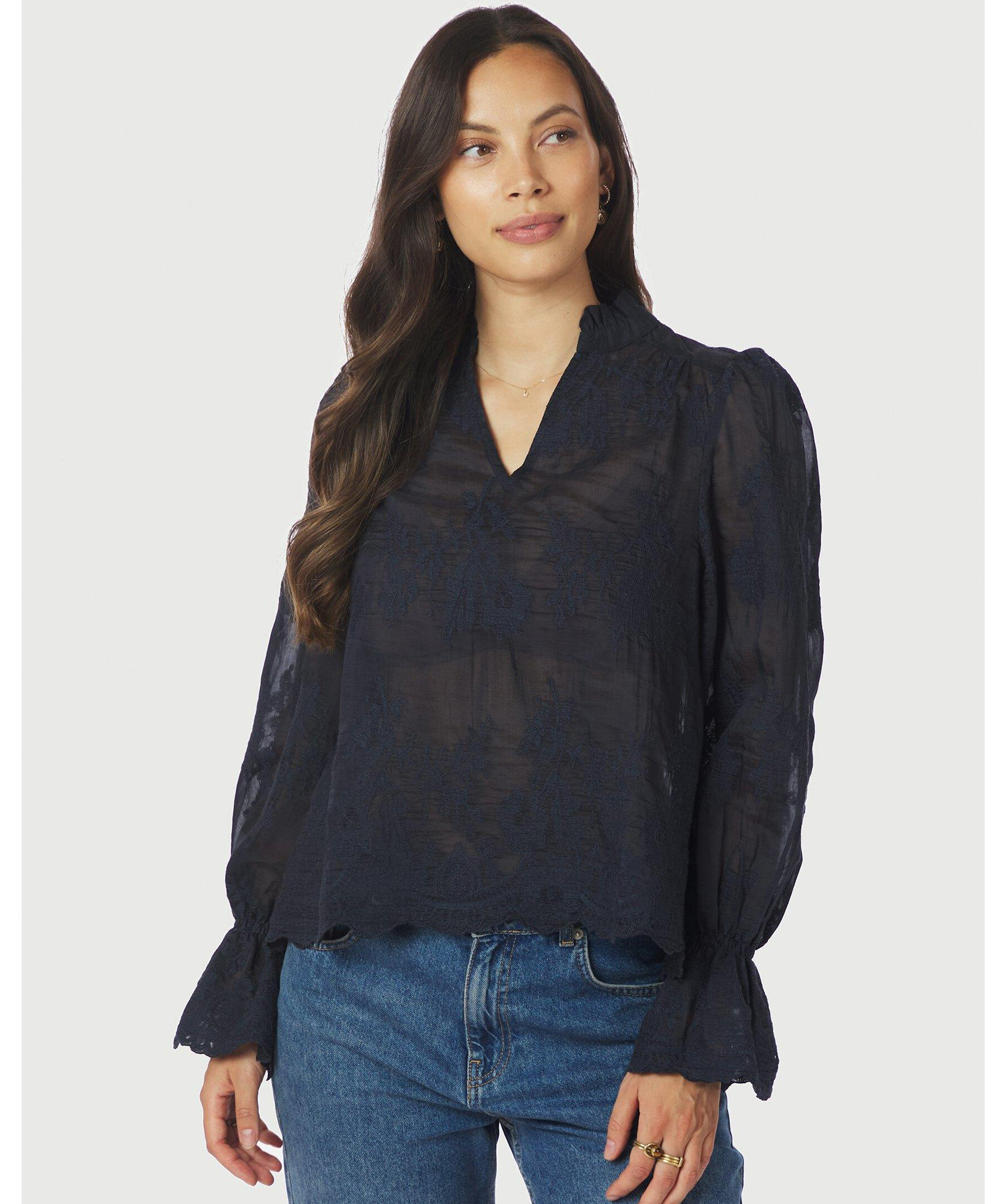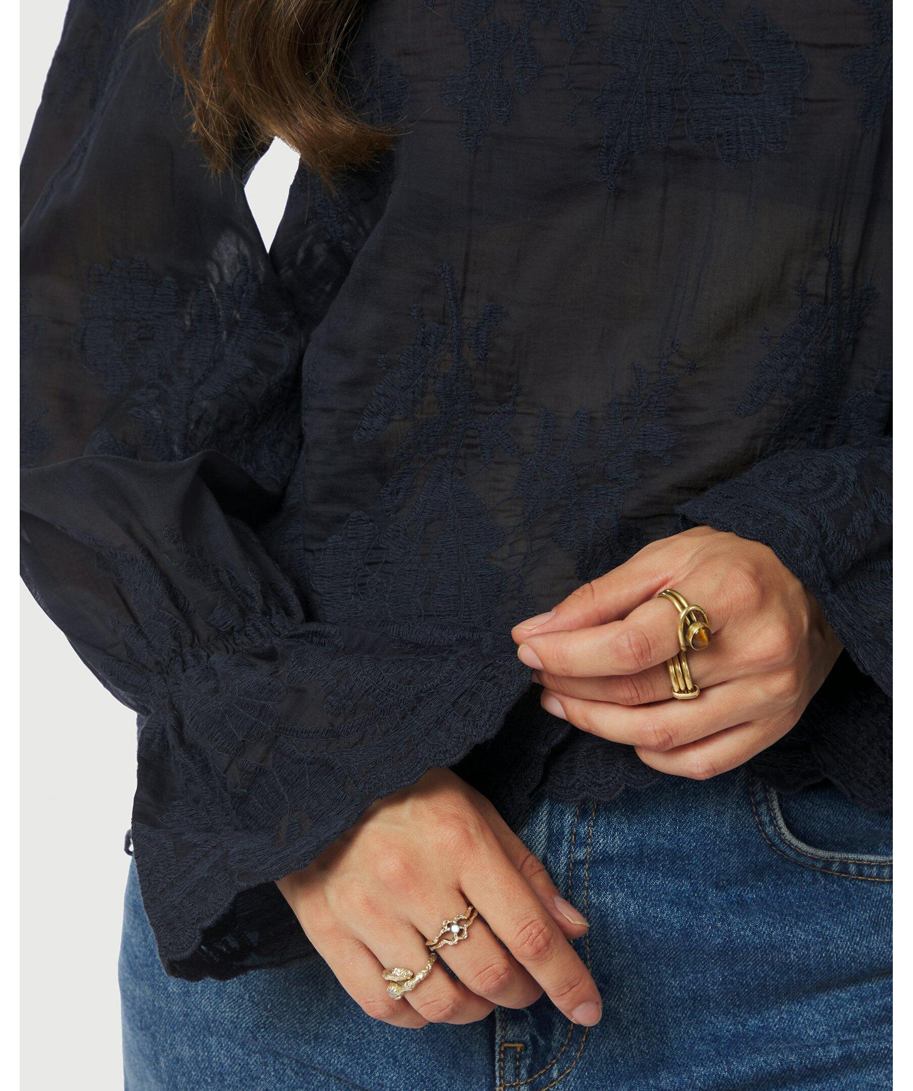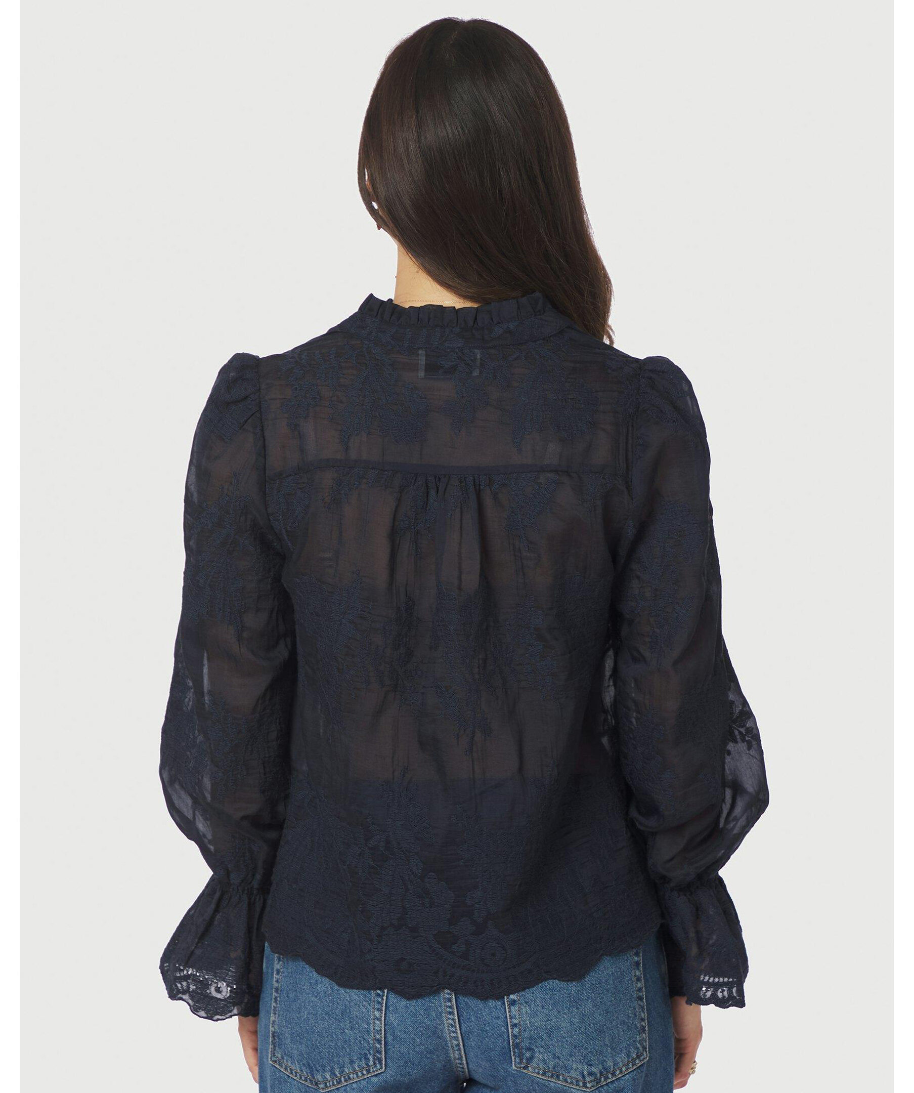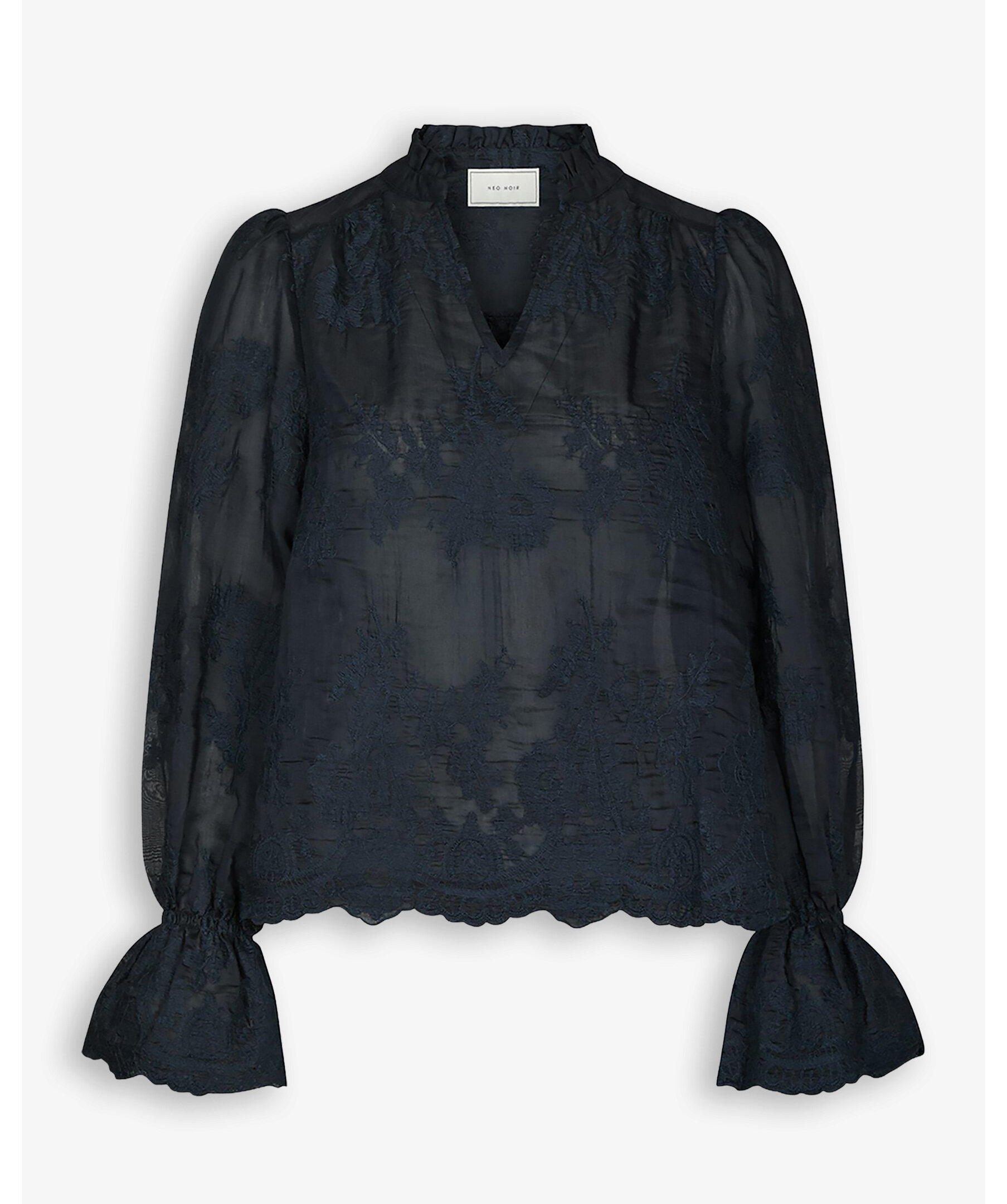 Mörkblå blus med bomullsbroderi från Neo Noir. Blusen har långa ärmar och en v-ringning.