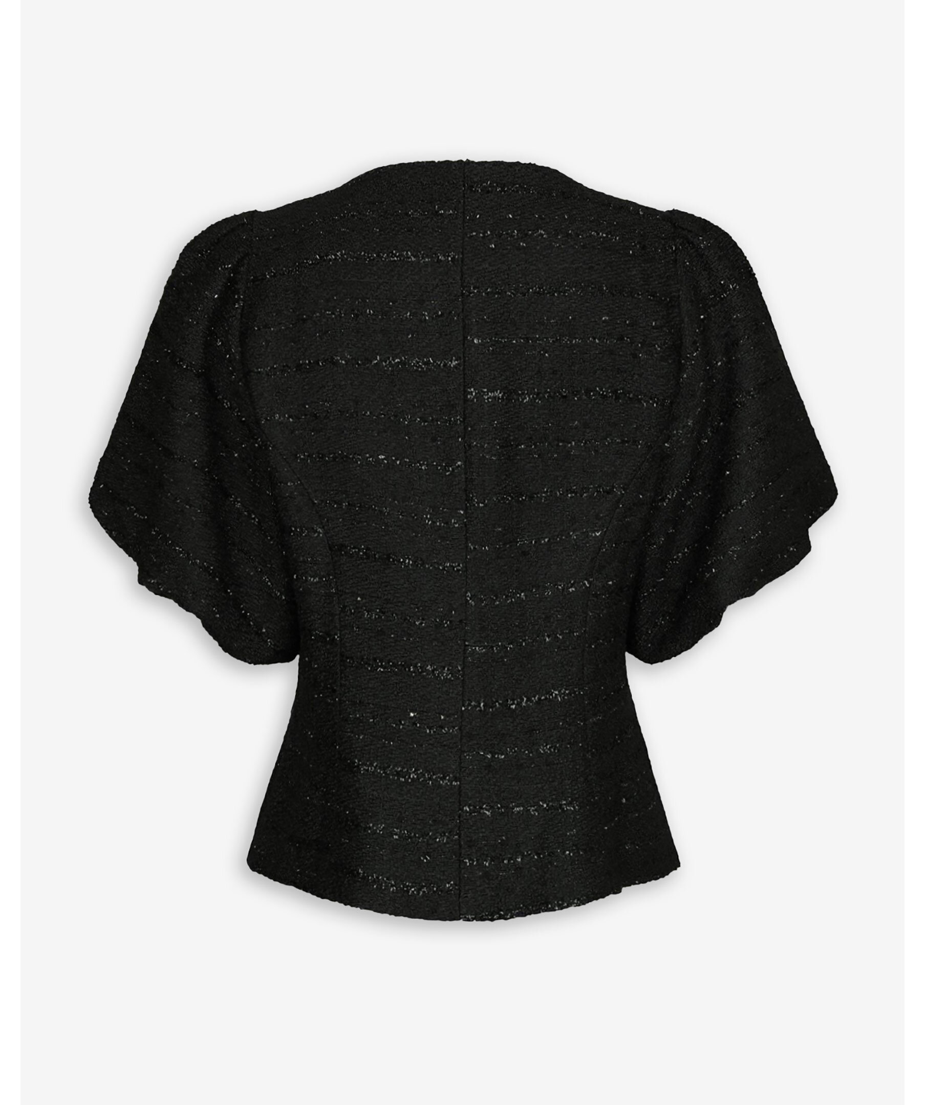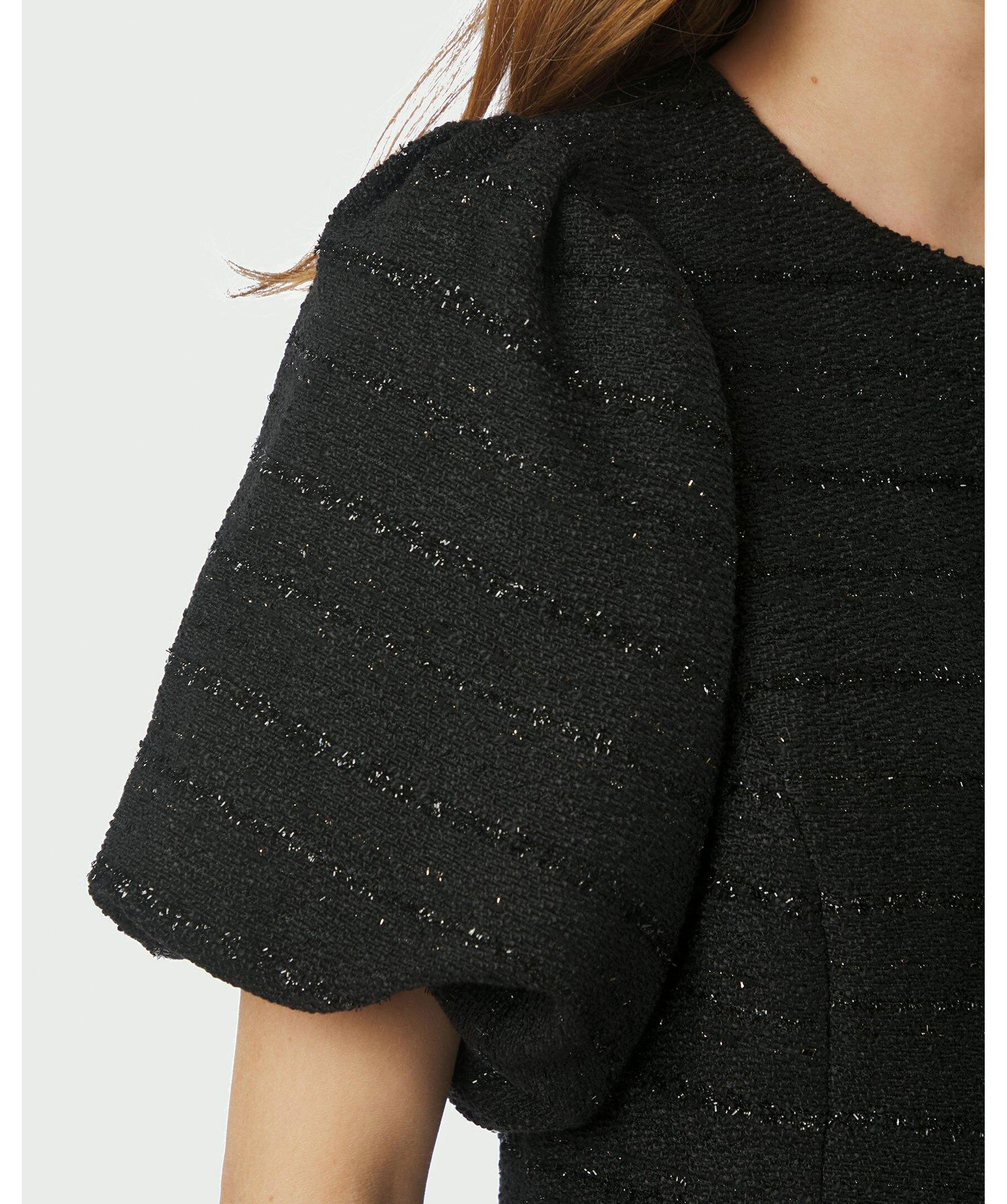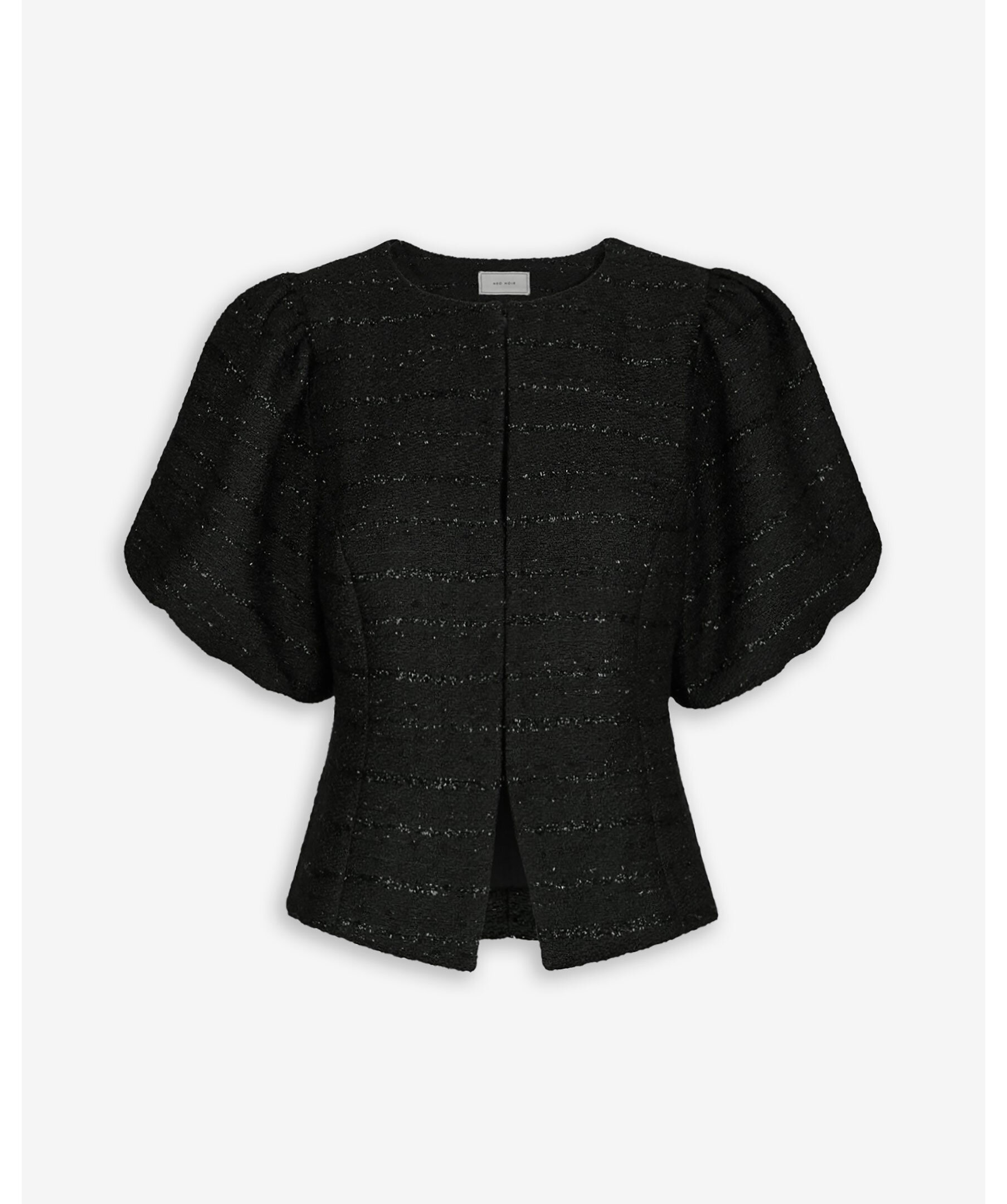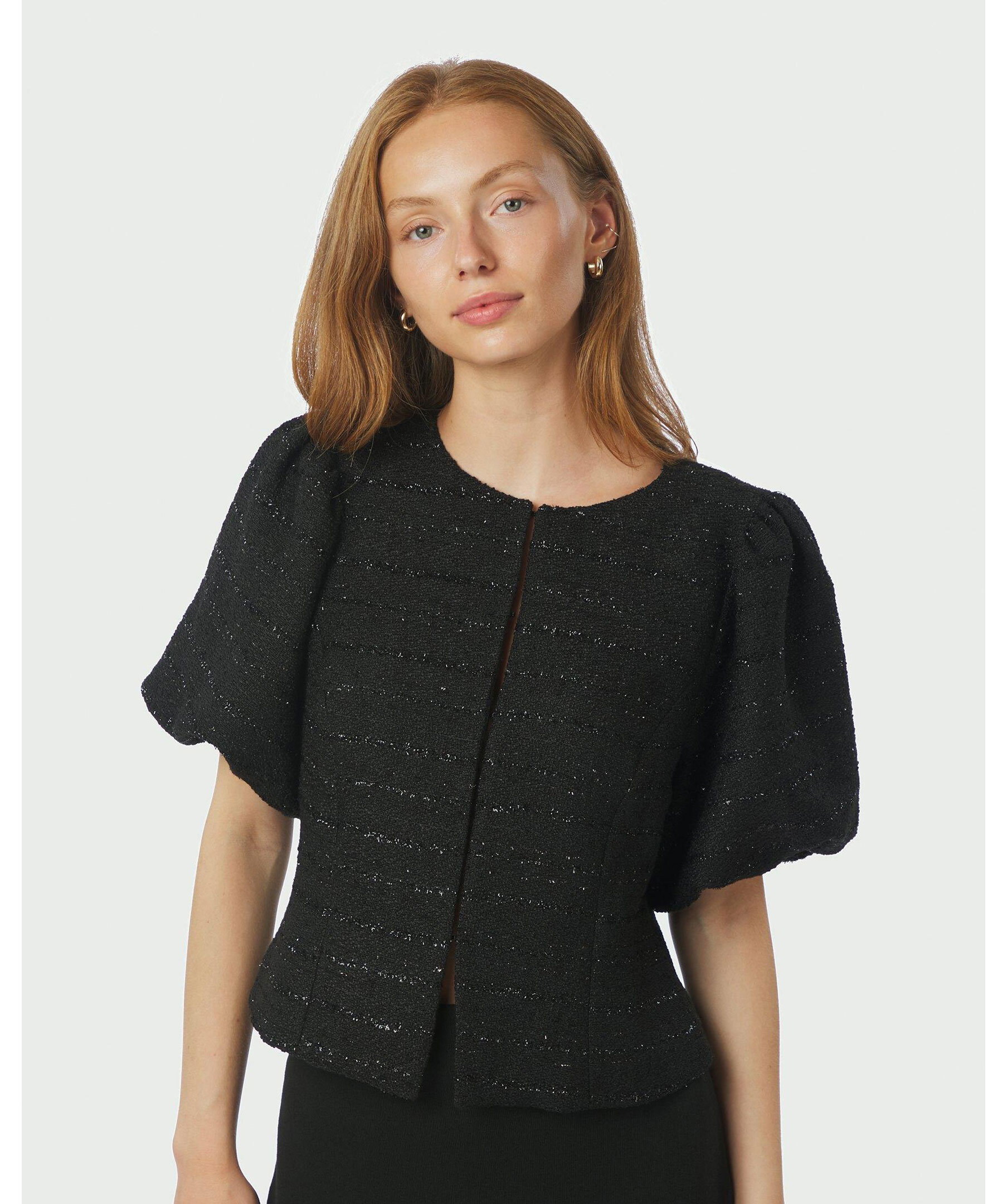 Svart blus från Neo Noir i ett bouclé-tyg med subtil glimmereffekt. Modellen har rund halsringning, korta puffärmar och knappstängning framtill. Tillverkad i 100% polyester.