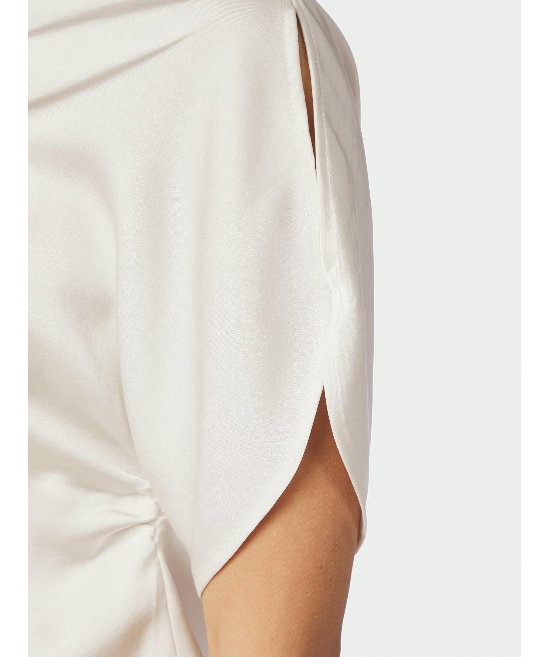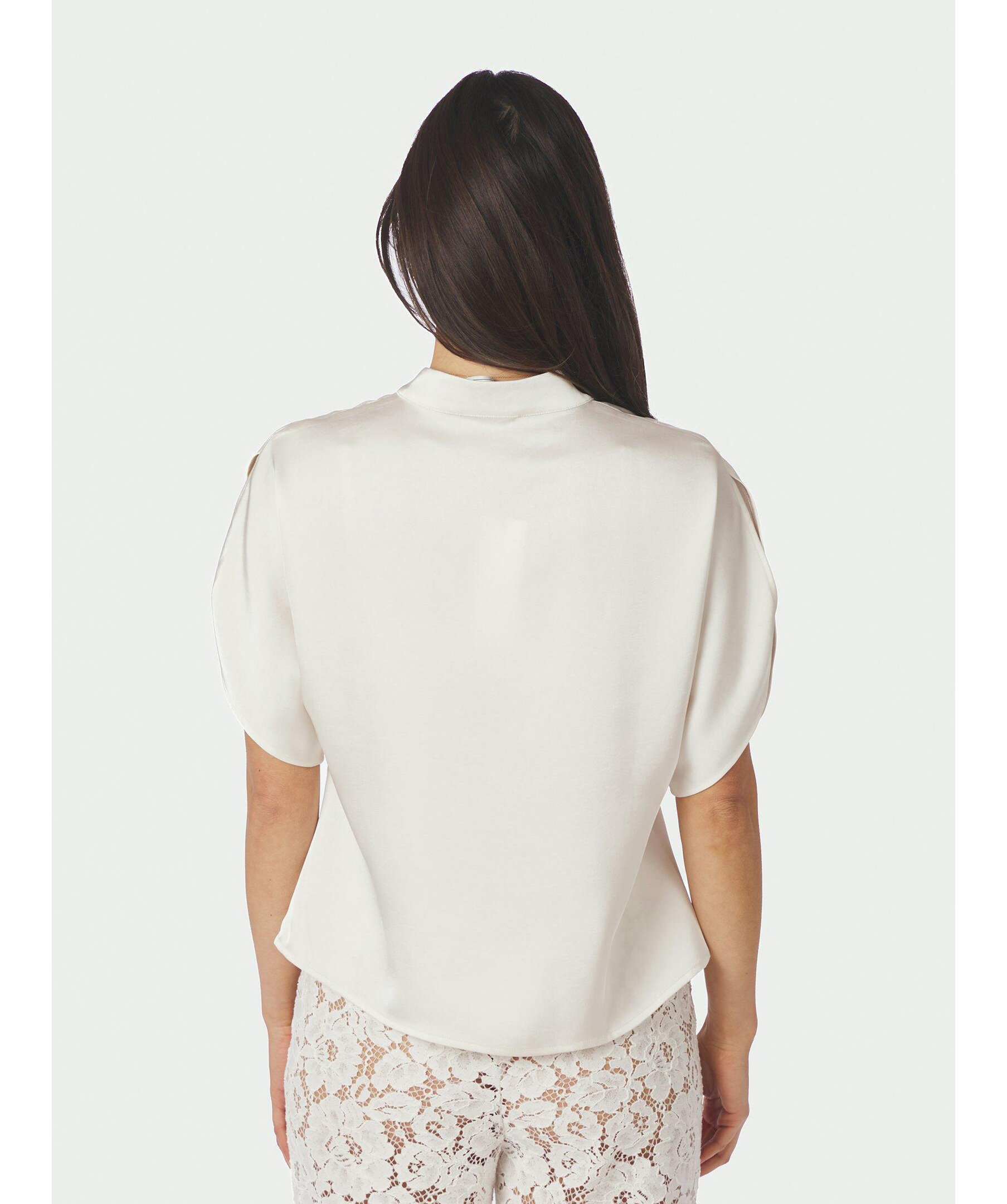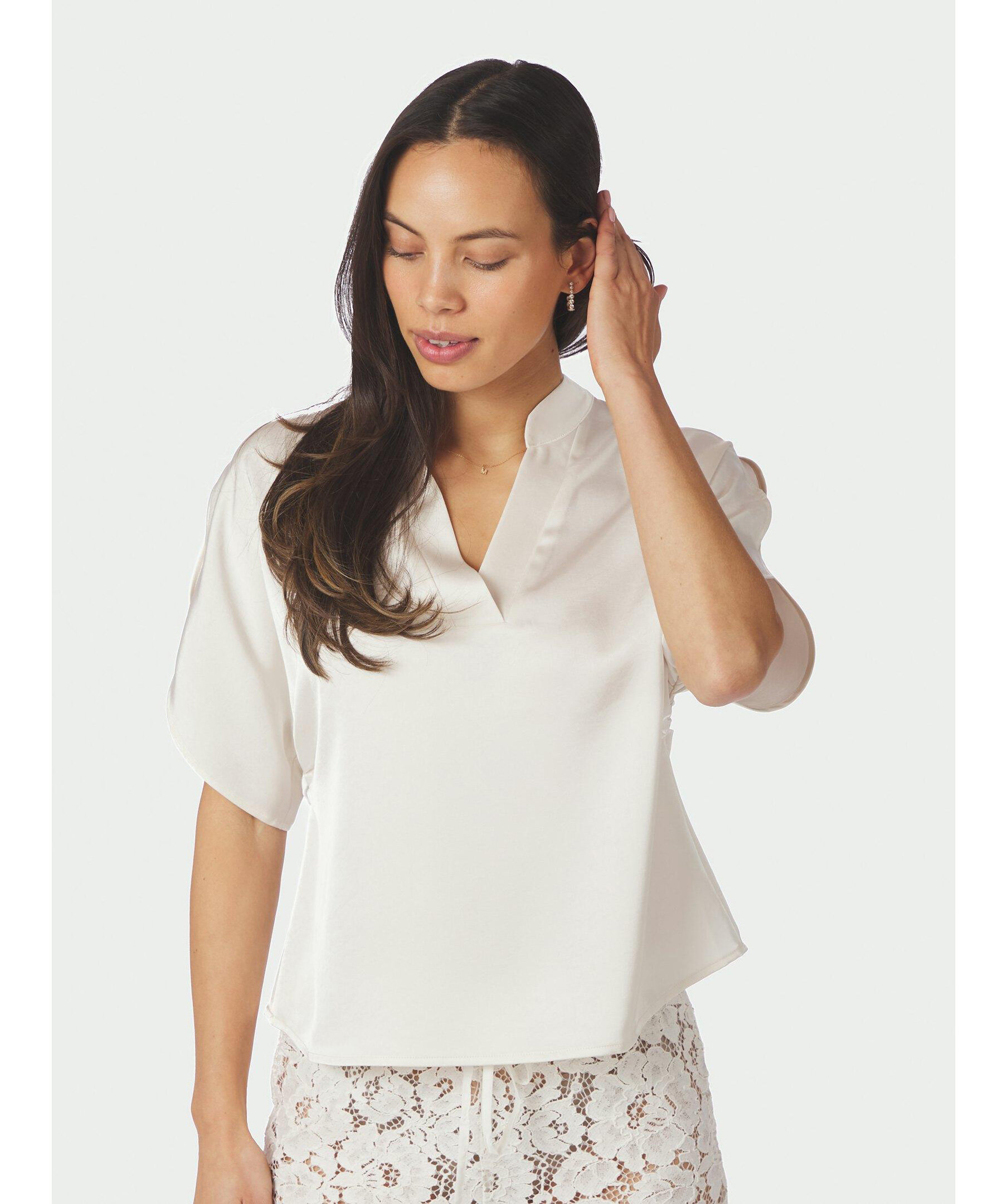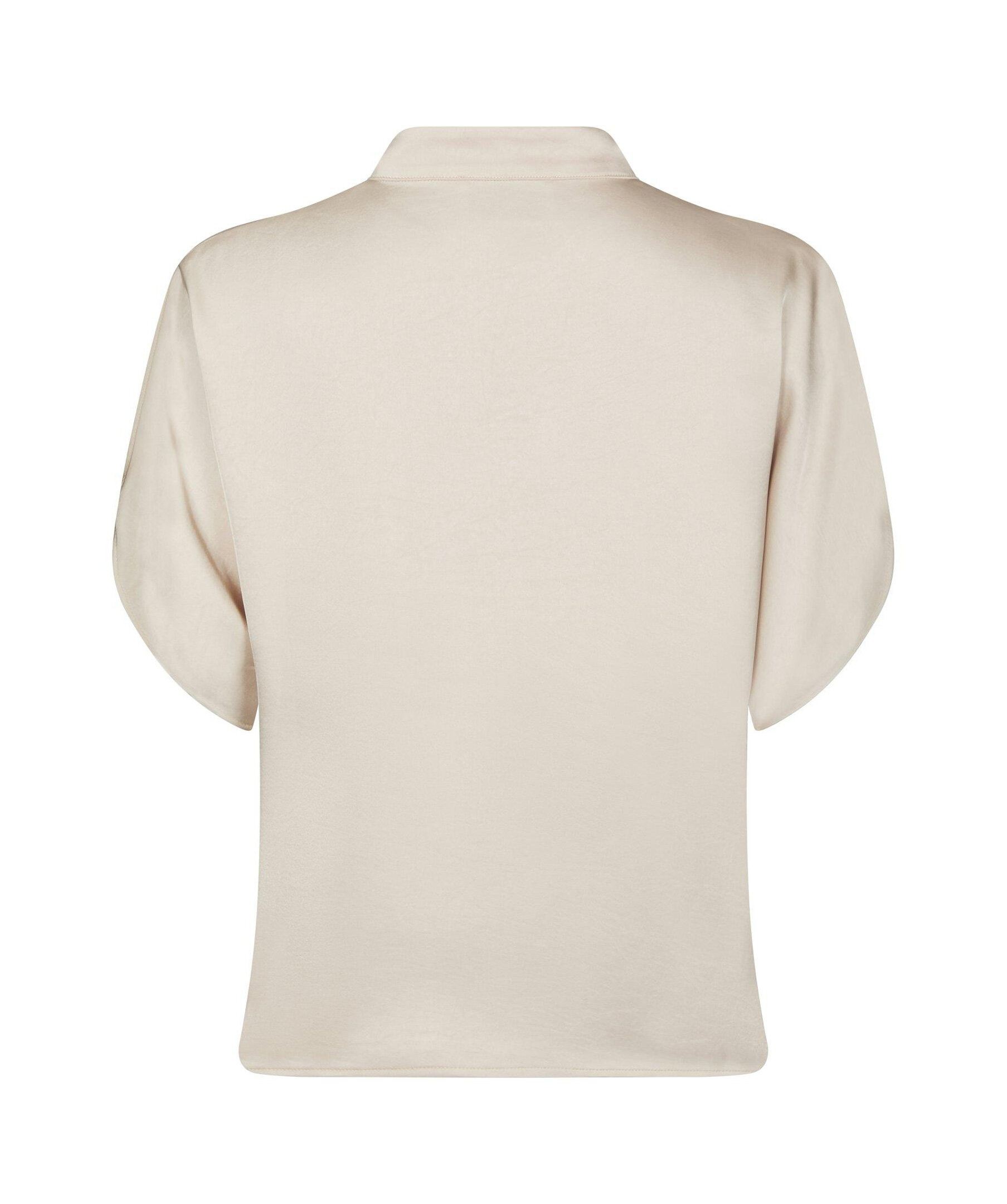 Beige batwing satingblus med v-ringning och krage. Modellen är 176 cm och bär storlek 36.