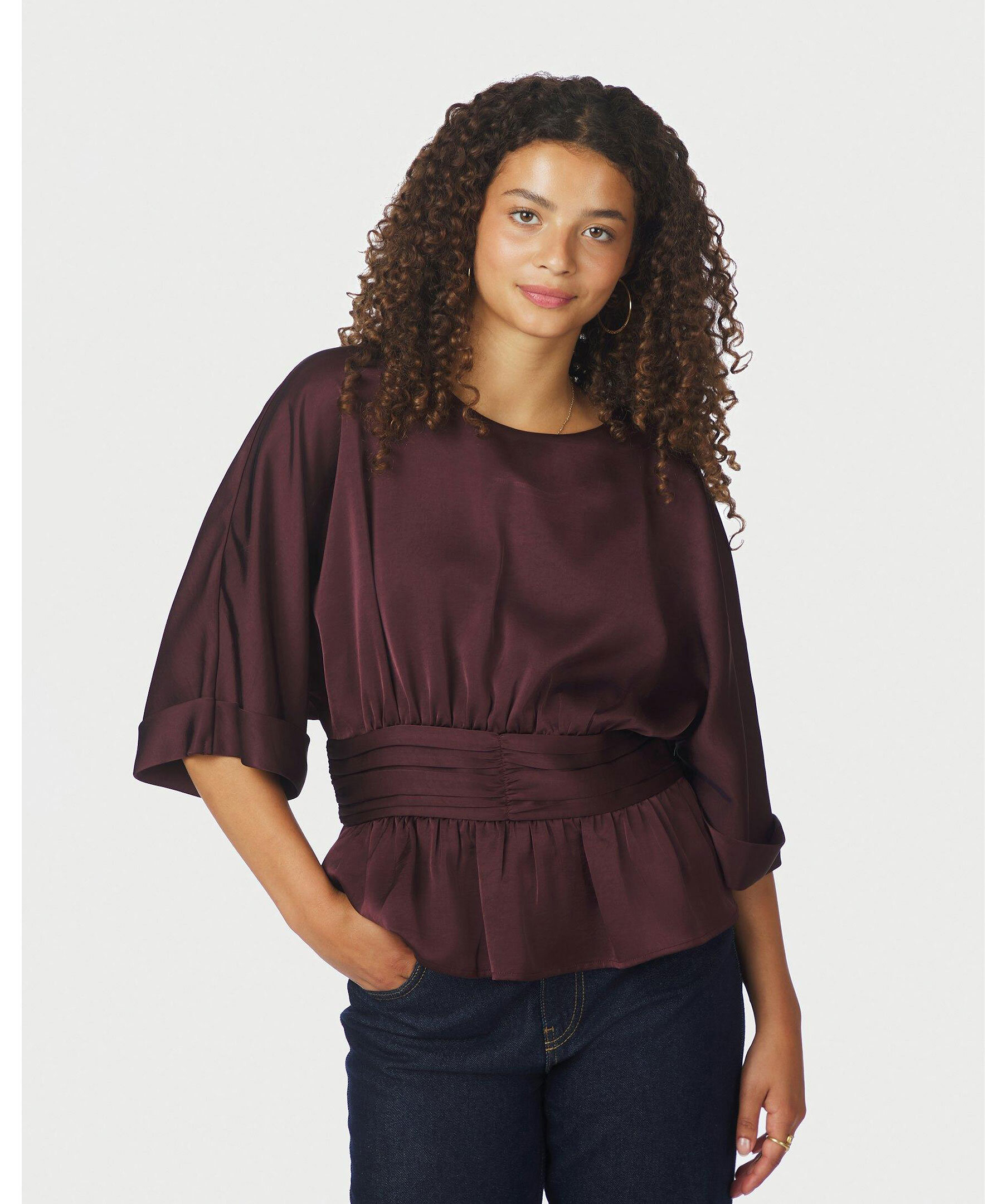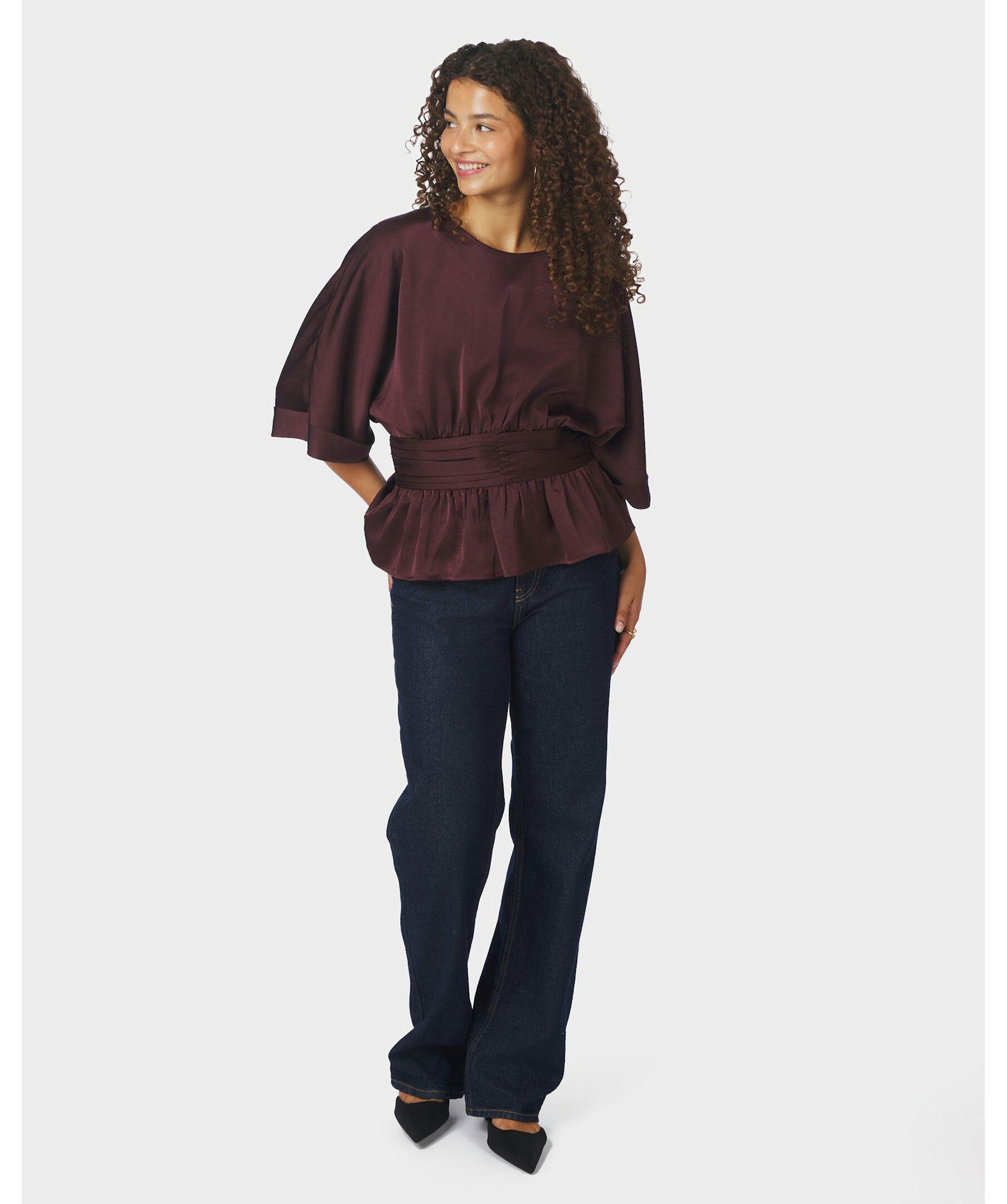 Elegant blus från Neo Noir i en kraftig satinkvalitet med rund halsringning och korta ärmar. Den figurnära modellen har rynkdetaljer i midjan som framhäver siluetten. Tillverkad av 97% polyester och 3% elastan.