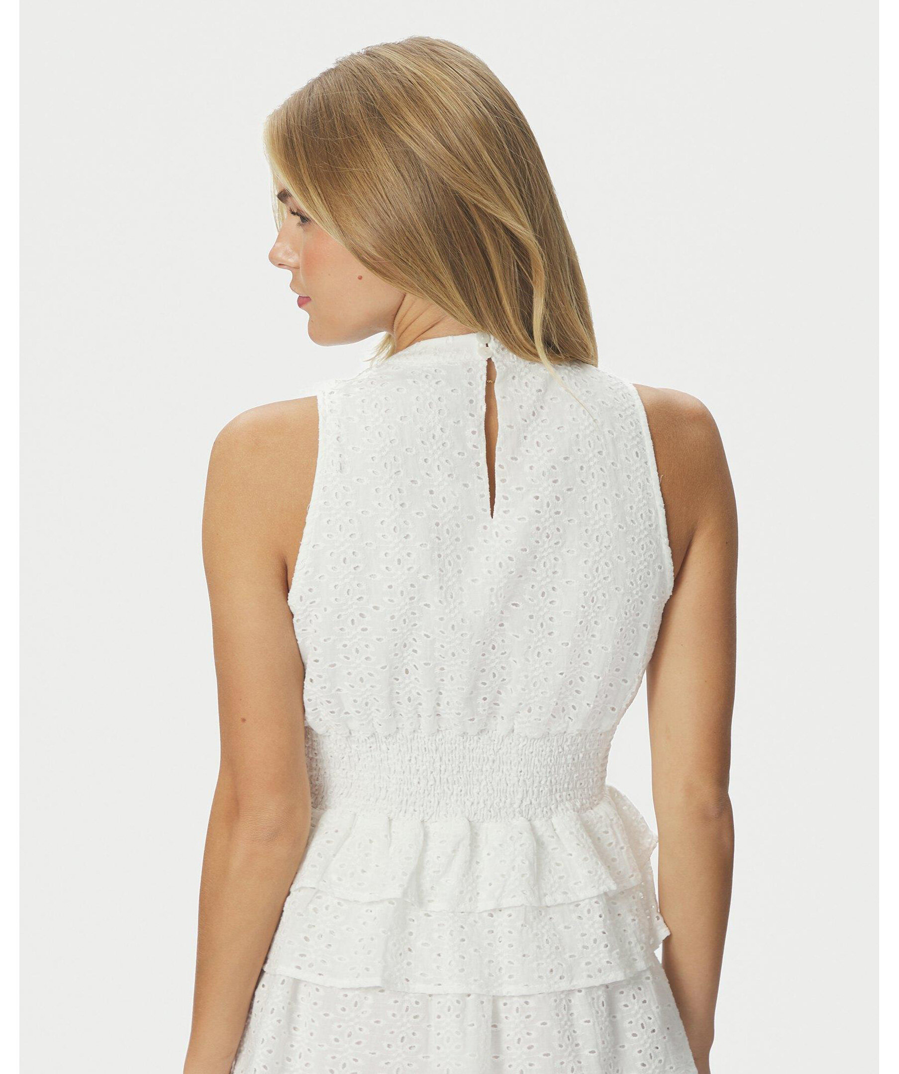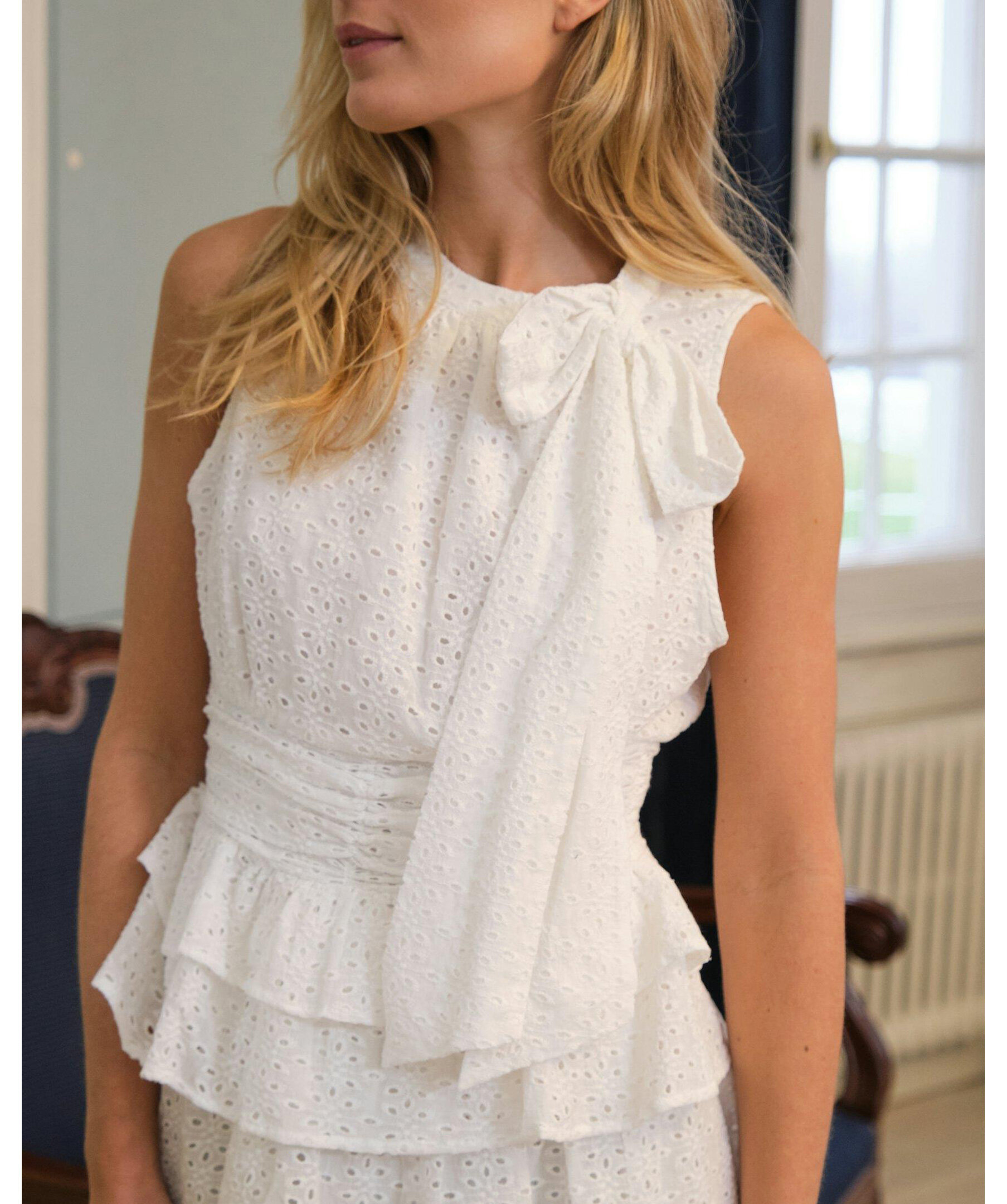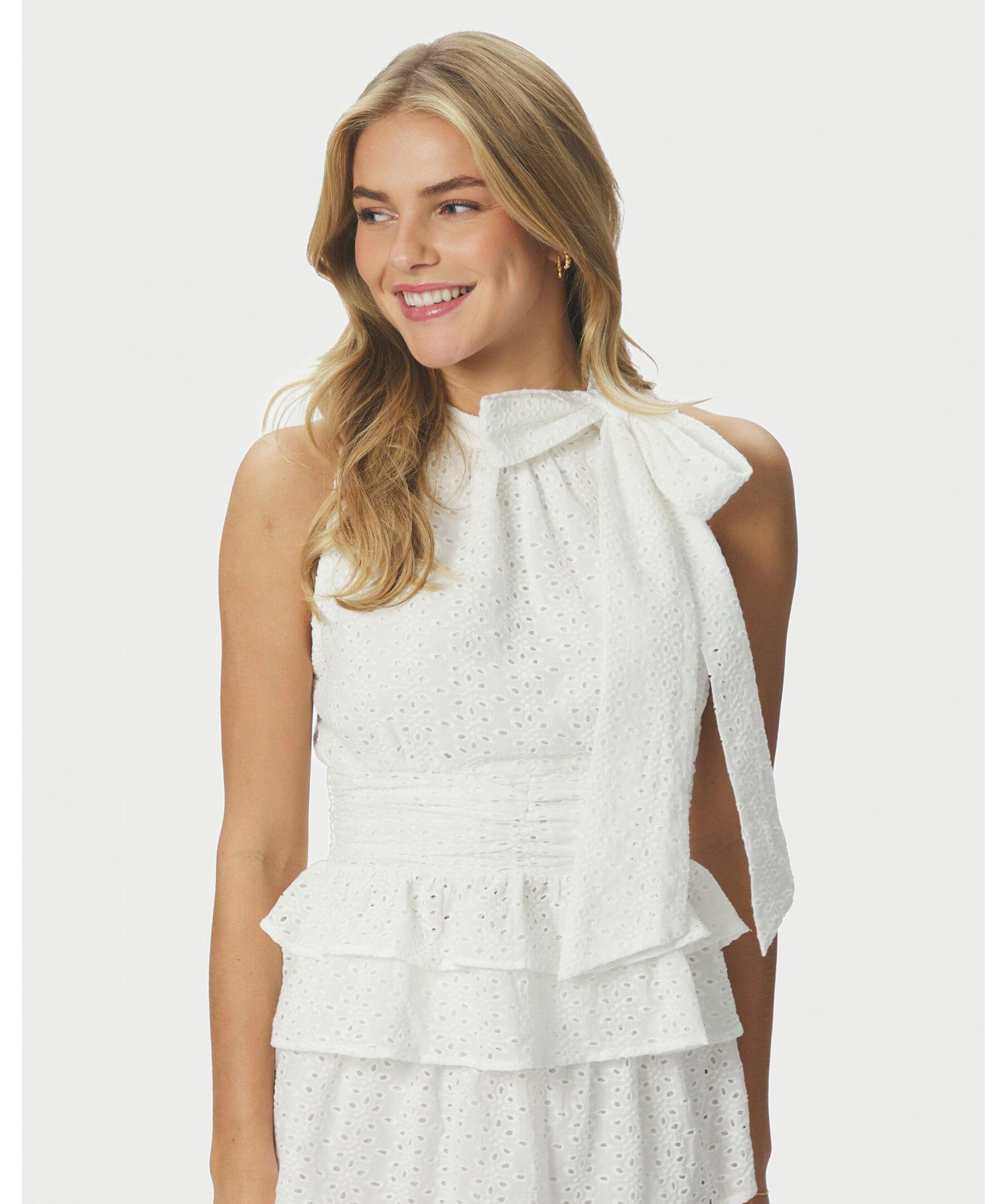 Vit topp med sydd knytning i nacken. Toppens passform är åtsittande vid midjan och har en volang i botten. Modellen är 176 cm lång och bär storlek 36.