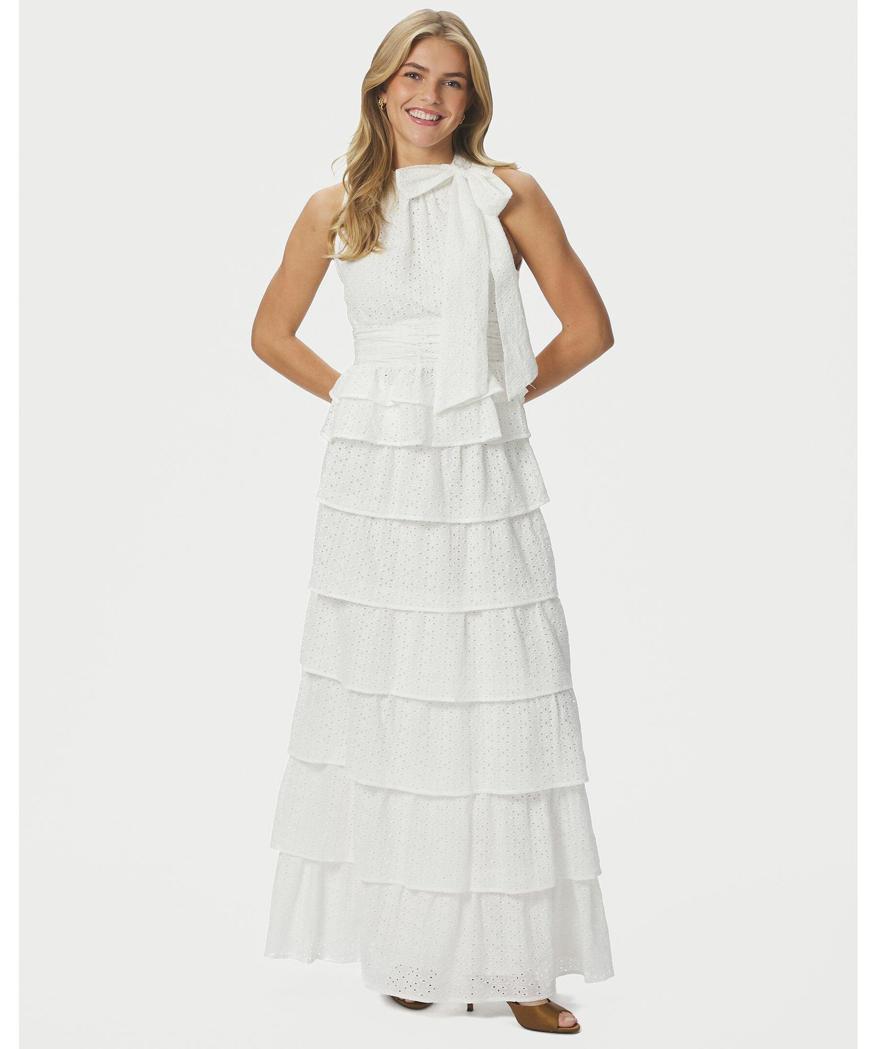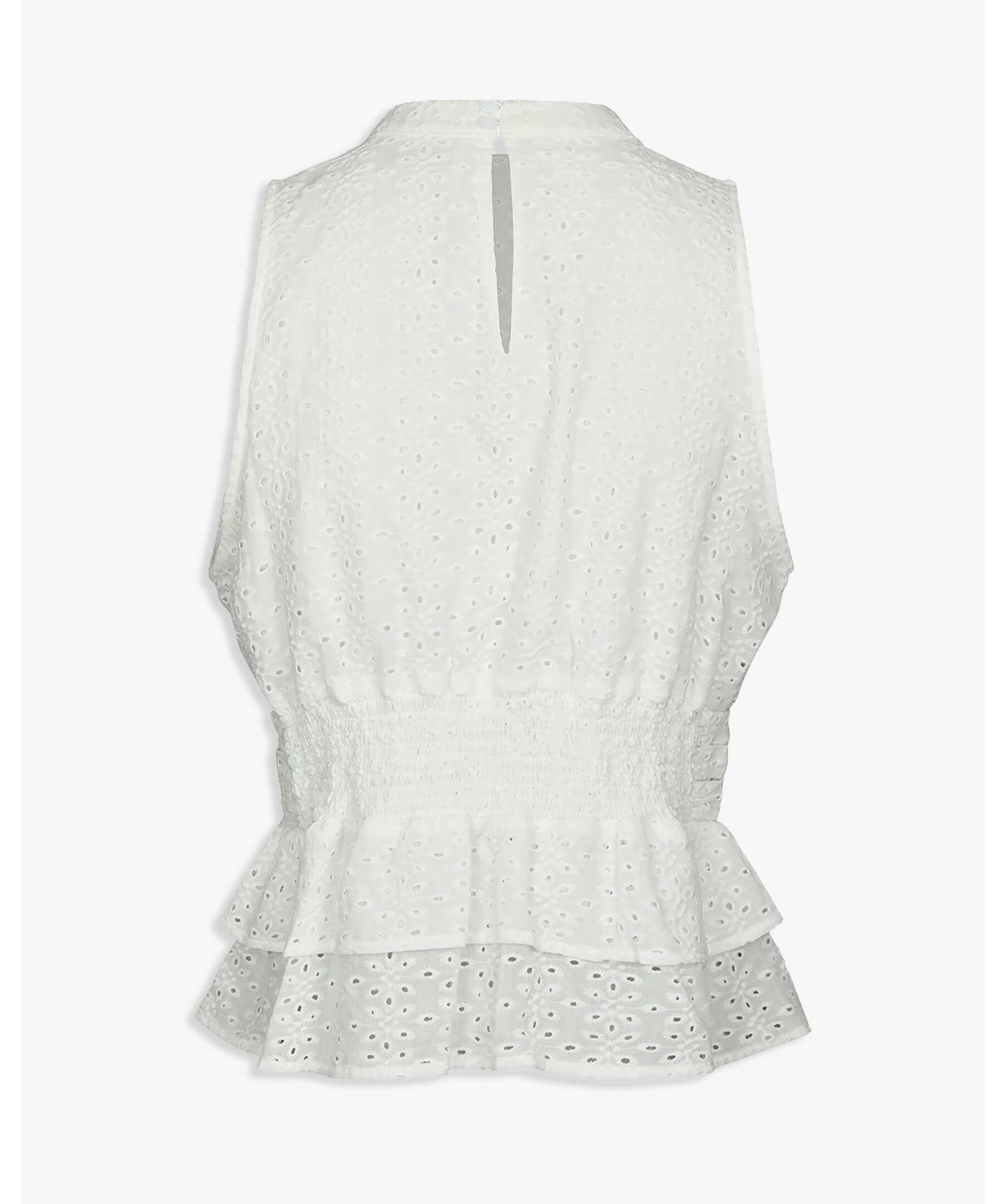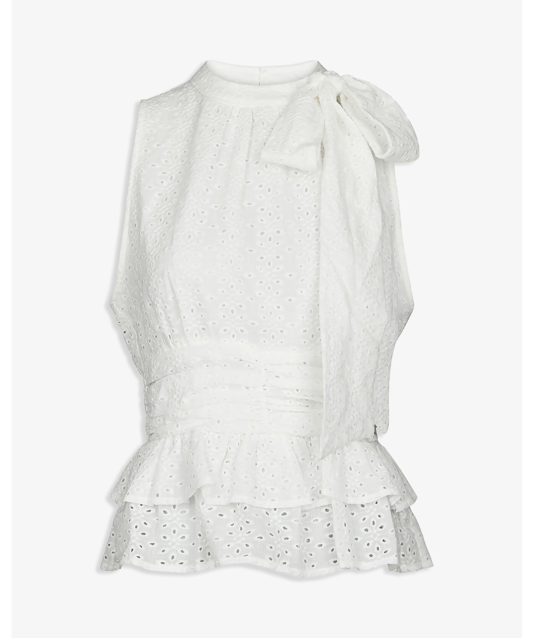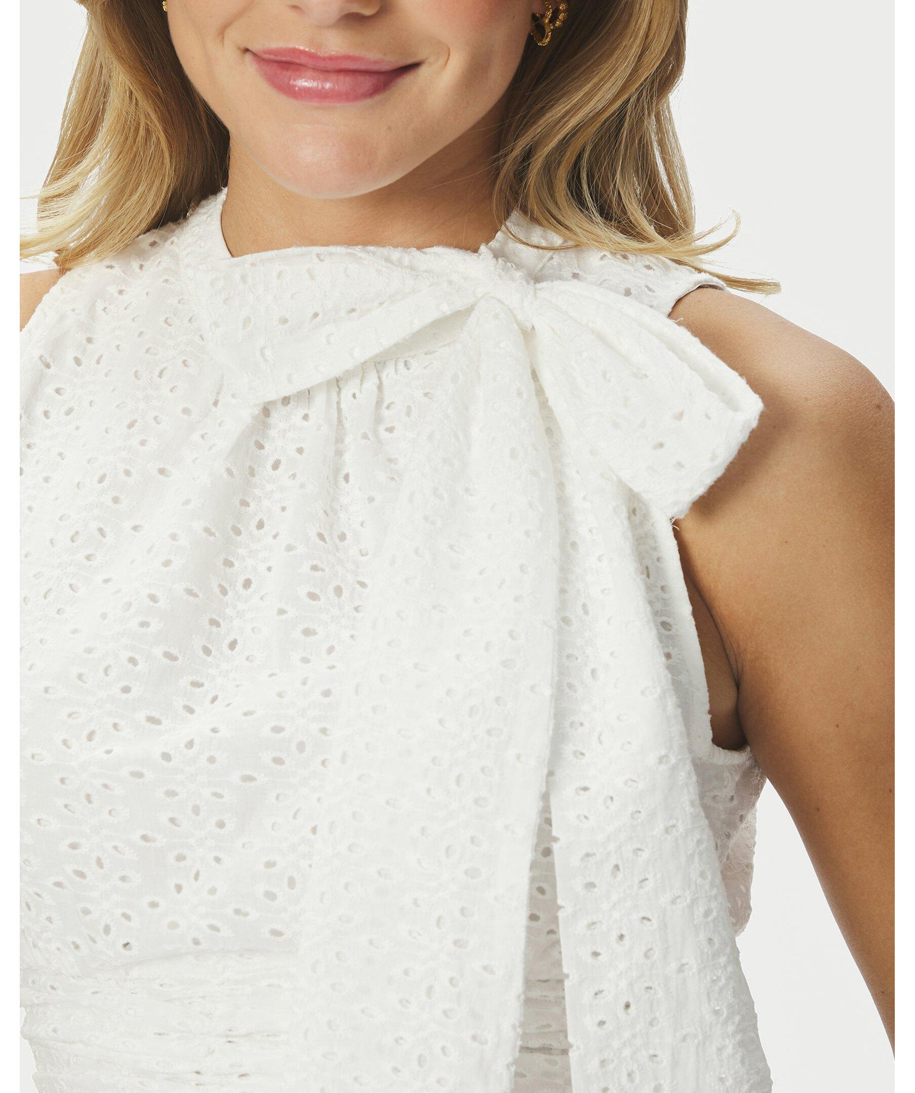 Vit topp med sydd knytning i nacken. Toppens passform är åtsittande vid midjan och har en volang i botten. Modellen är 176 cm lång och bär storlek 36.