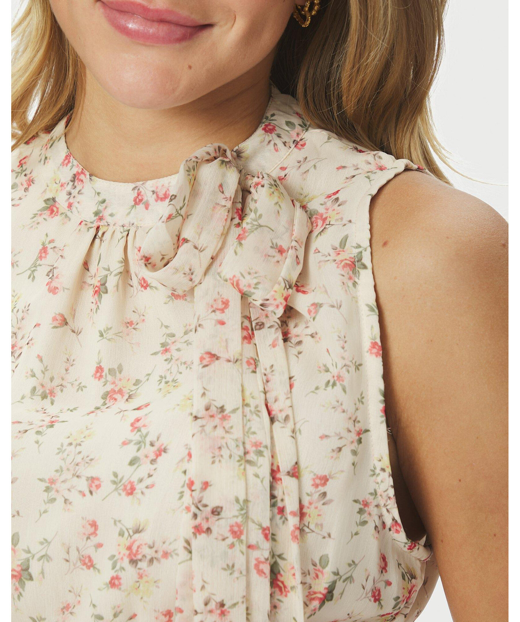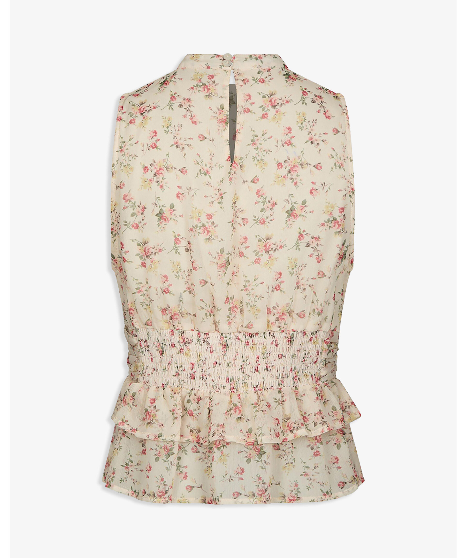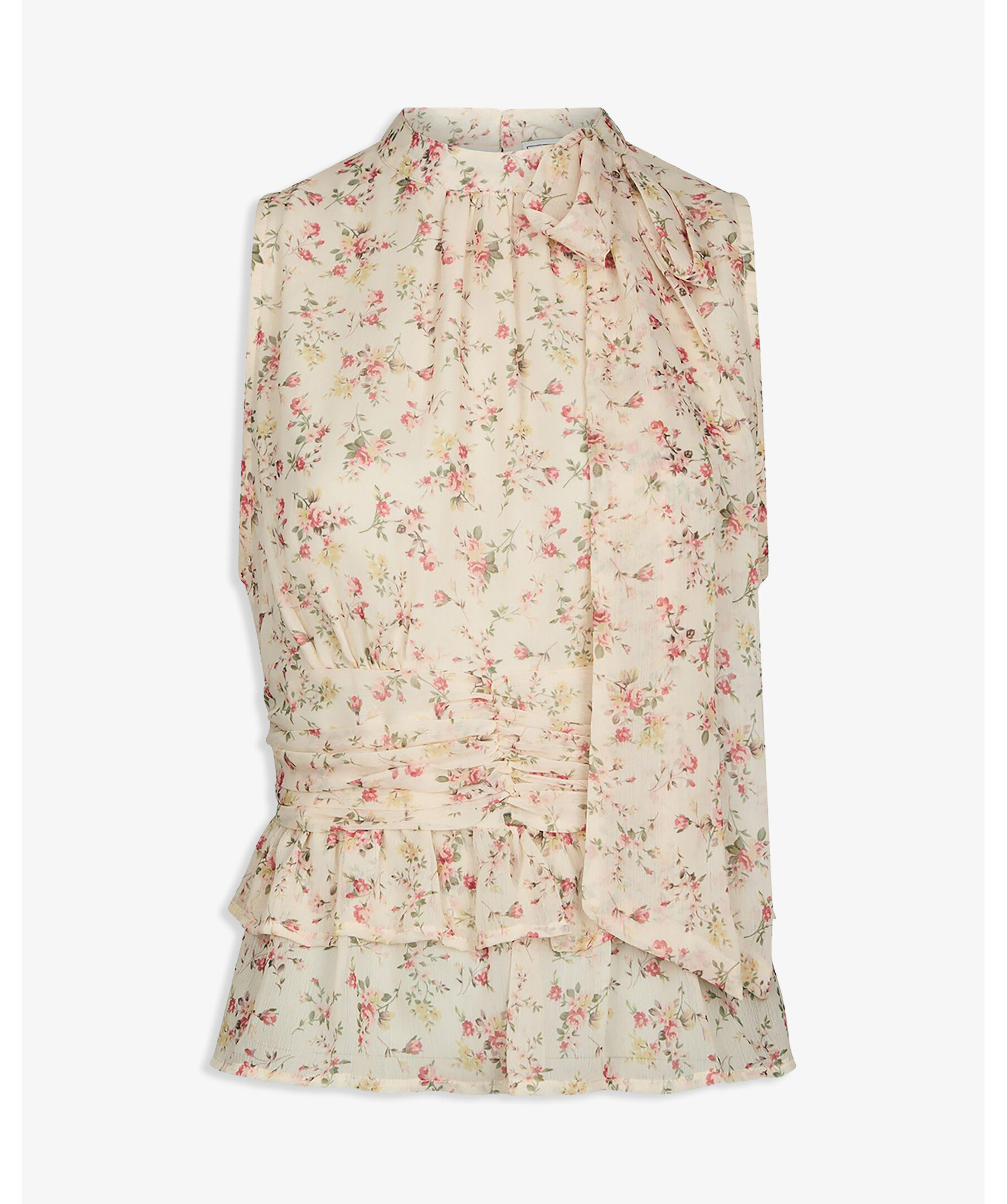 Topp med sydd knytning vid halsen, som kommer i ett fint blommönster. Toppens passform är tajt vid midjan och har små volanger i nederkant. Modellen är 176 cm lång och bär storlek 36.