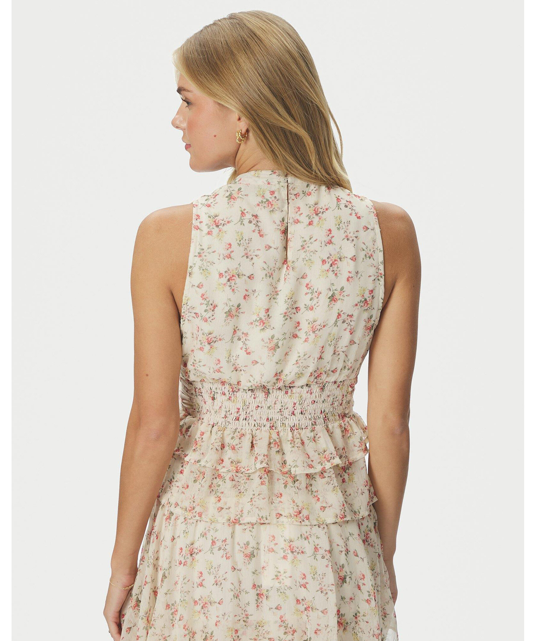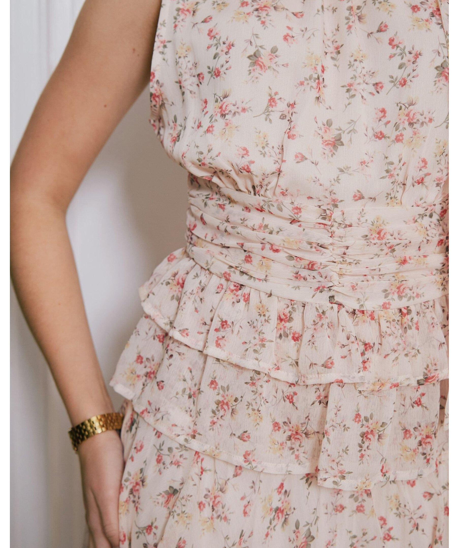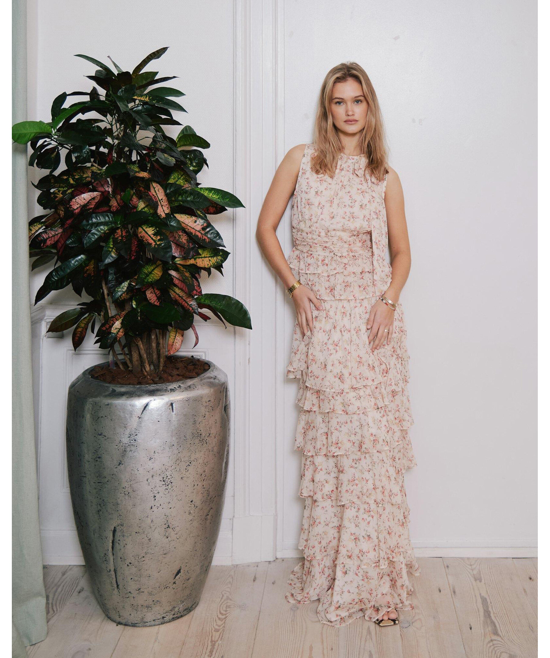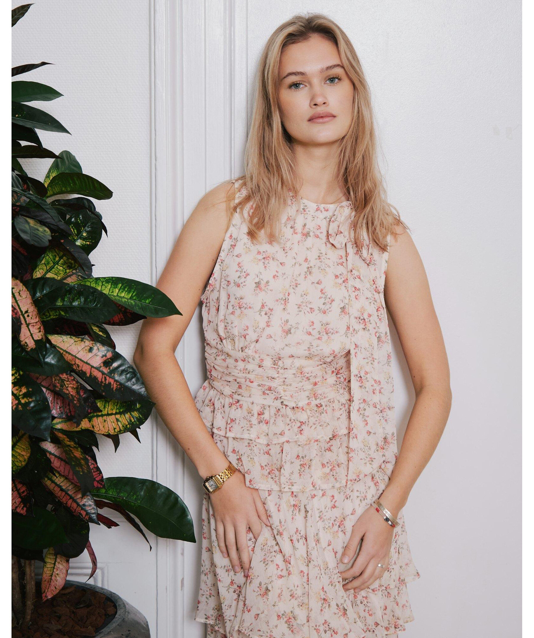 Topp med sydd knytning vid halsen, som kommer i ett fint blommönster. Toppens passform är tajt vid midjan och har små volanger i nederkant. Modellen är 176 cm lång och bär storlek 36.