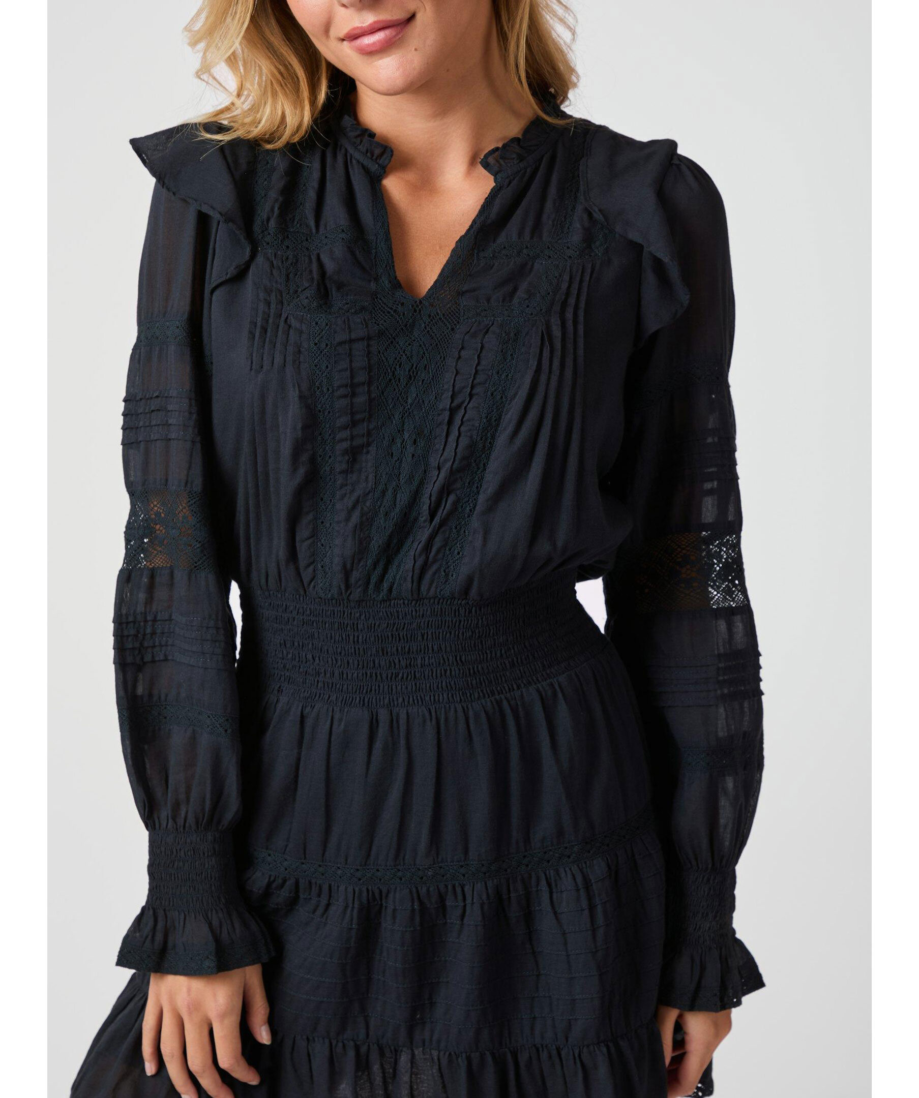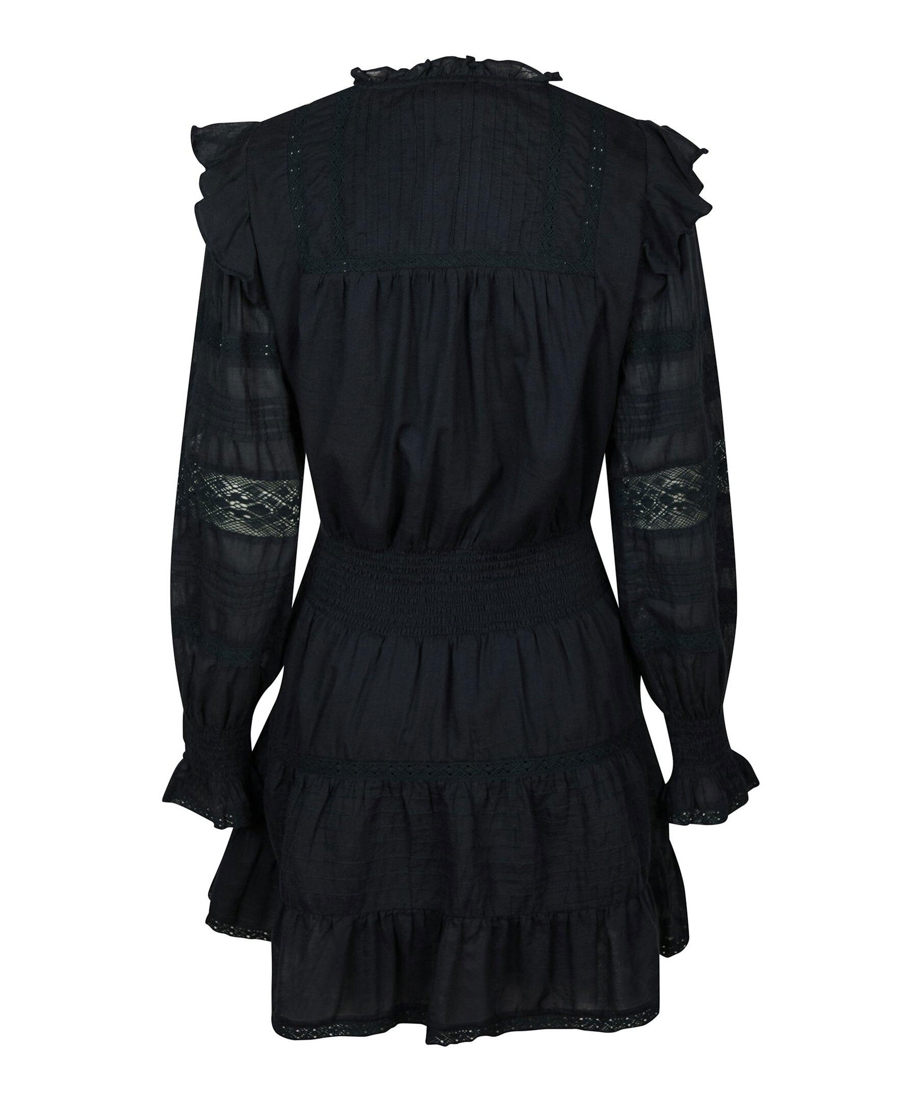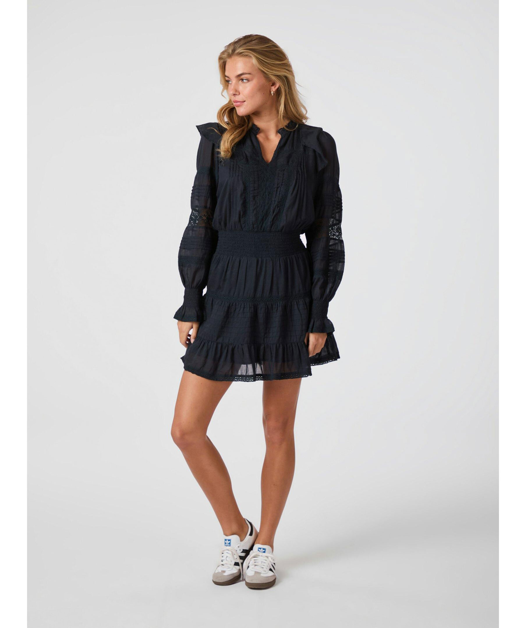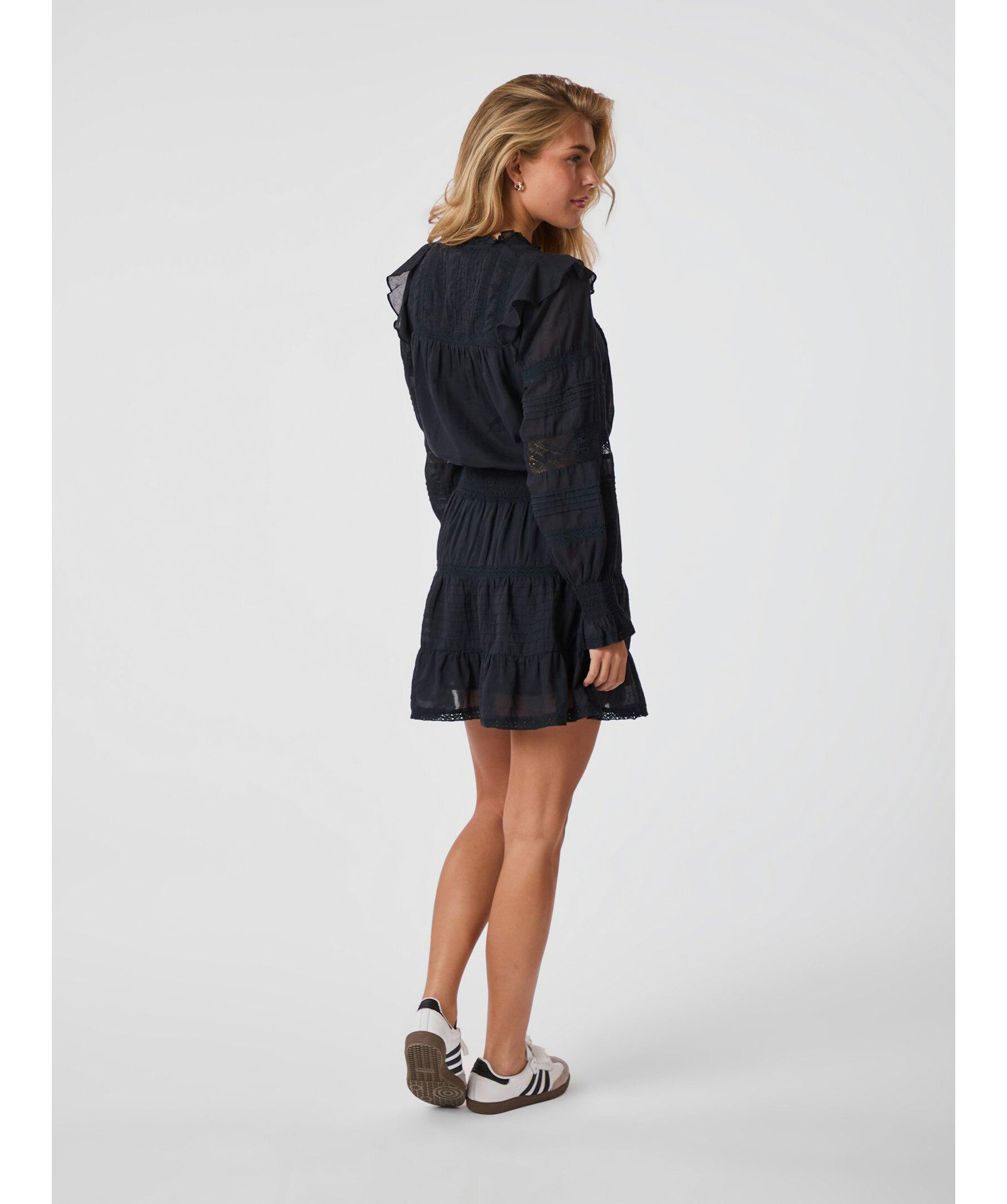 Marinblå klänning med långa ärmar från Neo Noir. Klänningen har smock i midjan samt vid ärmslut, v-ringad halsringning och volangdetaljer. Tillverkad i bomull.
