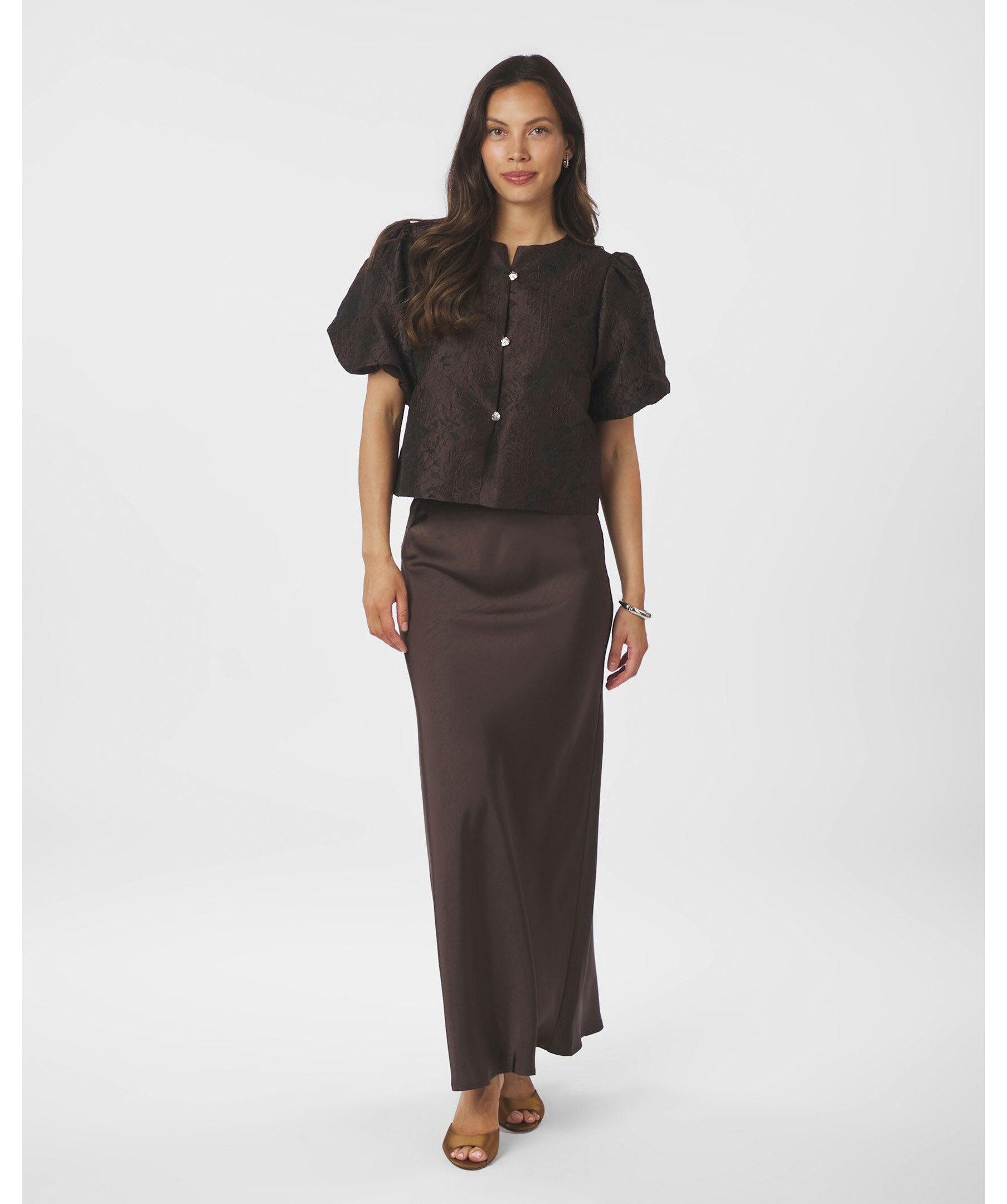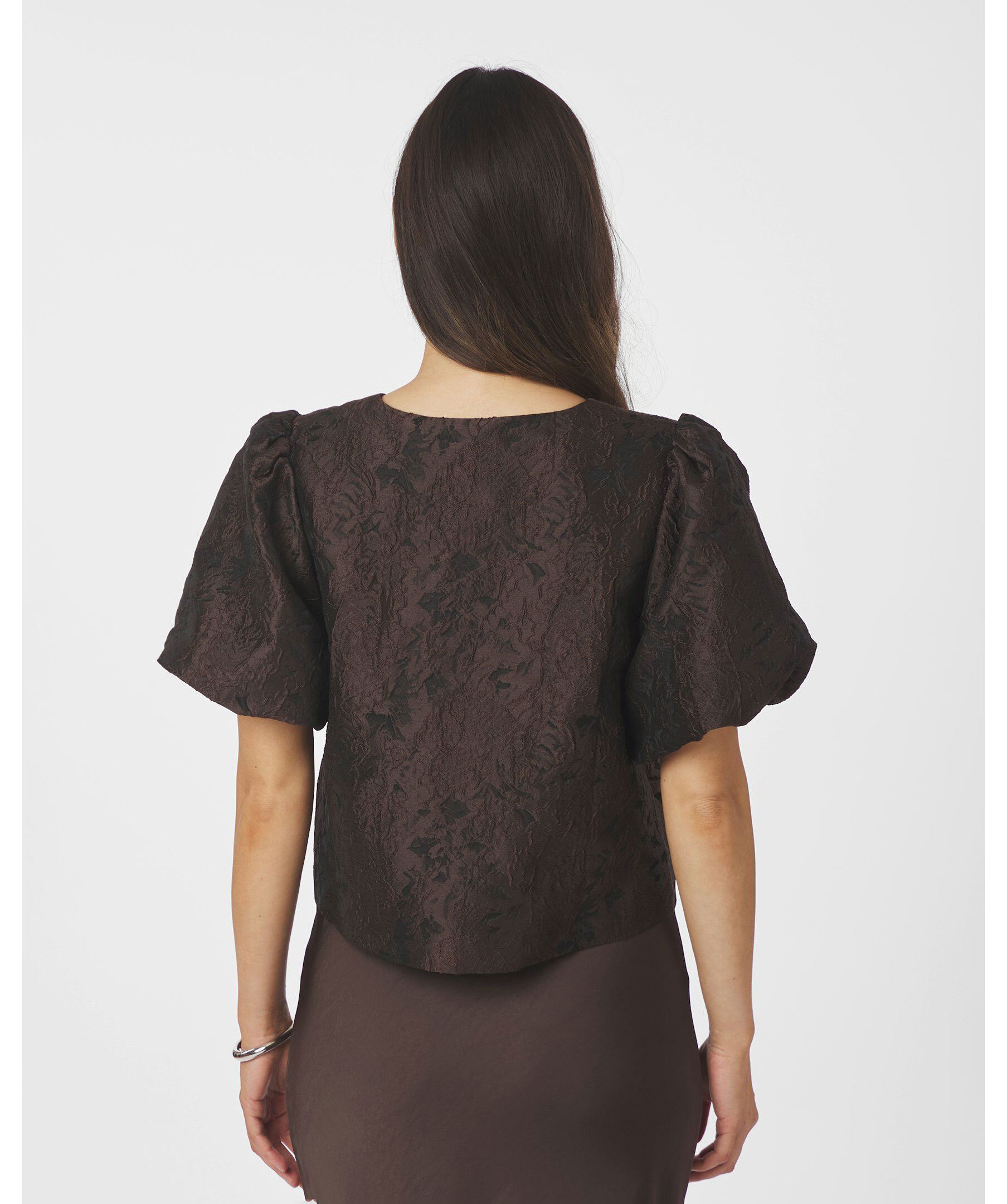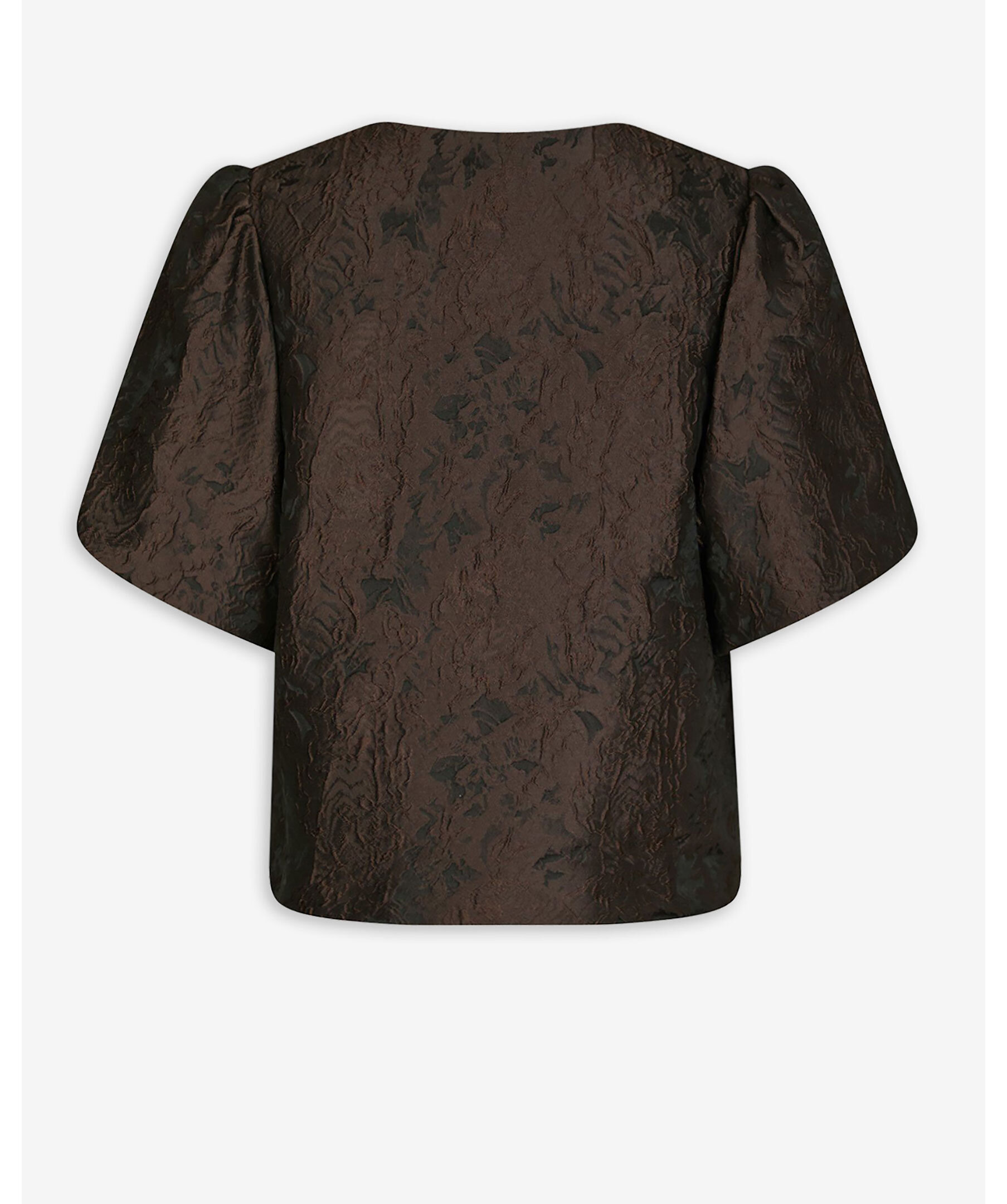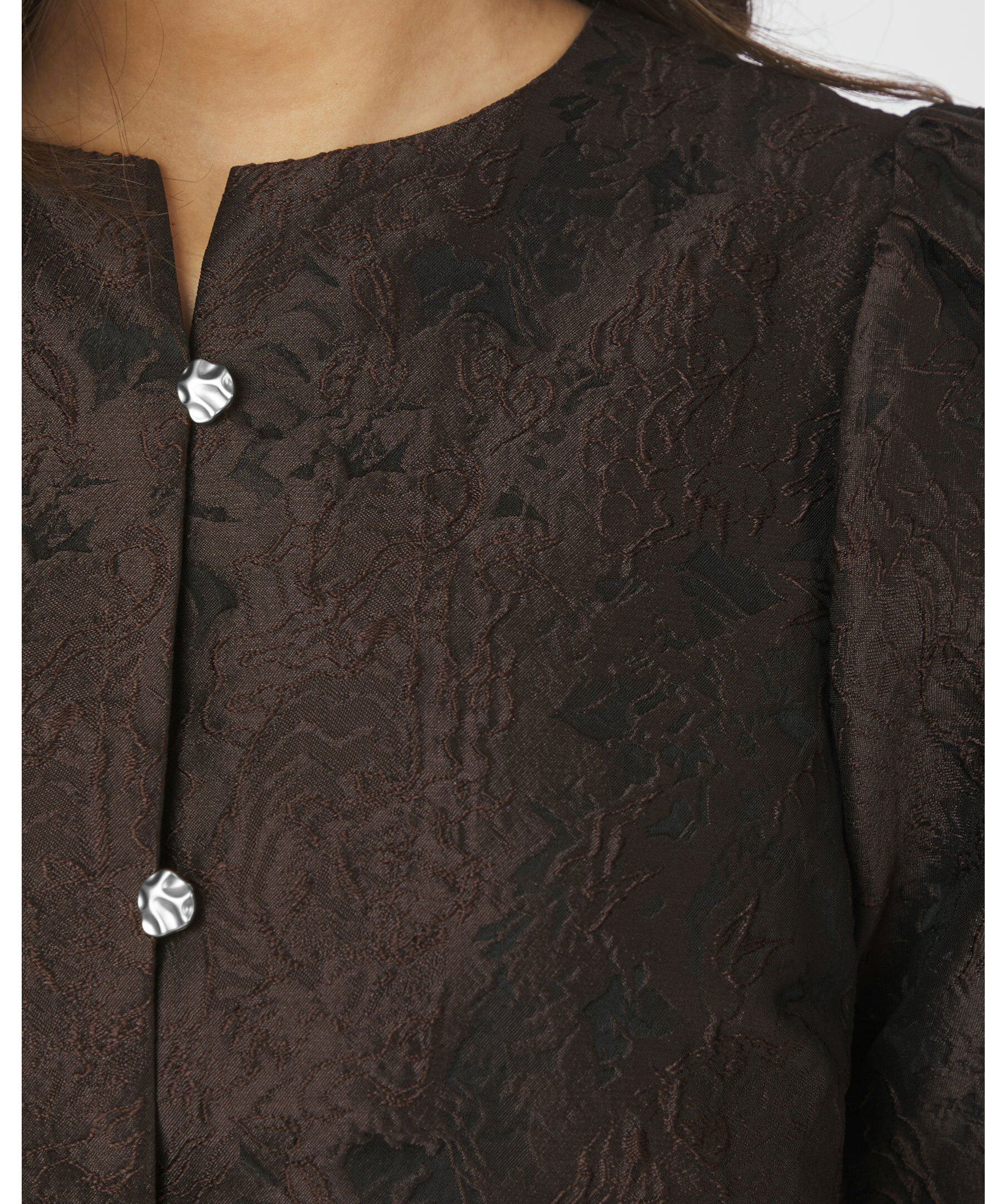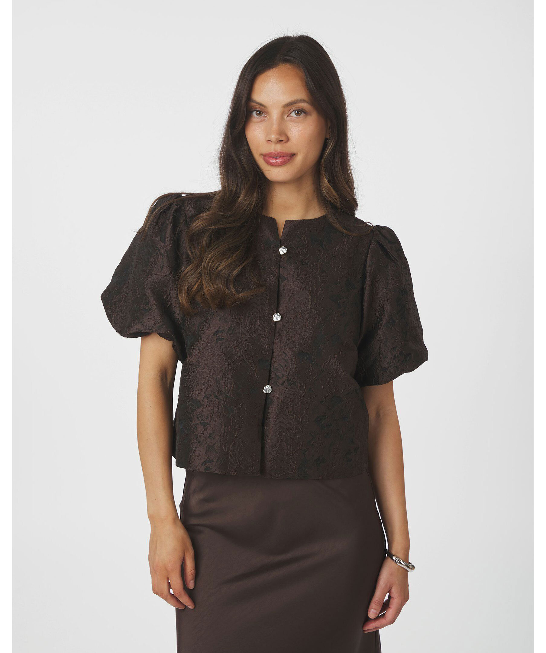 Brun blus från Neo Noir i brokadtyg. Blusen har puffärmar och knappstängning framtill.