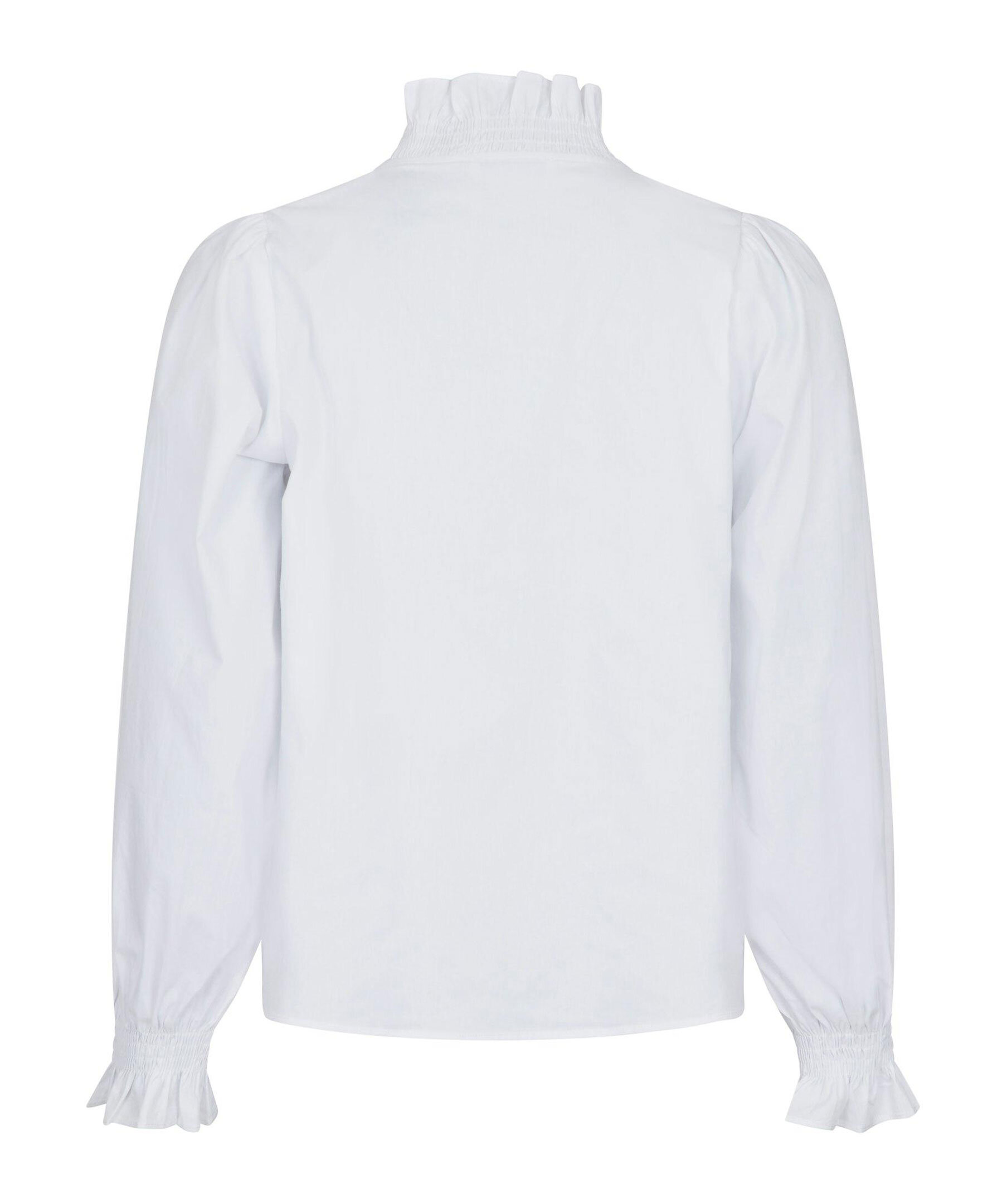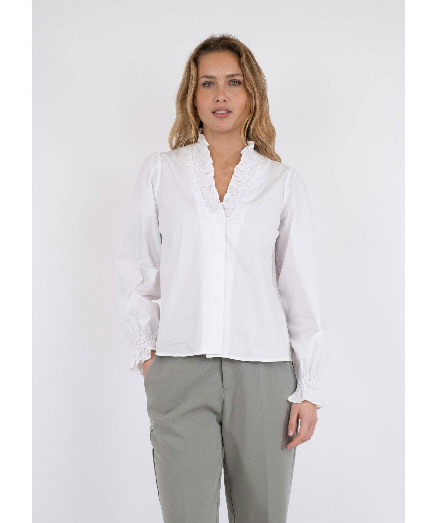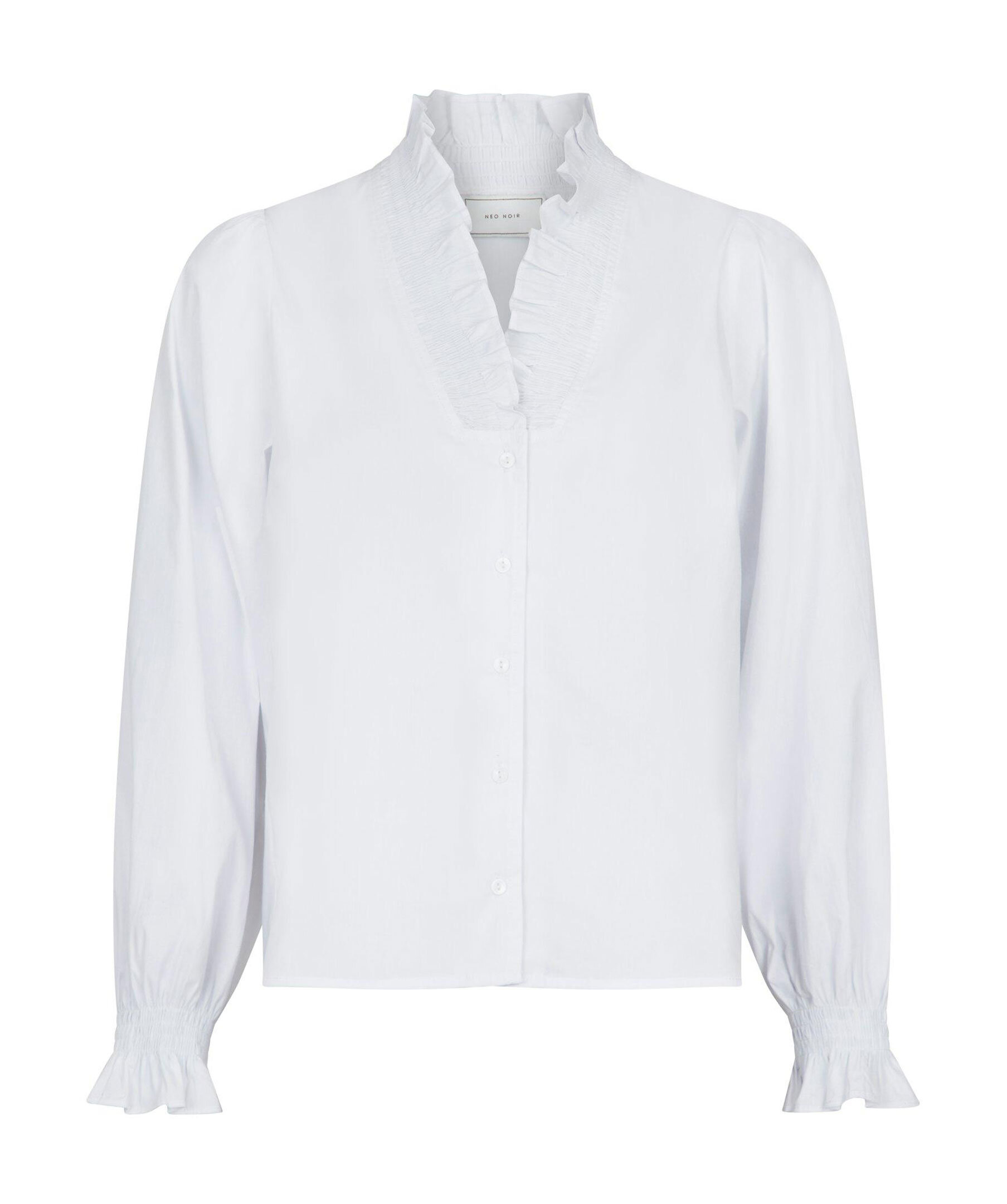 Vit blus från Neo Noir. Blusen har knappar framtill och smockdetaljer vid kragen samt ärmslut. Tillverkad i en bomullsblandning.