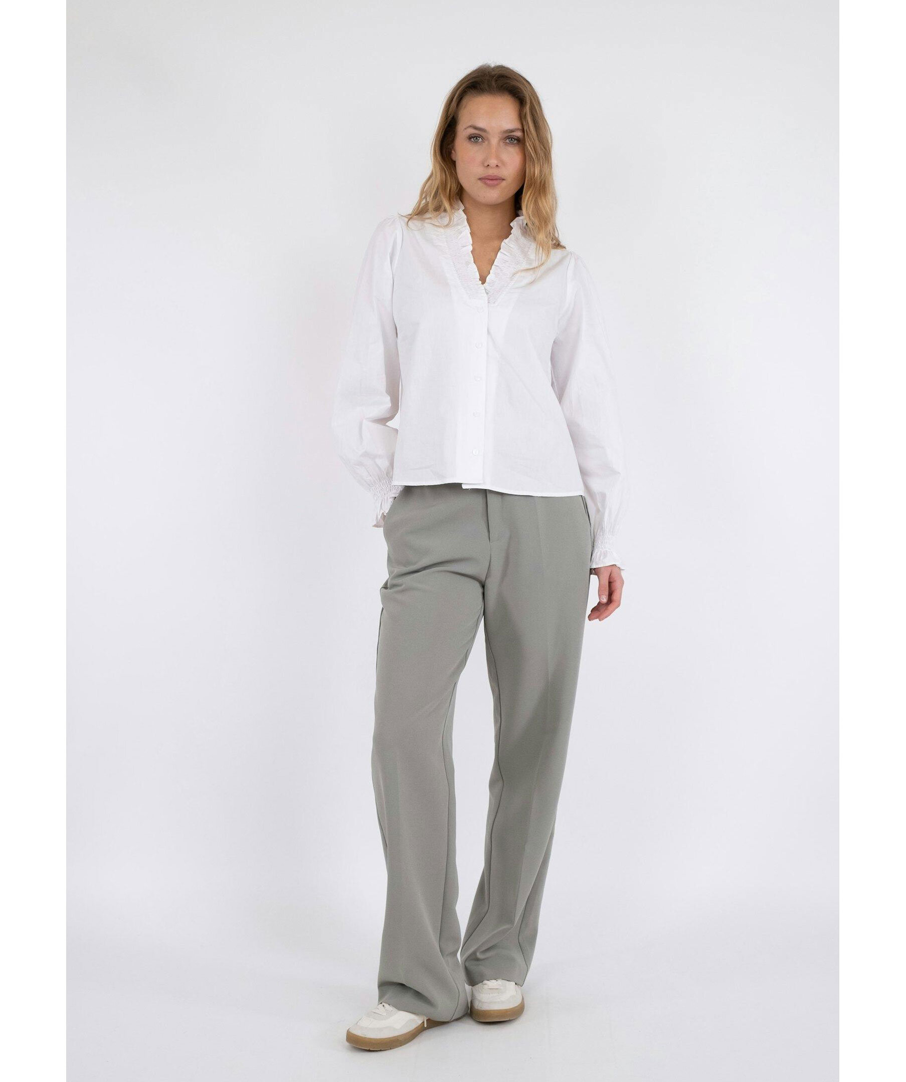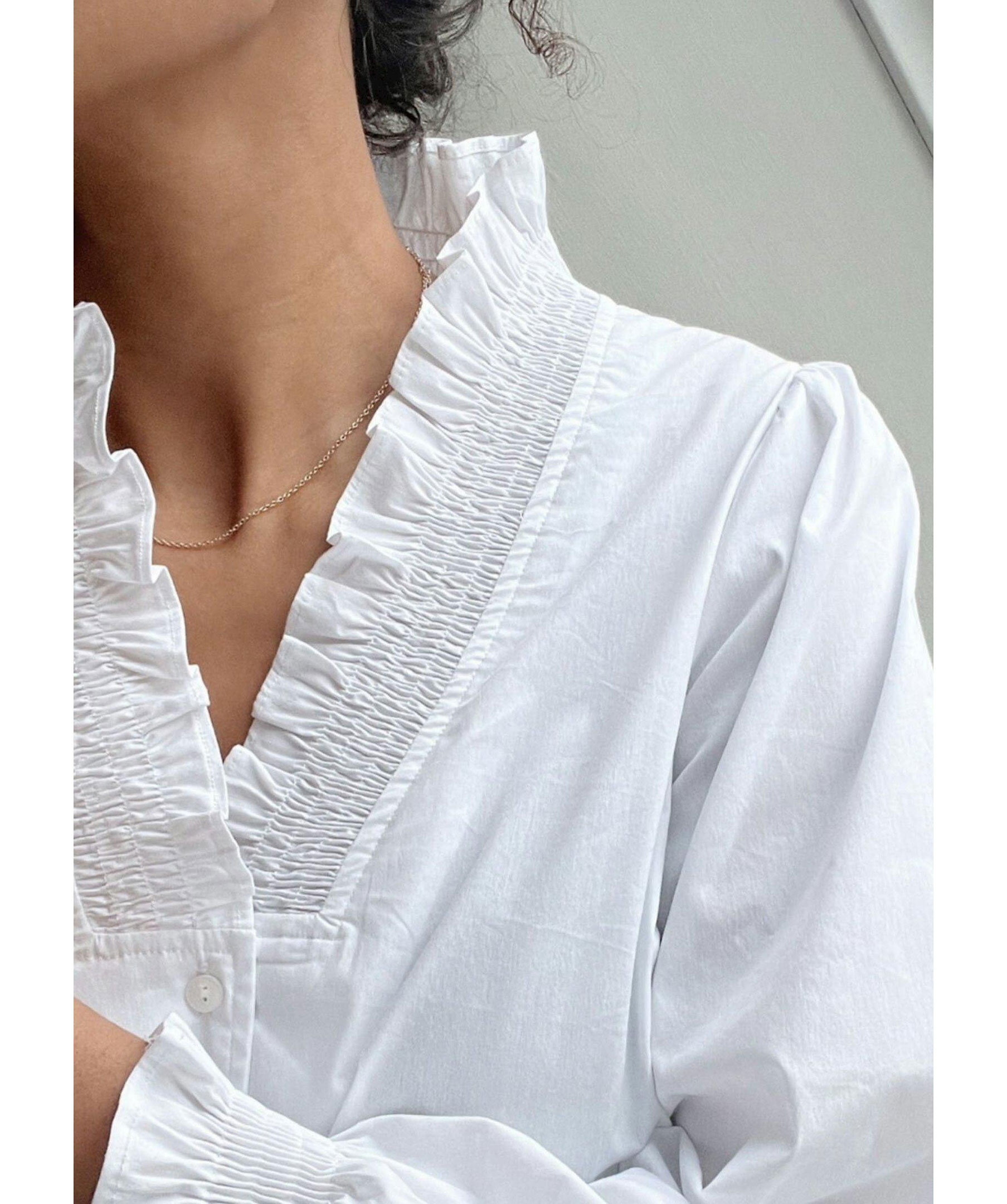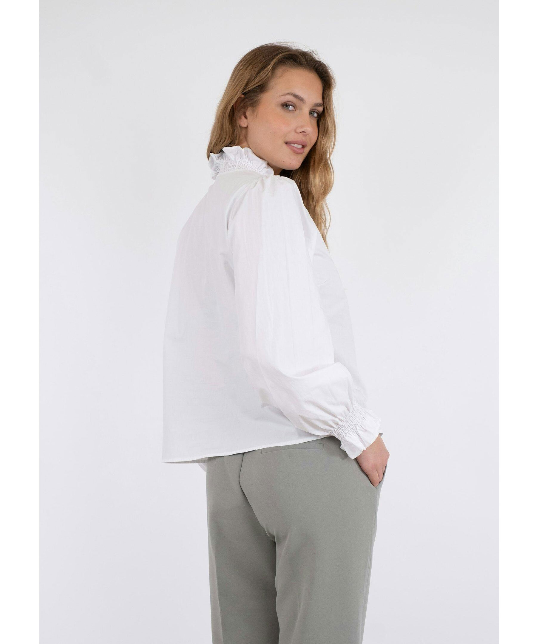 Vit blus från Neo Noir. Blusen har knappar framtill och smockdetaljer vid kragen samt ärmslut. Tillverkad i en bomullsblandning.