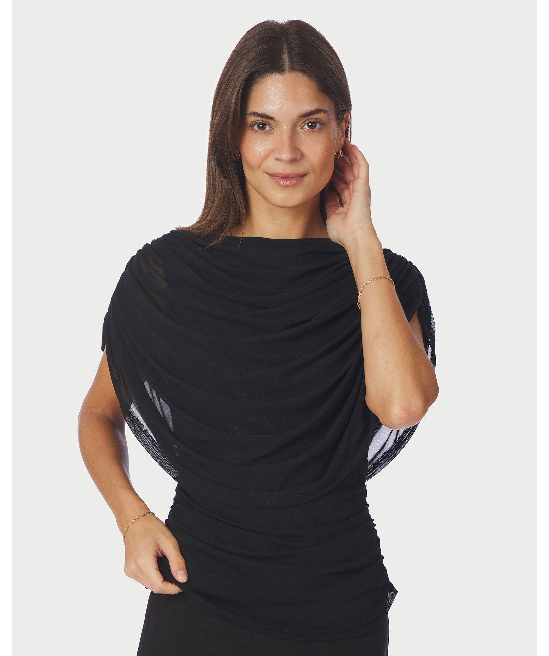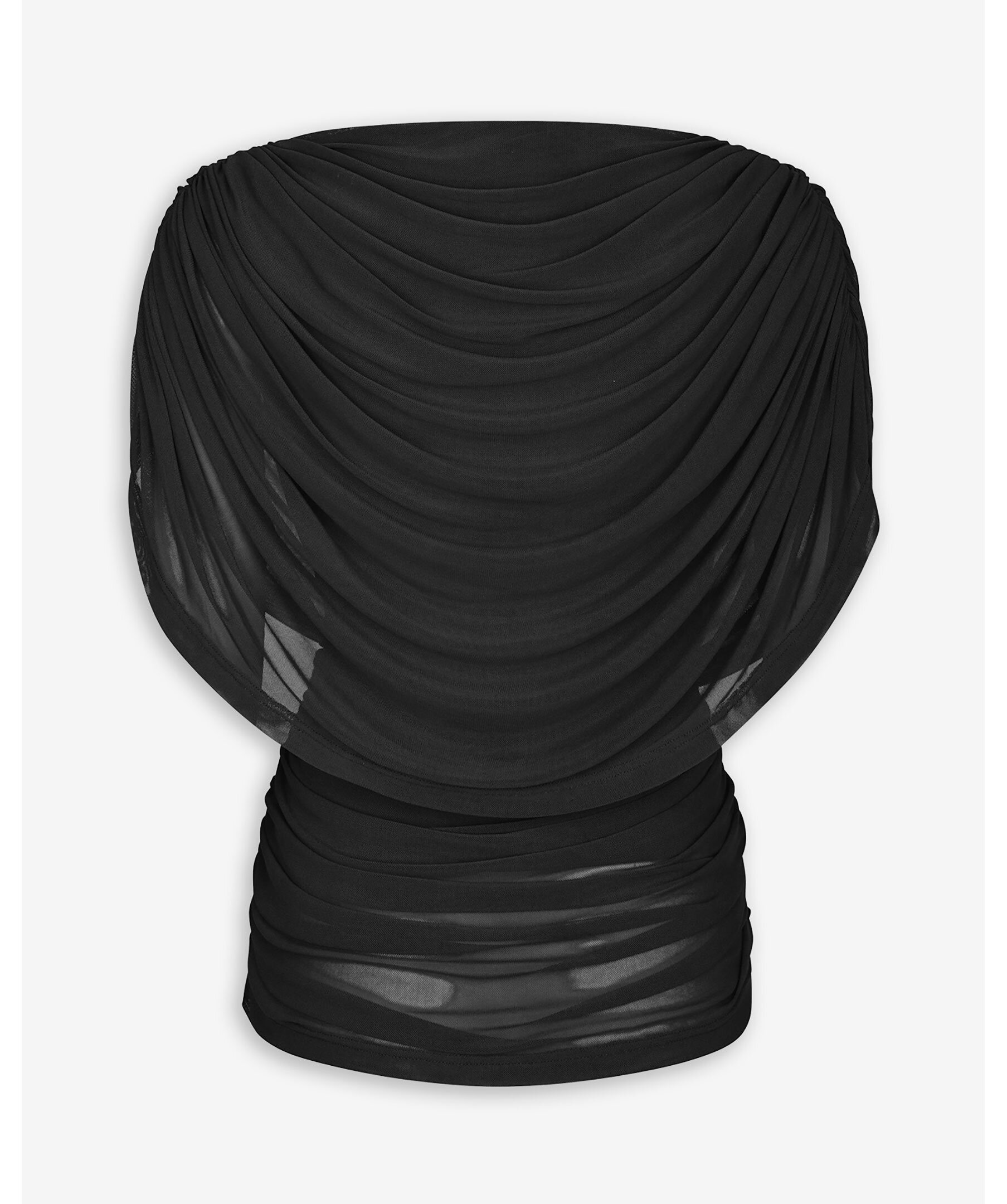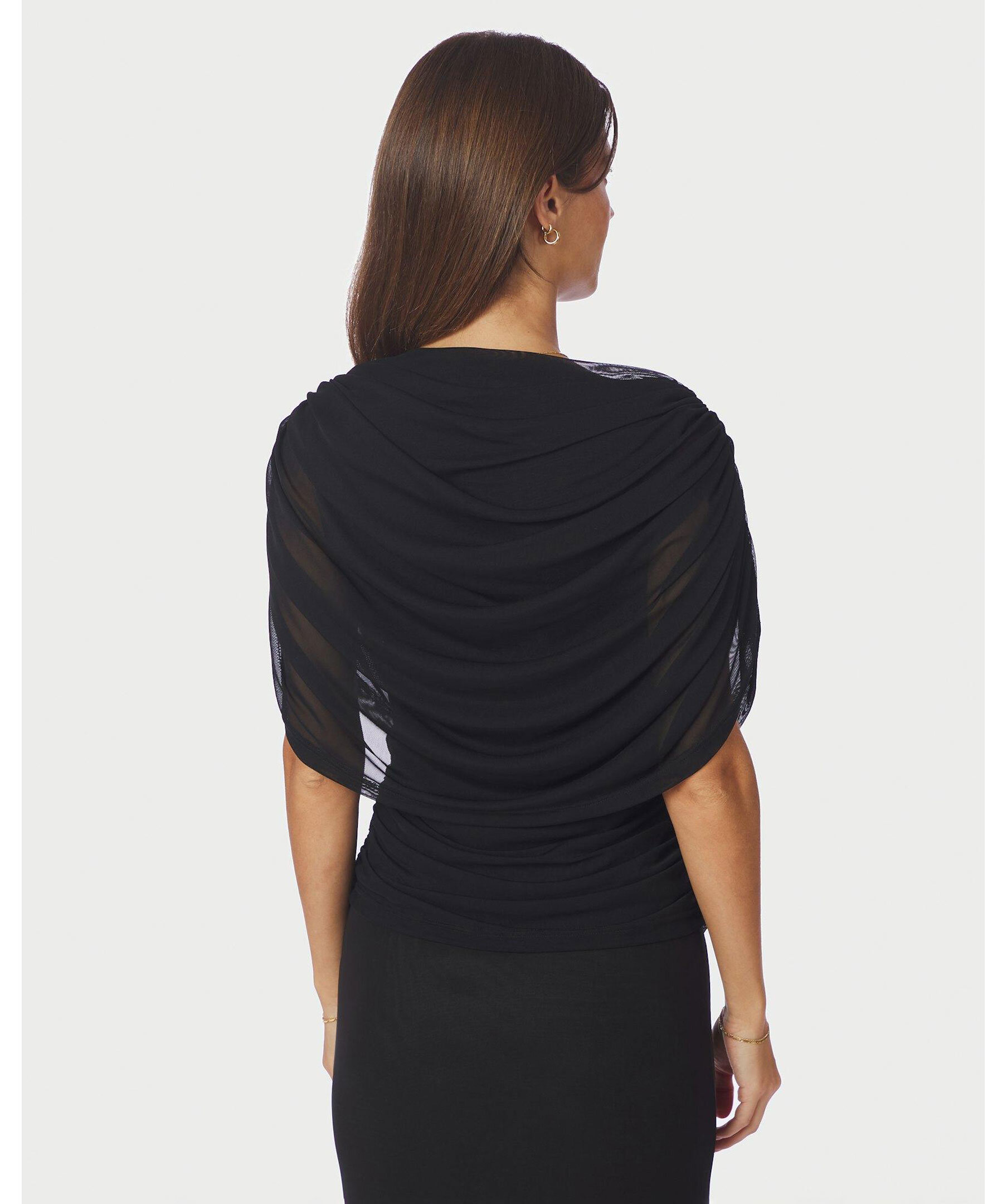Svart mesh-topp med båtringning och drapering Toppen har korta ärmar, rynkade sidor och en tajt passform, med yttertyg i 100% nylon och foder i 100% polyester.