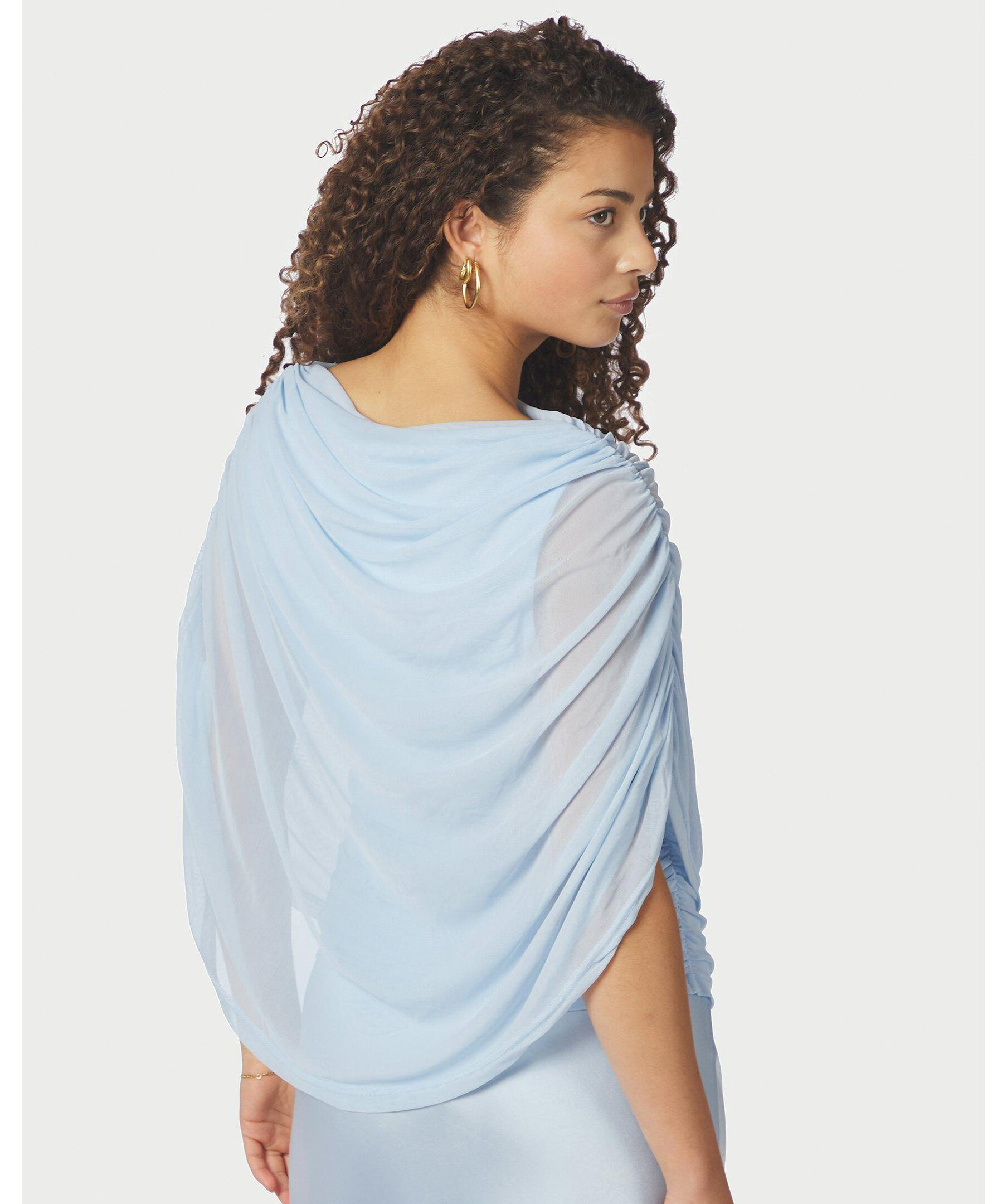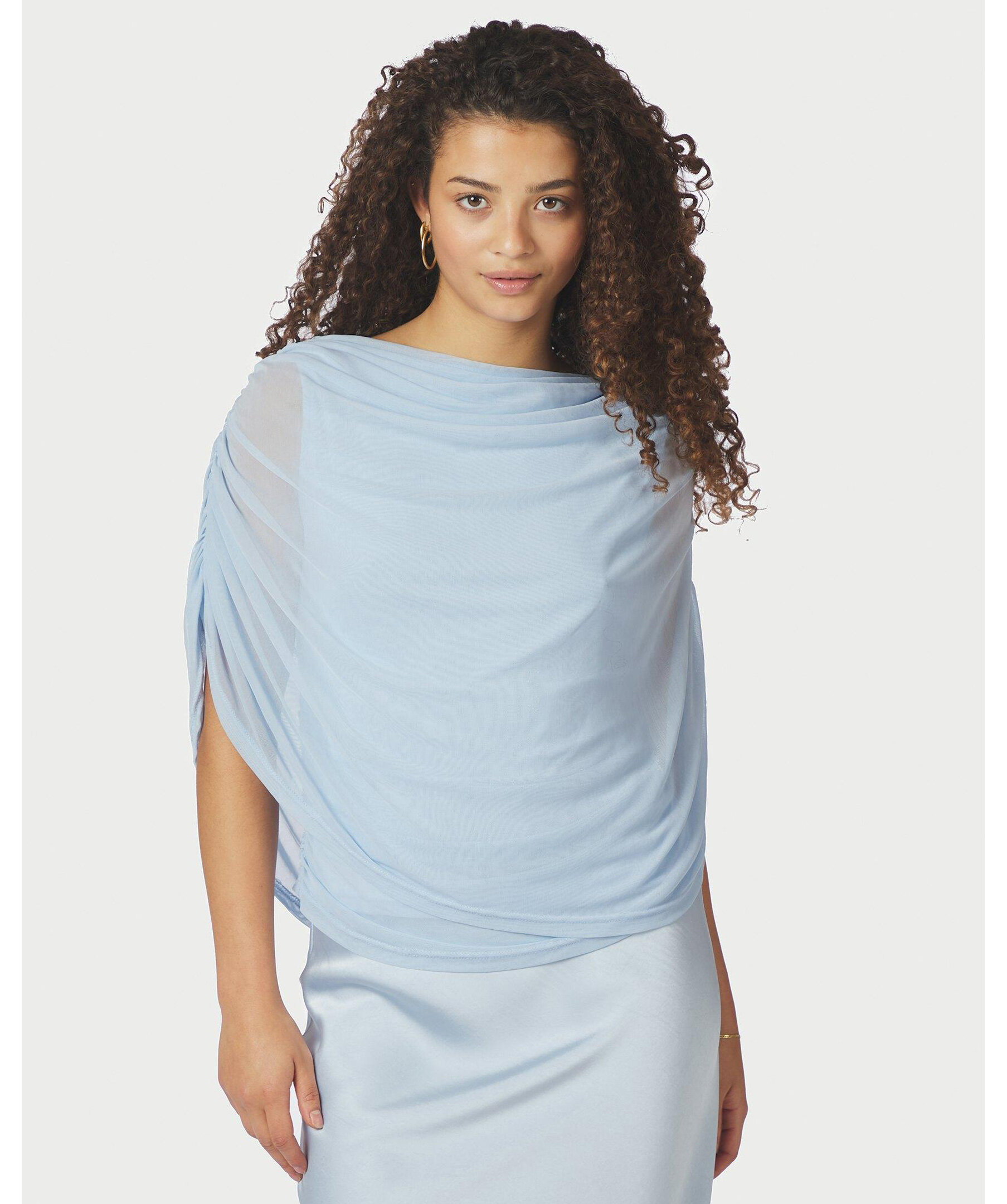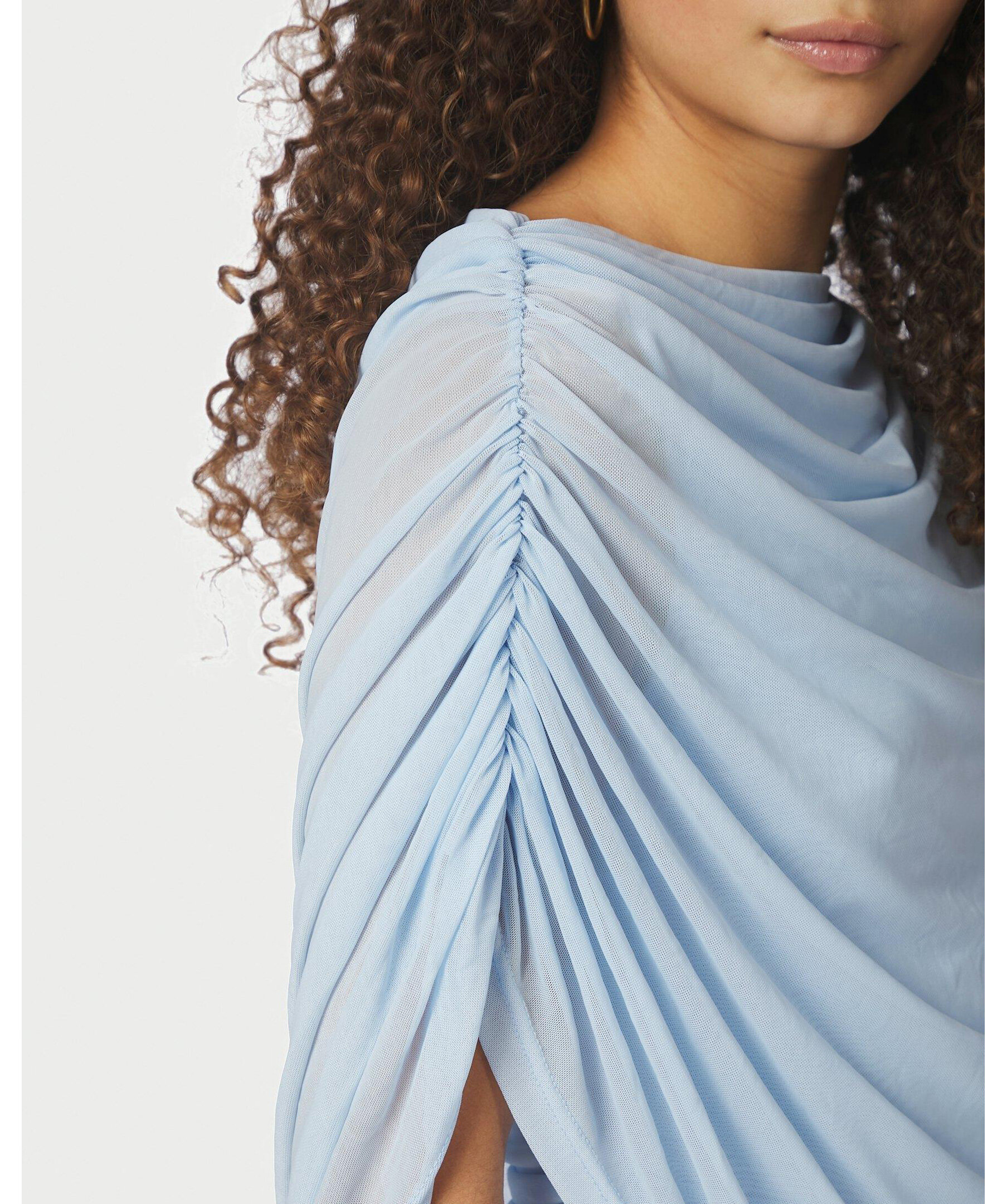 Ljusblå mesh-topp med smock längs sömmen i sidan, och med draperad vattenfallseffekt vid halsen fram. Modellen är 176 cm lång och bär storlek 36.