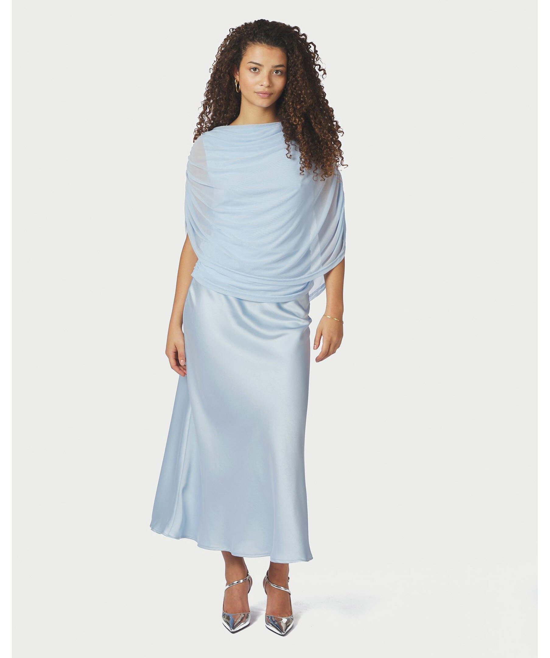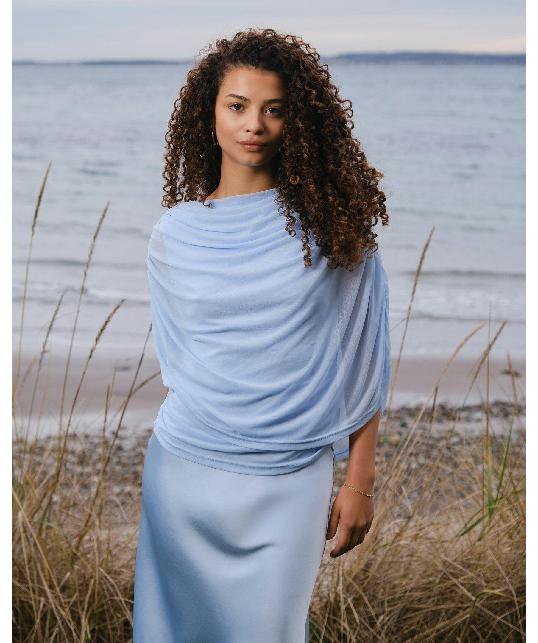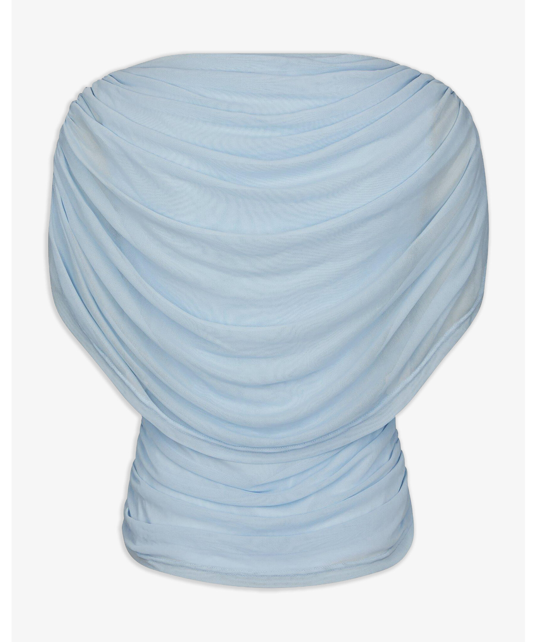 Ljusblå mesh-topp med smock längs sömmen i sidan, och med draperad vattenfallseffekt vid halsen fram. Modellen är 176 cm lång och bär storlek 36.