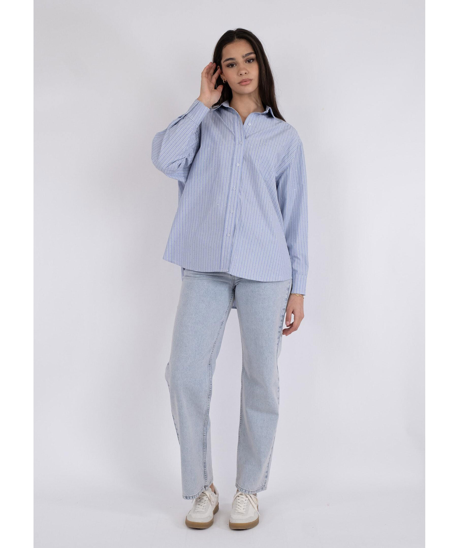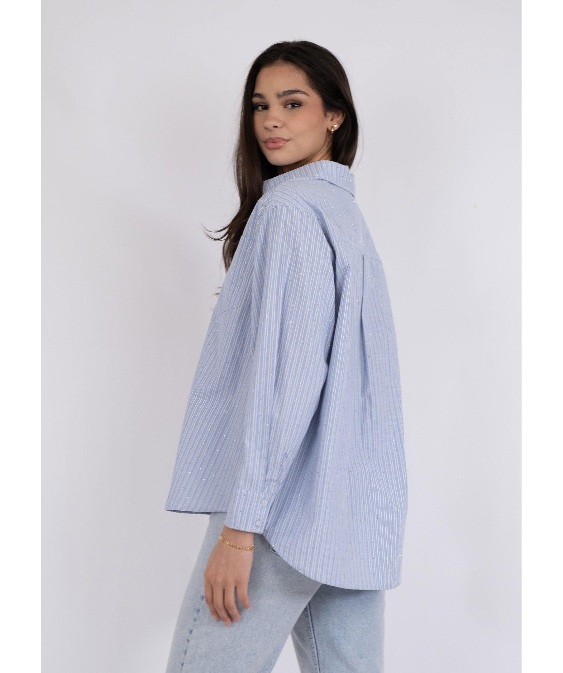 Blå, randig skjorta från Neo Noir. Tillverkad i en poplinkvalitet med små glitterstenar. Button-down krage framtill med en bröstficka. Oversized passform.