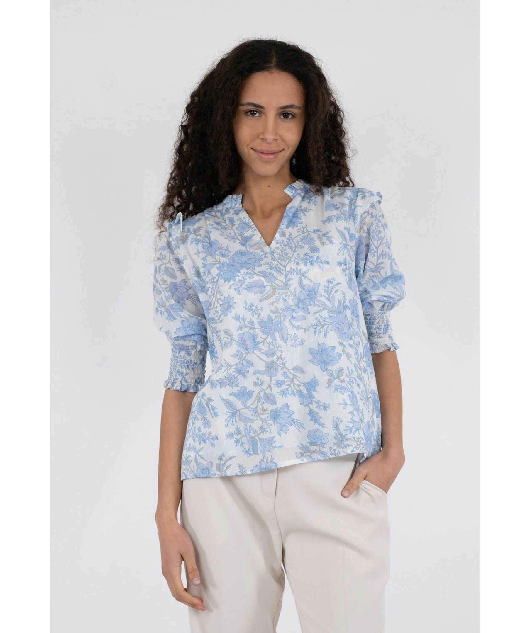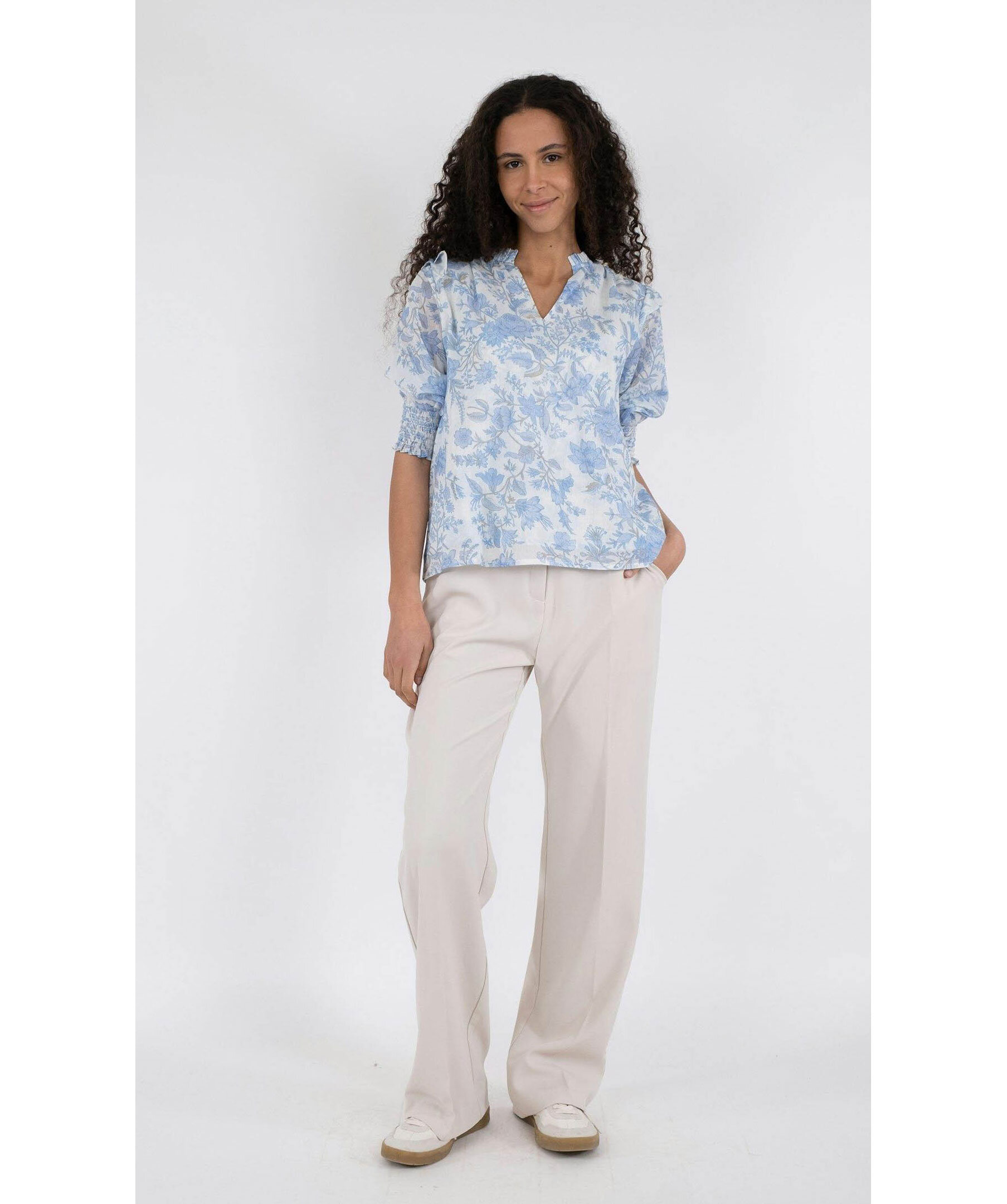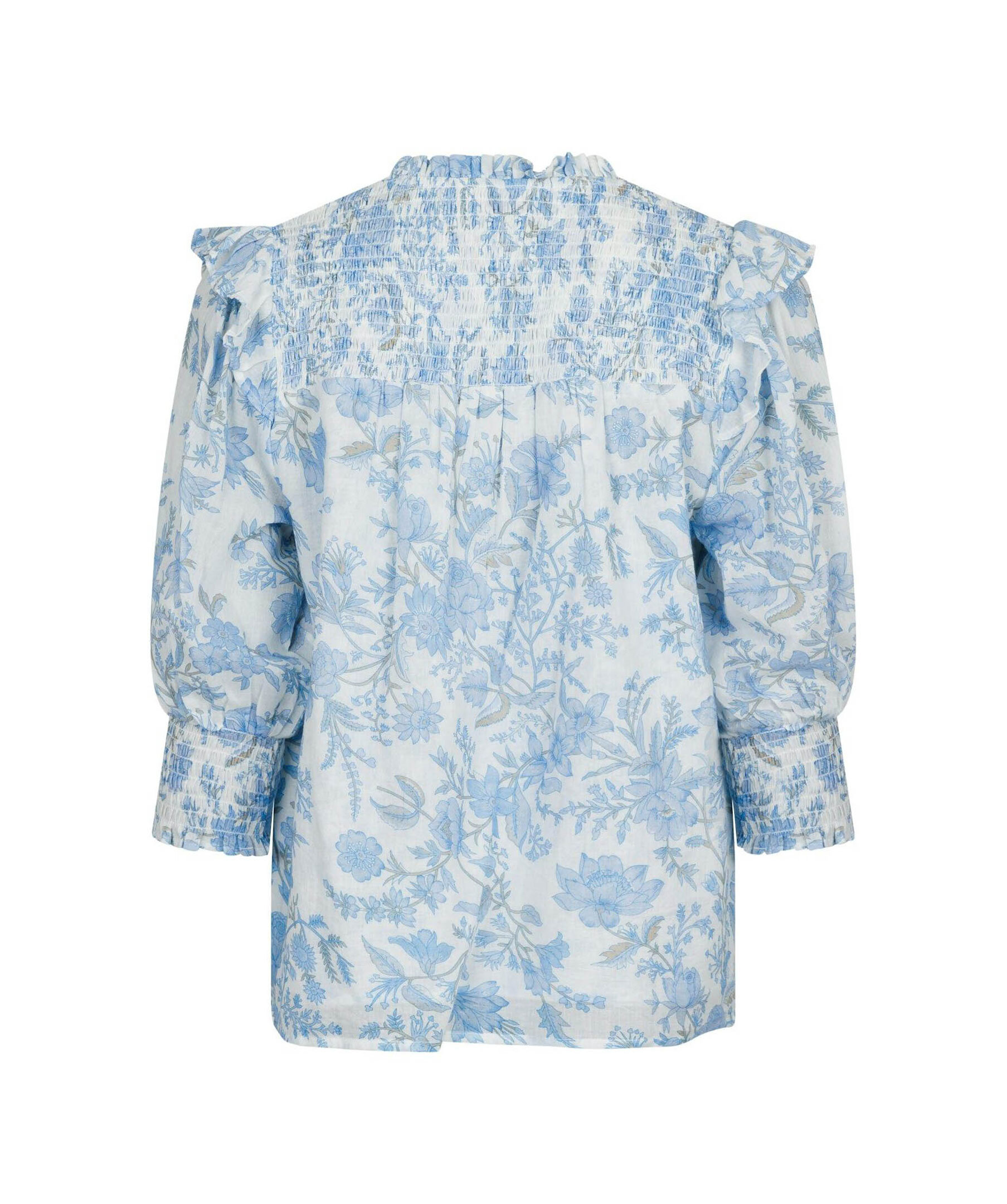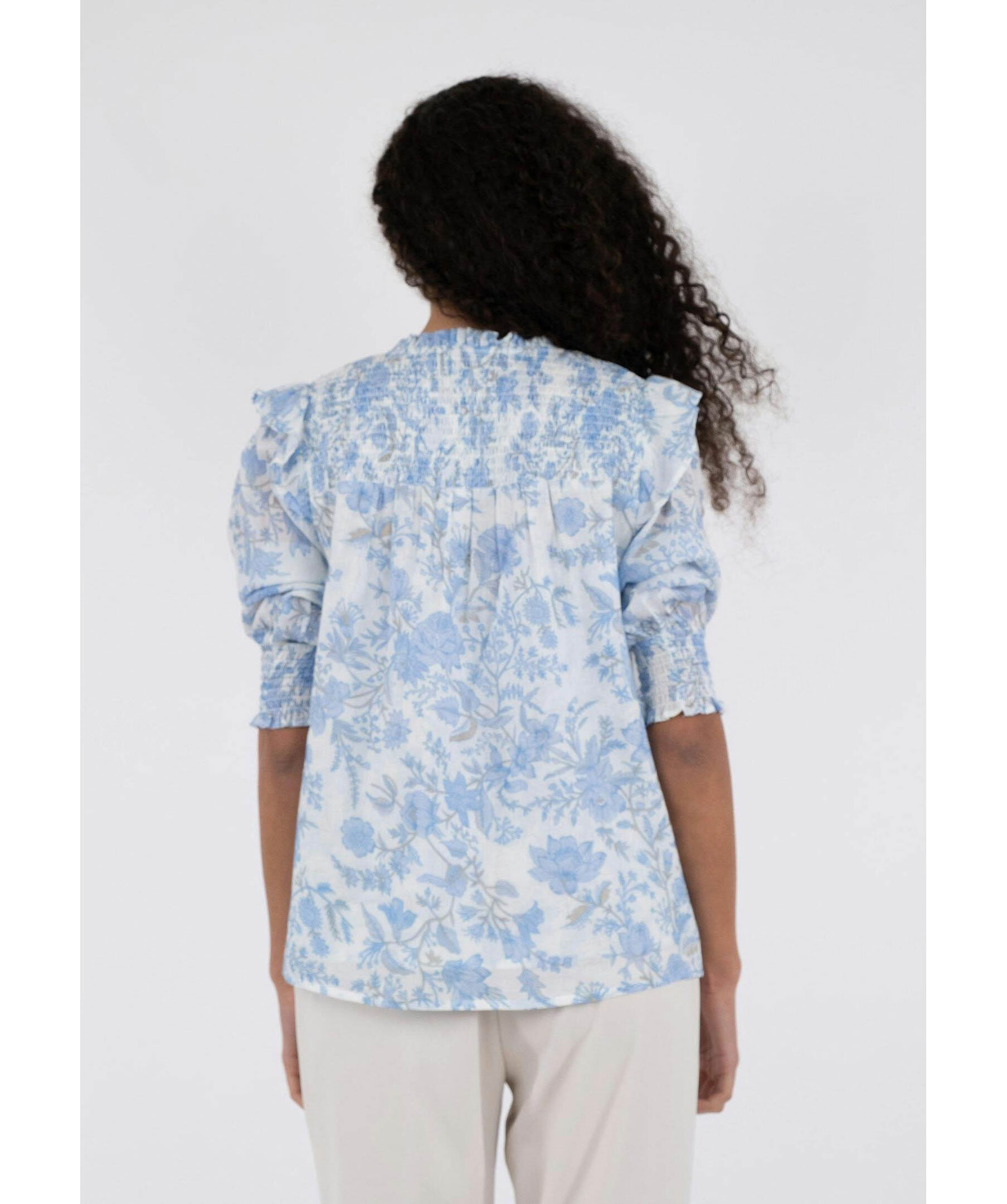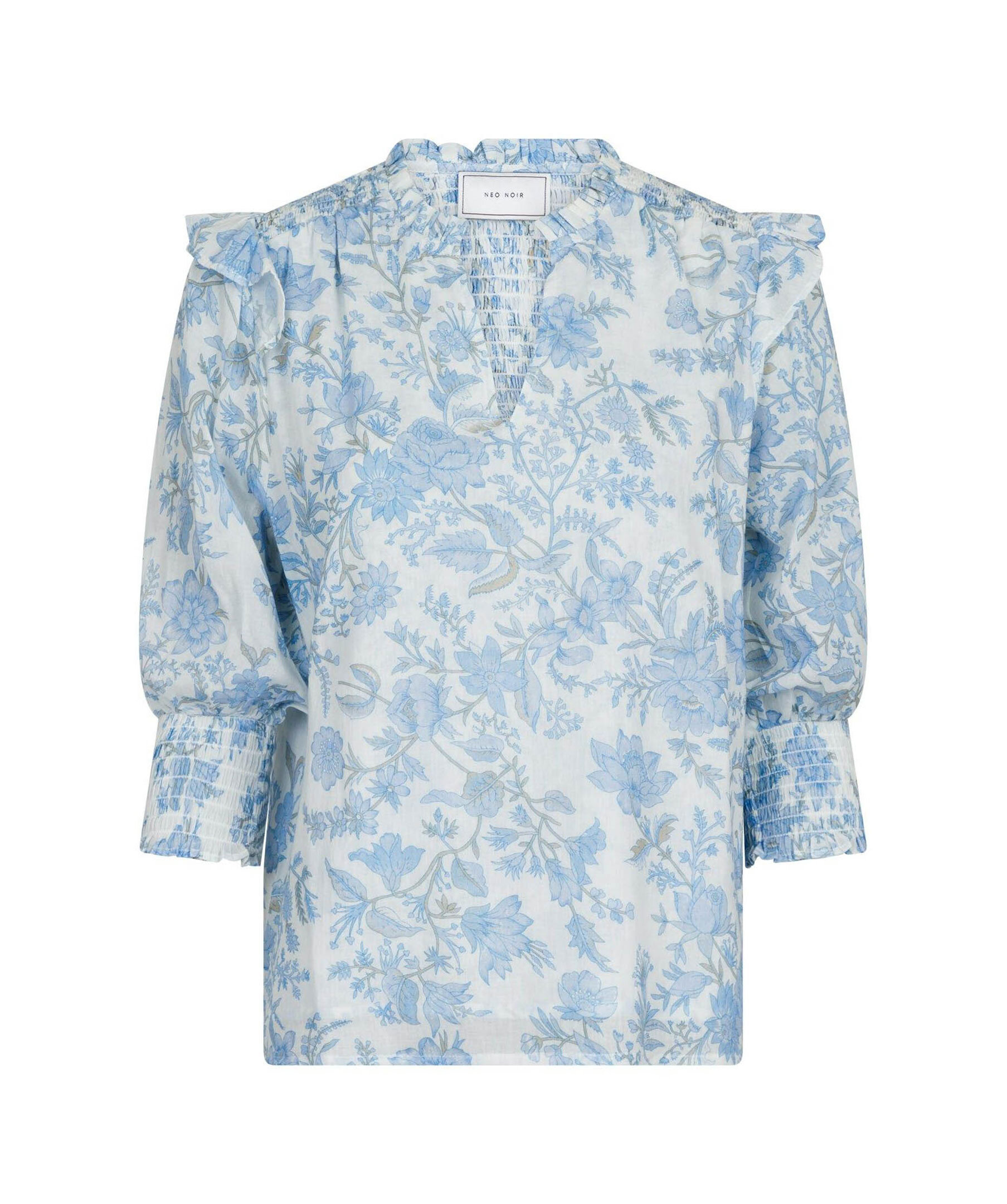 Ljusblå och vitmönstrad blus från Neo Noir. Puffärmar med volang och smock vid ärmslut. V-ringad med volang krage. Smock baktill uppe vid axlarna. Tillverkad i 100% Bomull.