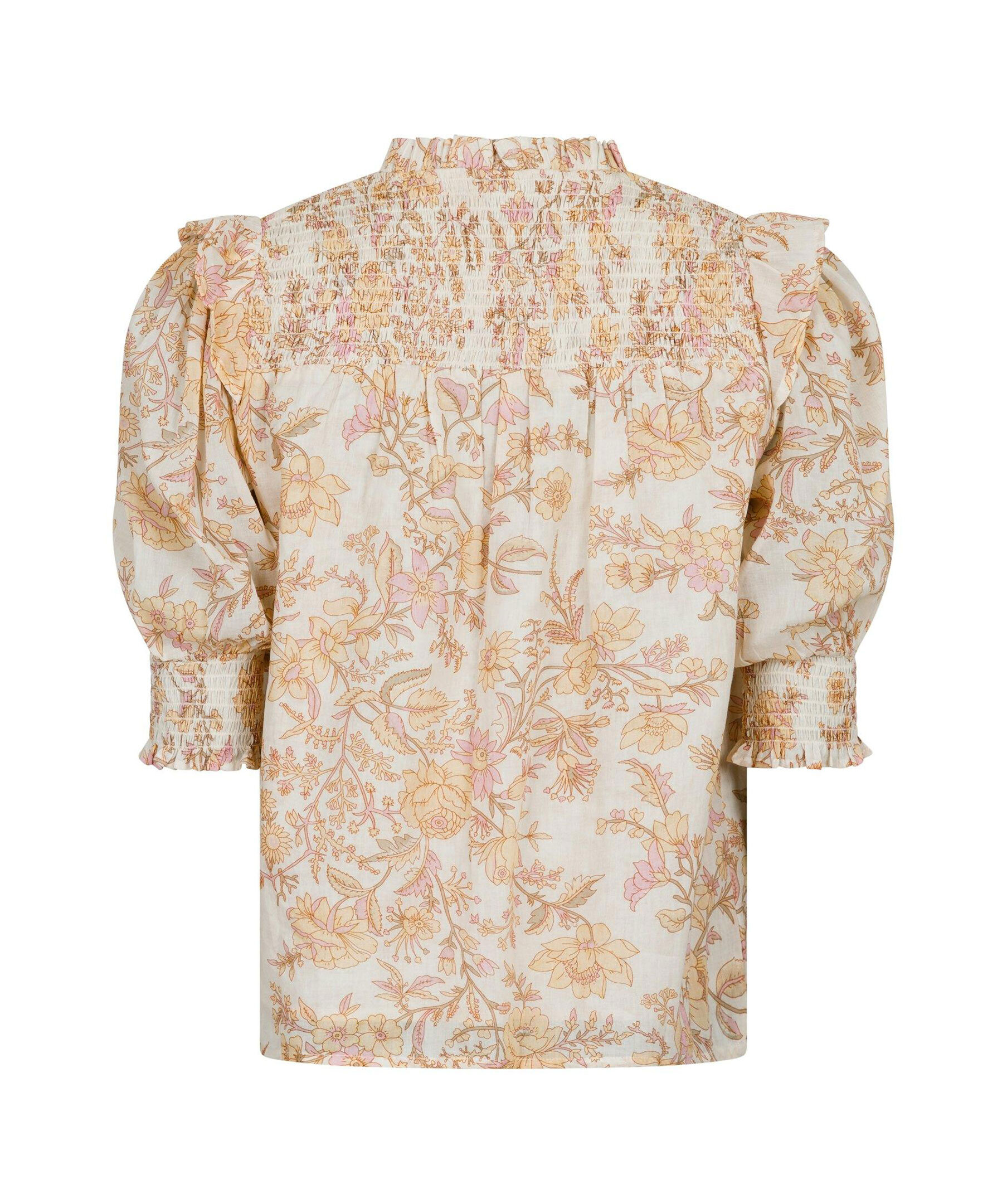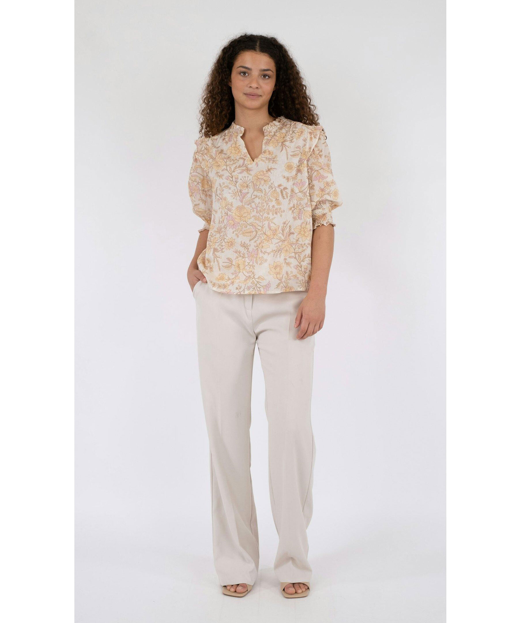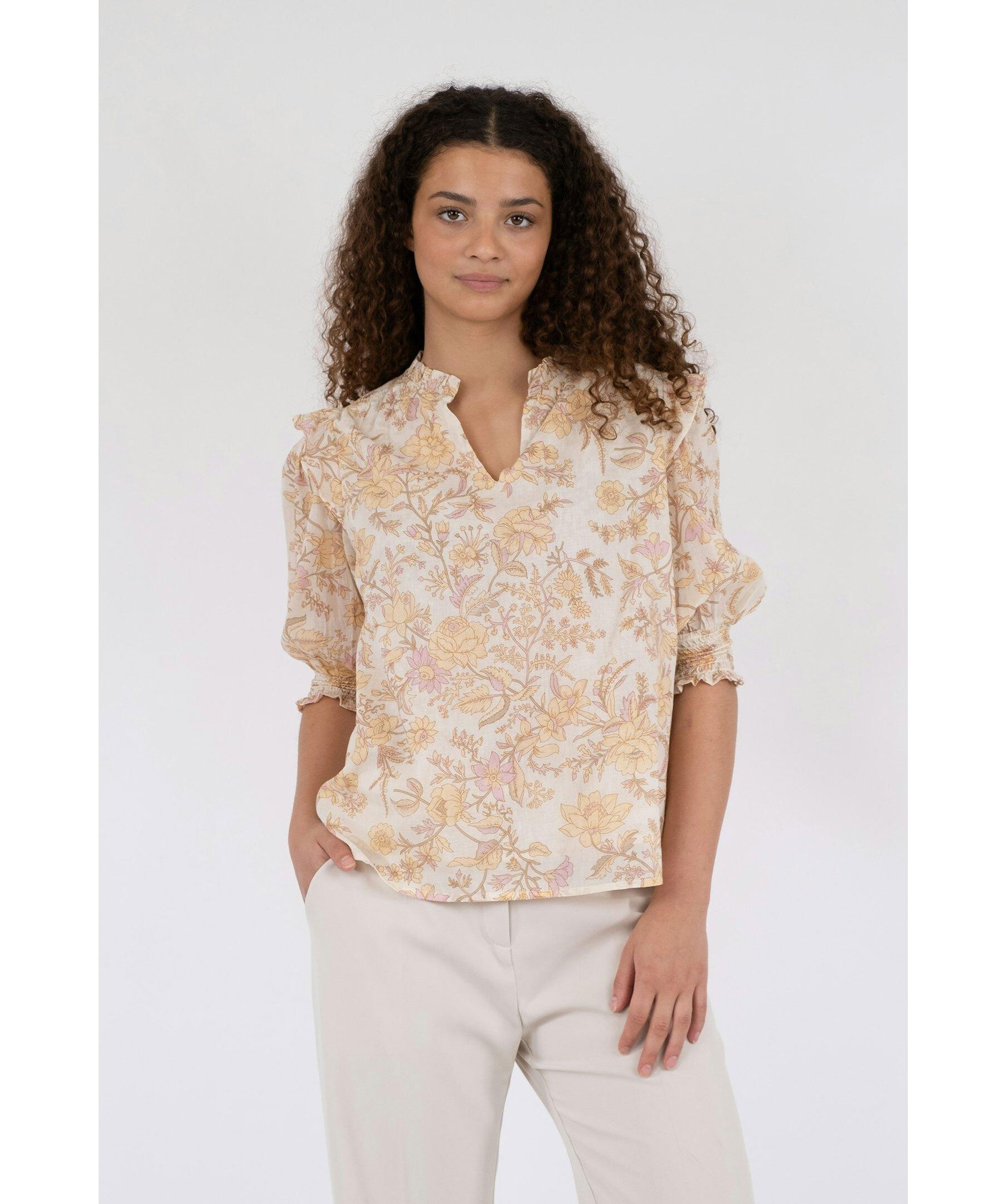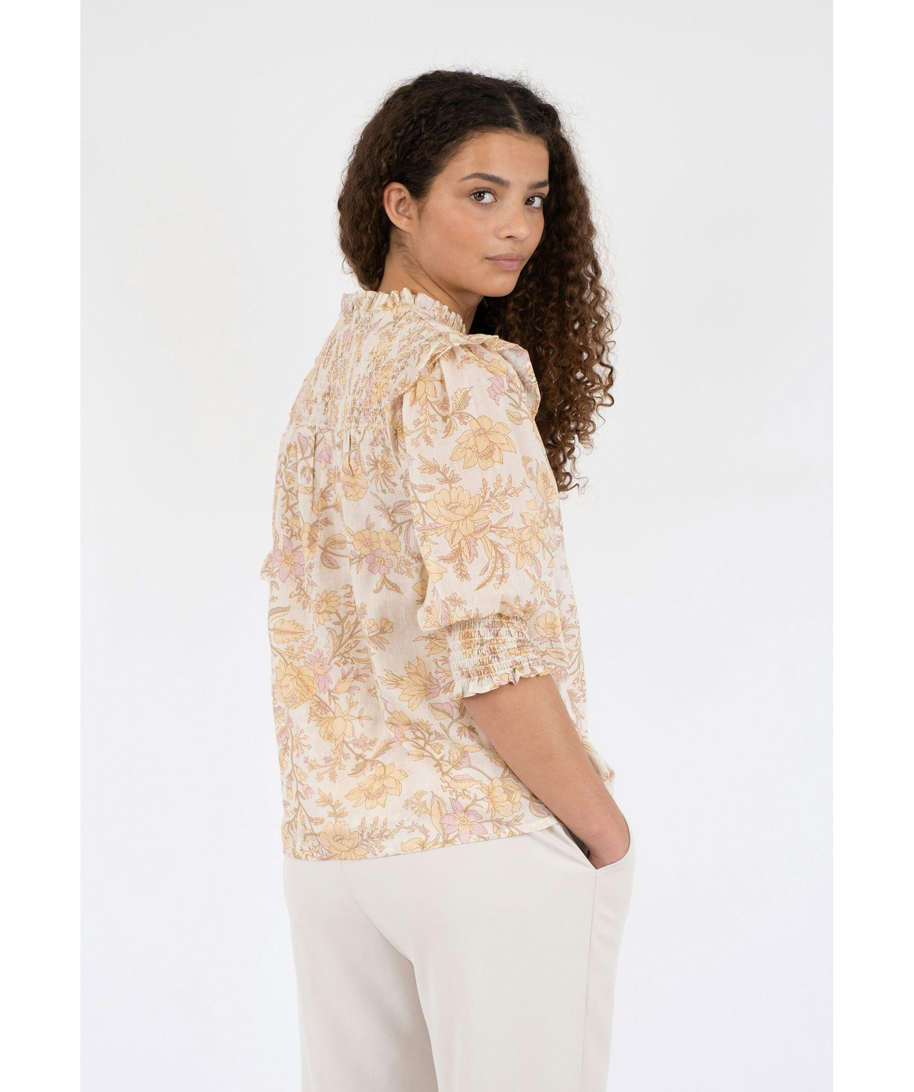 Krämvit och gulmönstrad blus från Neo Noir. Puffärmar med volang och smock vid ärmslut. V-ringad med volang krage. Smock baktill uppe vid axlarna. Tillverkad i 100% Bomull.