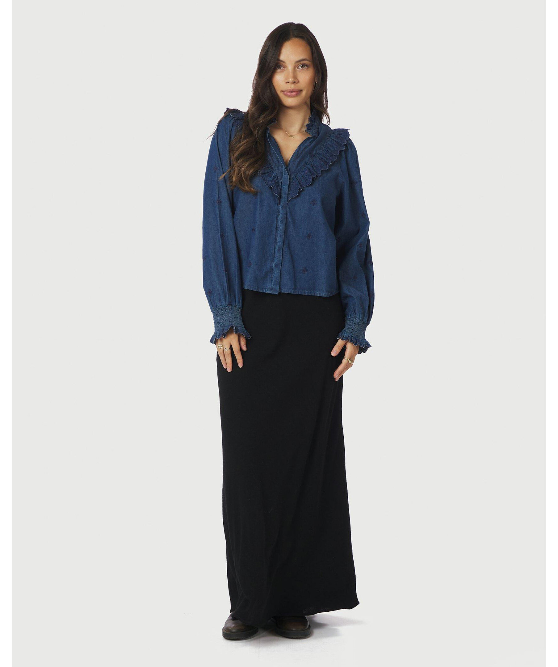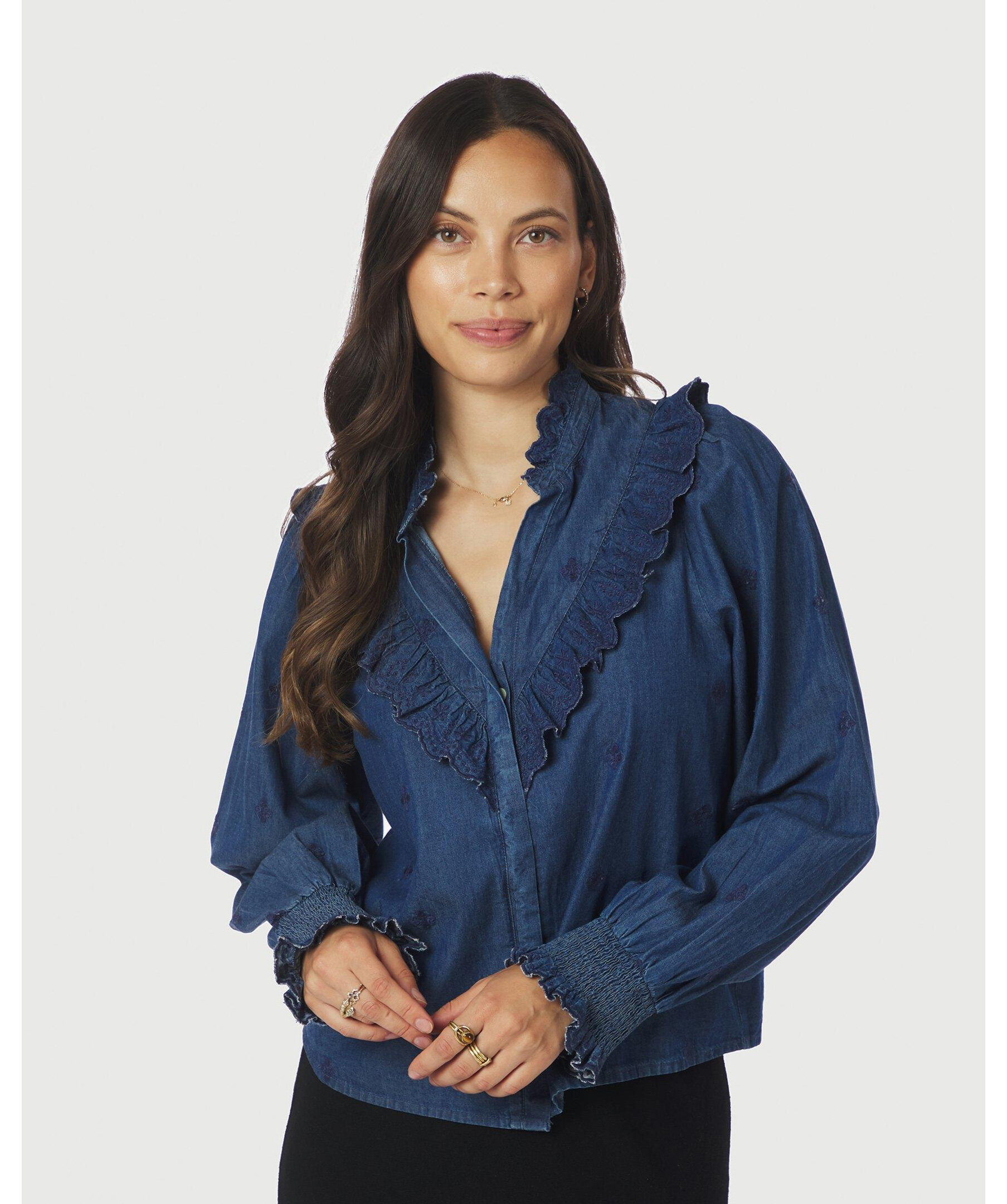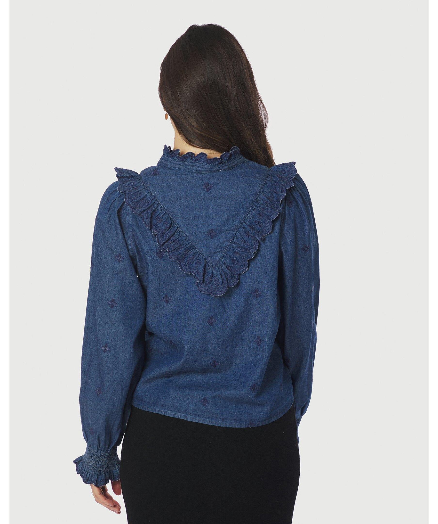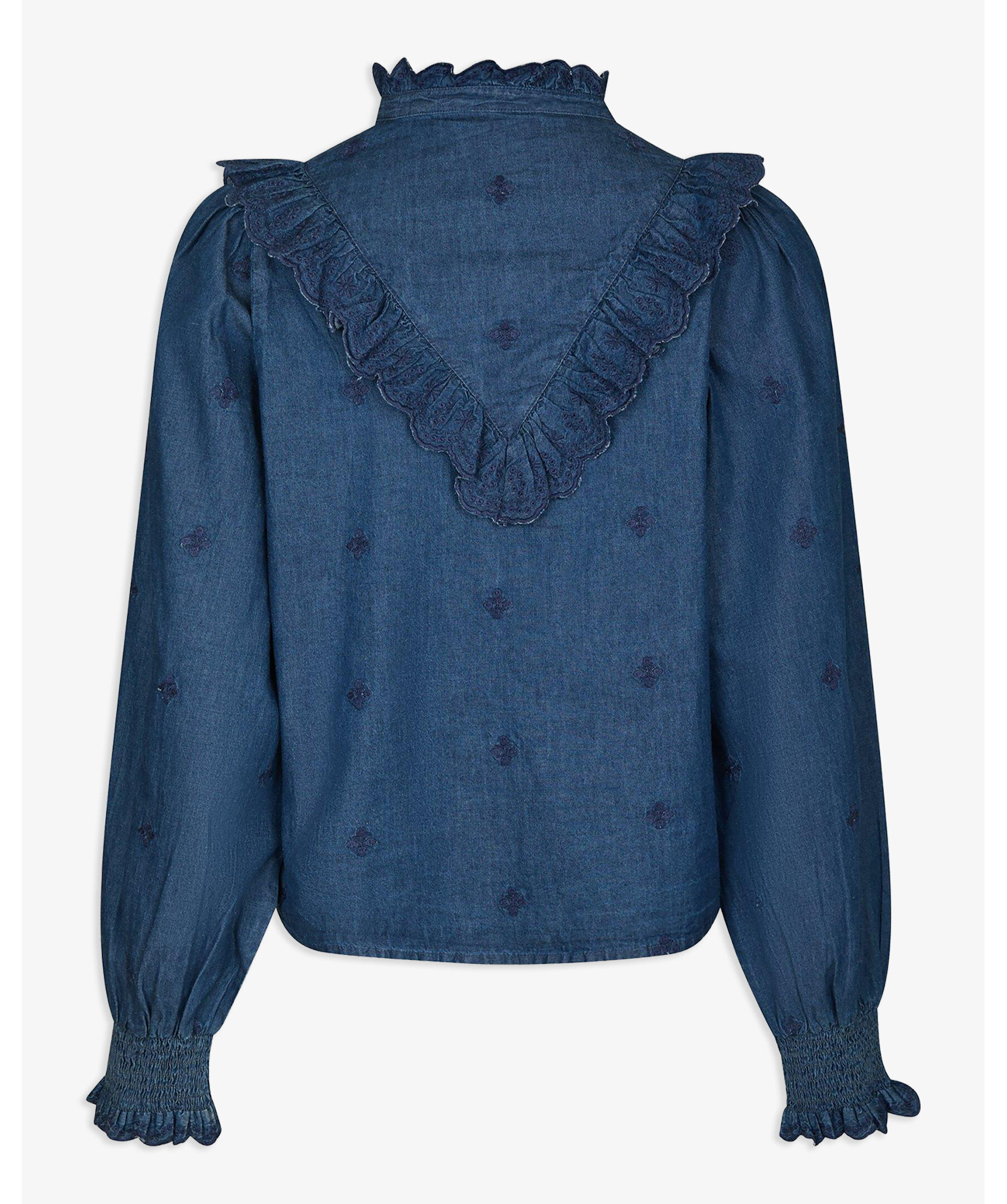 Dekorativ blus med långa ärmar och en feminin men avslappnad passform. Blusen har volangdetaljer och kommer i en fin denimkvalitet med broderier. Modellen är 176 cm och bär storlek 36.