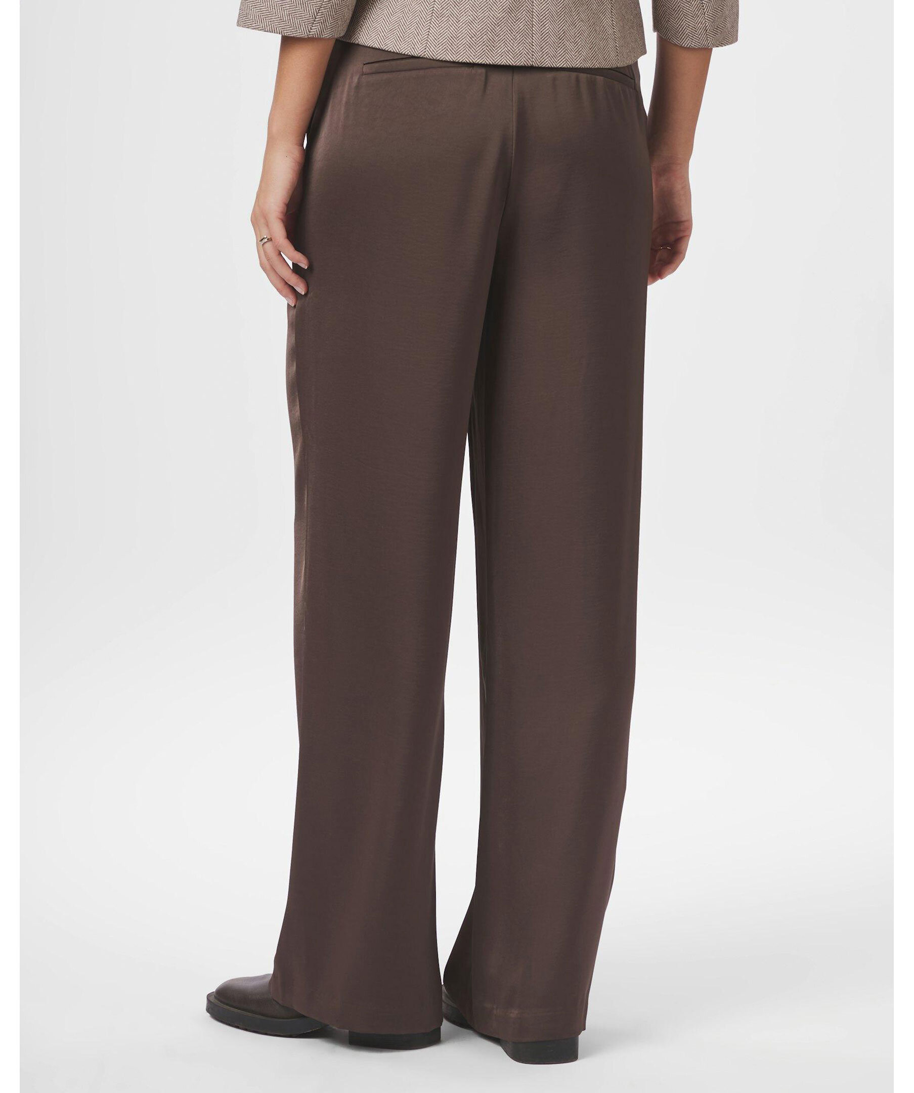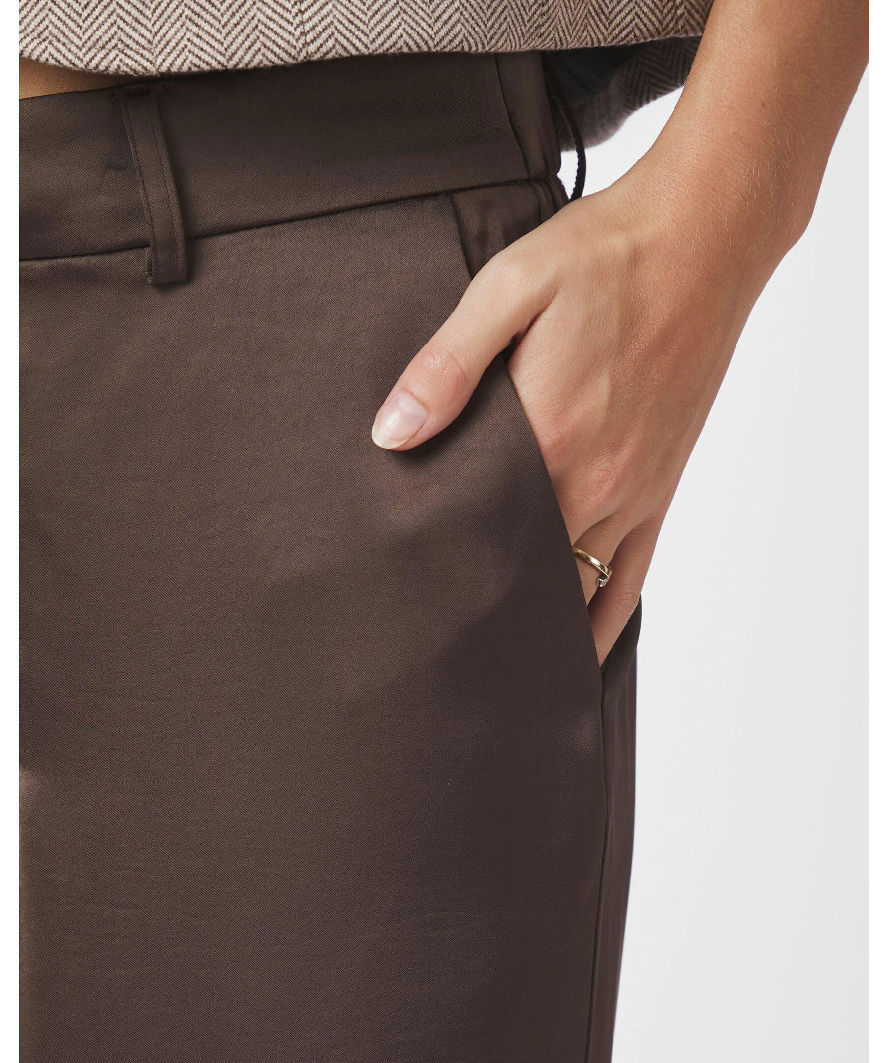 Bruna satinbyxor från Neo Noir. Byxorna har en hög midja med bälteshällor samt vida ben, två sidfickor och två passpoalfickor baktill. Tillverkade i en polyesterblandning.