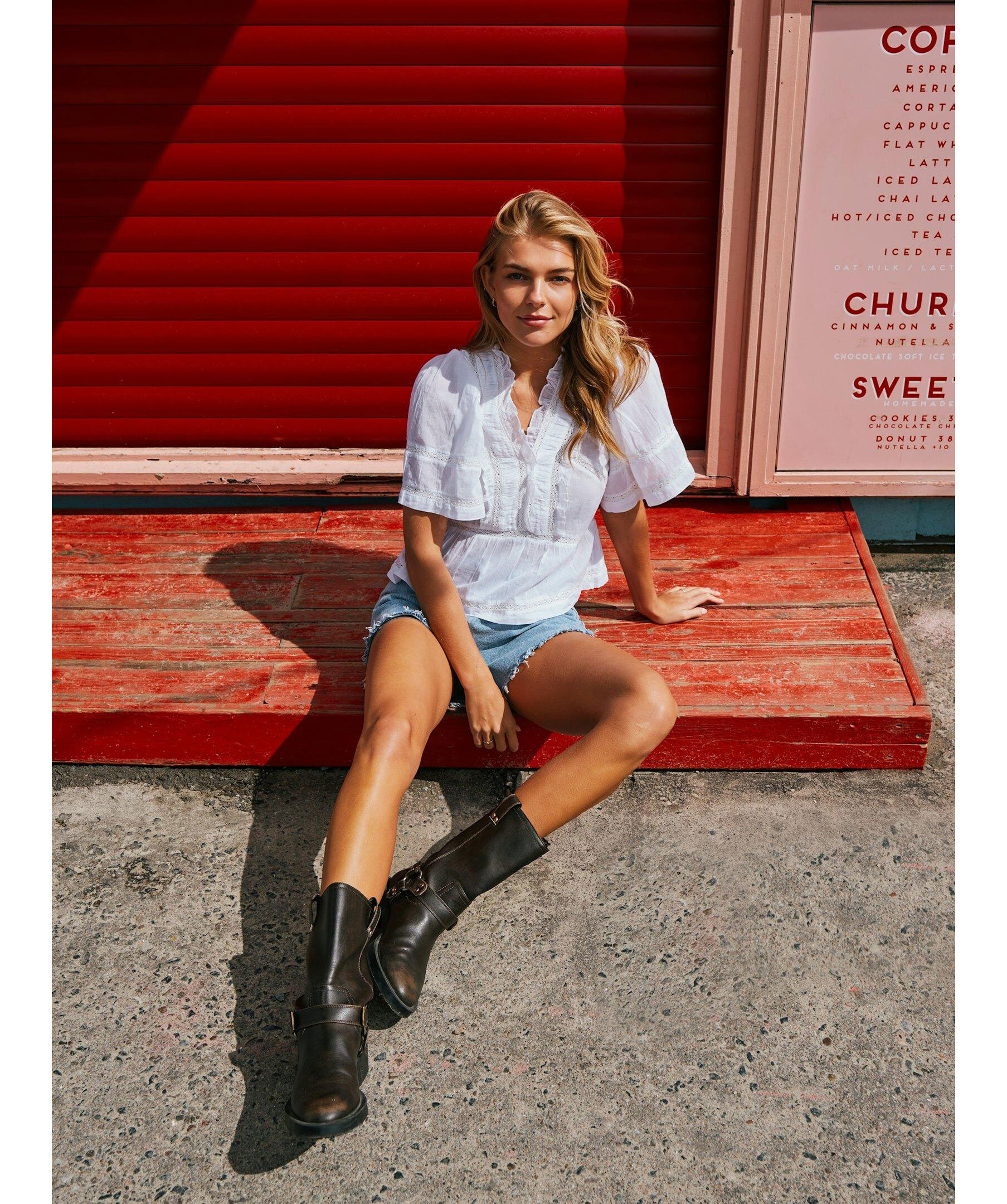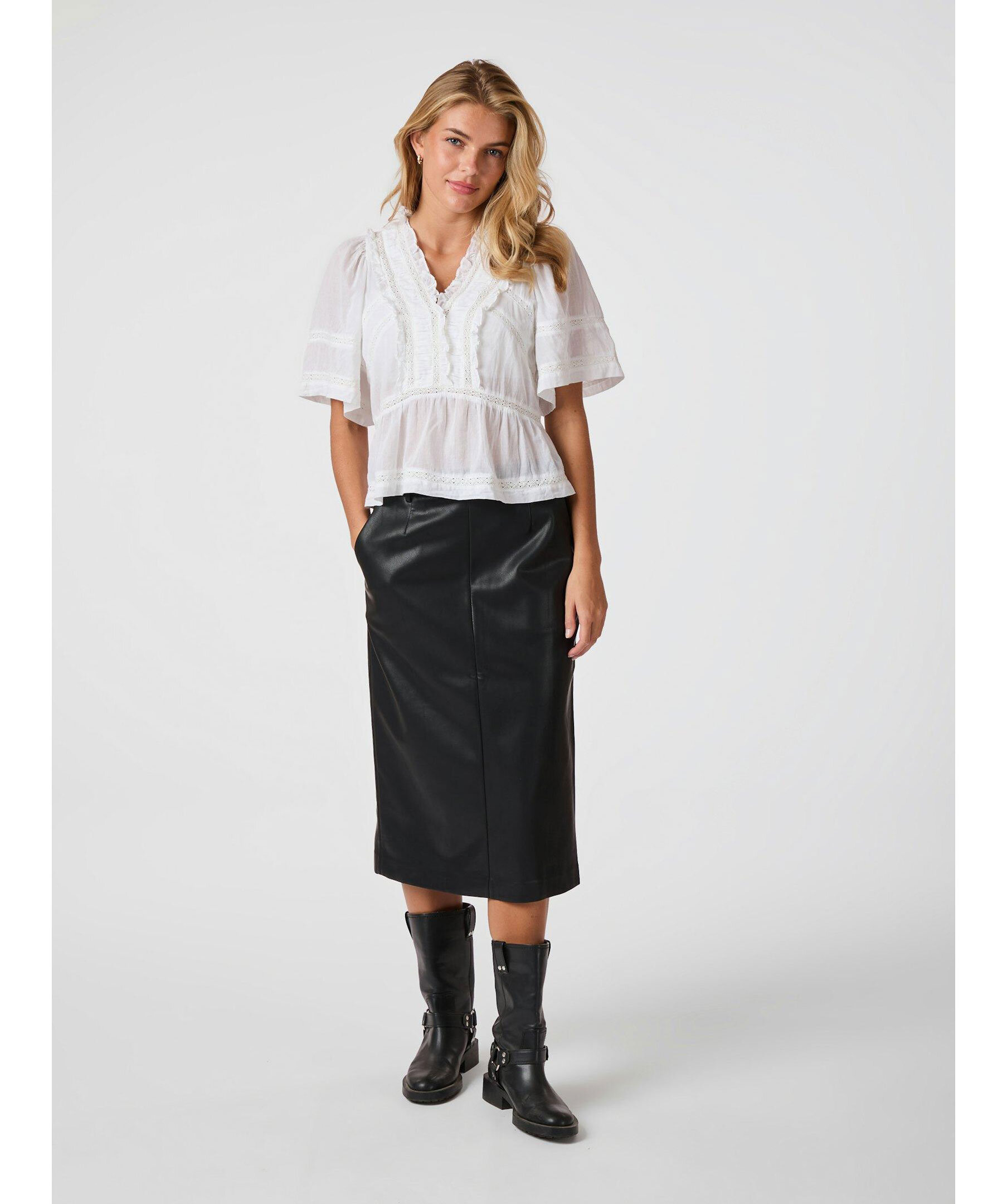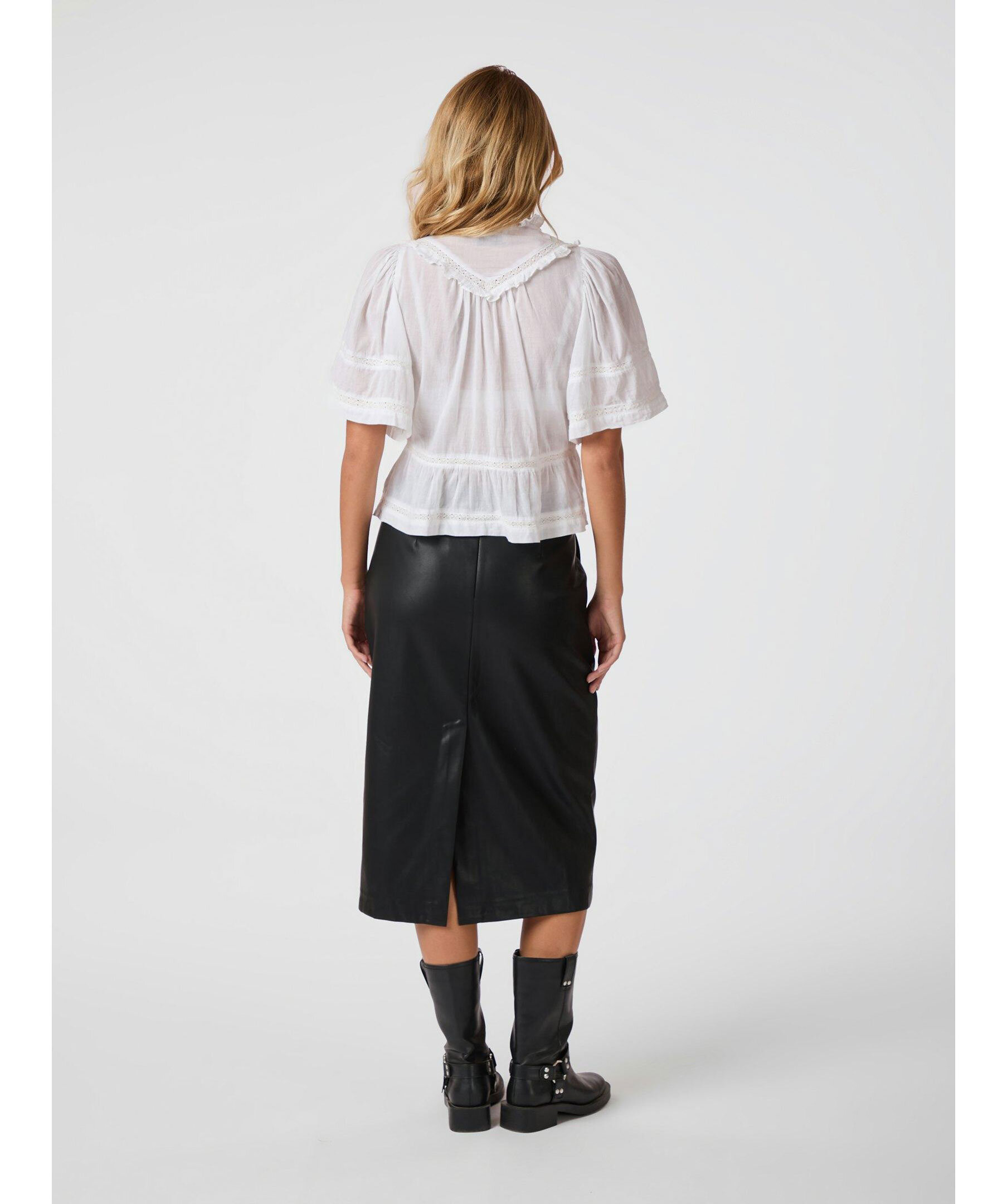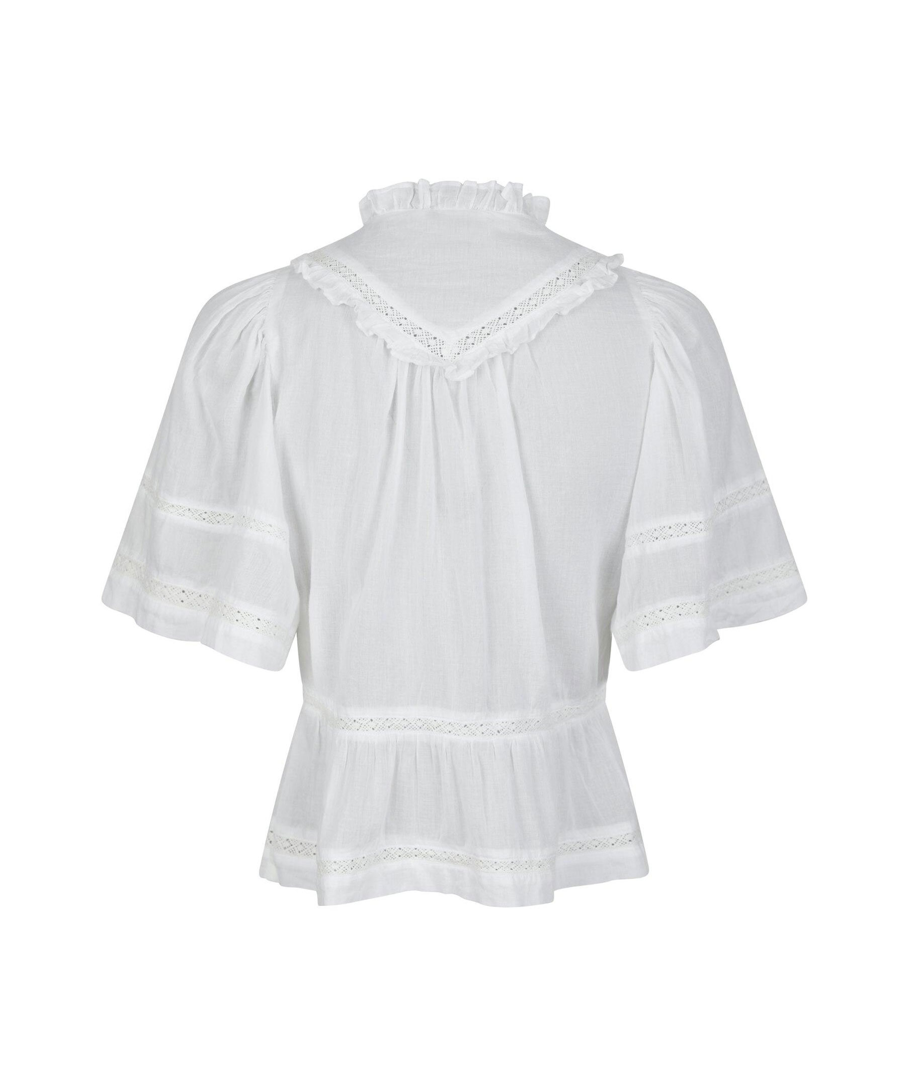 Vit blus med banddetaljer och vida korta ärmar i en fin bomullstyg. Modellen är 176 cm lång och bär storlek 36.