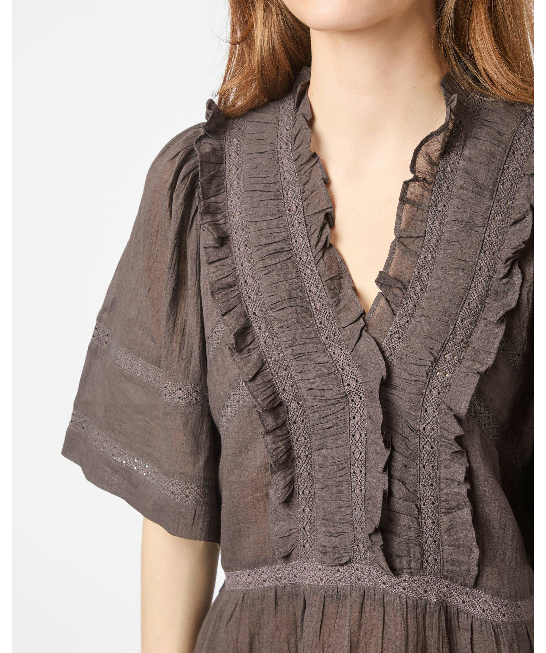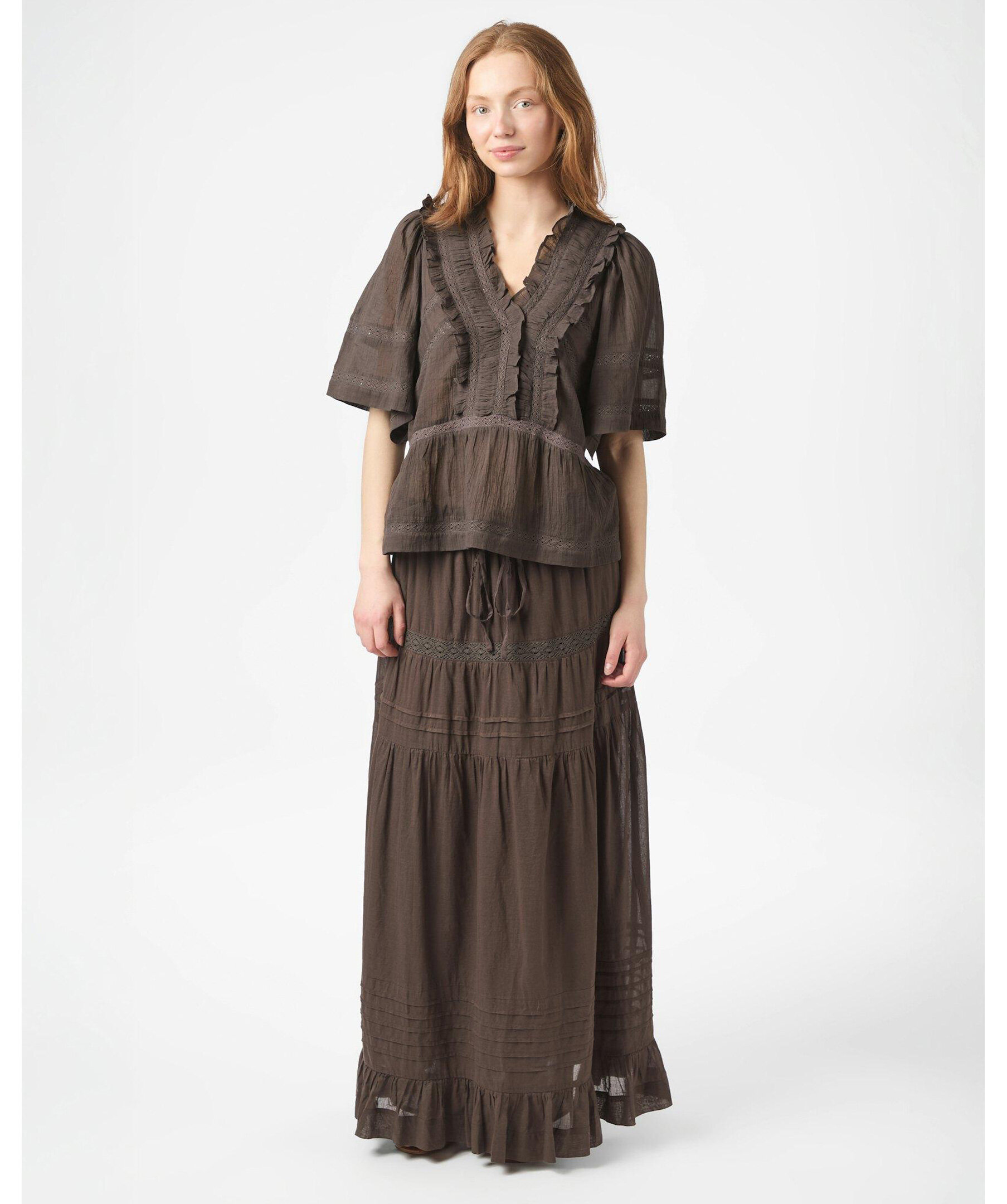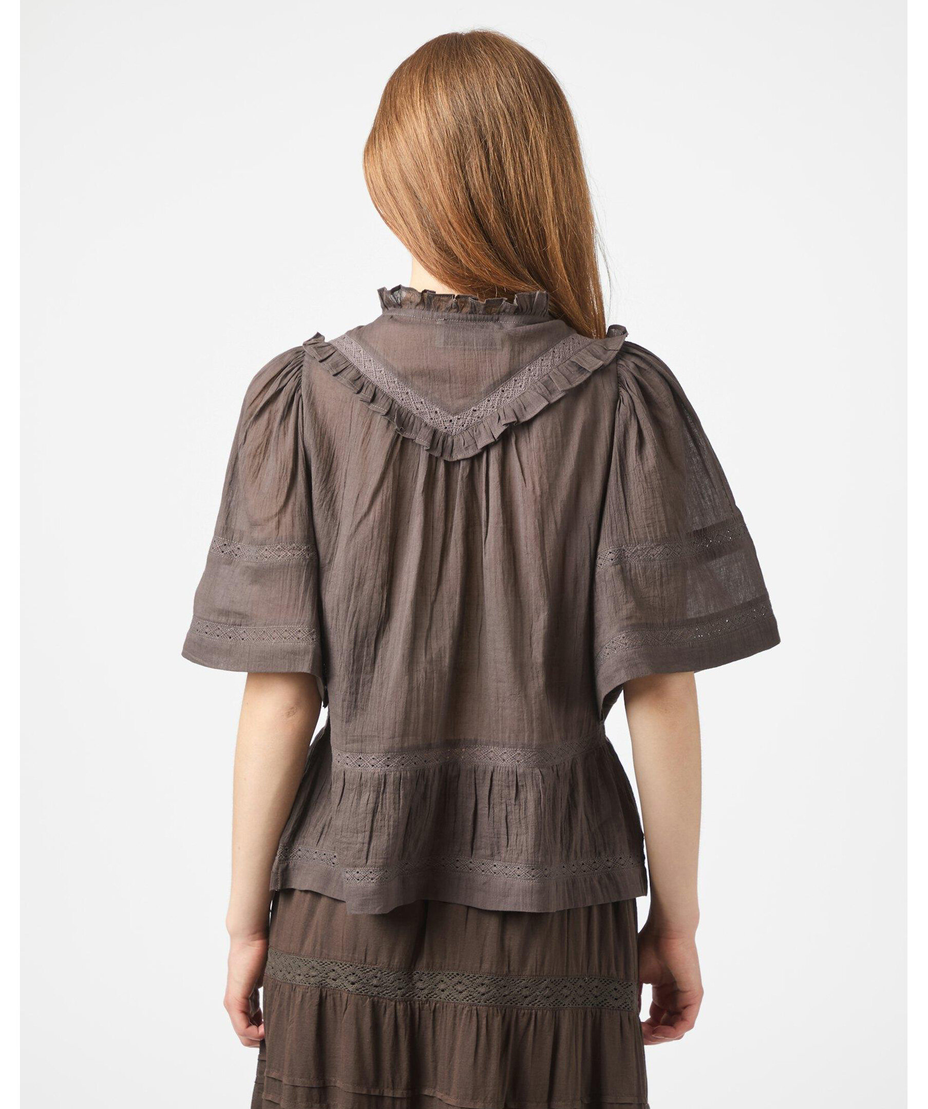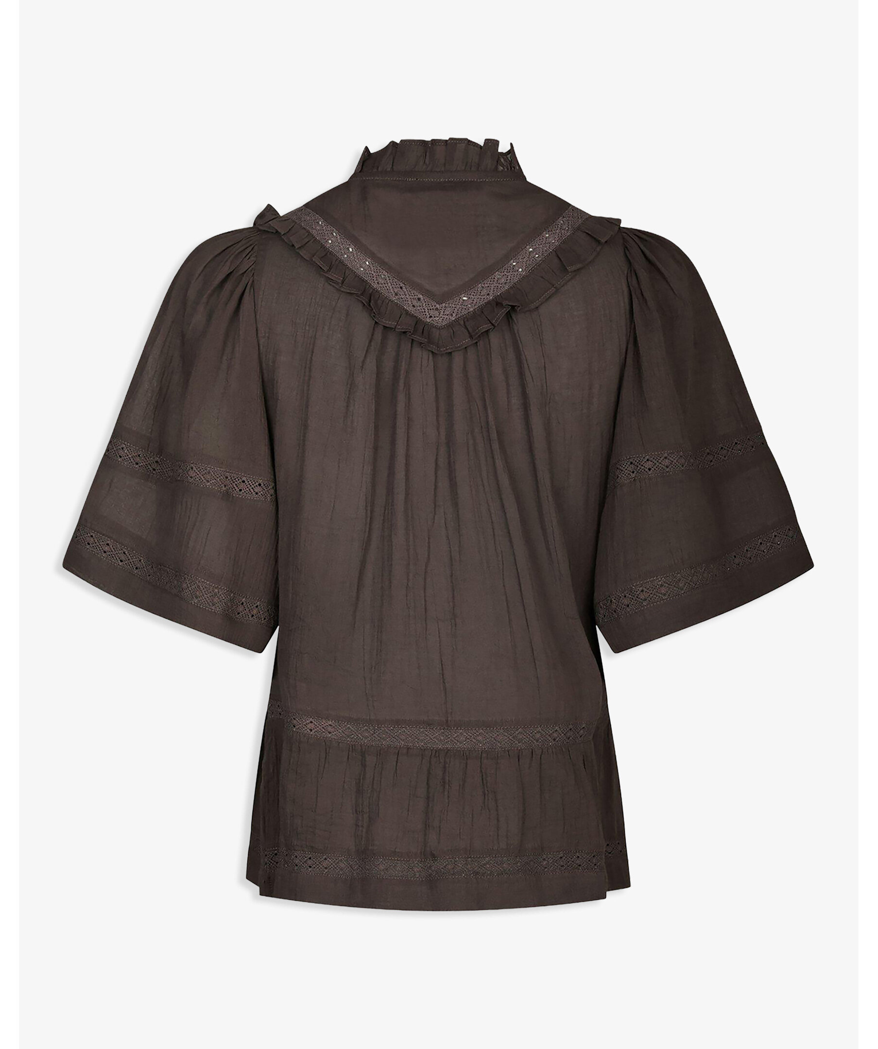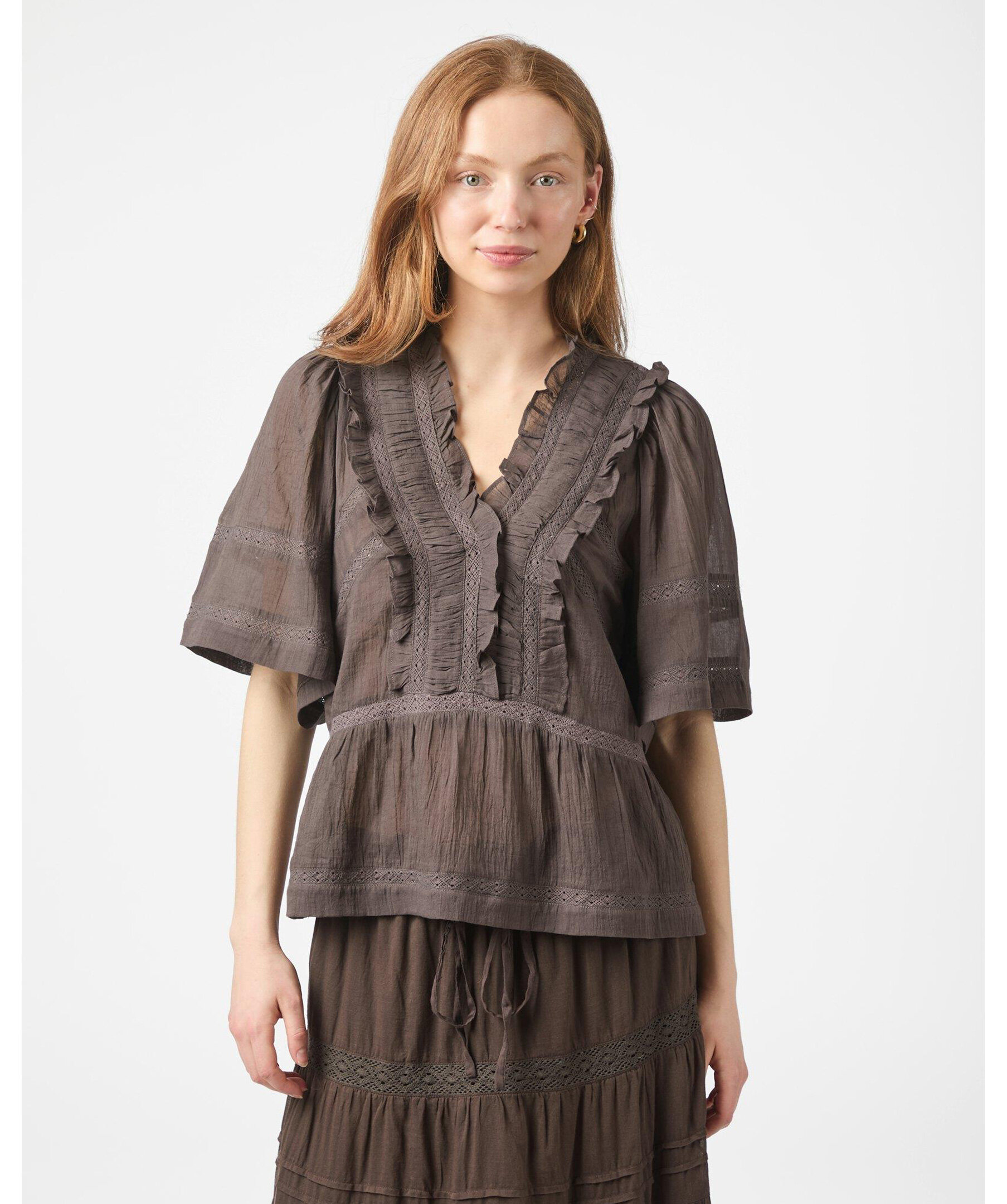 Brun blus med banddetaljer och vida korta ärmar i ett fint bomullstyg. Modellen är 176 cm lång och bär storlek 36.