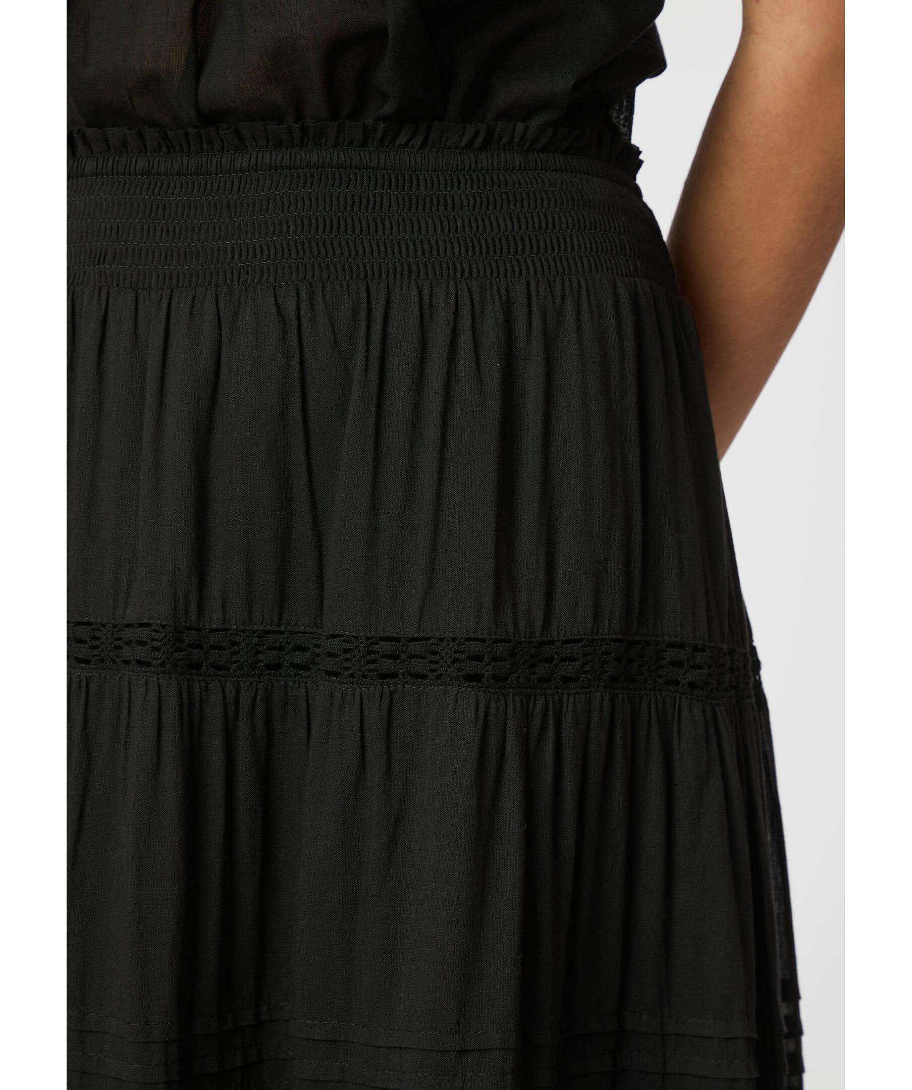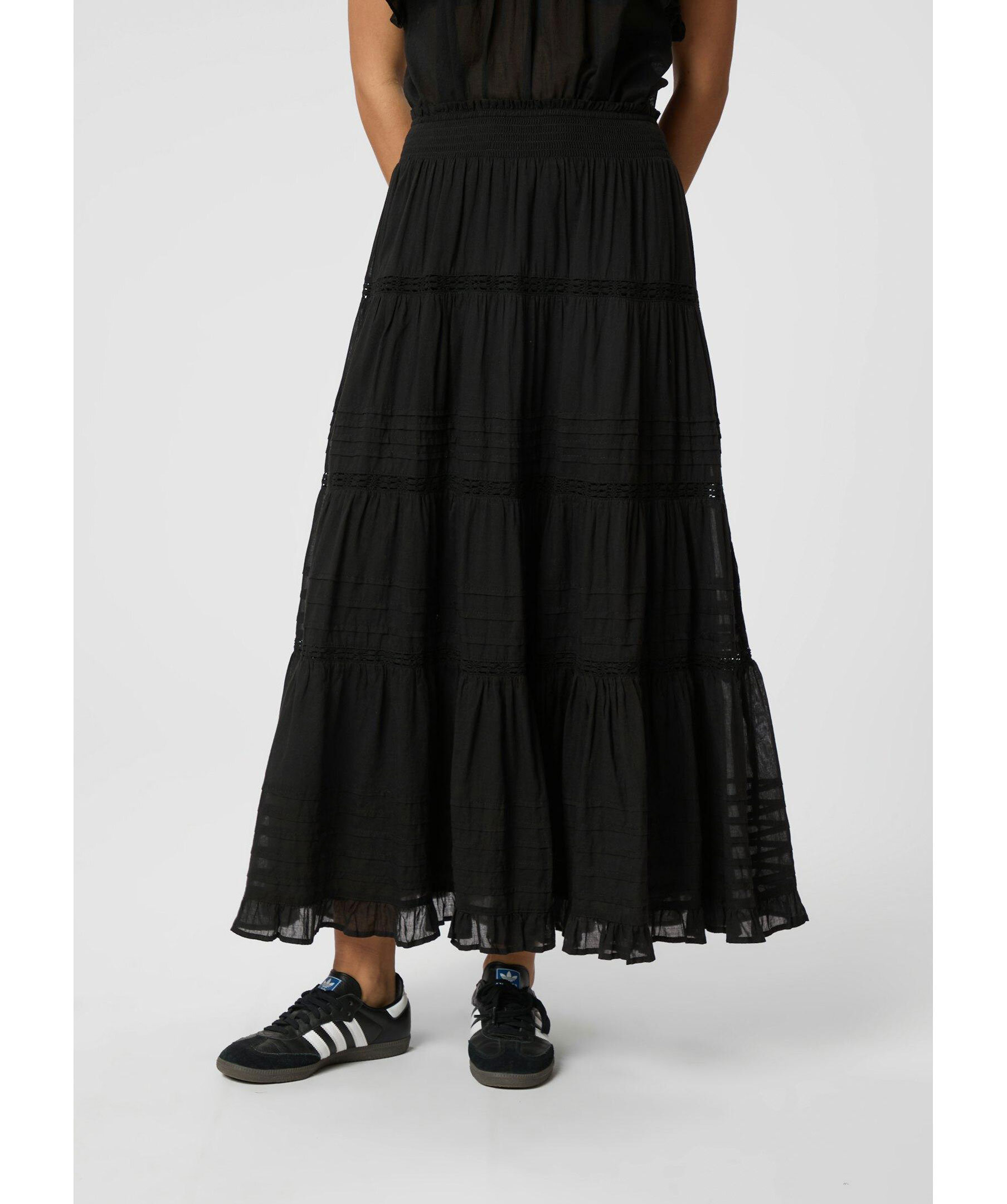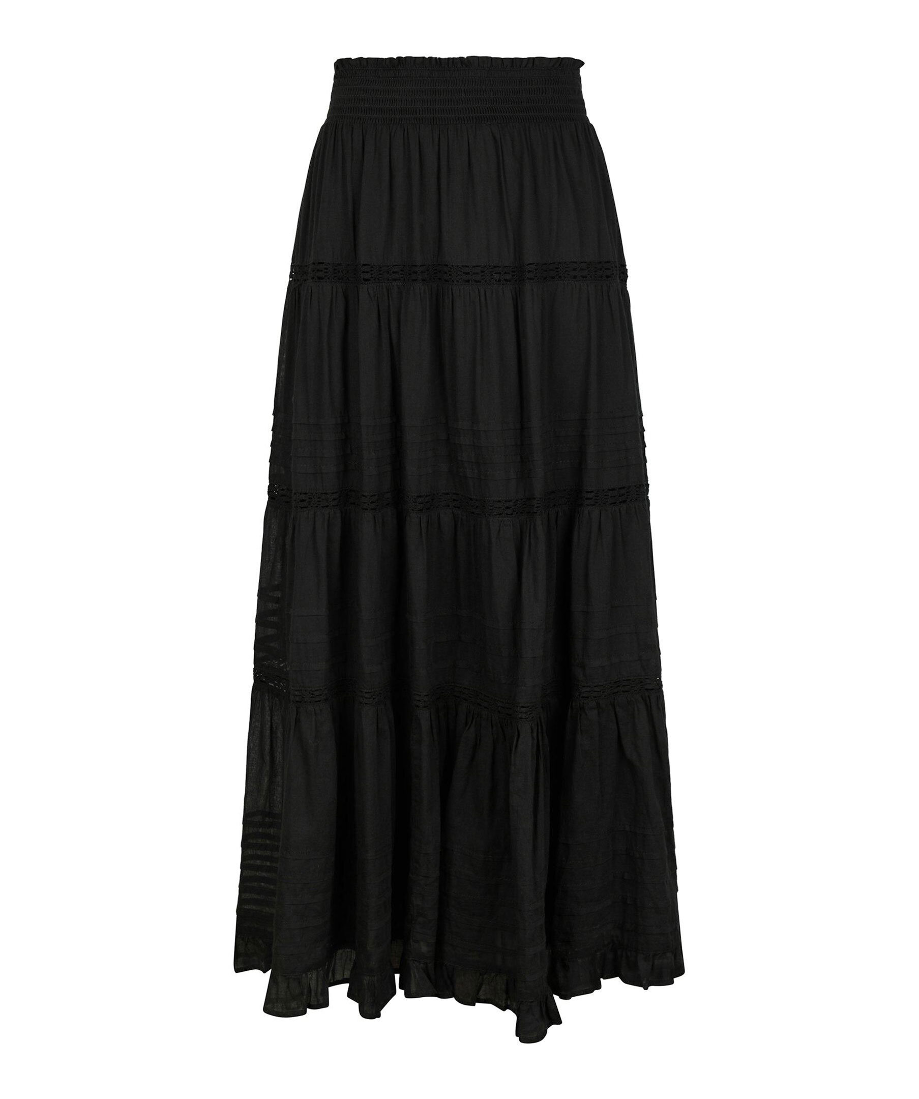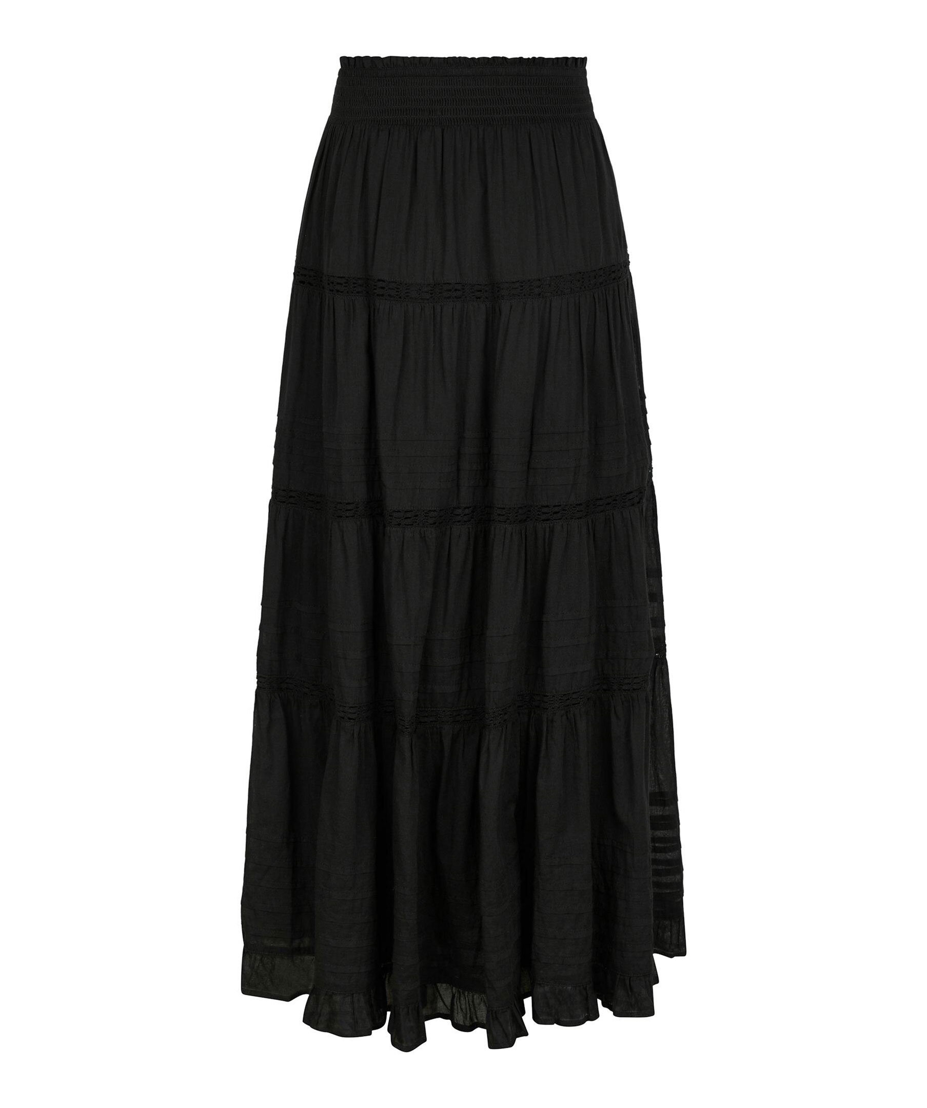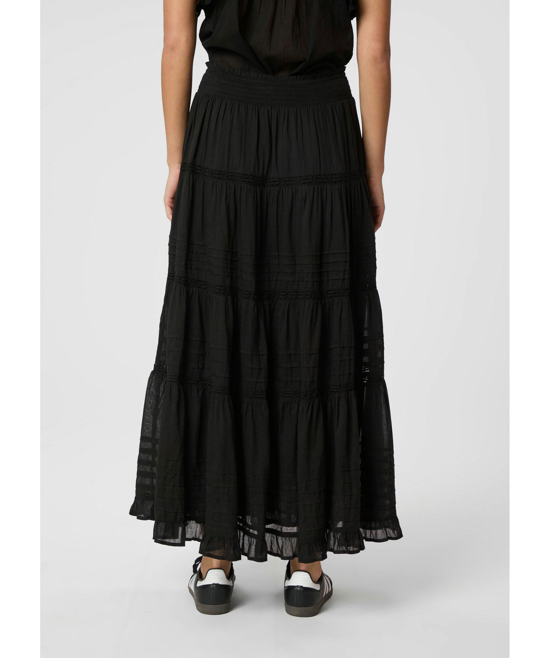 Svart maxikjol från Neo Noir. Kjolen har elastisk midja med smock och ränder. Tillverkad i bomull.