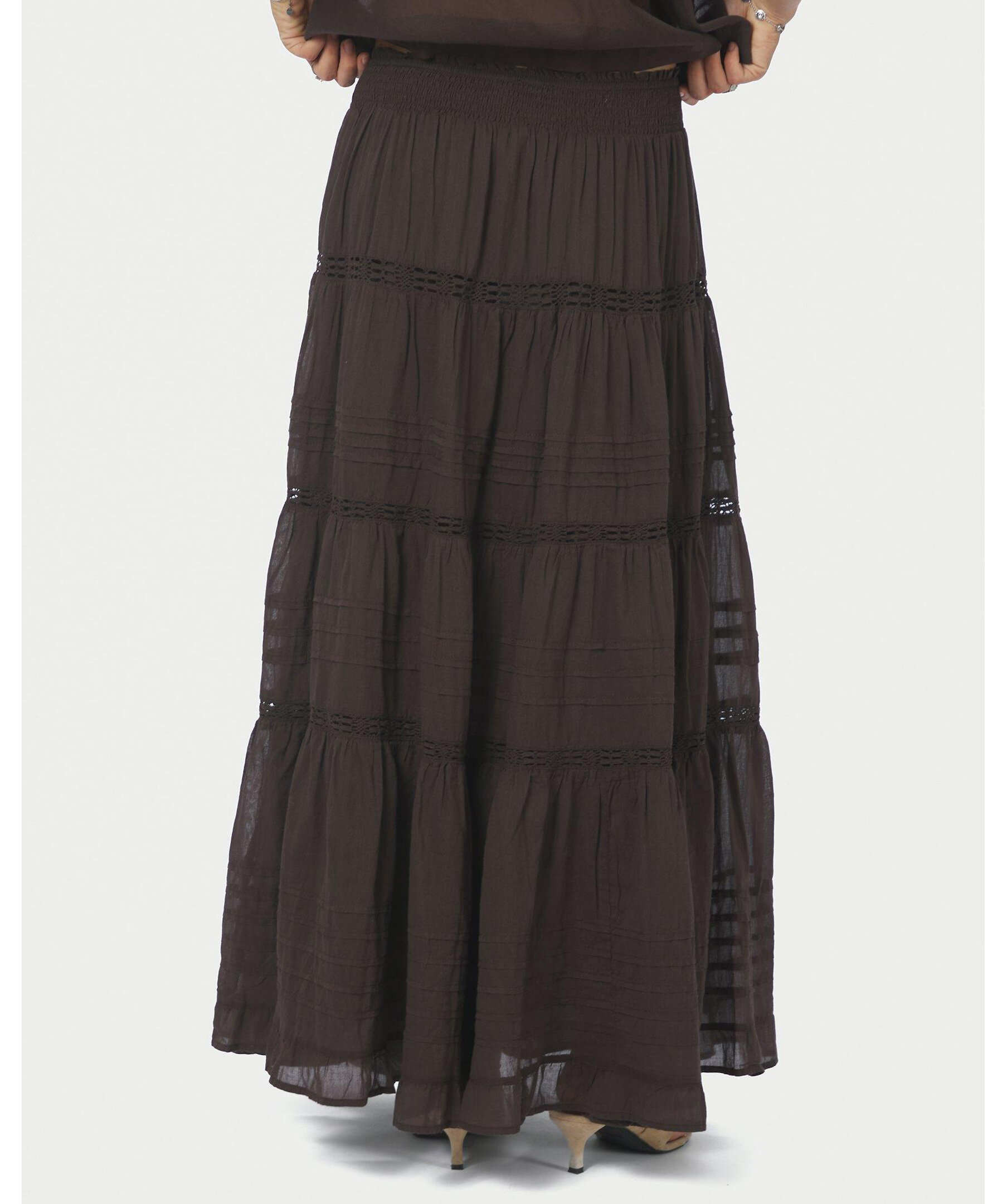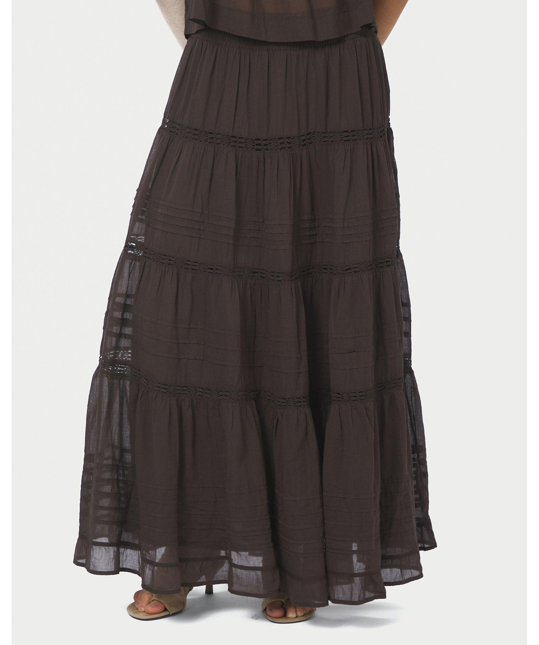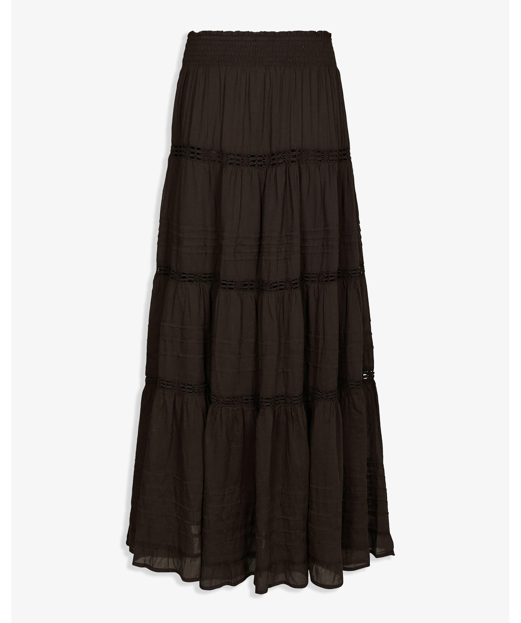 Brun maxikjol i bomull voile med dekorativt band och smockmidja, fodrad med bomull. Perfekt för vardag såväl som för semestern.