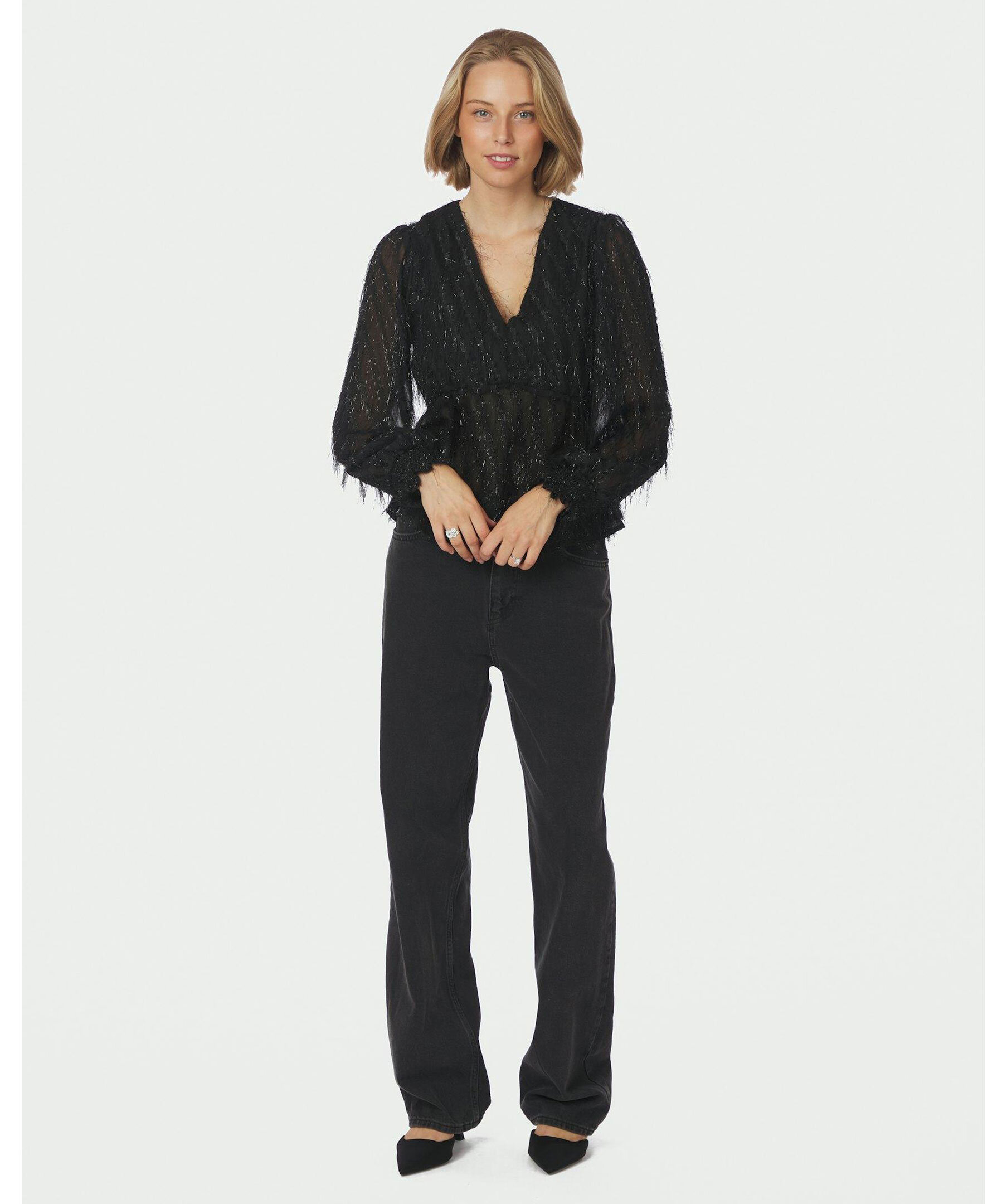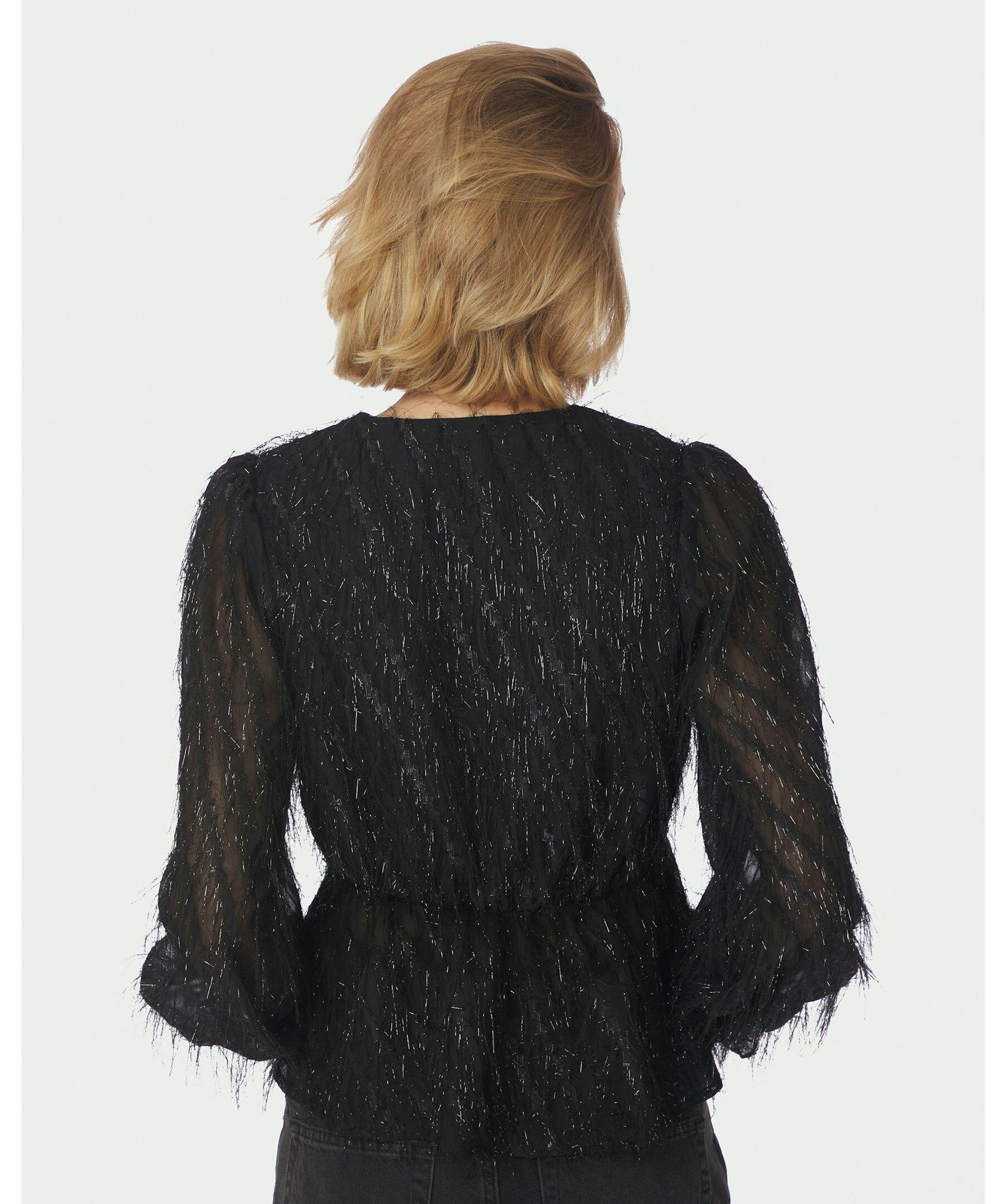Svart blus med v-ringning och långa ärmar. Blusen har tunna fransar som ger den ett livfullt och festligt uttryck.