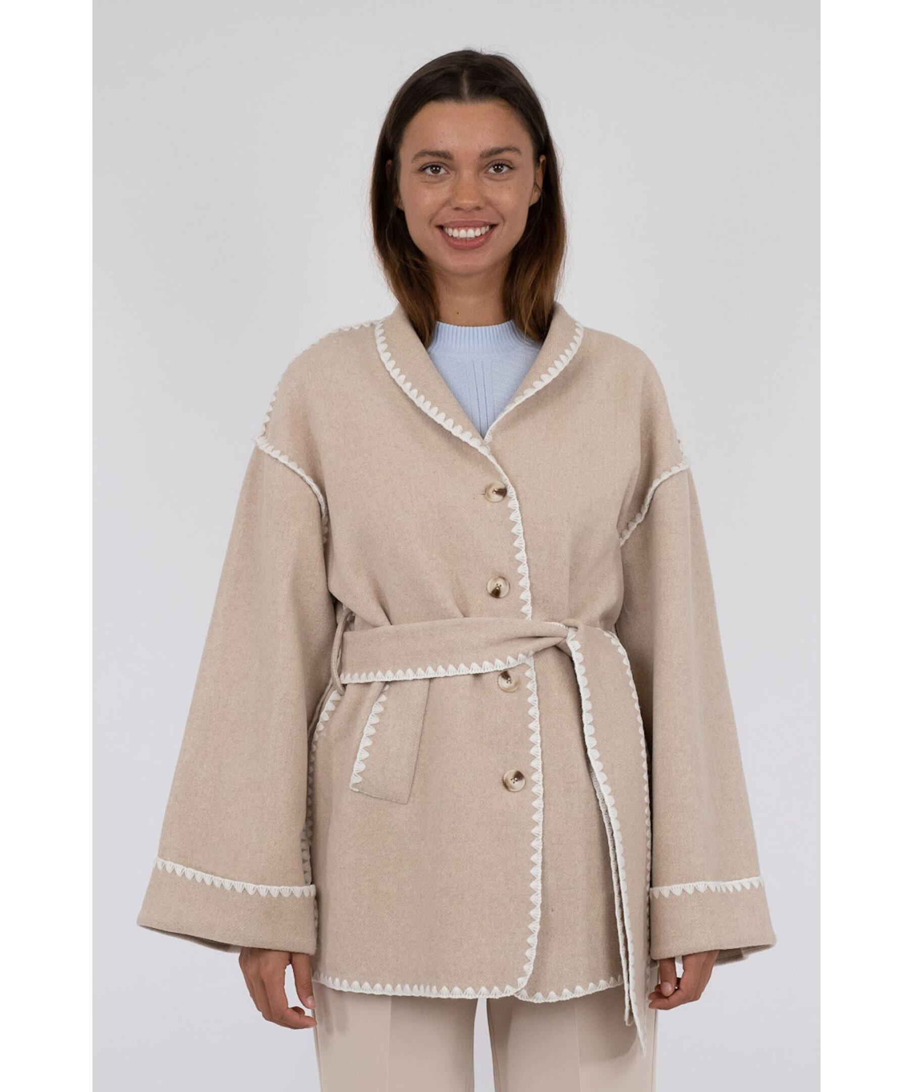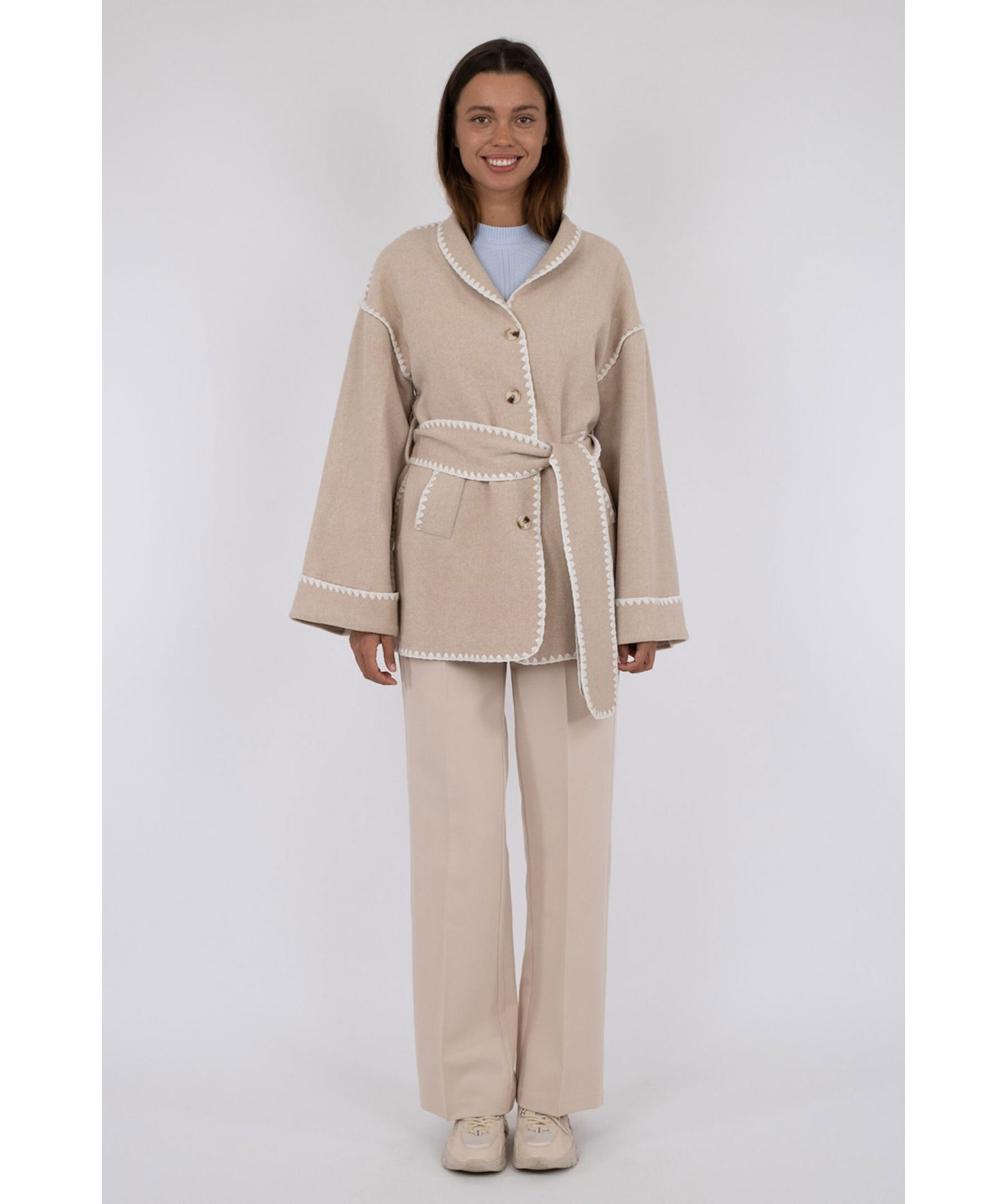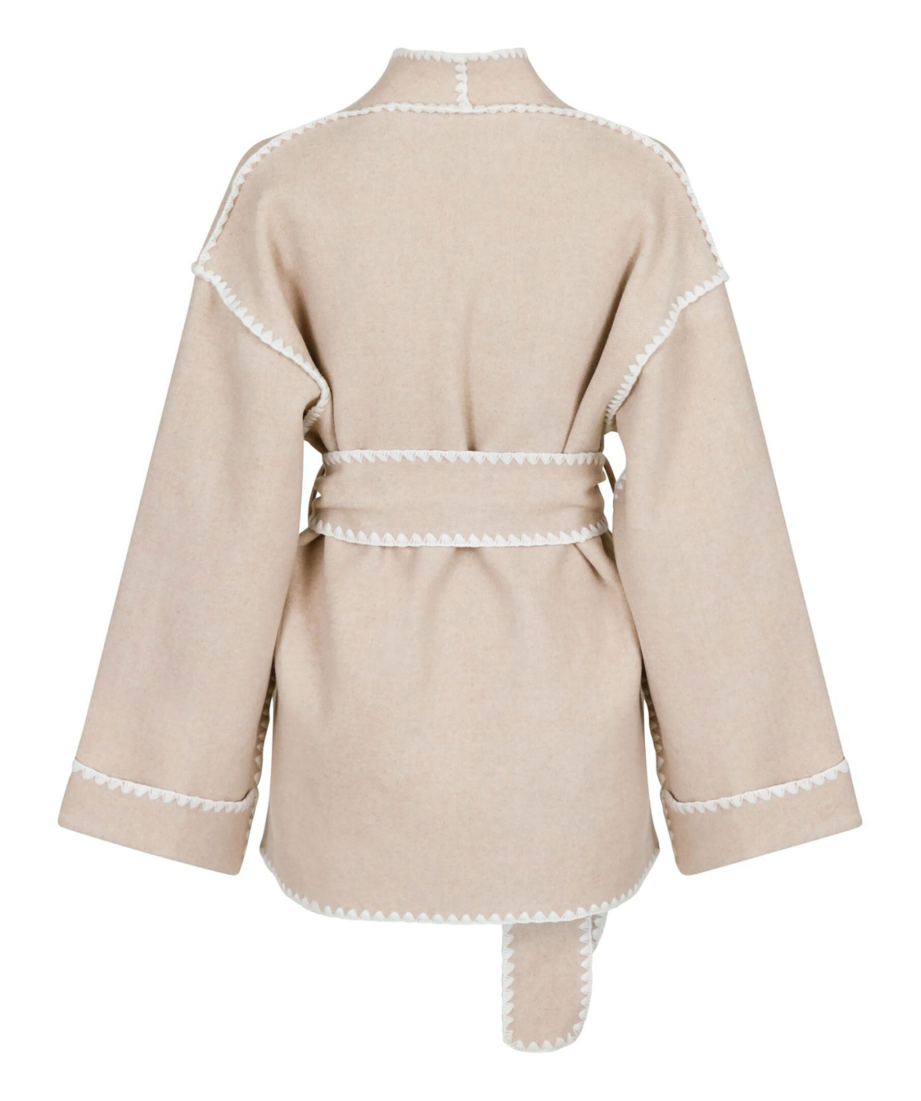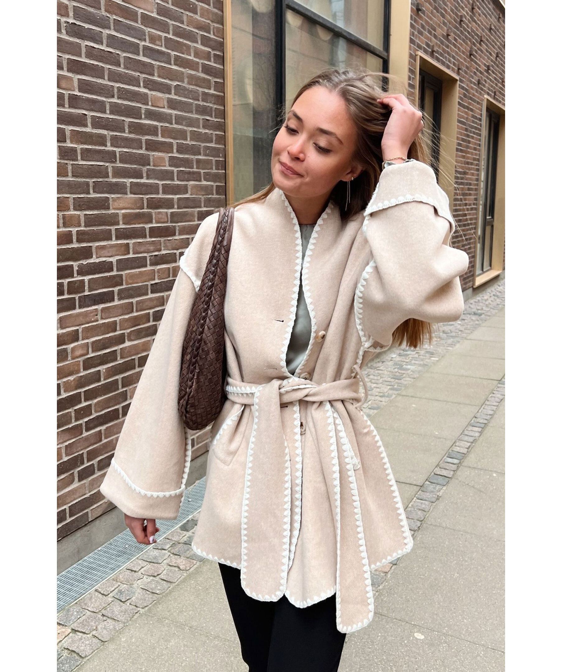 Beige kappa med vitt kontrastbroderi från Neo Noir. Stängs framtill med knappar och avtagbart bälte. Tillverkad i ullblandning. Vida ärmar som är uppvikta nedtill. Jackan har en oversized fit. Två fickor framtill.