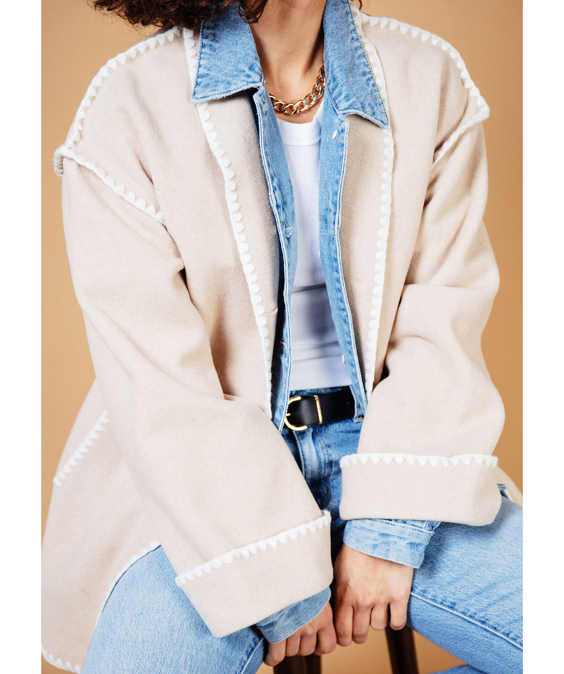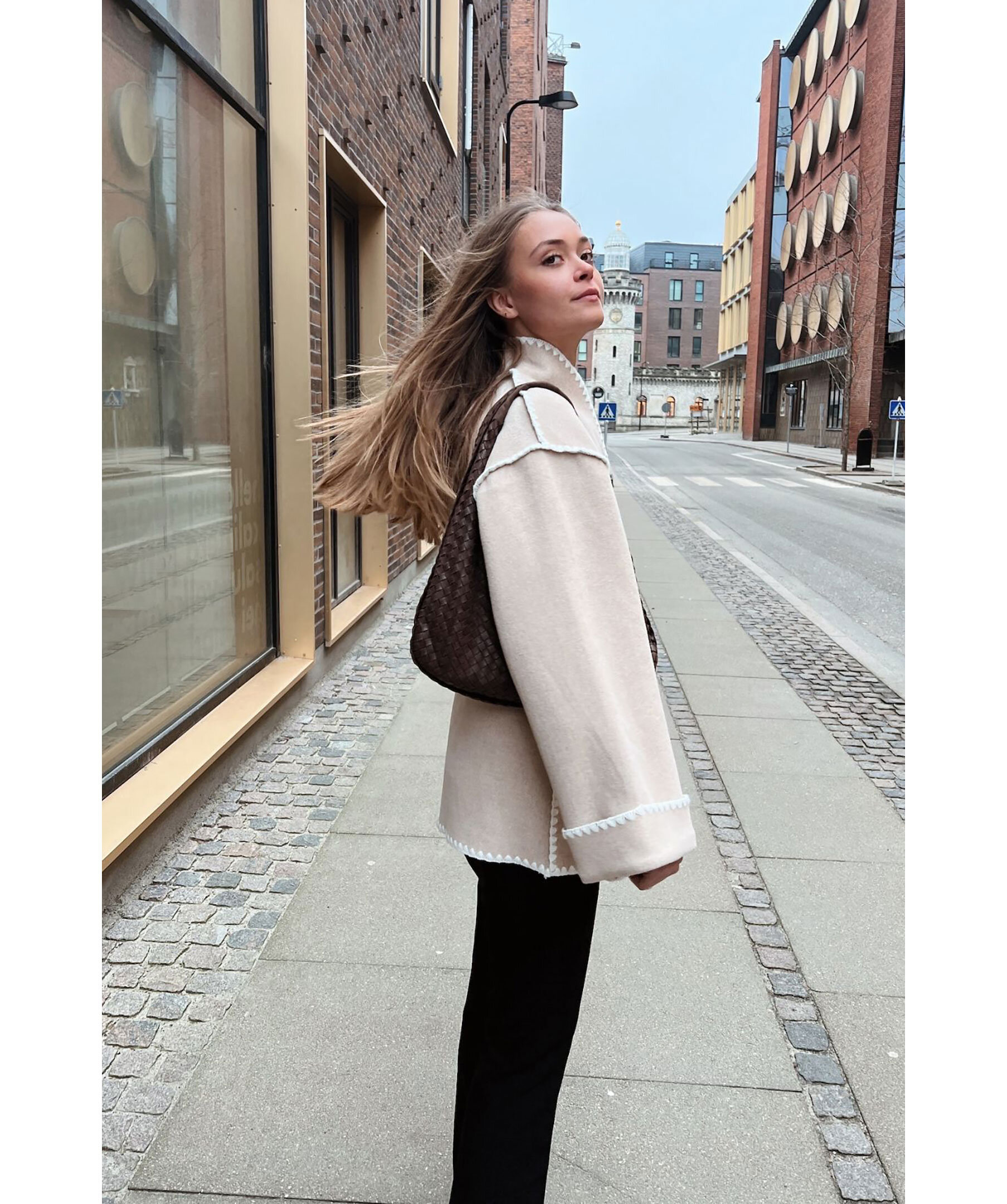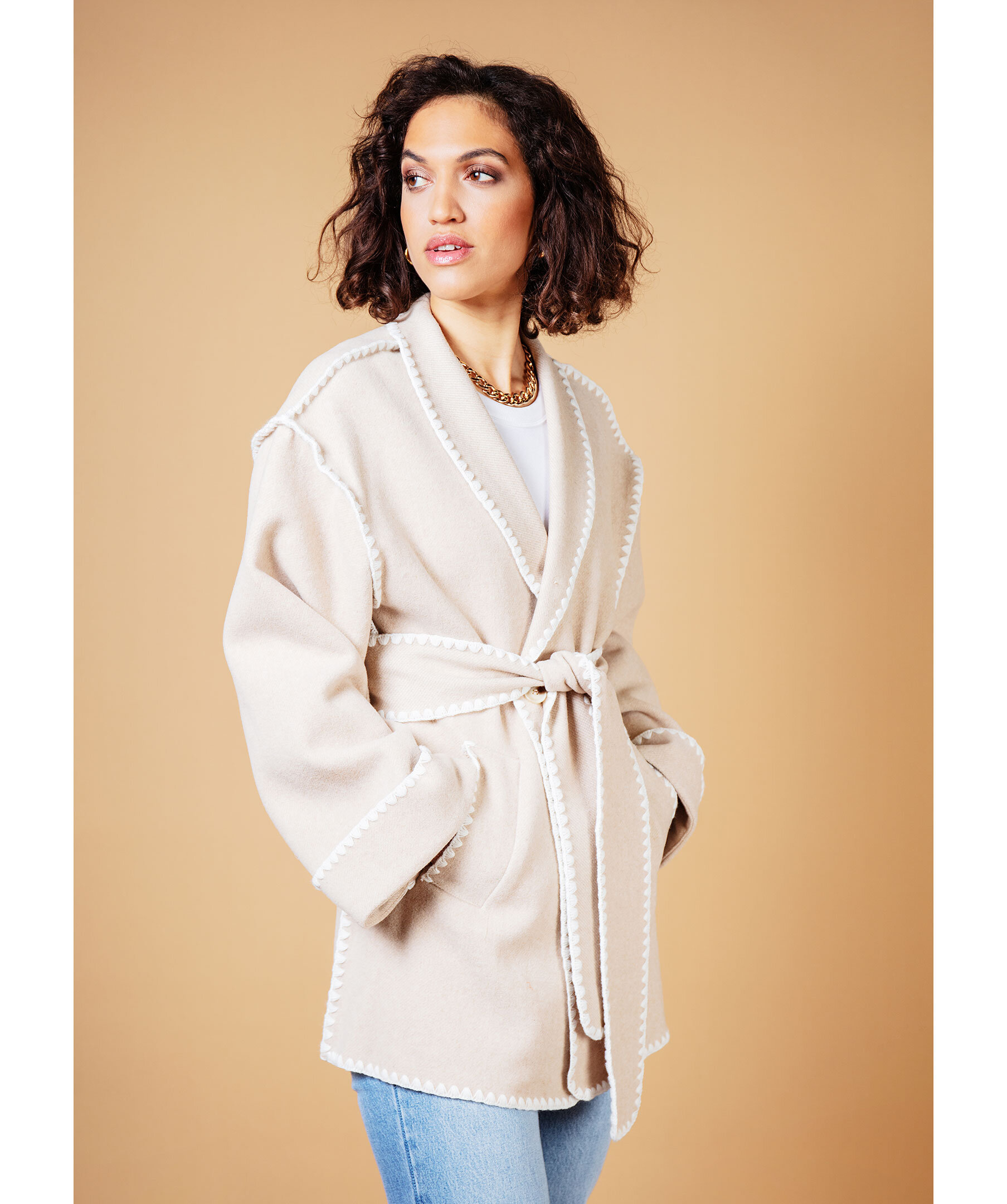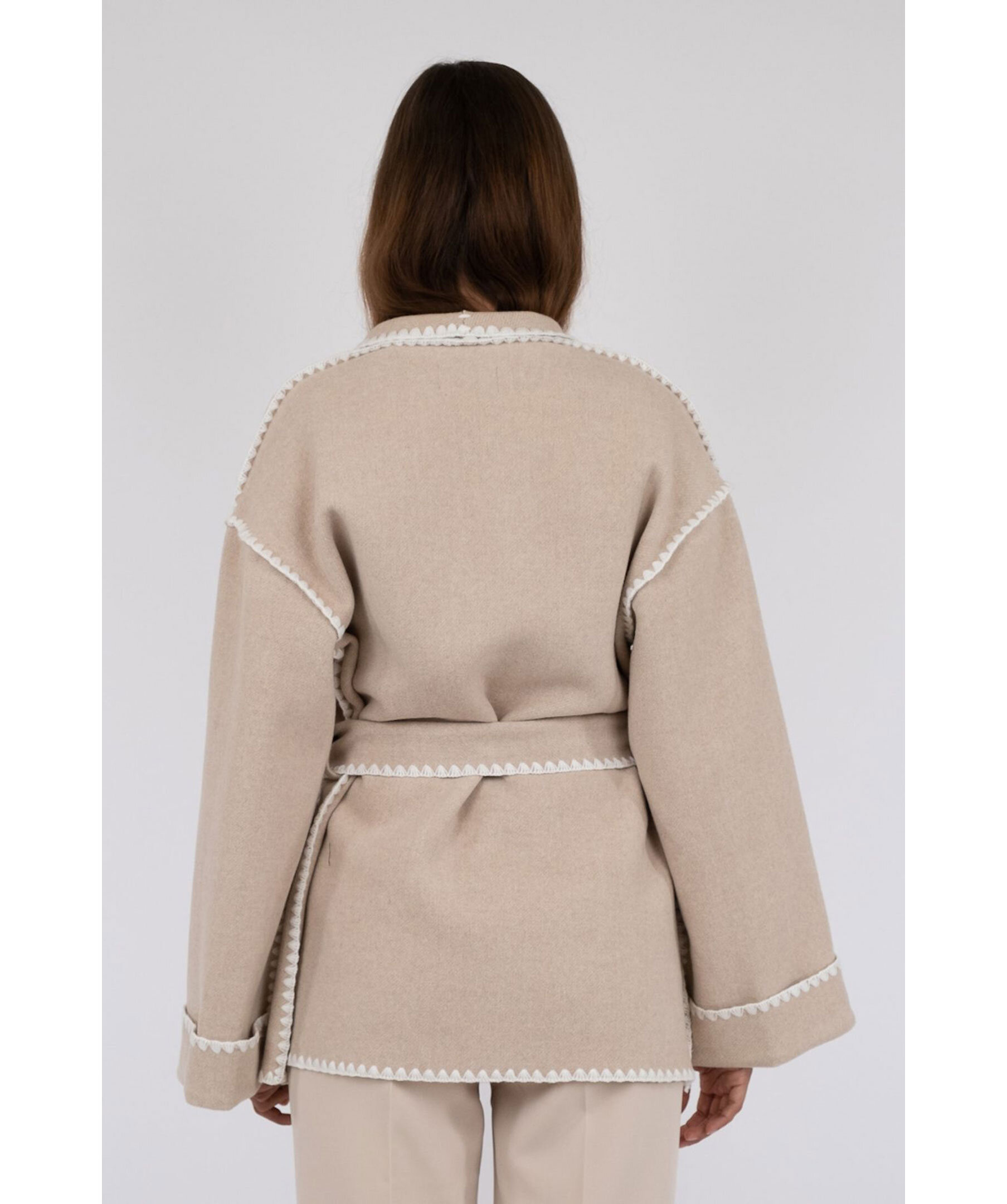 Beige kappa med vitt kontrastbroderi från Neo Noir. Stängs framtill med knappar och avtagbart bälte. Tillverkad i ullblandning. Vida ärmar som är uppvikta nedtill. Jackan har en oversized fit. Två fickor framtill.