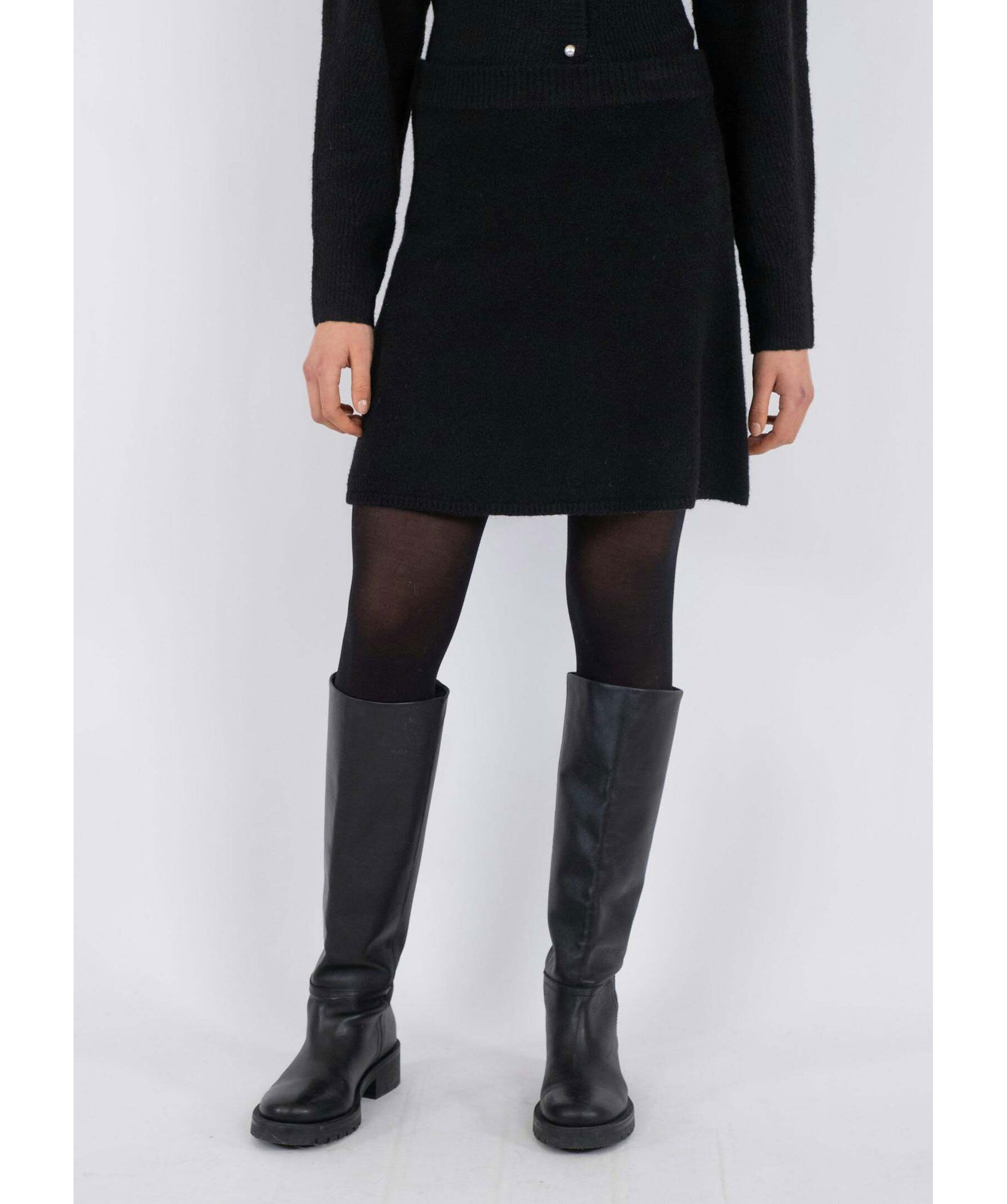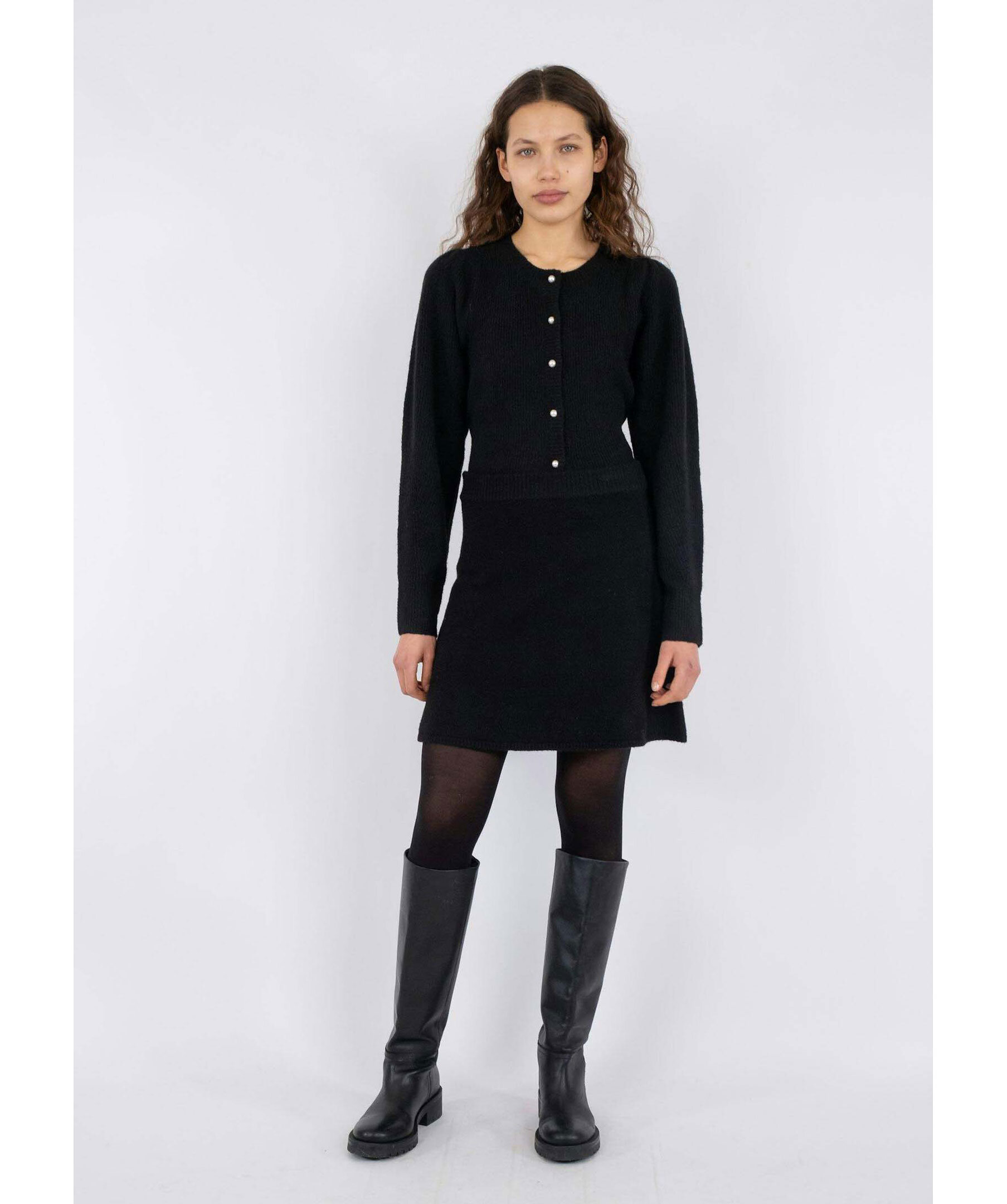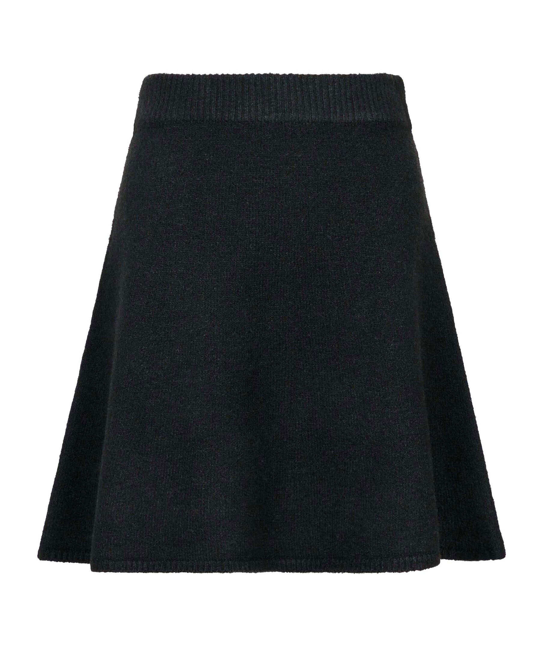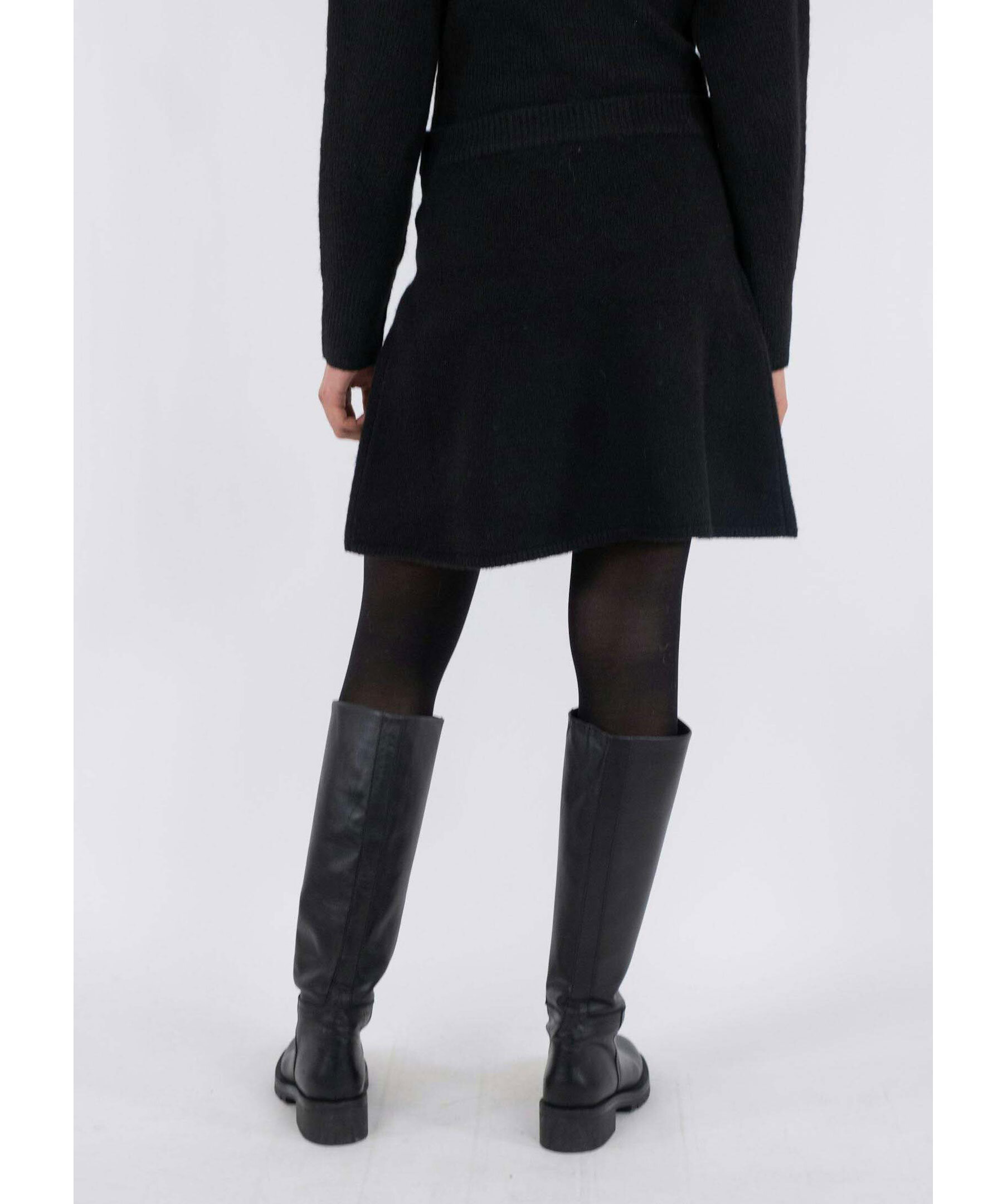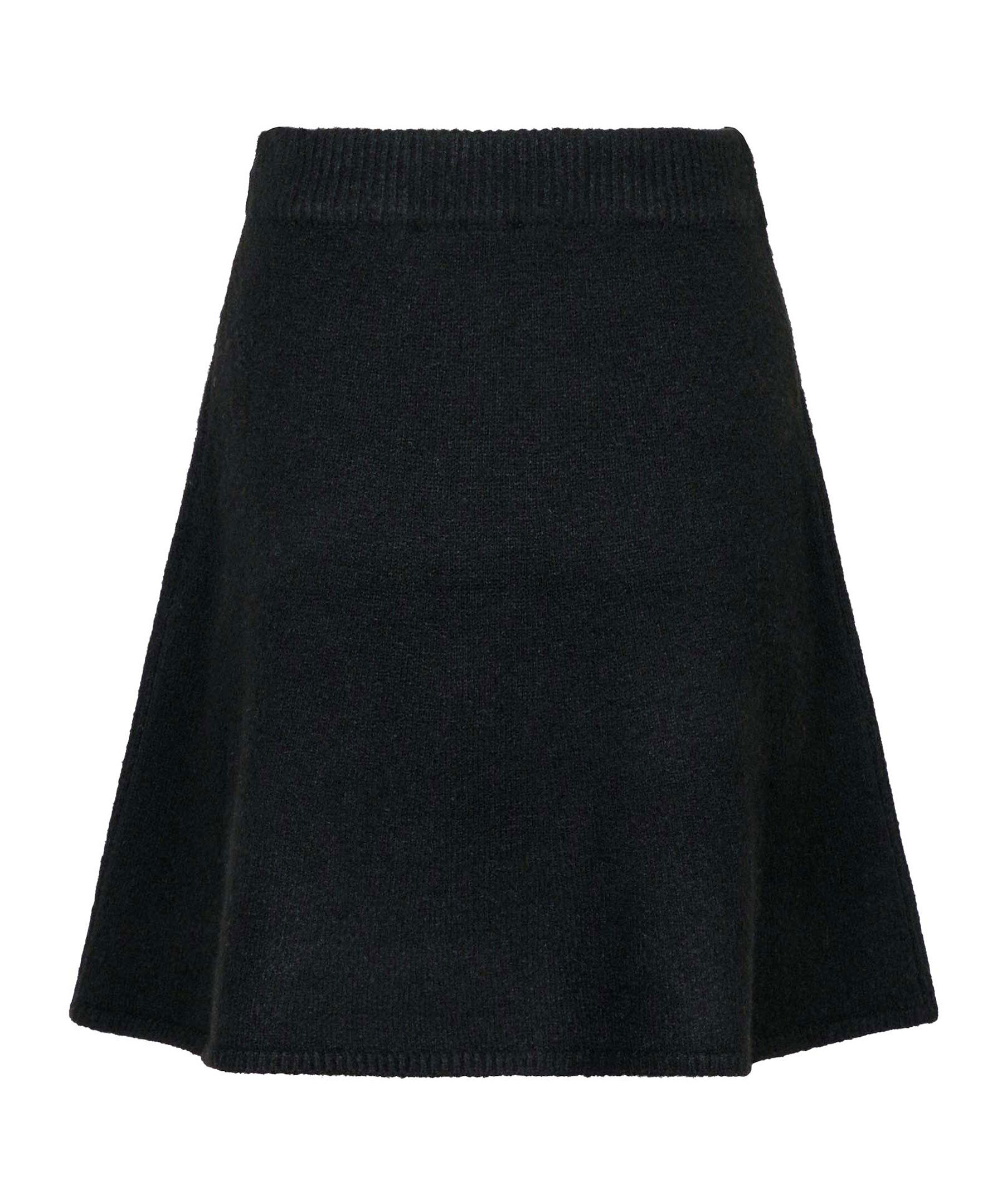 Svart, stickad kjol från Neo Noir. Kjolen har en ribbstickad, elastisk midja. Slutar ungefär mitt på låren. Tillverkad i en polyester- och ullblandning.