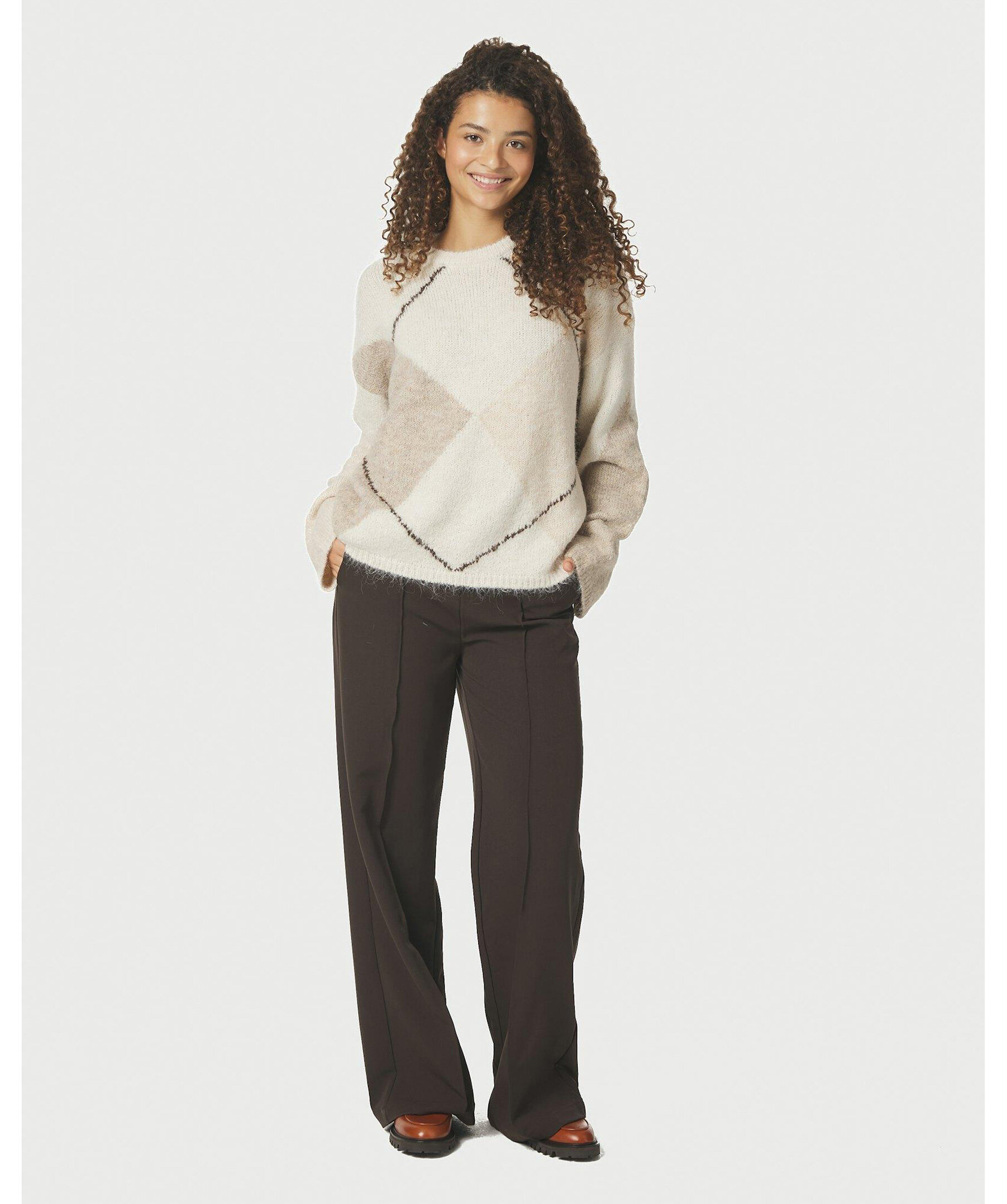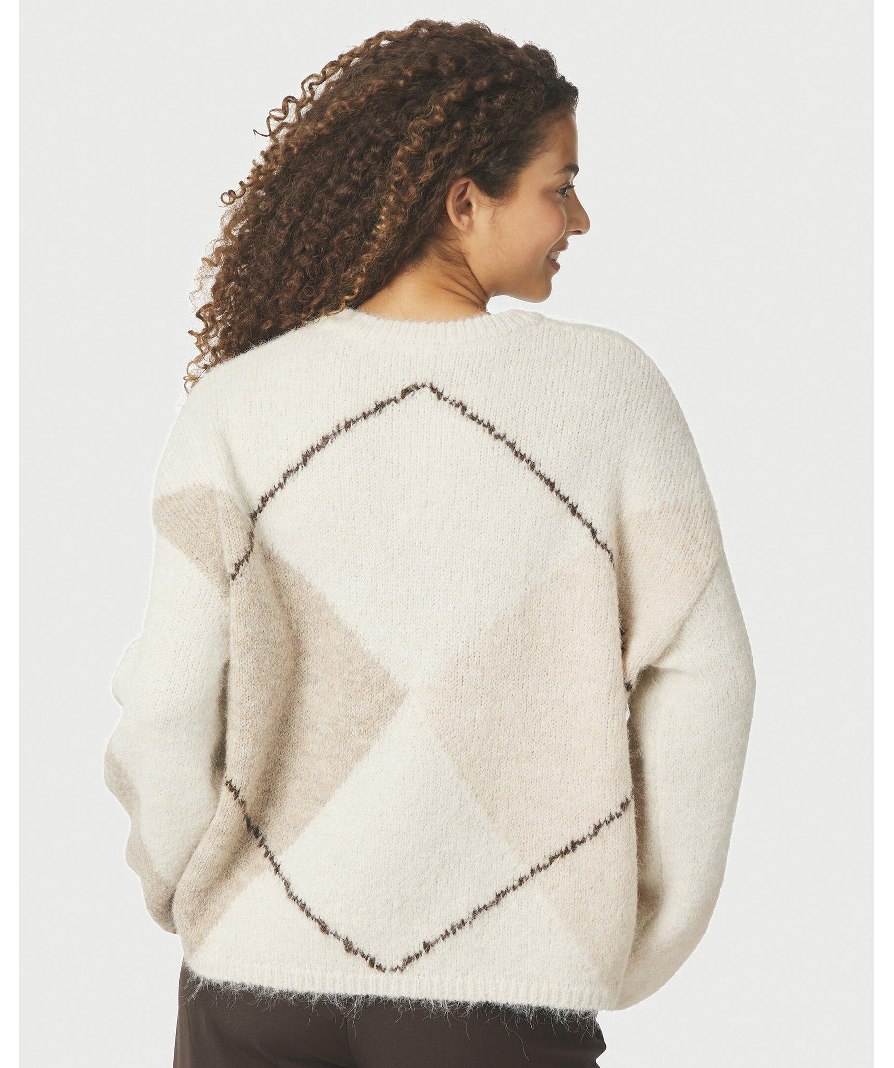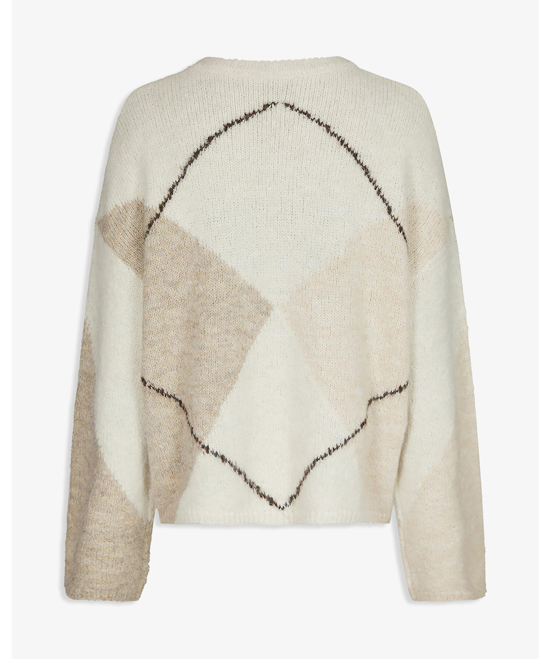 Oversize stickad tröja i ett fint argyle-mönster. Kvaliteten har en härlig fluffig känsla och utseende, och modellen är 176 cm lång och bär storlek 36.