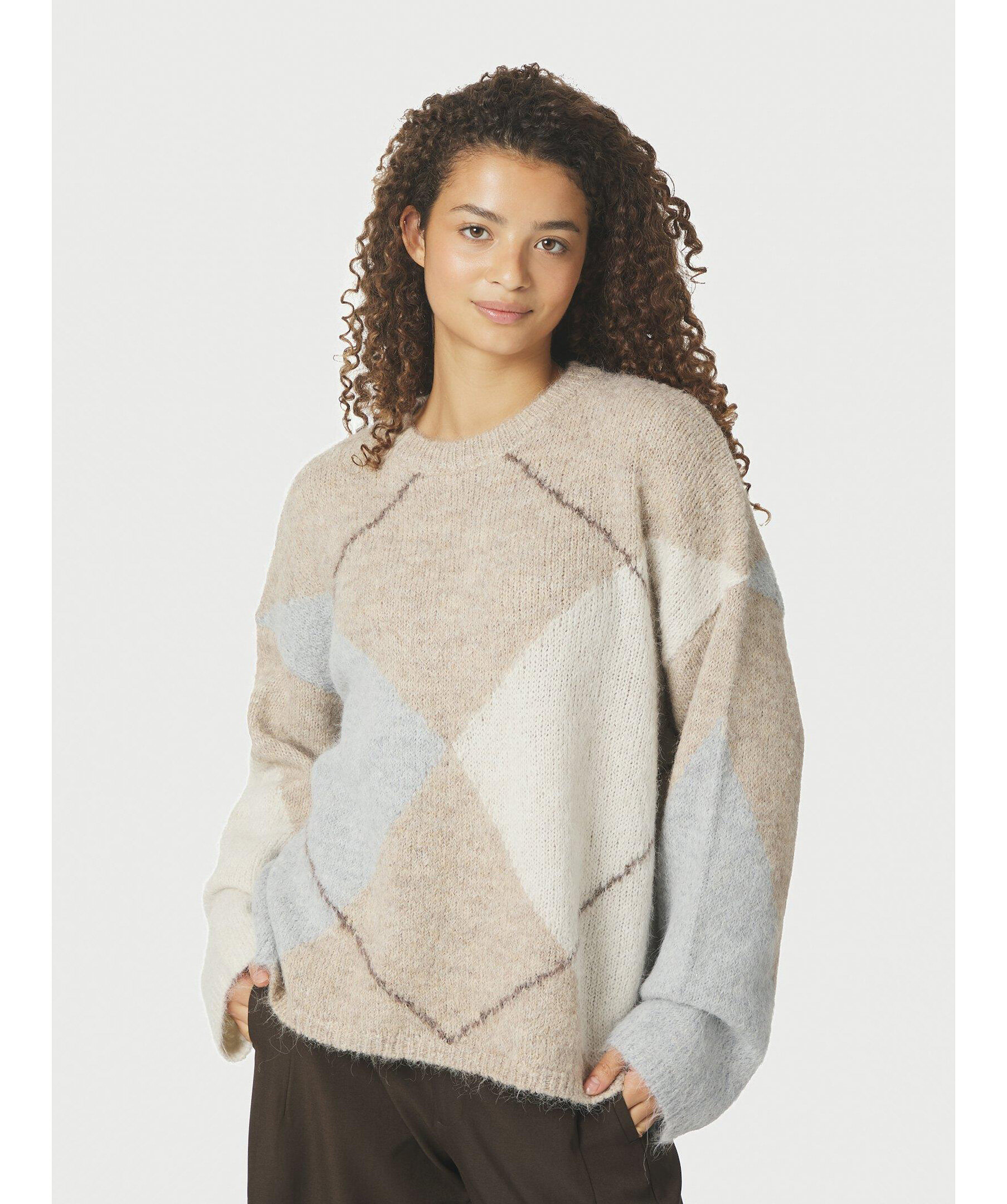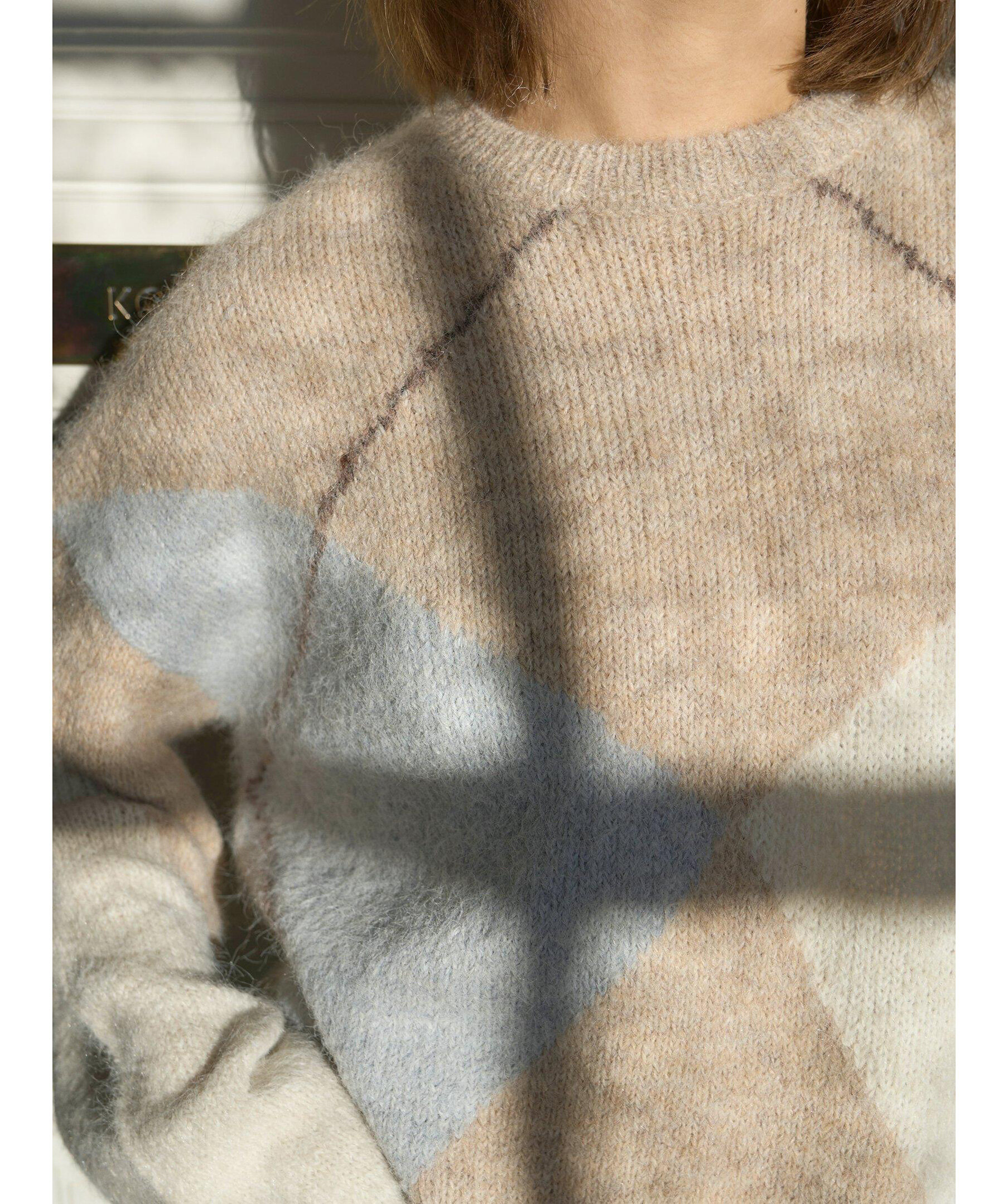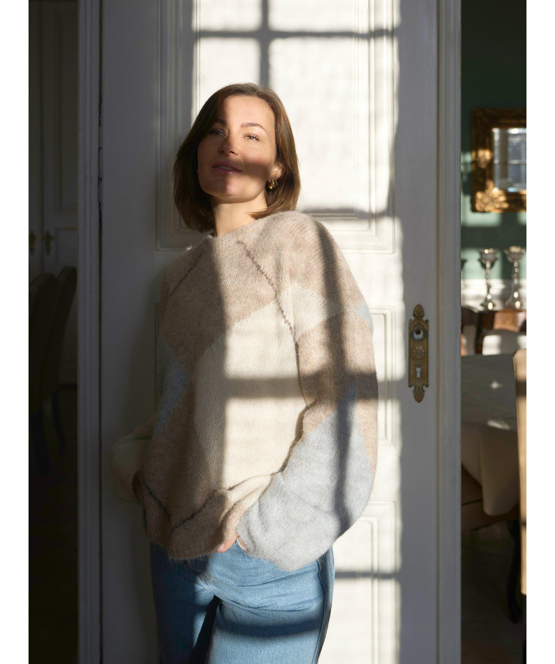 Oversize stickad blus i ett fint argyle-mönster. Kvaliteten har en härlig fluffig känsla och utseende och modellen är 176 cm lång och bär storlek 36.