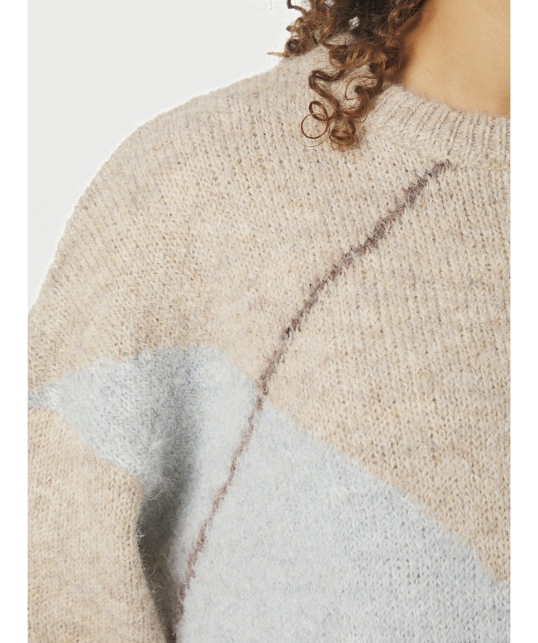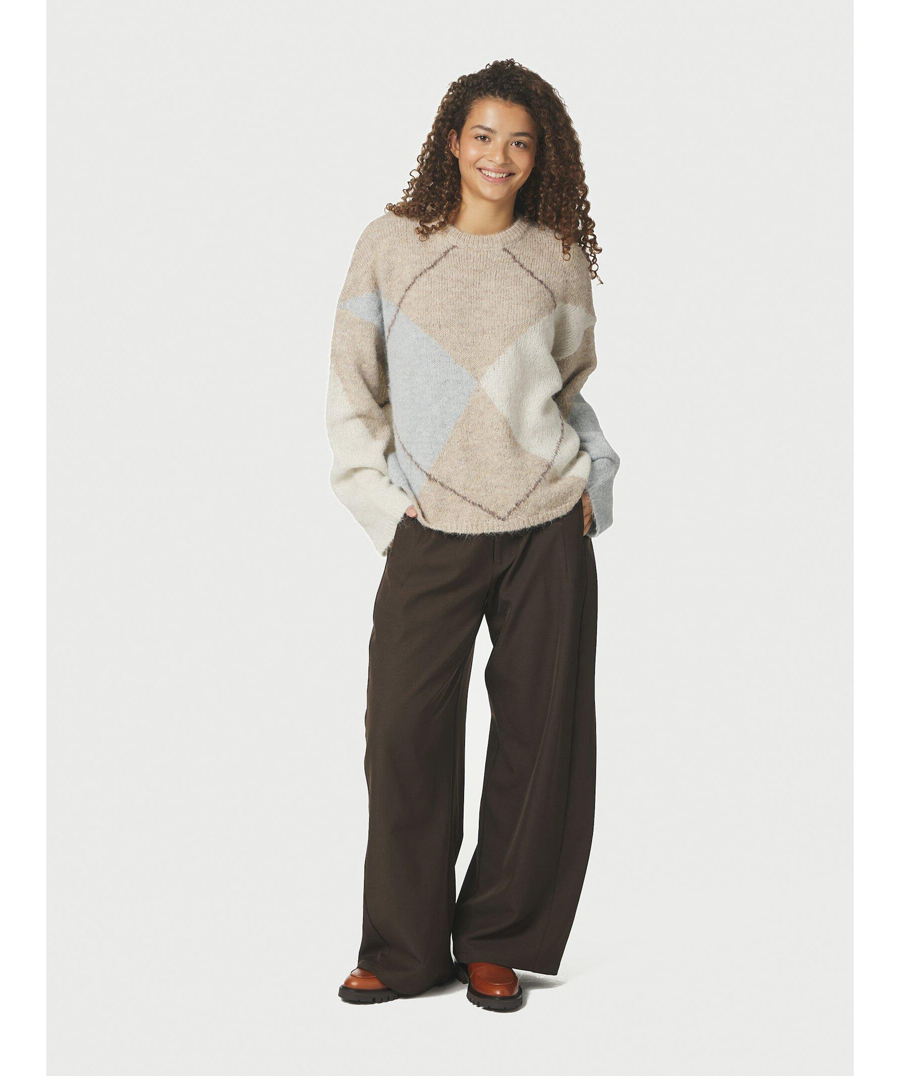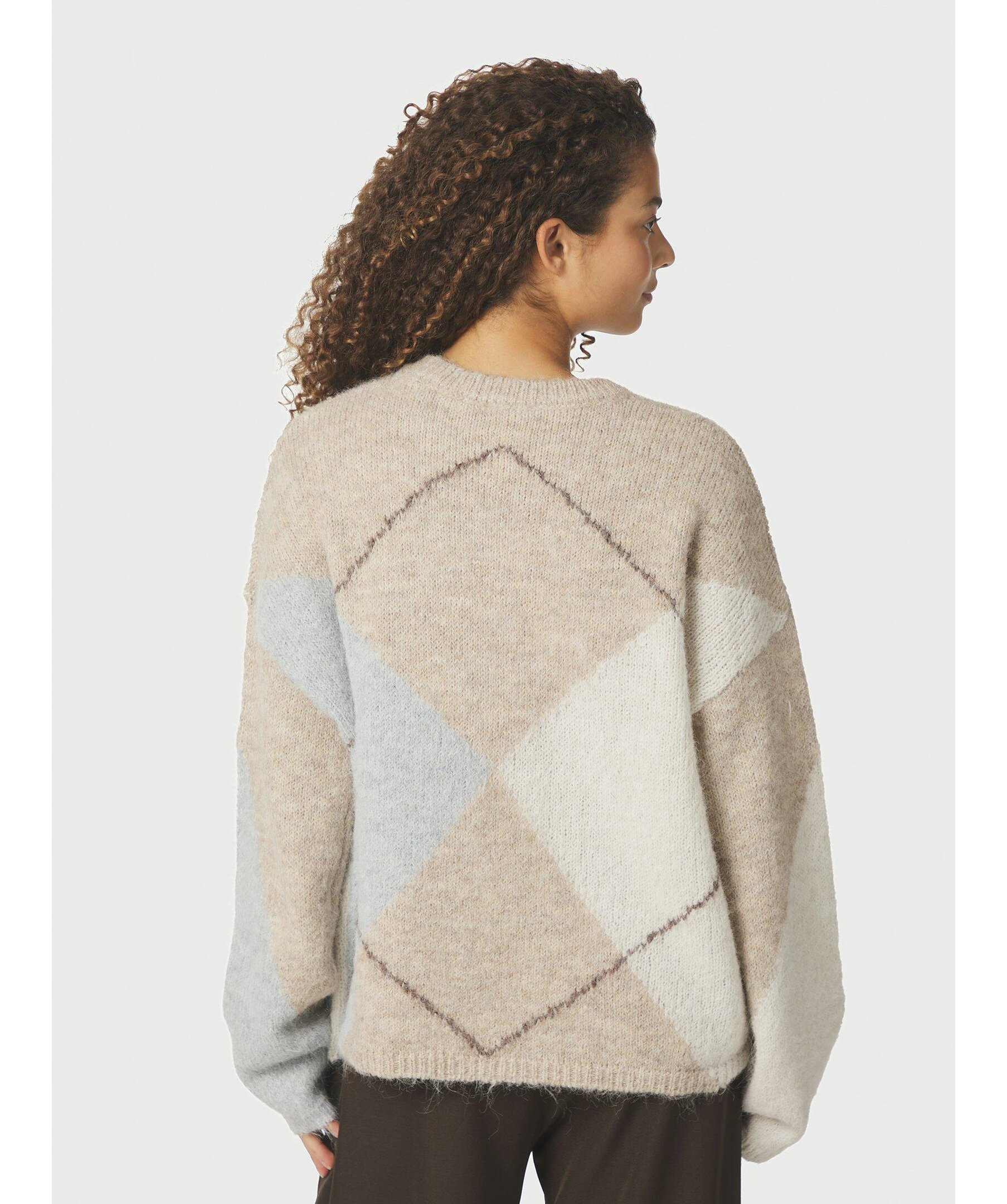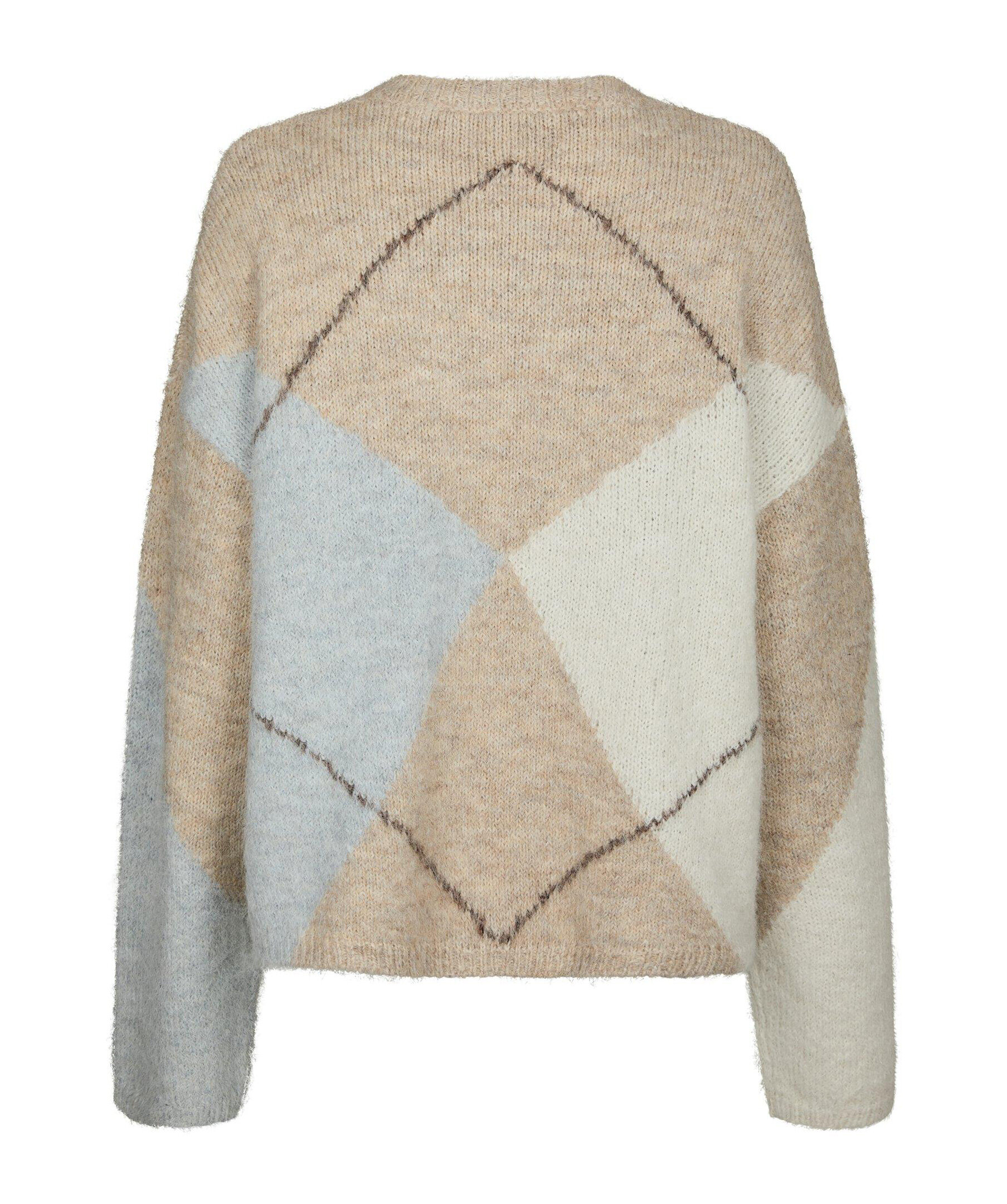 Oversize stickad blus i ett fint argyle-mönster. Kvaliteten har en härlig fluffig känsla och utseende och modellen är 176 cm lång och bär storlek 36.
