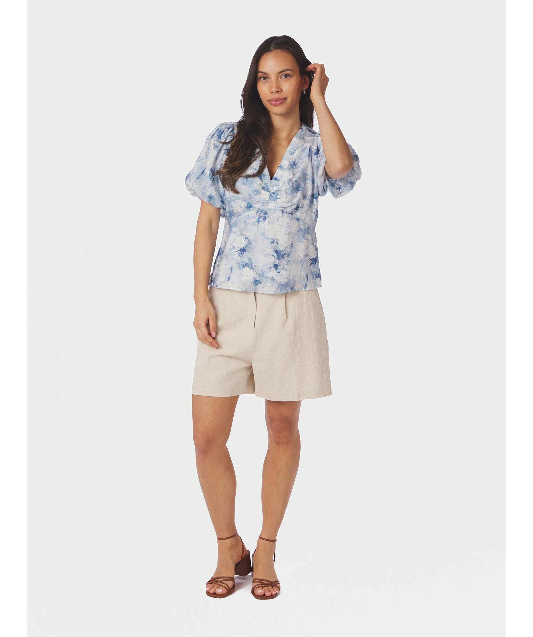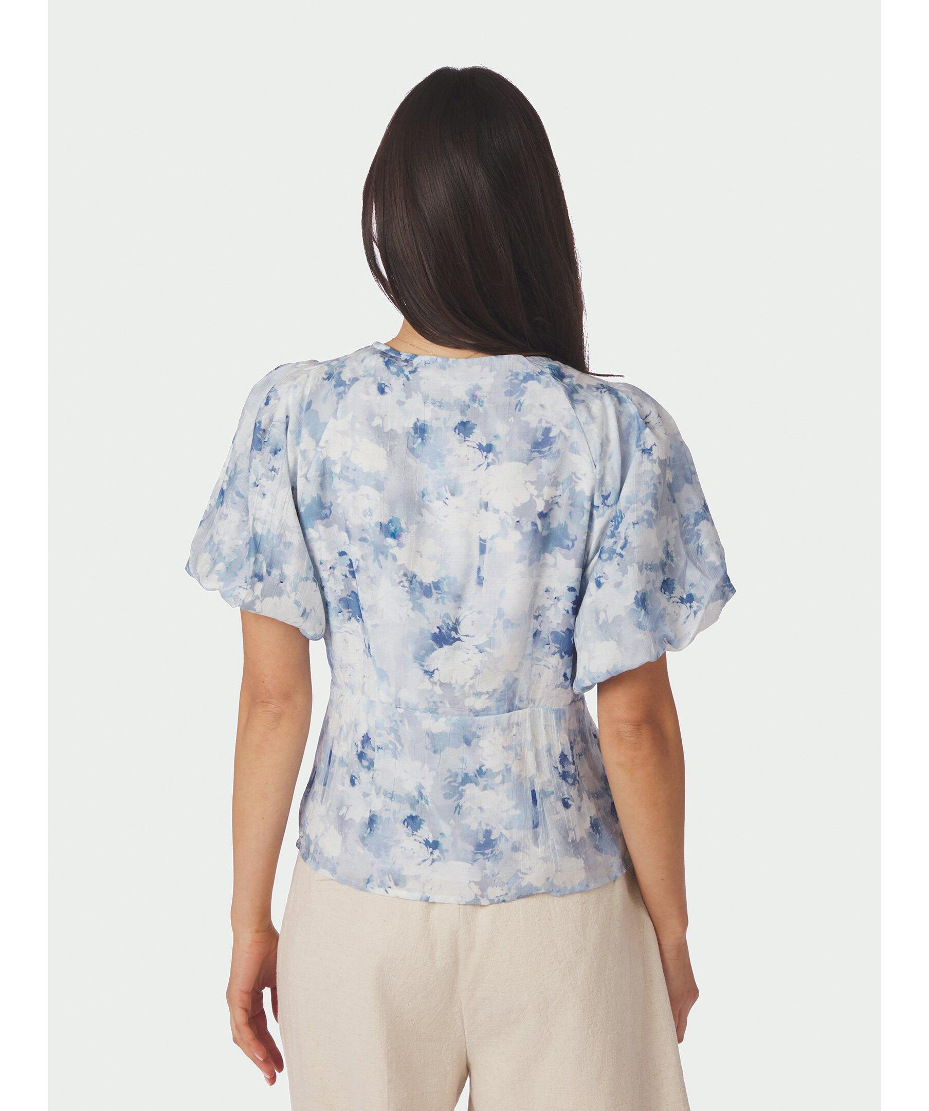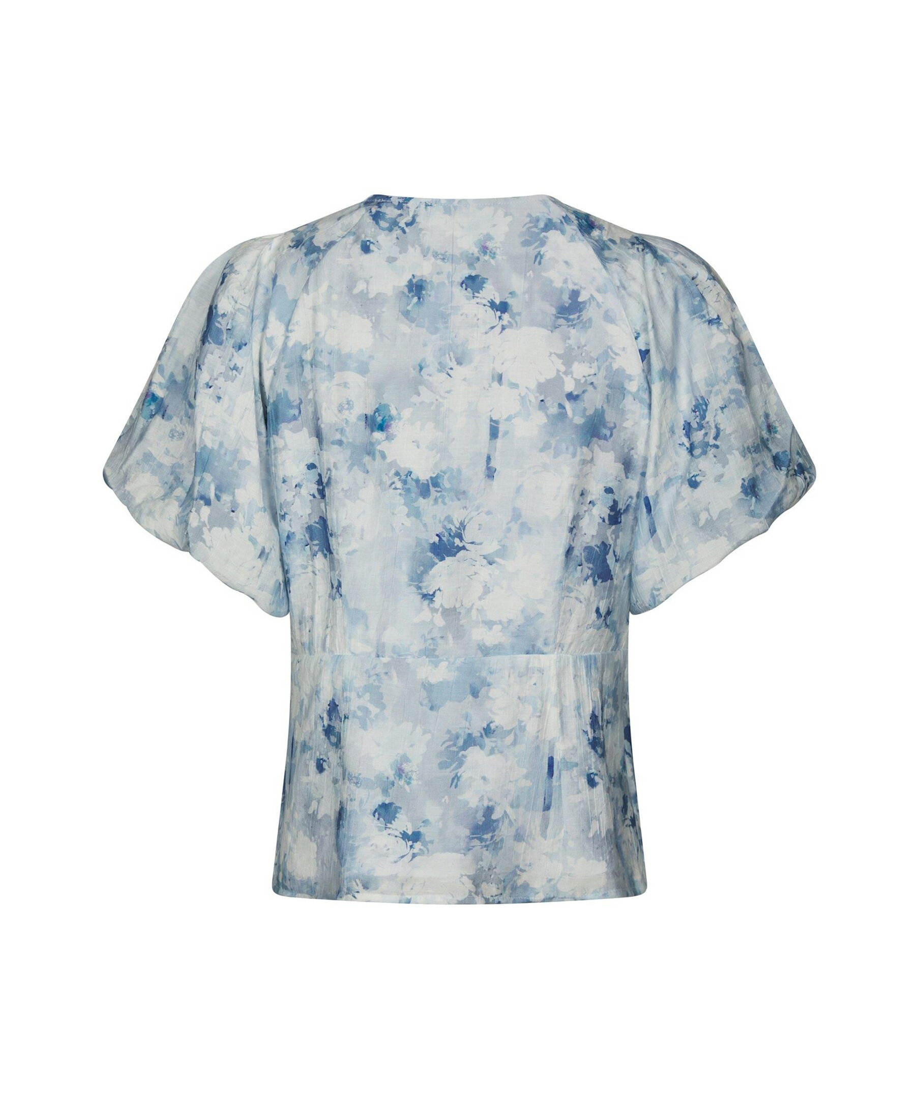 Mönstrad blus i en bomullsblandning poplin med ärmar som slutar ovanför armbågen. Den är figursydd och har en dold dragkedja. Modellen är 176 cm lång och bär storlek 36.