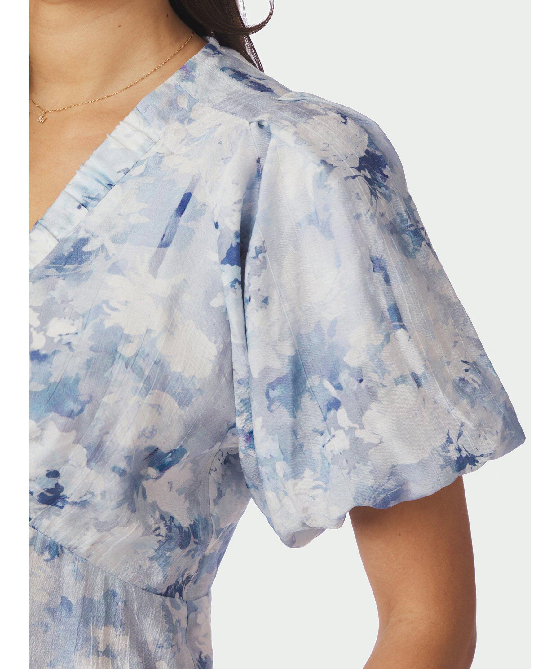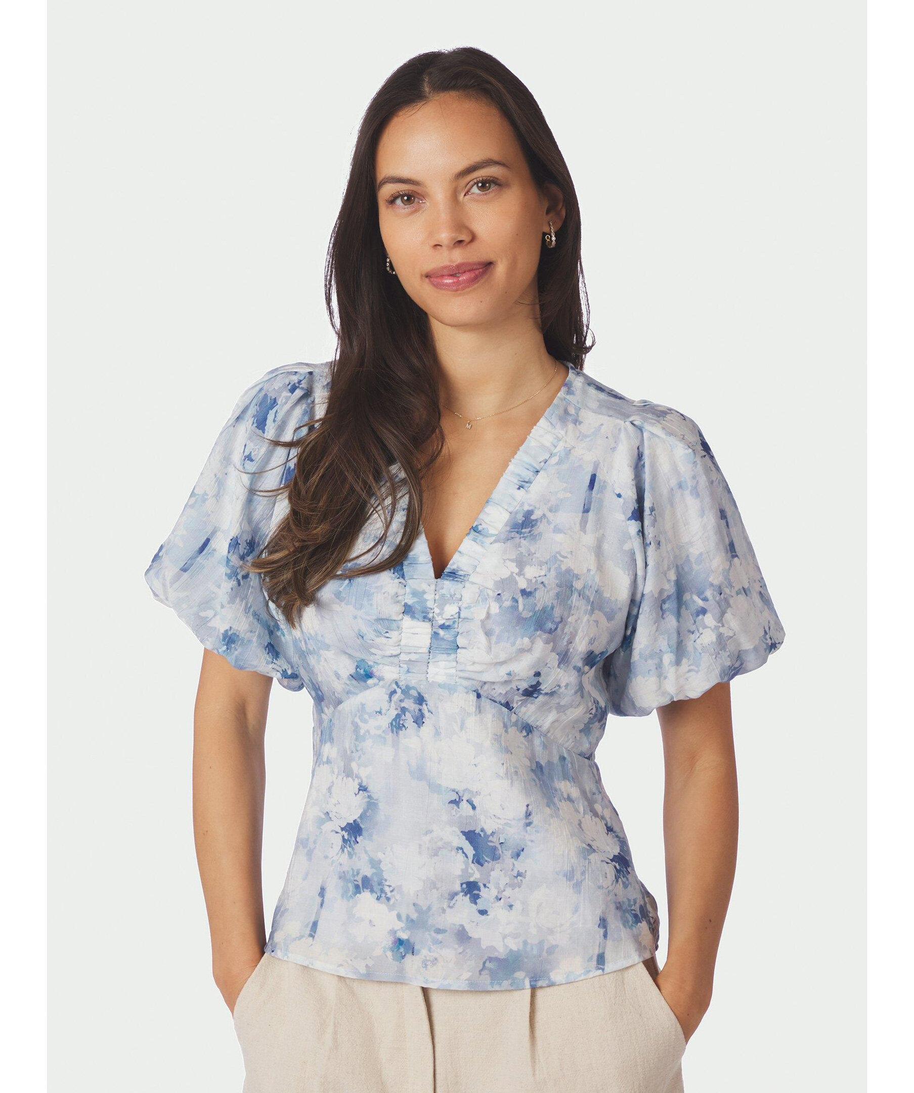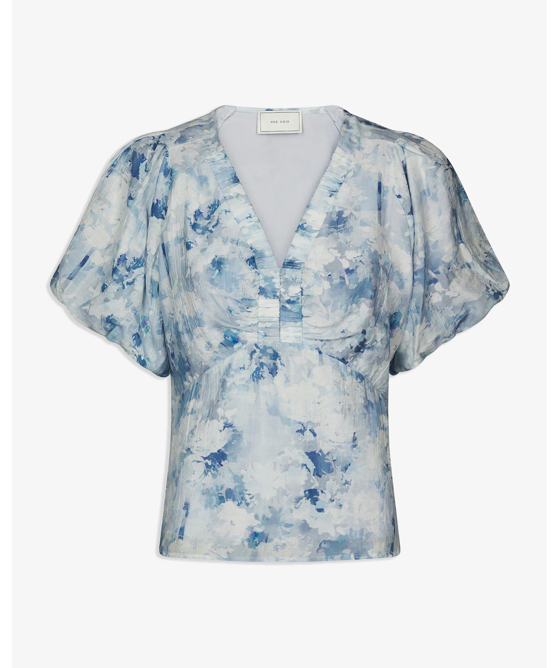 Mönstrad blus i en bomullsblandning poplin med ärmar som slutar ovanför armbågen. Den är figursydd och har en dold dragkedja. Modellen är 176 cm lång och bär storlek 36.